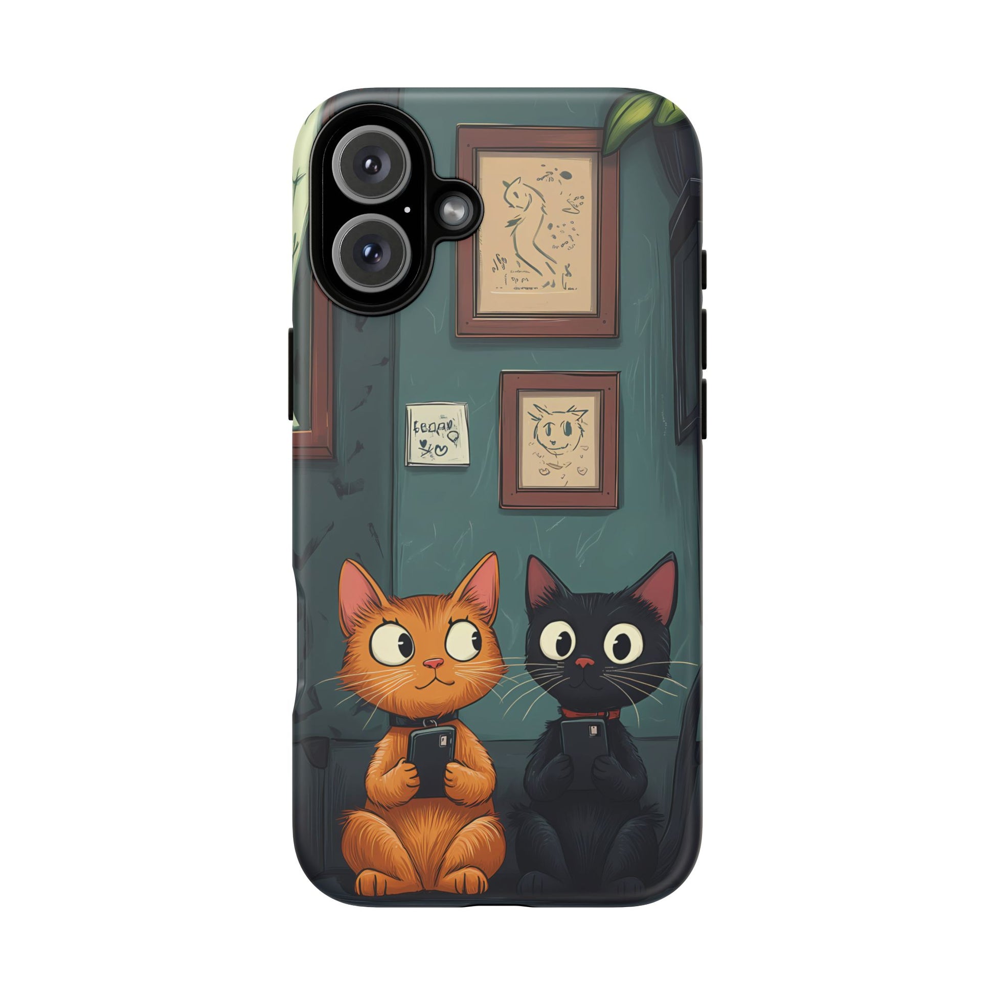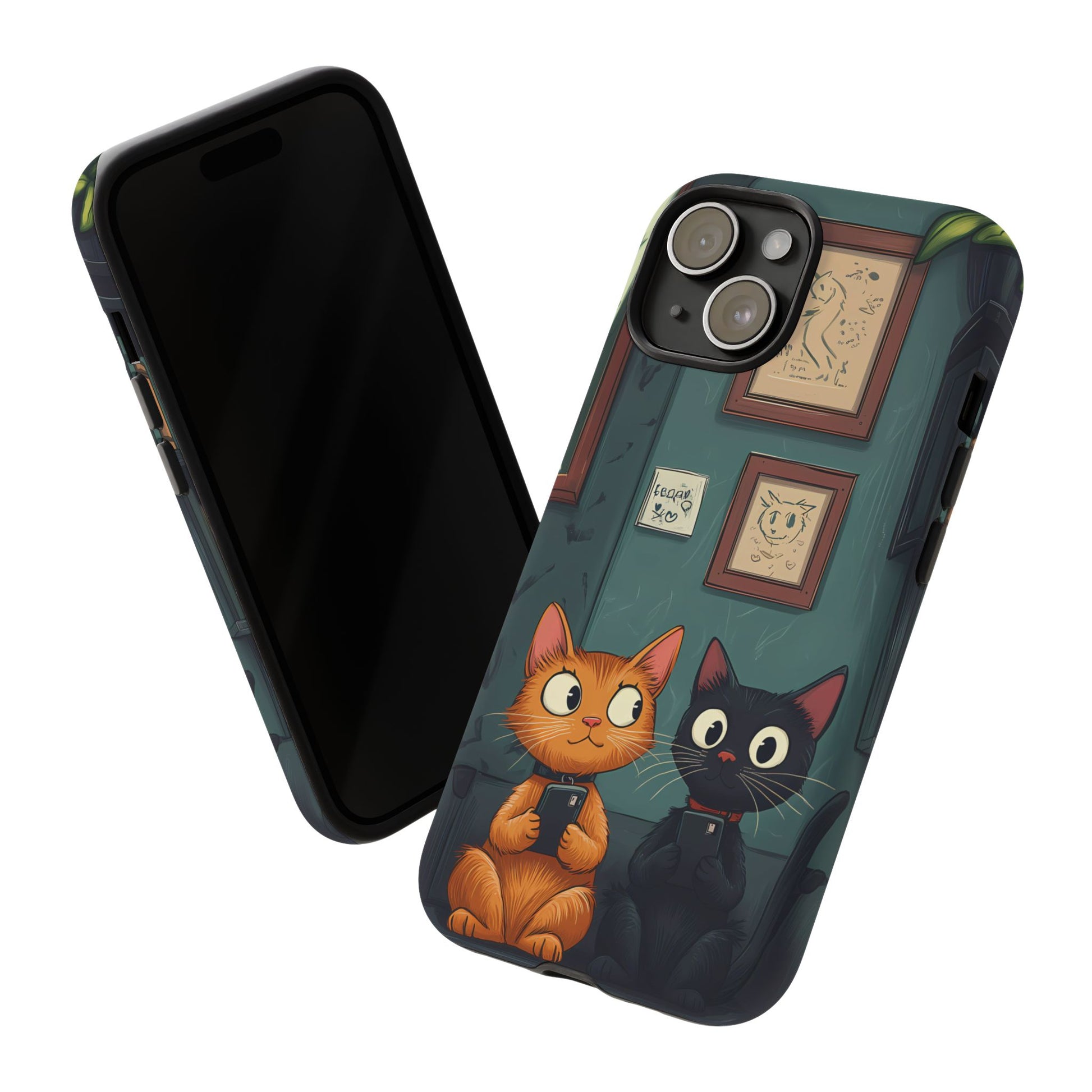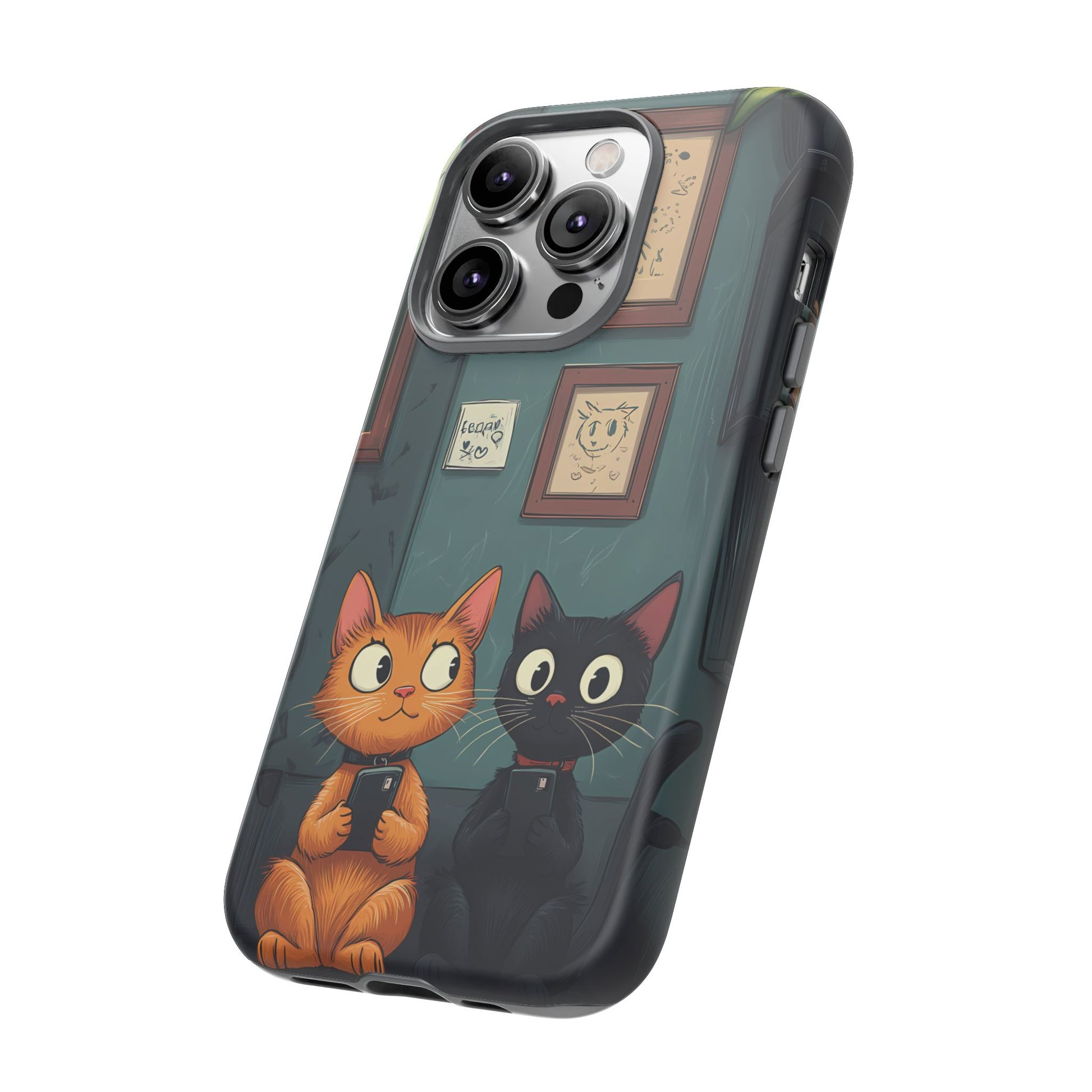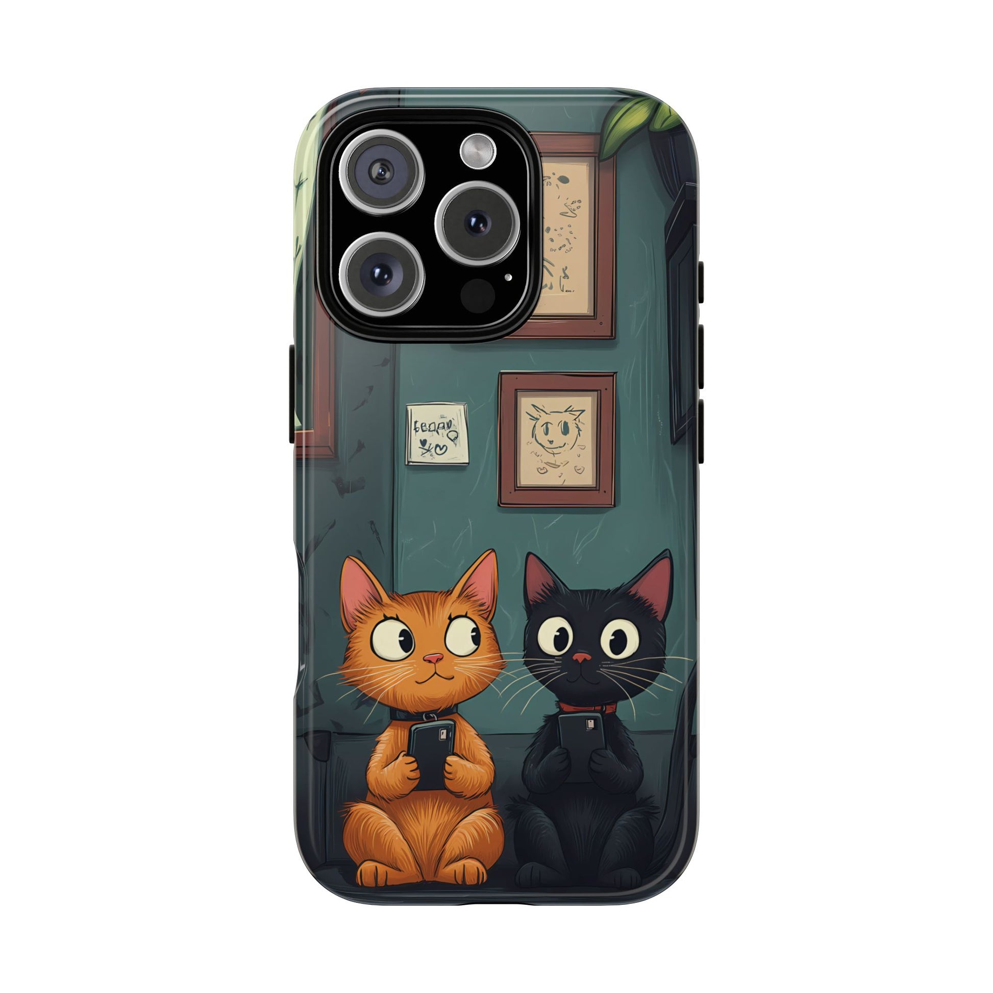 This charming design features two lovable cartoon cats sitting side by side, each holding and gazing at their phones. A playful and adorable take on feline friendships, this phone case is perfect for those who enjoy cute, humorous, and lighthearted designs