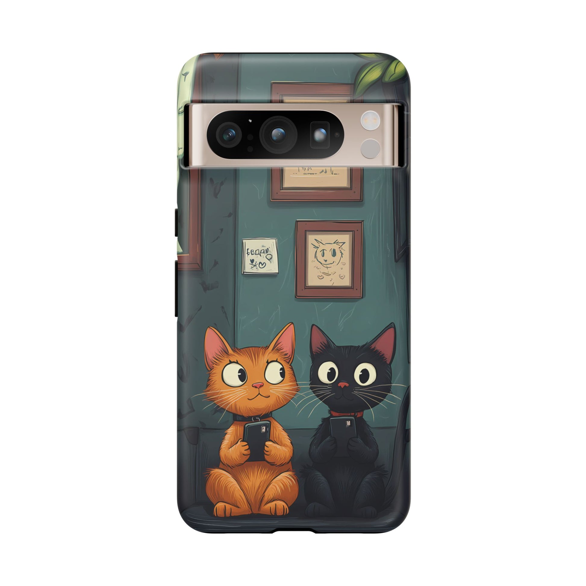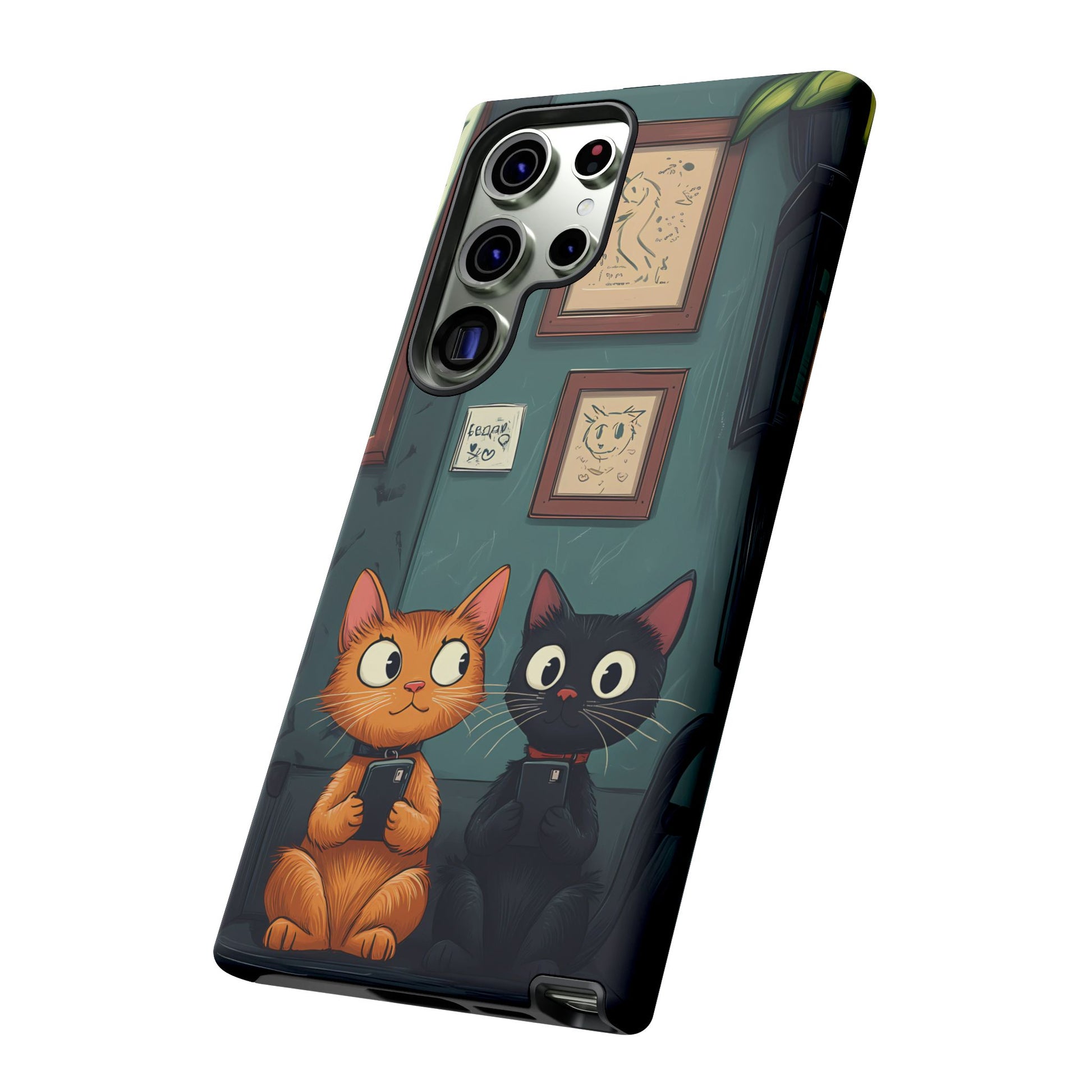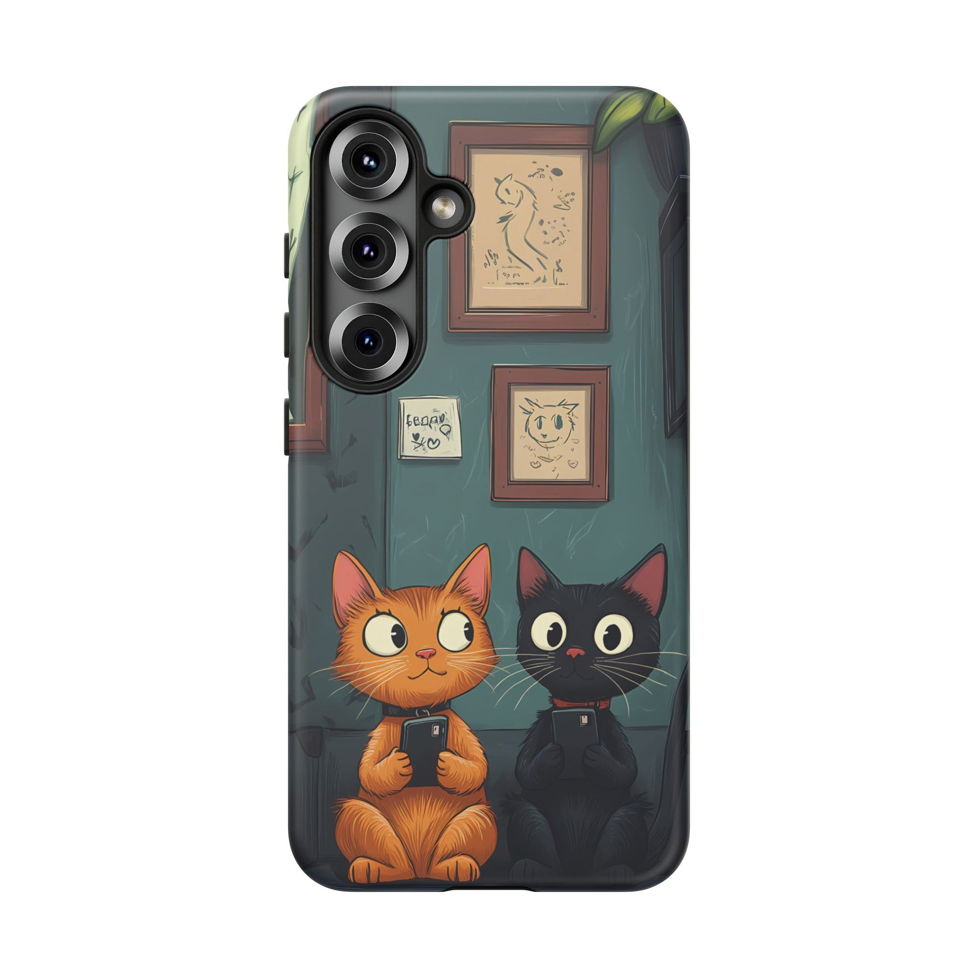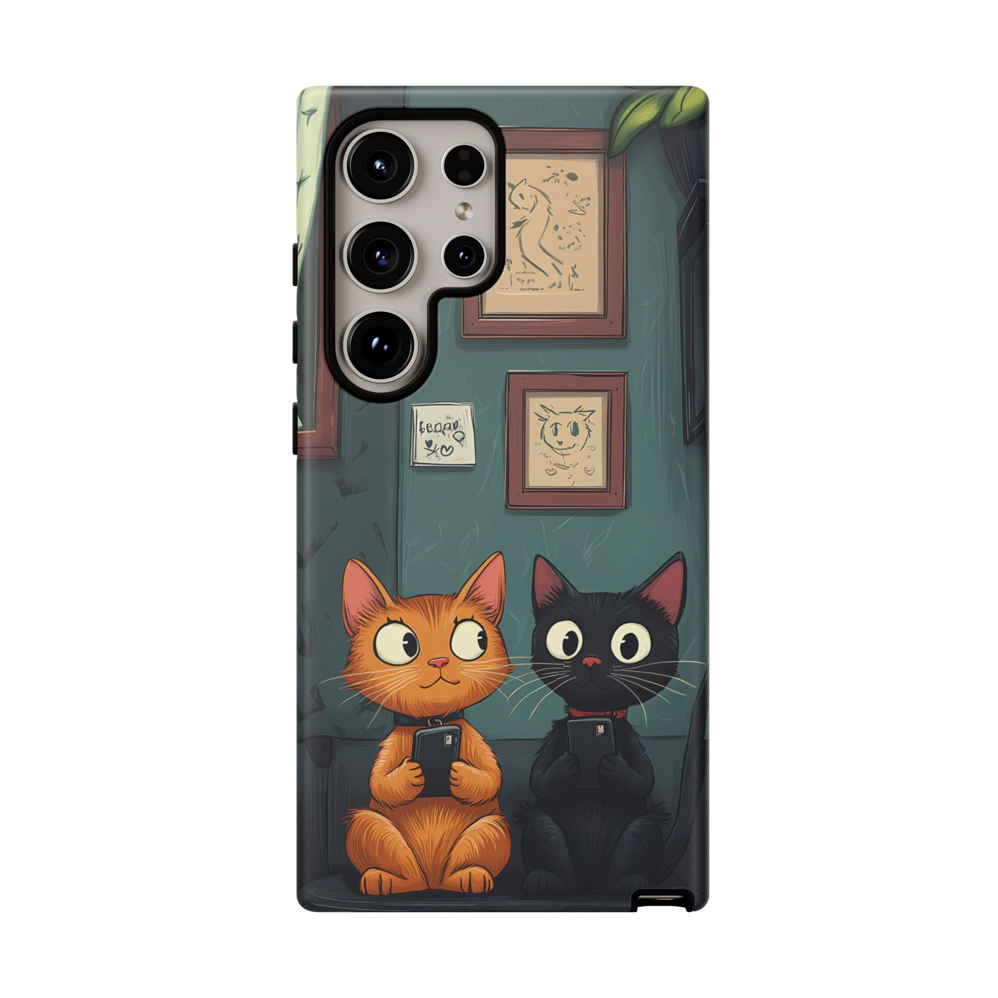 This charming design features two lovable cartoon cats sitting side by side, each holding and gazing at their phones. A playful and adorable take on feline friendships, this phone case is perfect for those who enjoy cute, humorous, and lighthearted designs