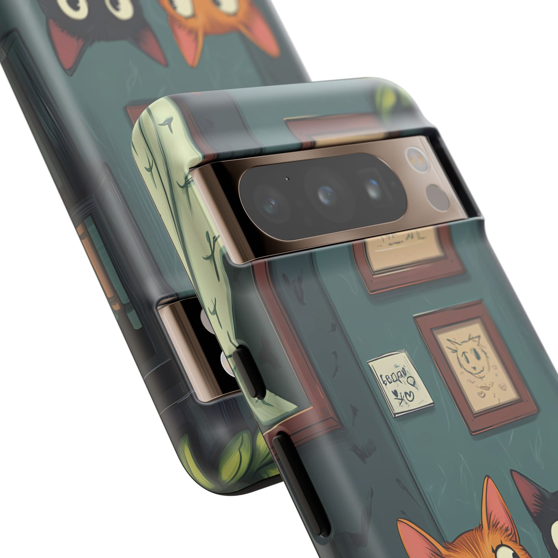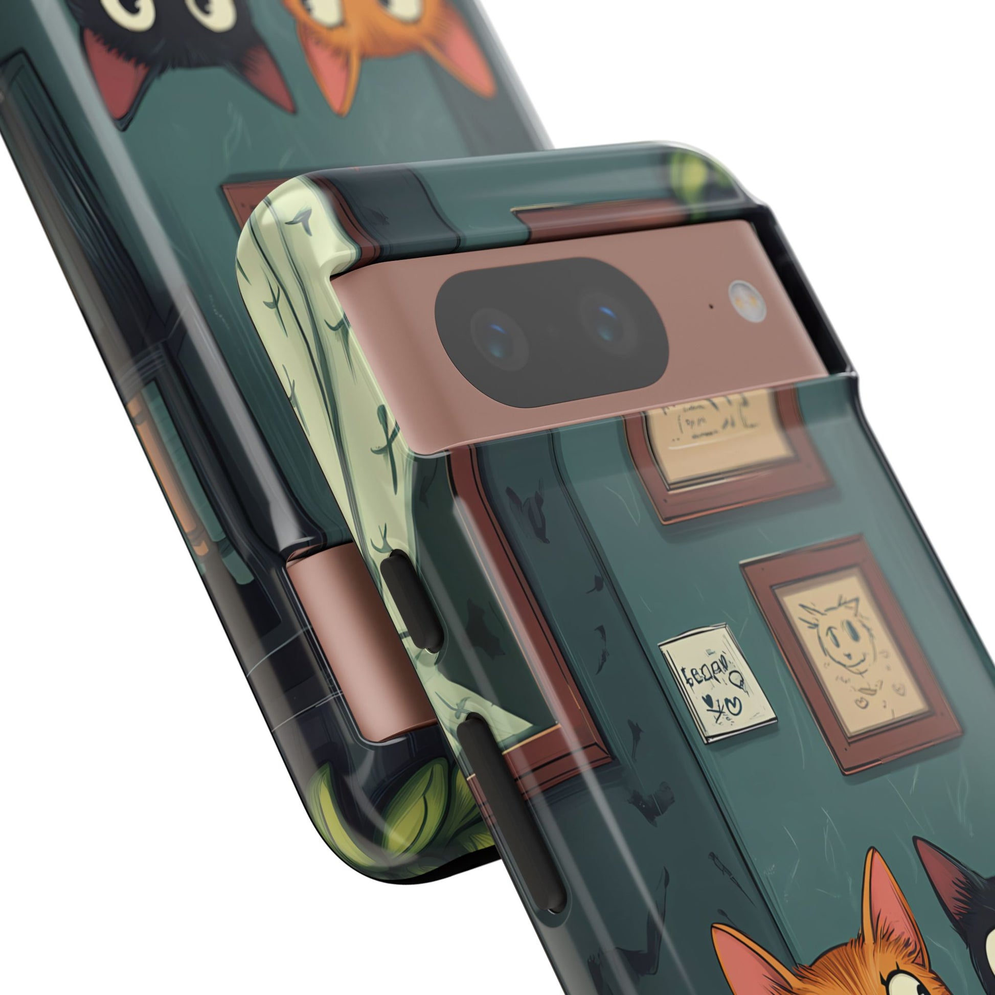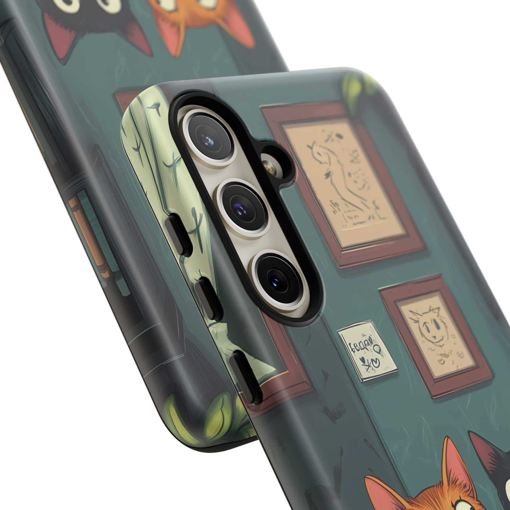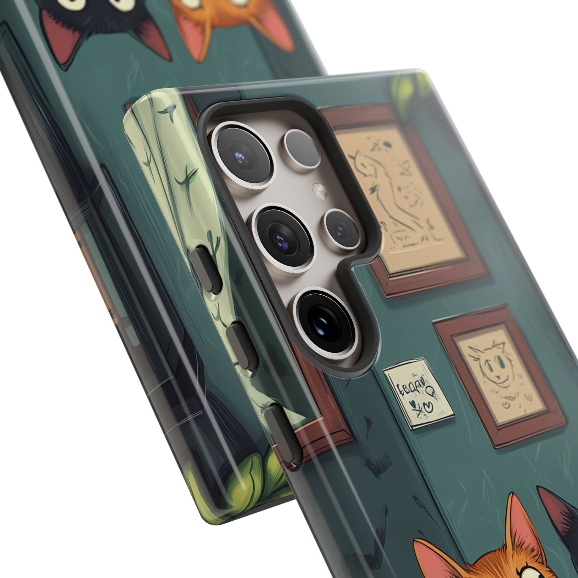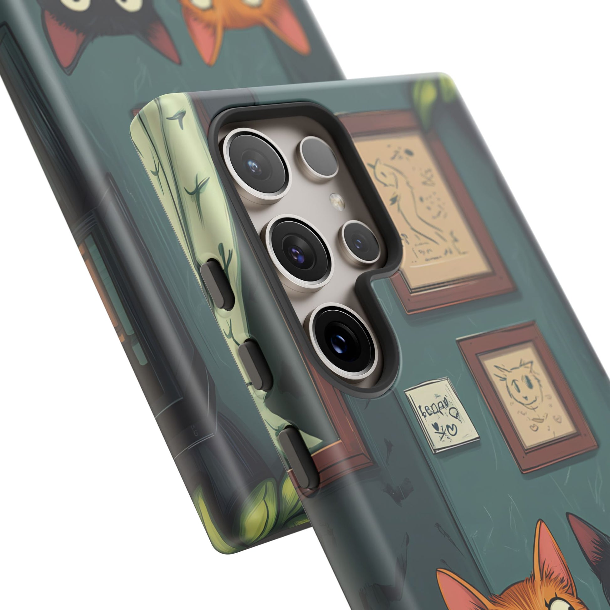 This charming design features two lovable cartoon cats sitting side by side, each holding and gazing at their phones. A playful and adorable take on feline friendships, this phone case is perfect for those who enjoy cute, humorous, and lighthearted designs