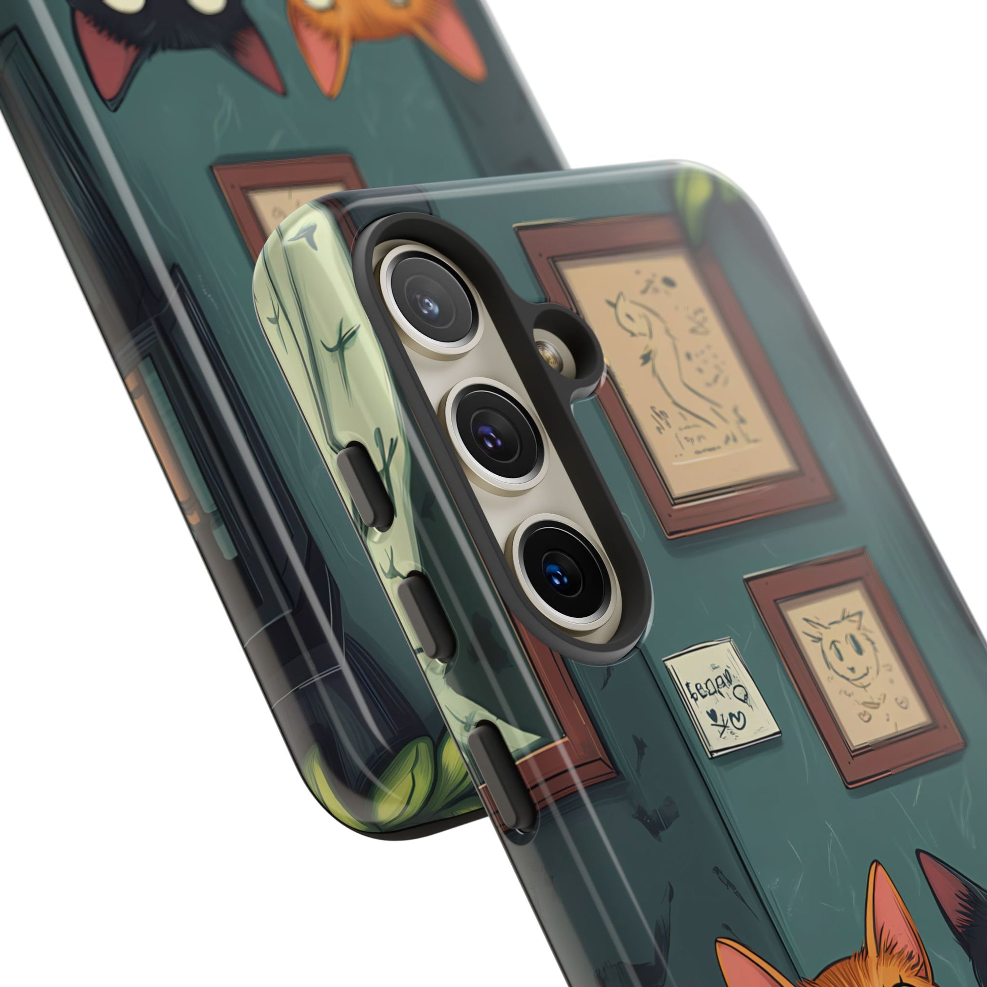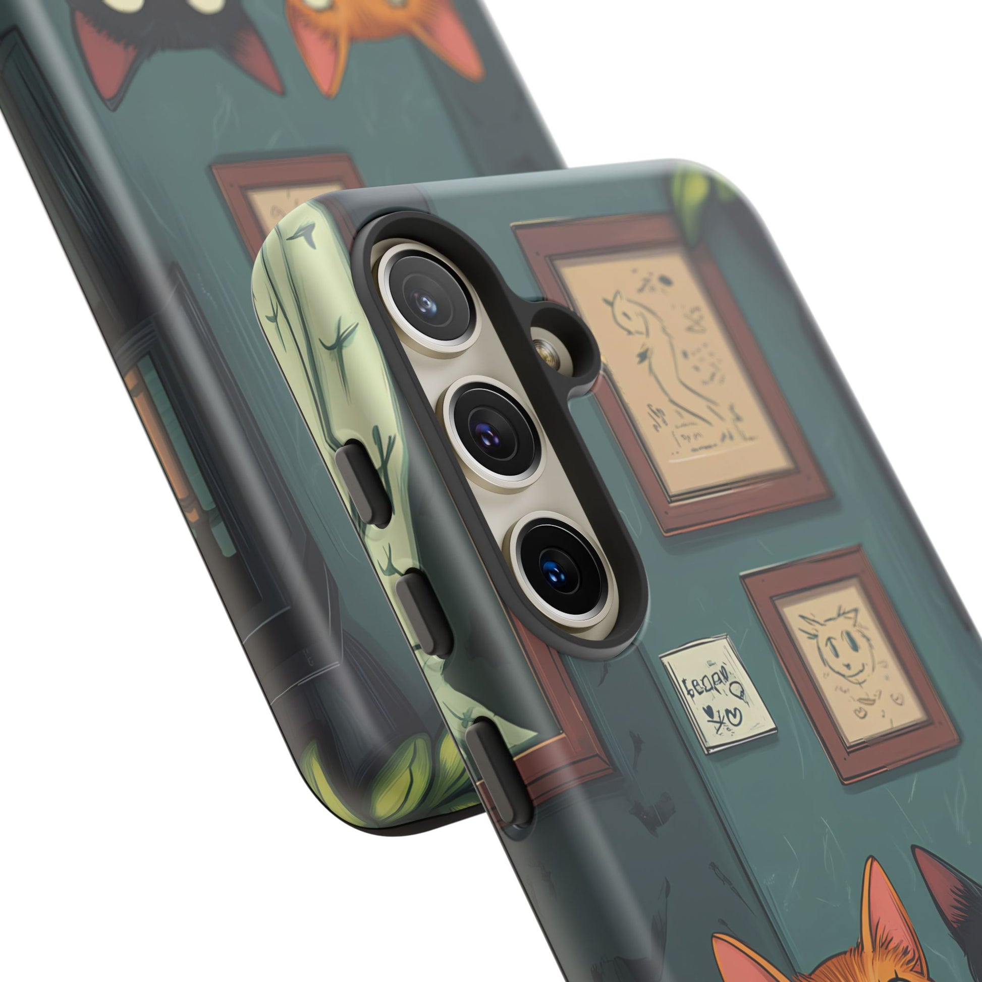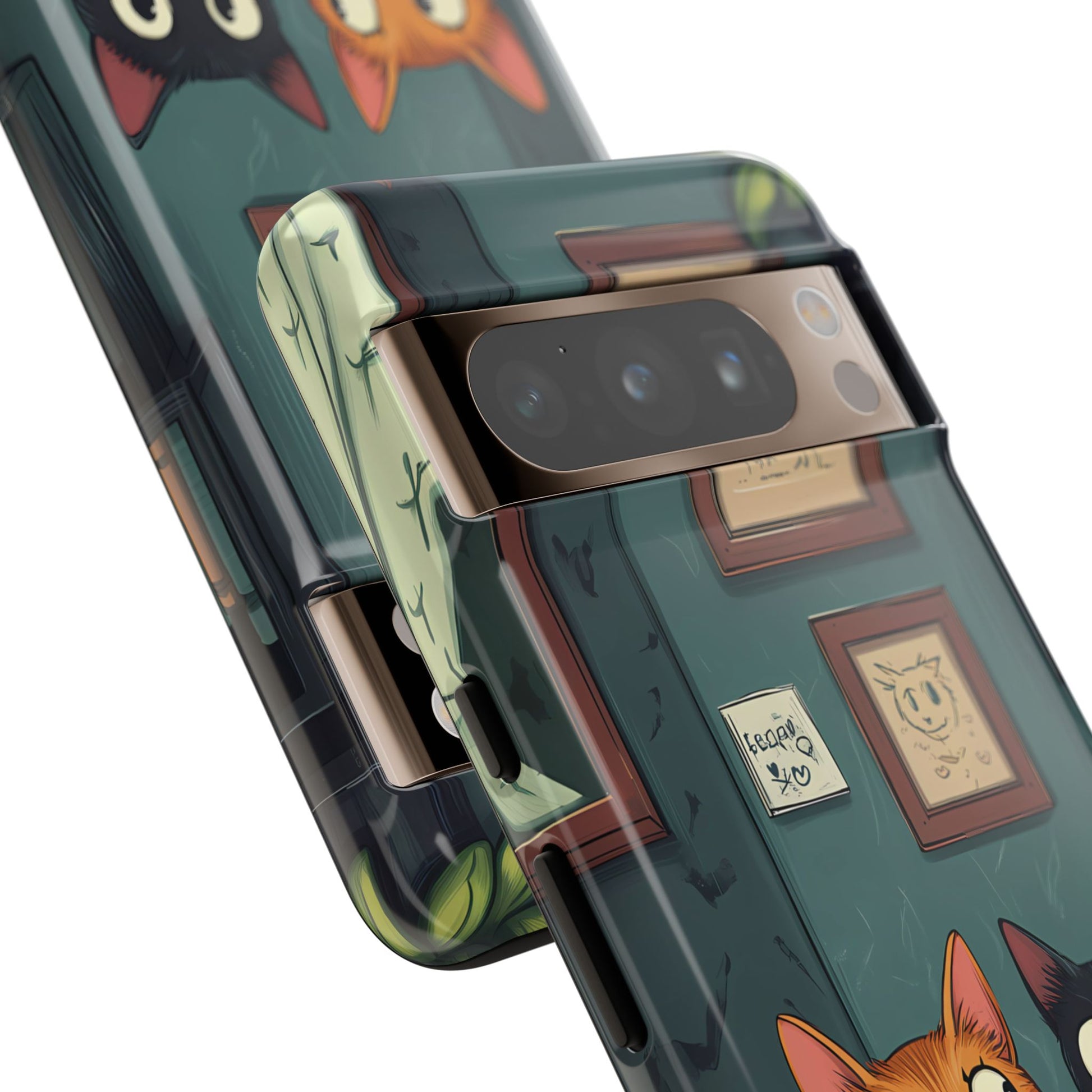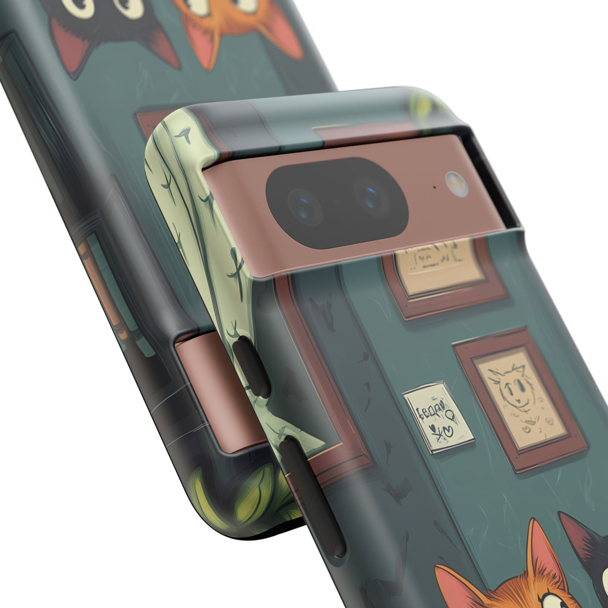 This charming design features two lovable cartoon cats sitting side by side, each holding and gazing at their phones. A playful and adorable take on feline friendships, this phone case is perfect for those who enjoy cute, humorous, and lighthearted designs