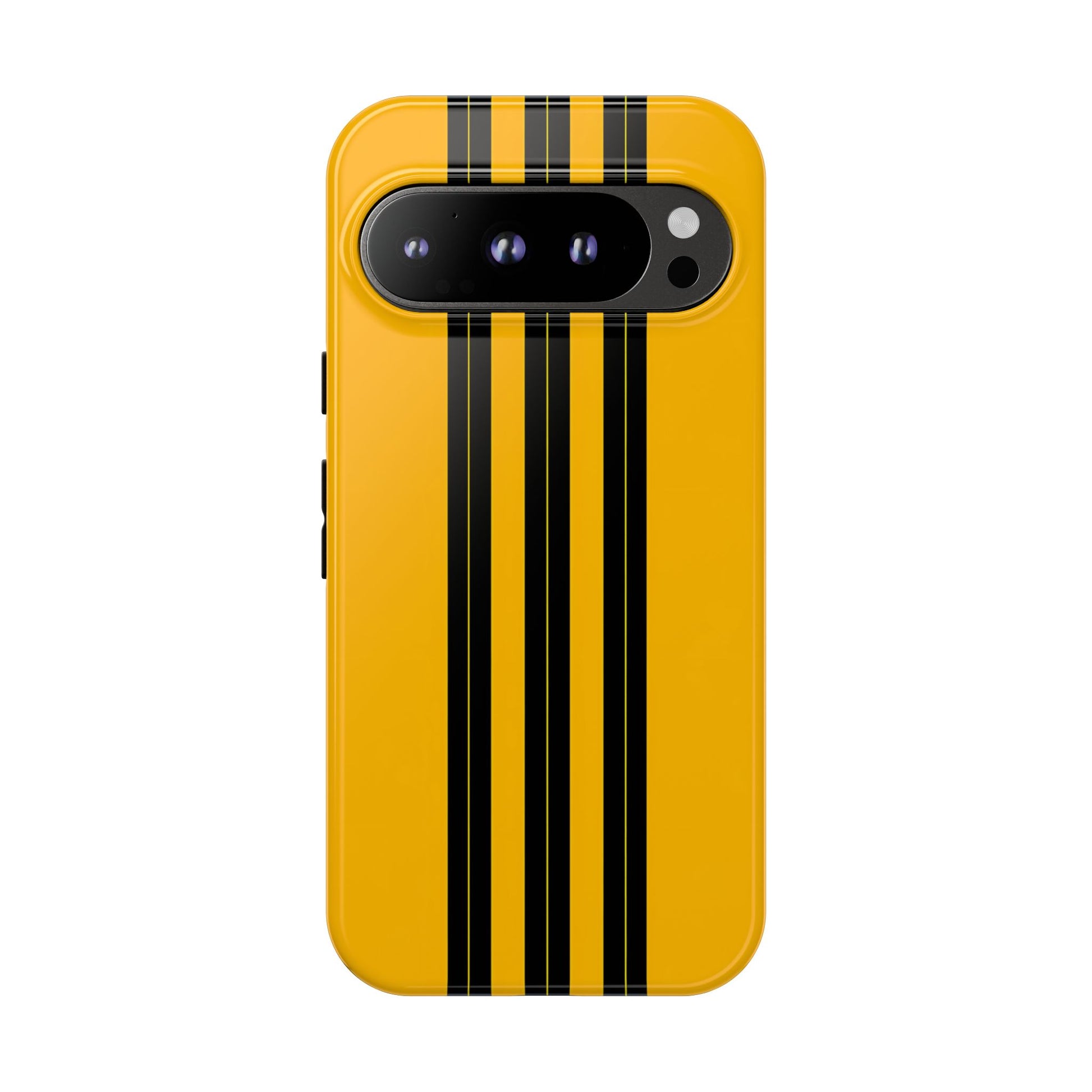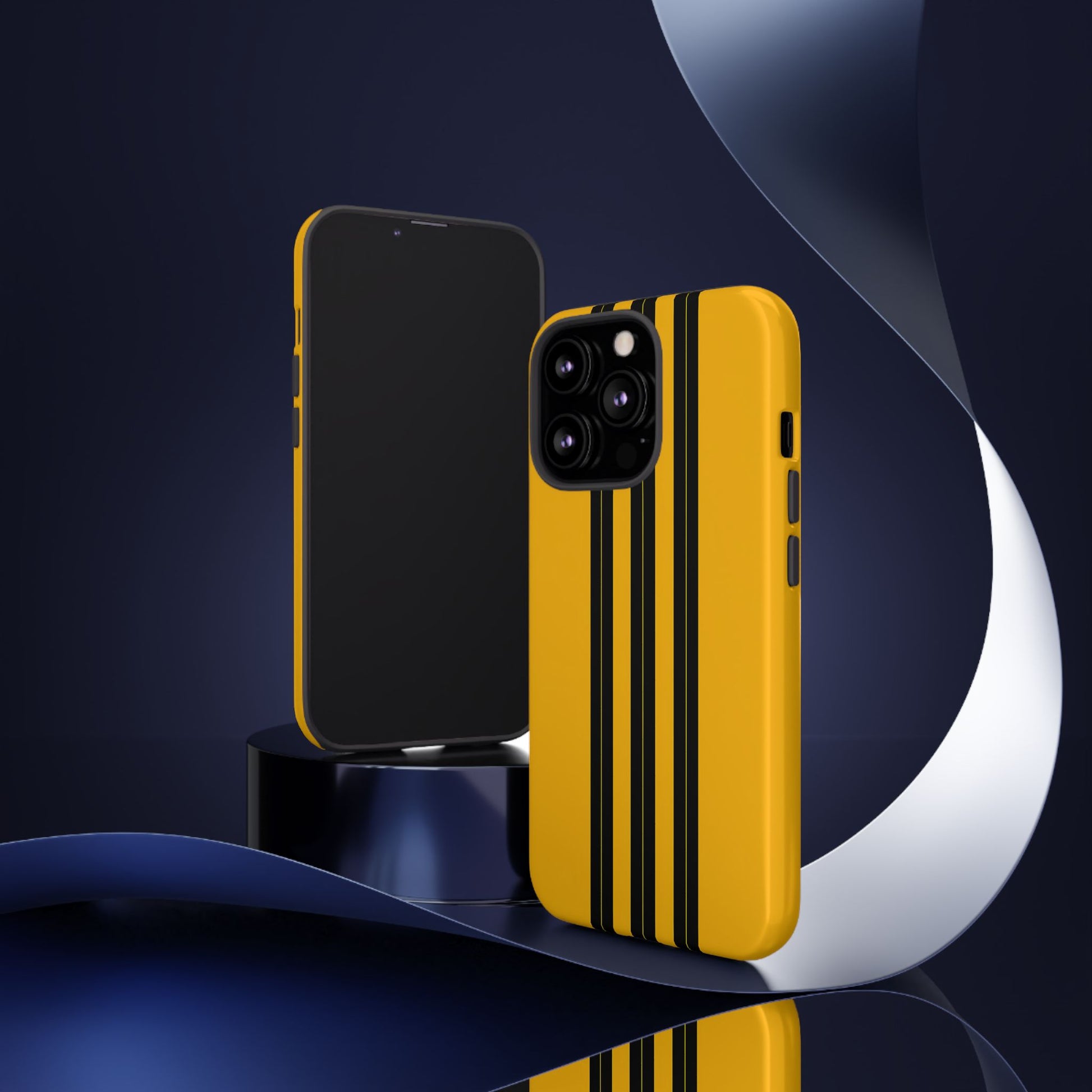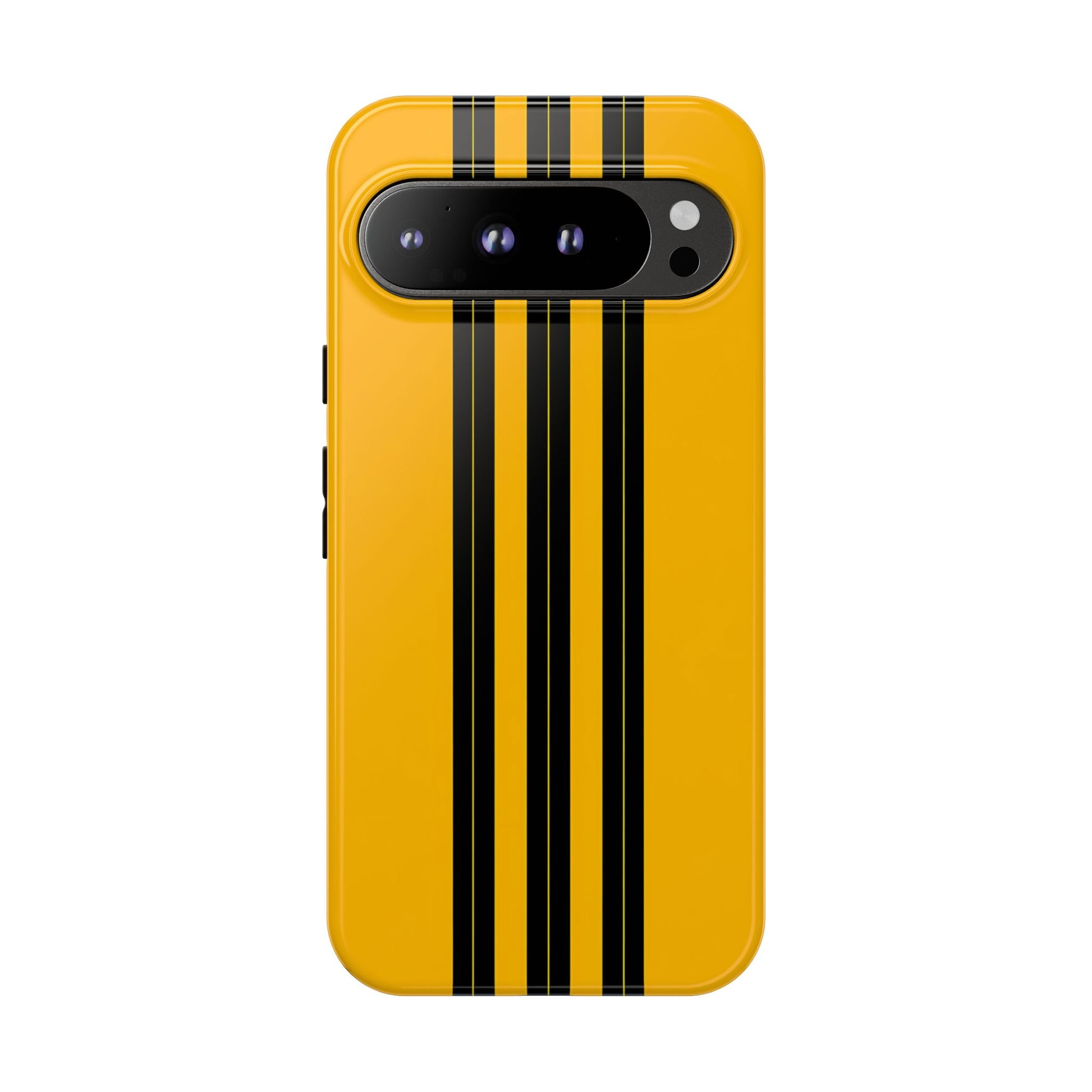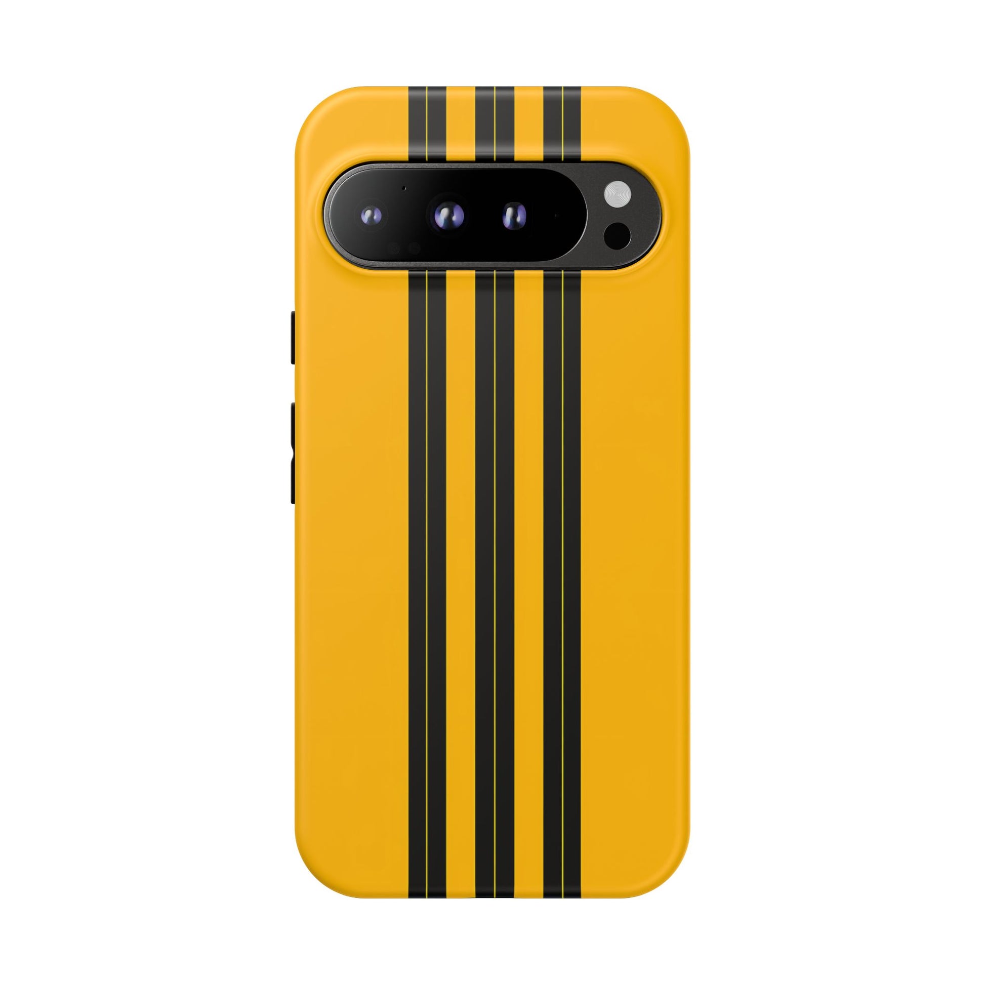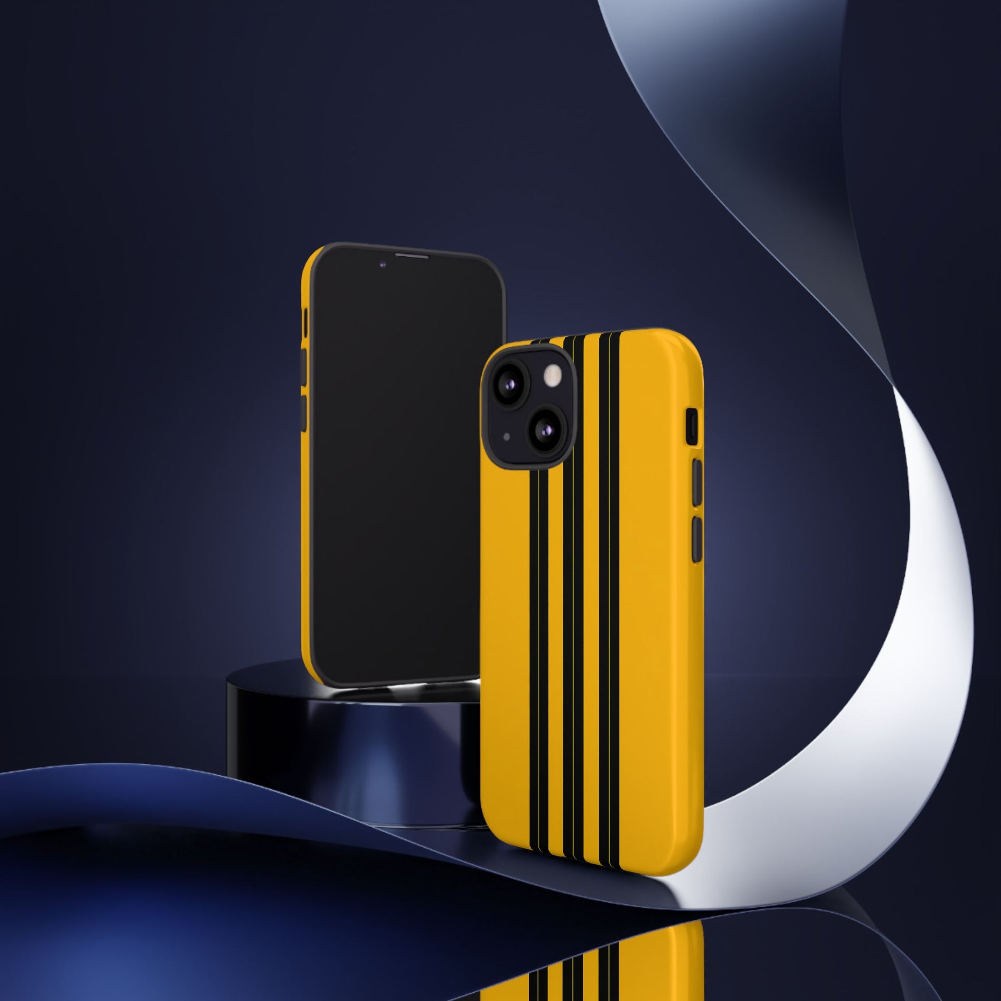 A minimalist, refined design featuring three crisp vertical black stripes arranged on a smooth yellow background, creating a clean, modern, high-contrast aesthetic.