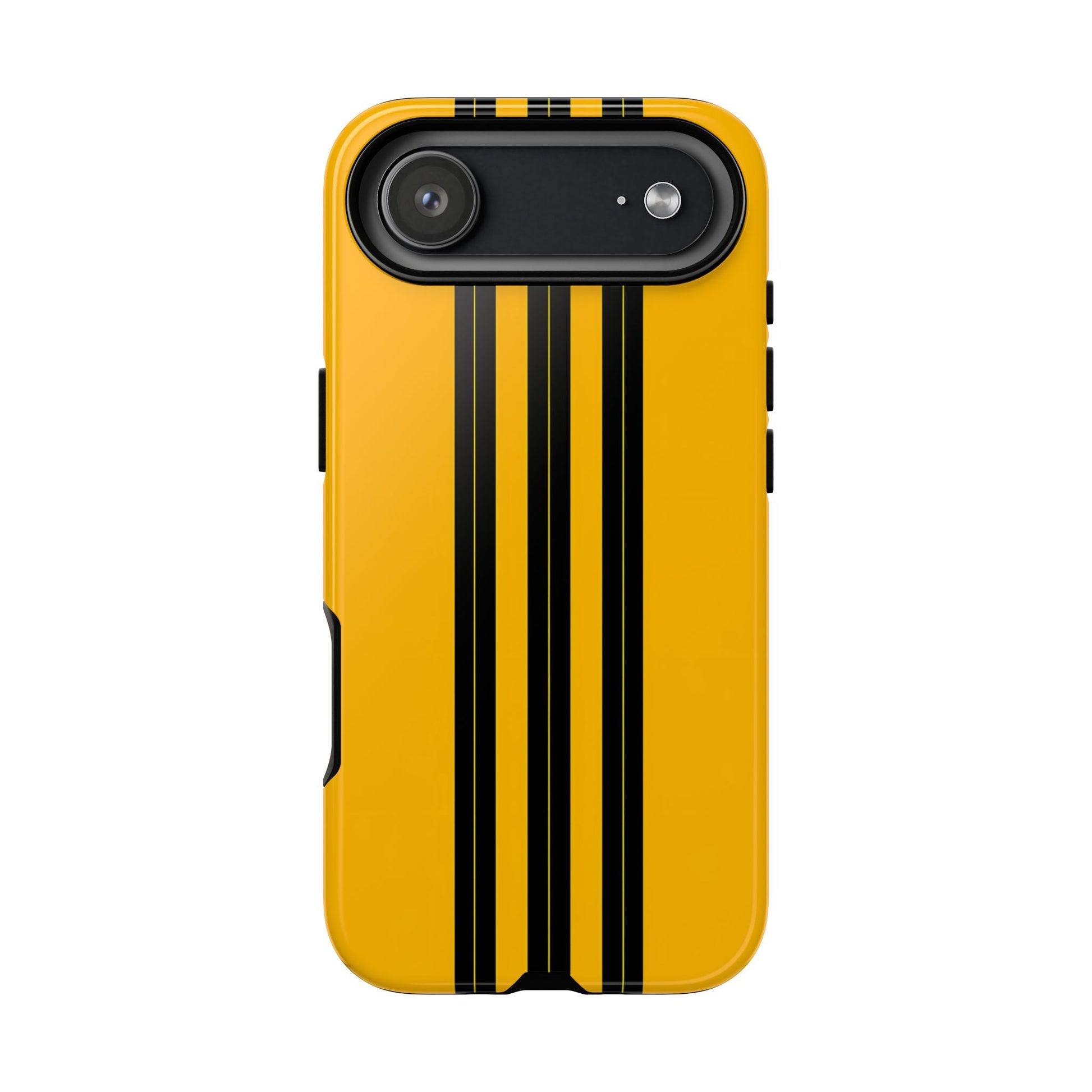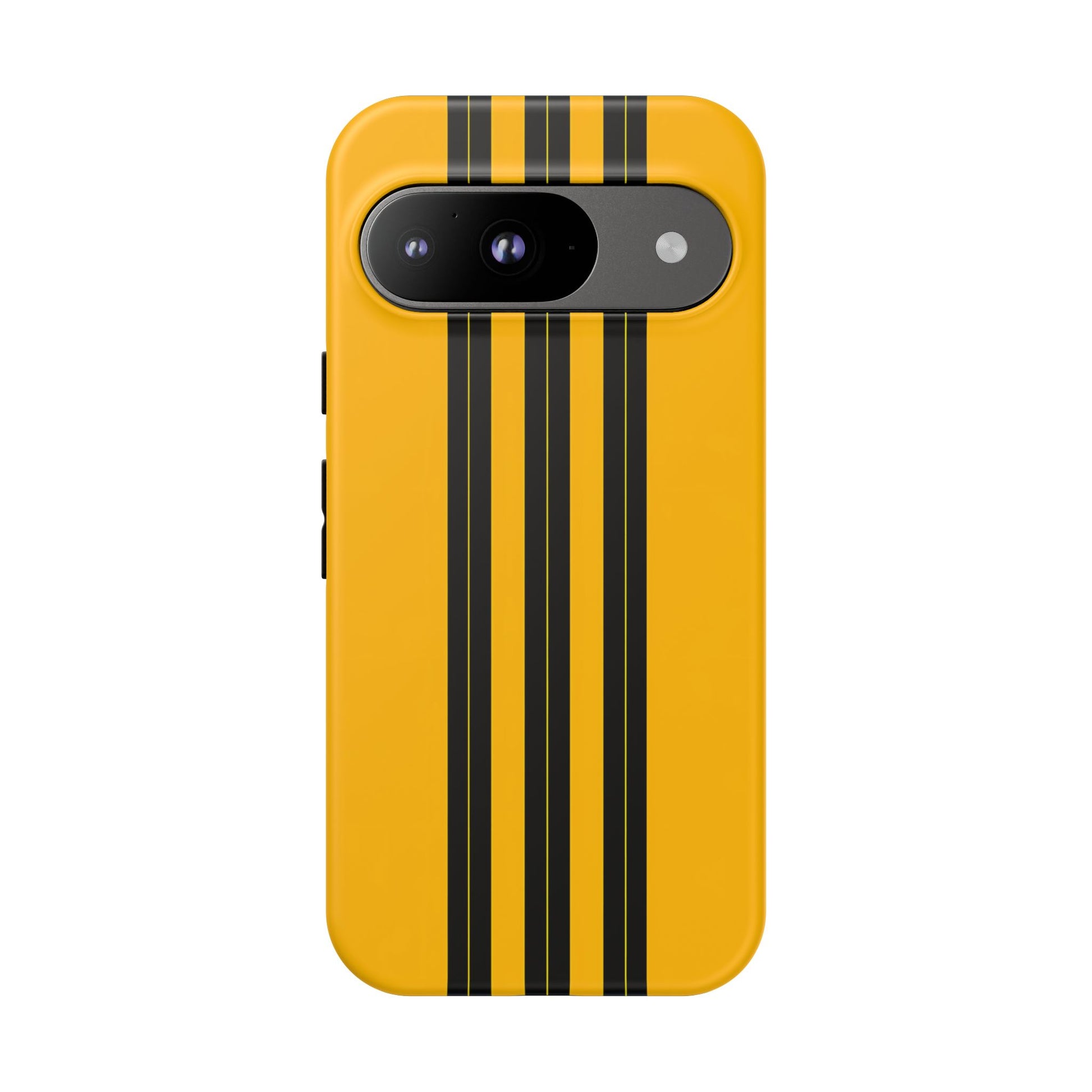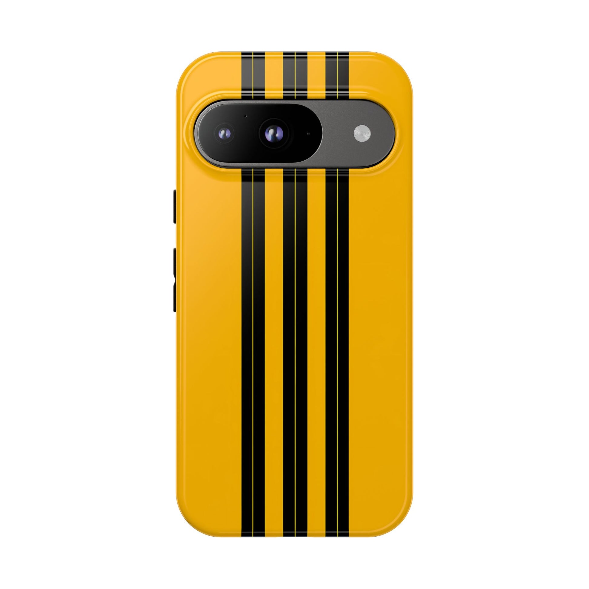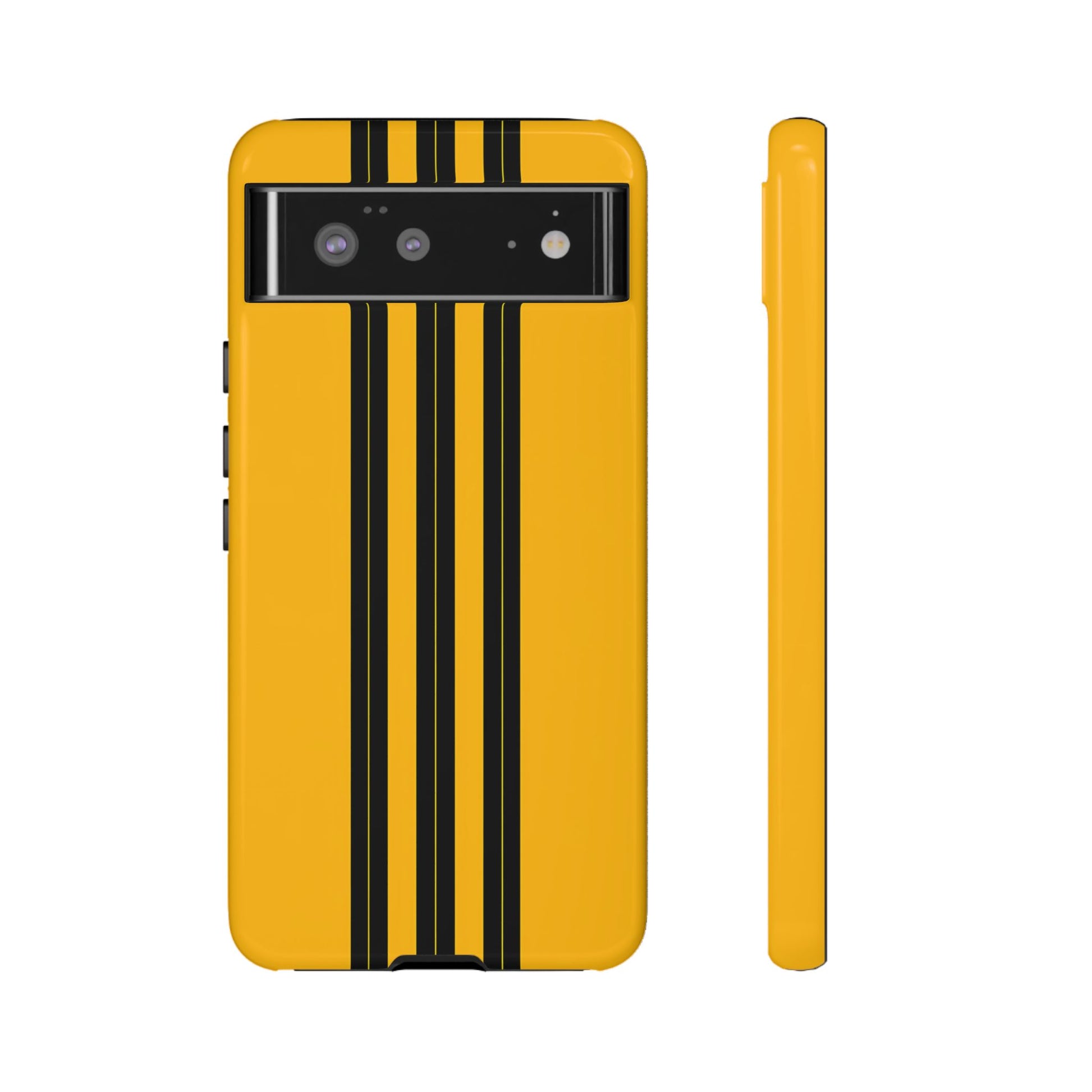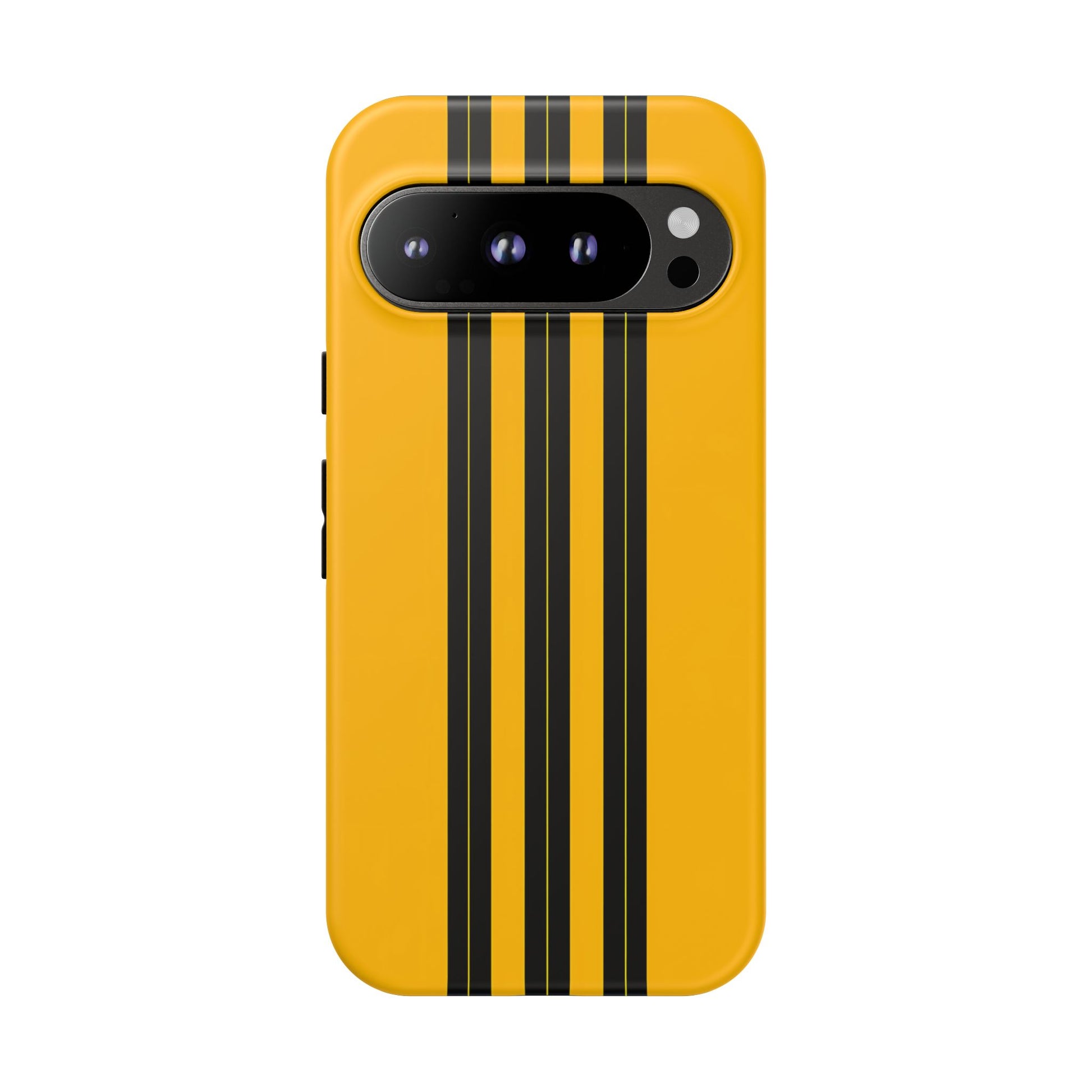 A minimalist, refined design featuring three crisp vertical black stripes arranged on a smooth yellow background, creating a clean, modern, high-contrast aesthetic.