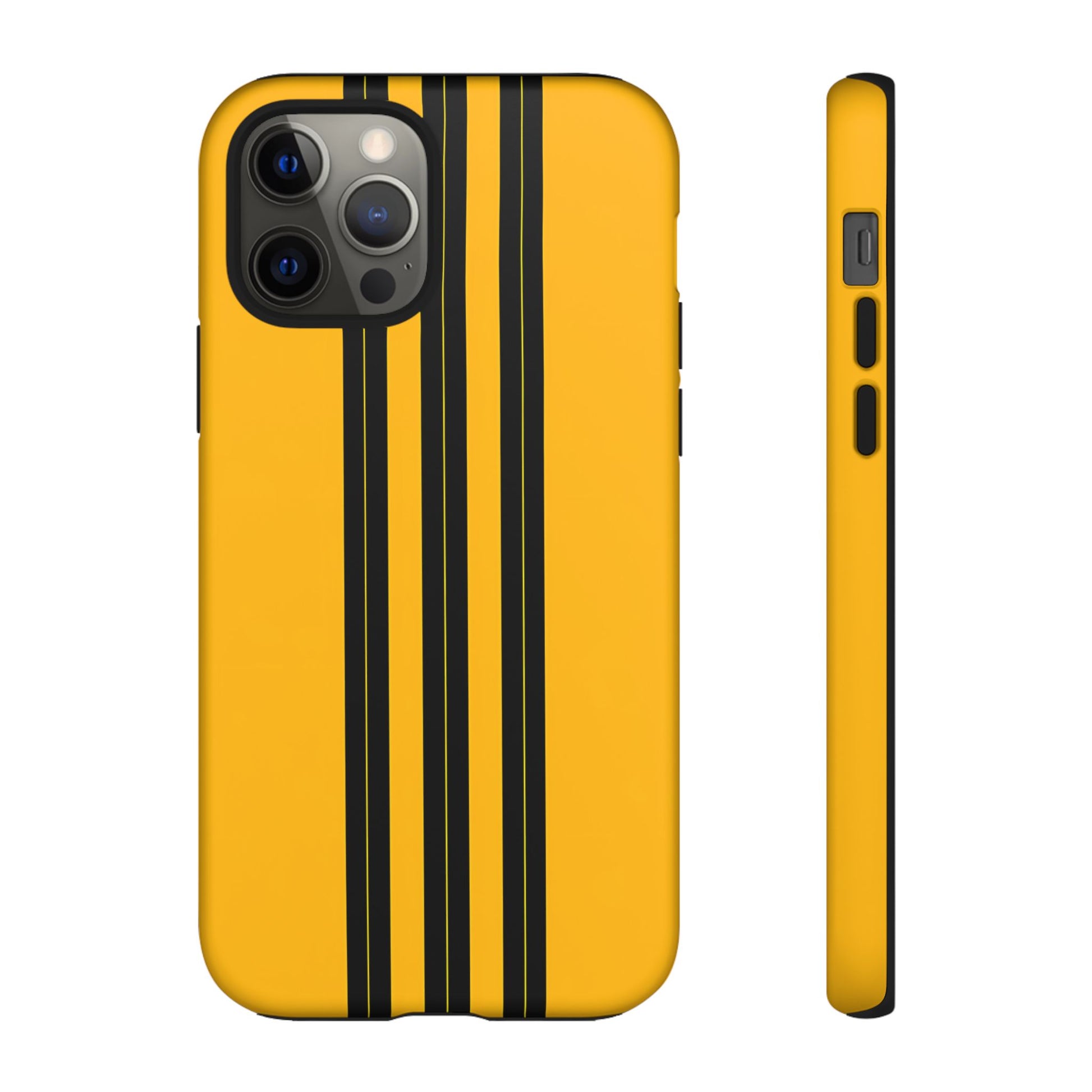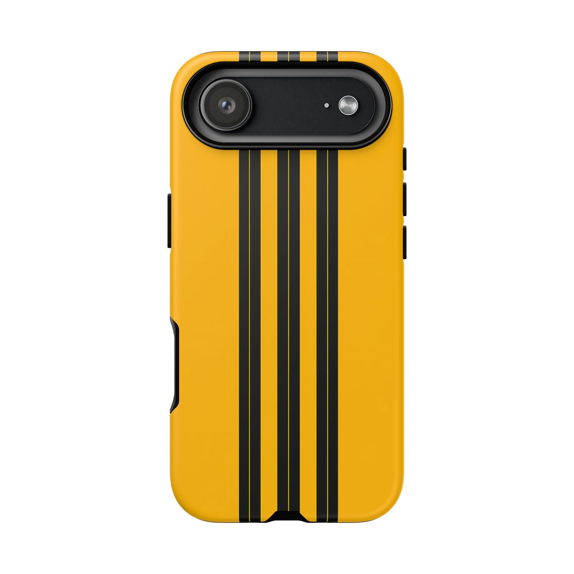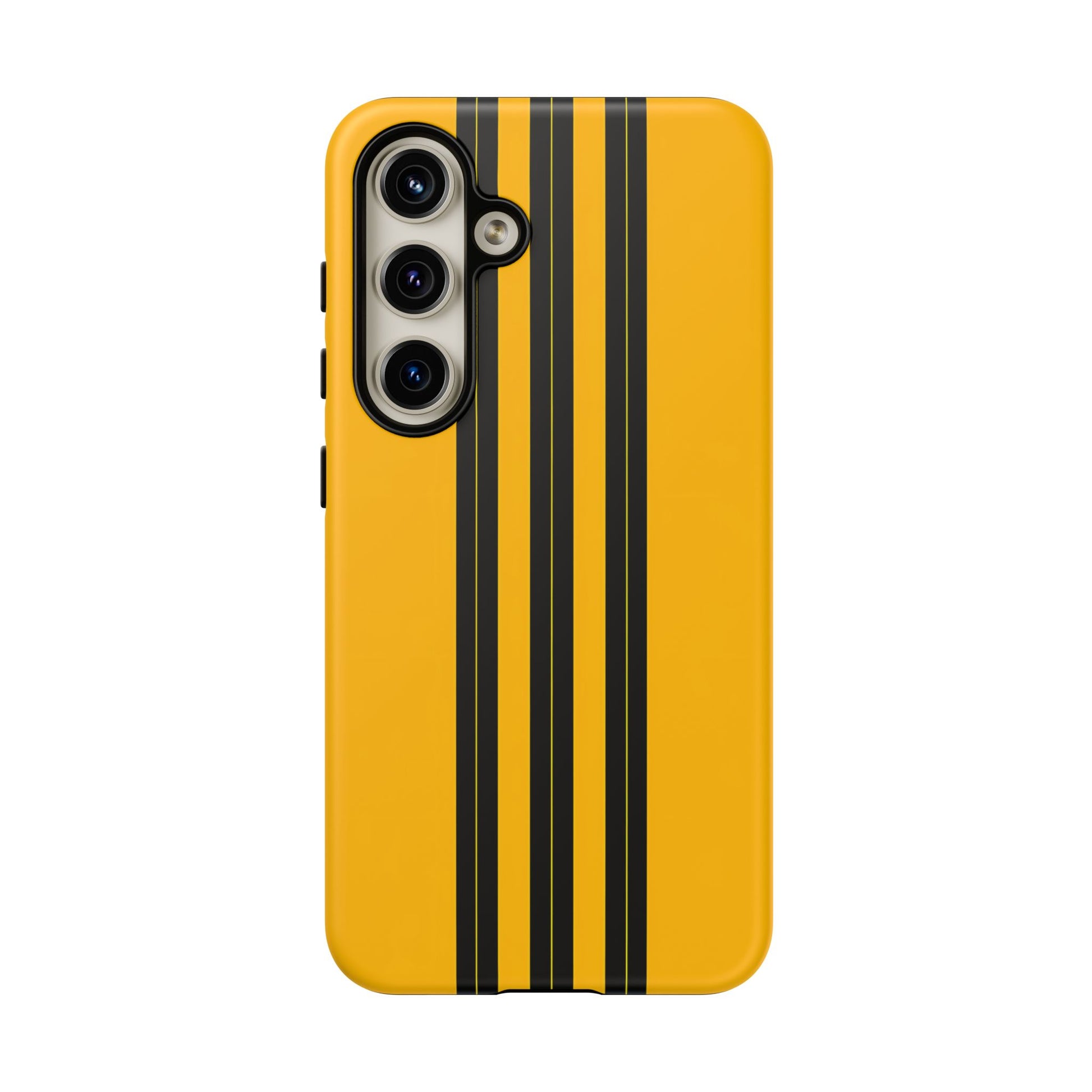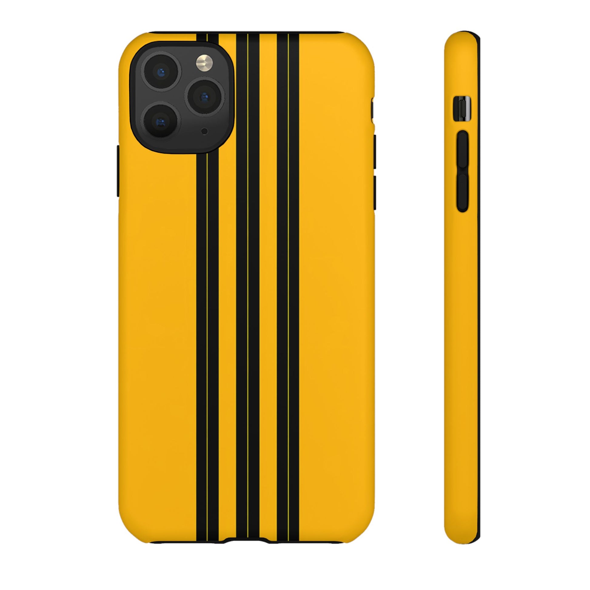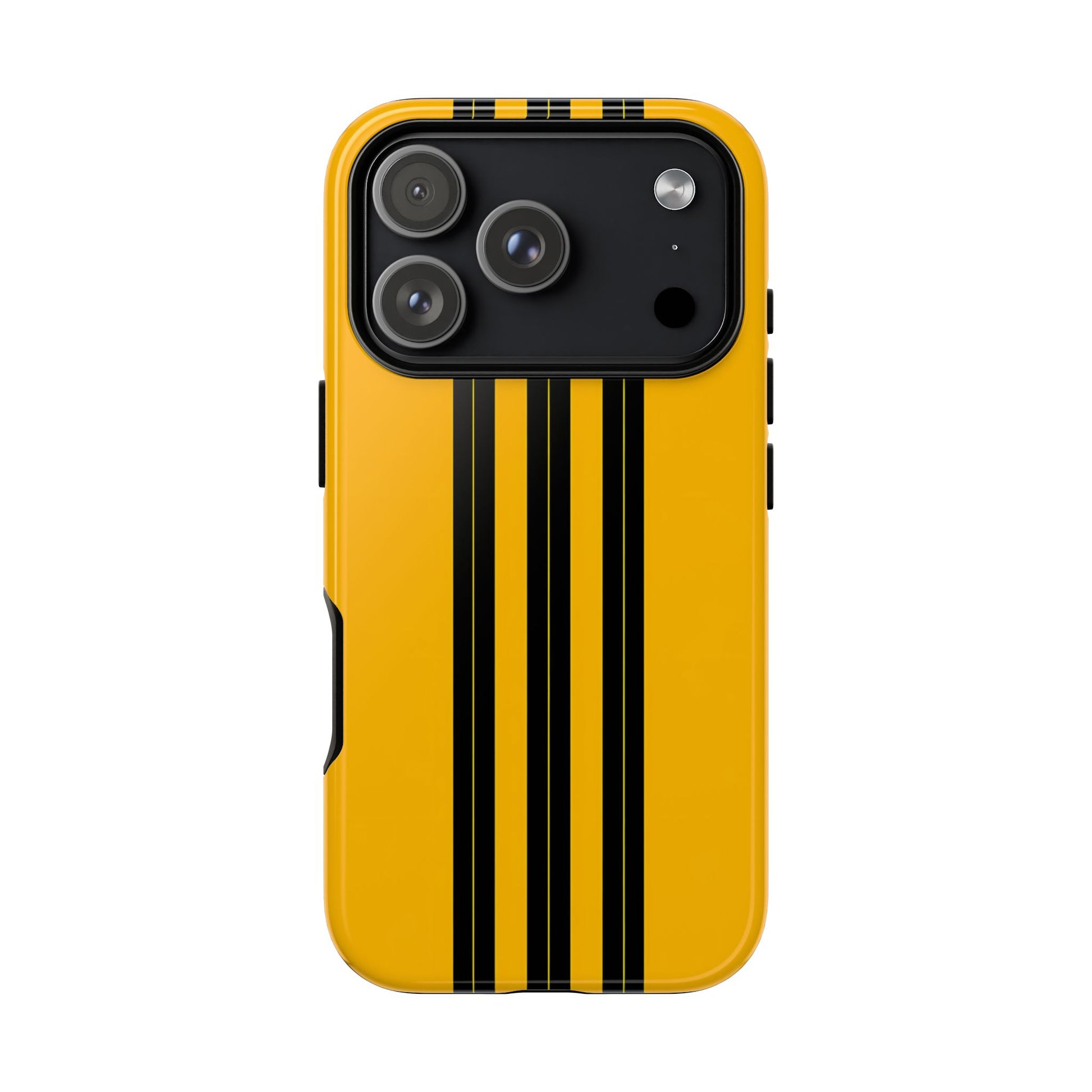 A minimalist, refined design featuring three crisp vertical black stripes arranged on a smooth yellow background, creating a clean, modern, high-contrast aesthetic.