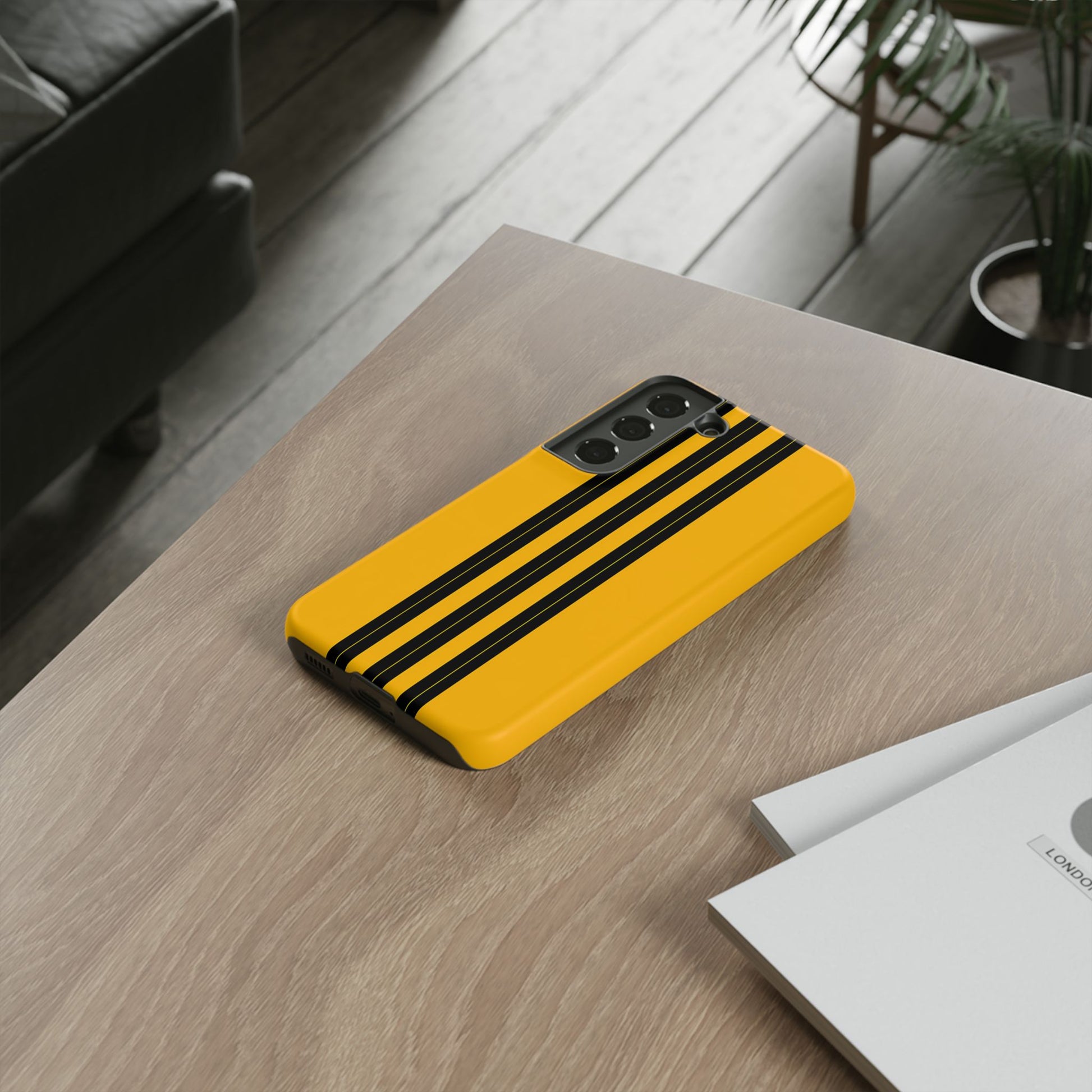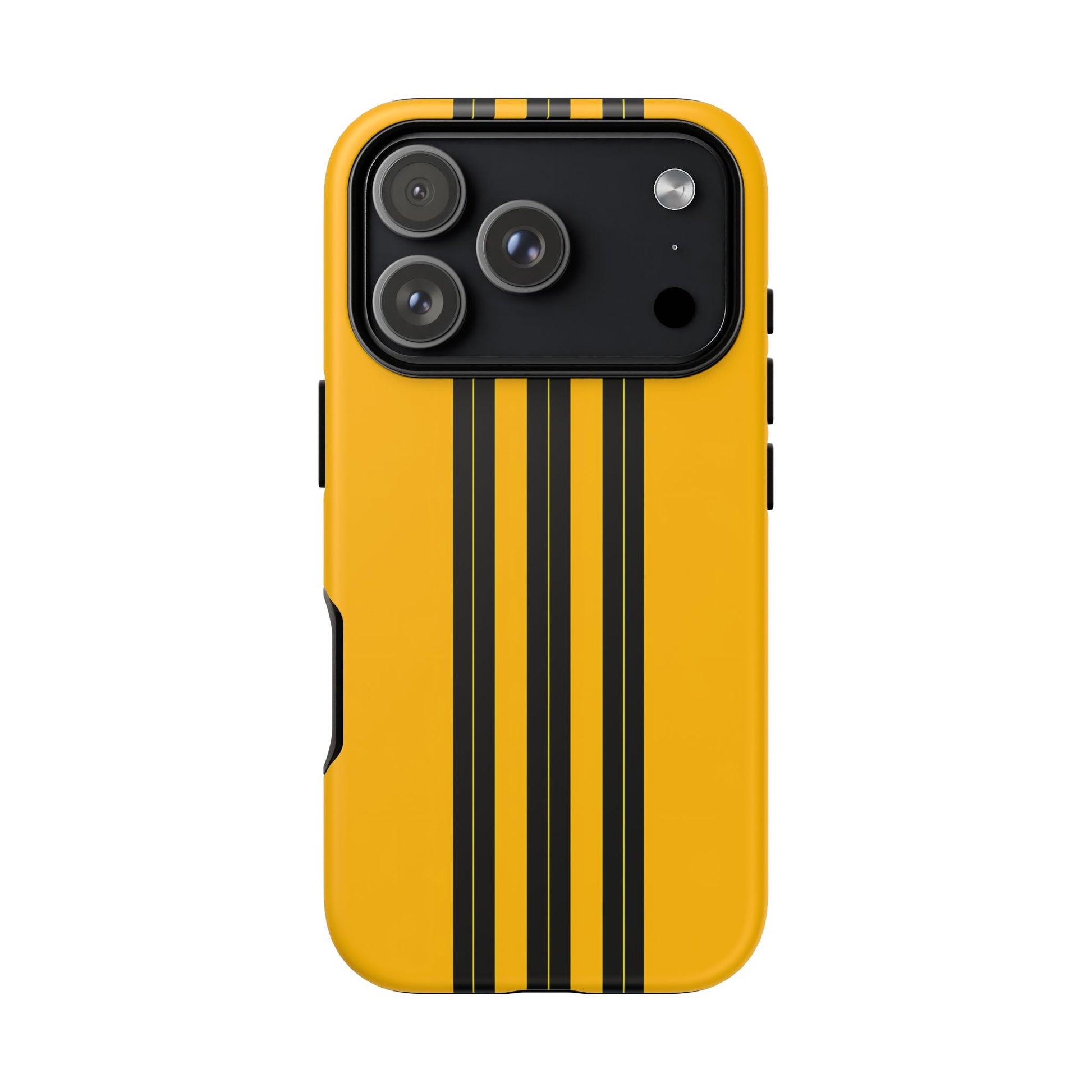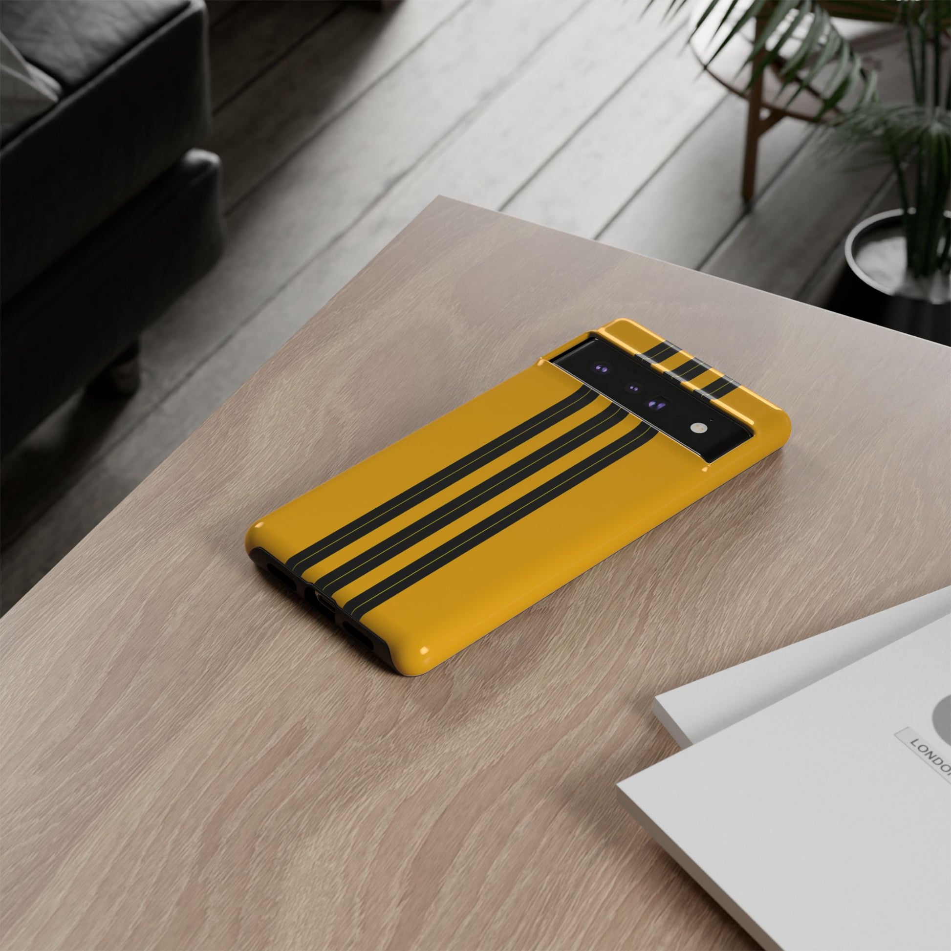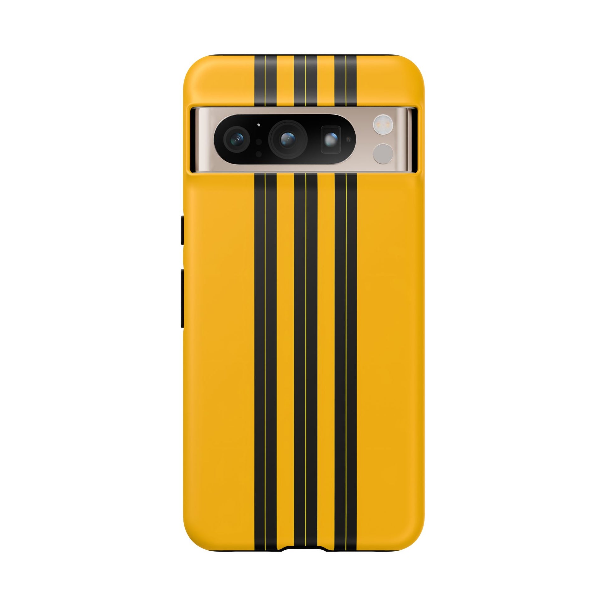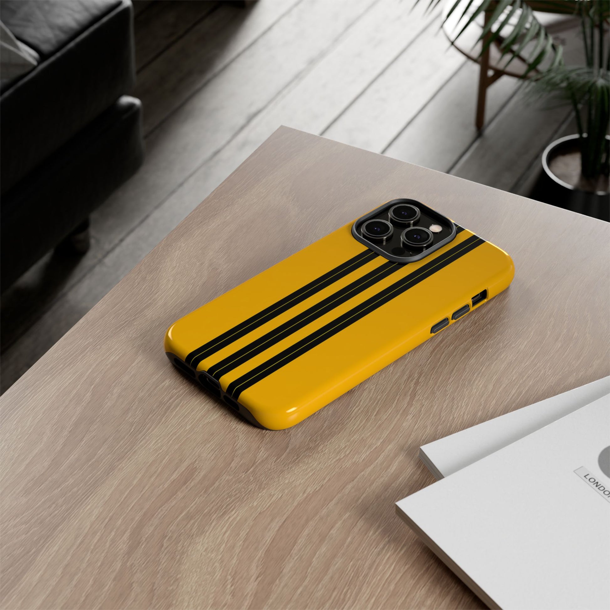 A minimalist, refined design featuring three crisp vertical black stripes arranged on a smooth yellow background, creating a clean, modern, high-contrast aesthetic.