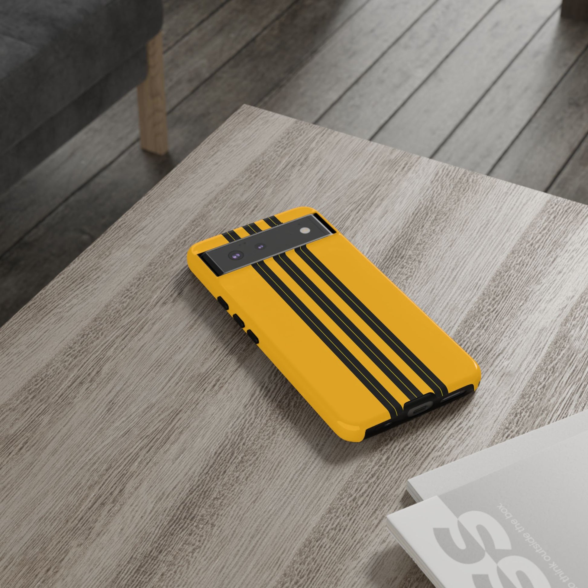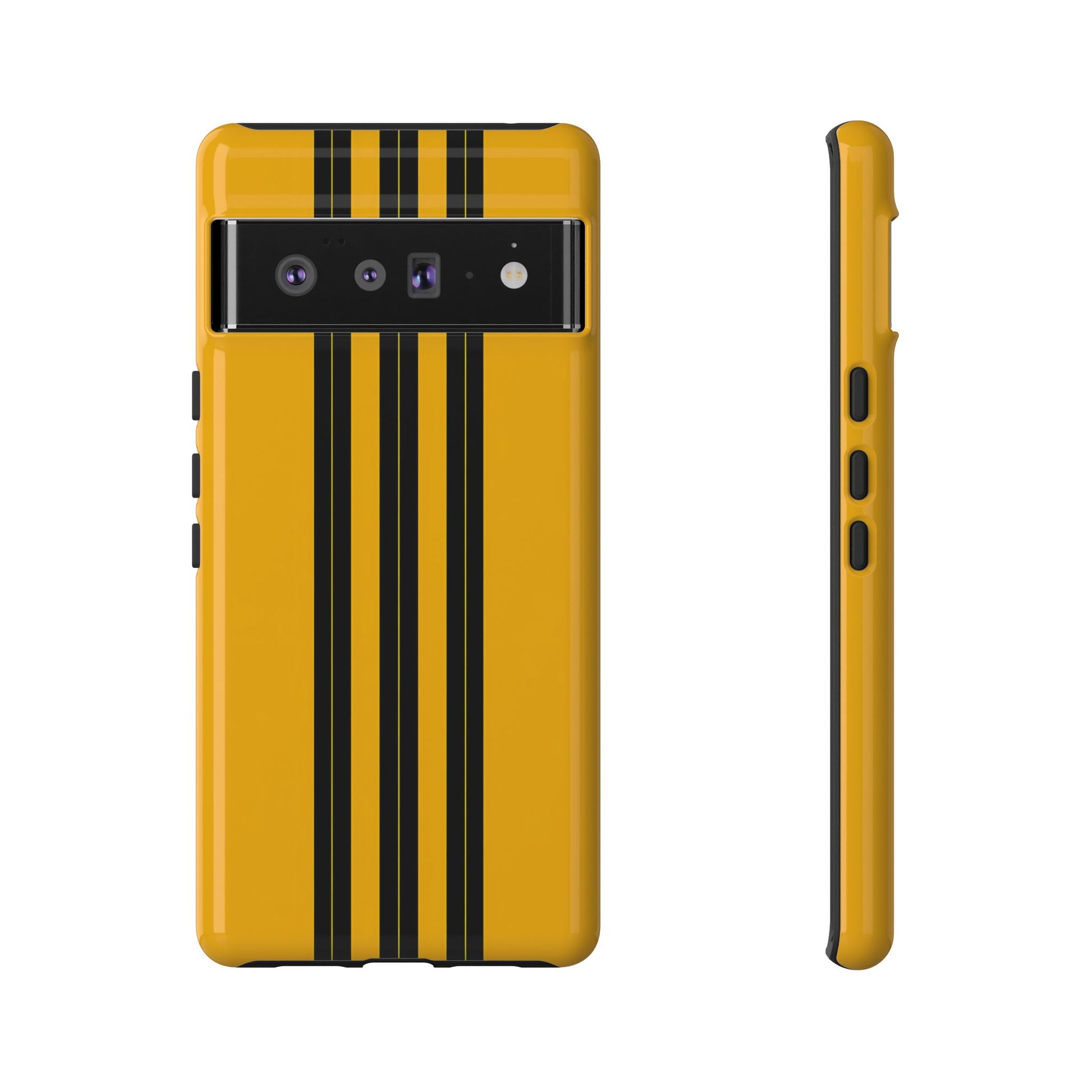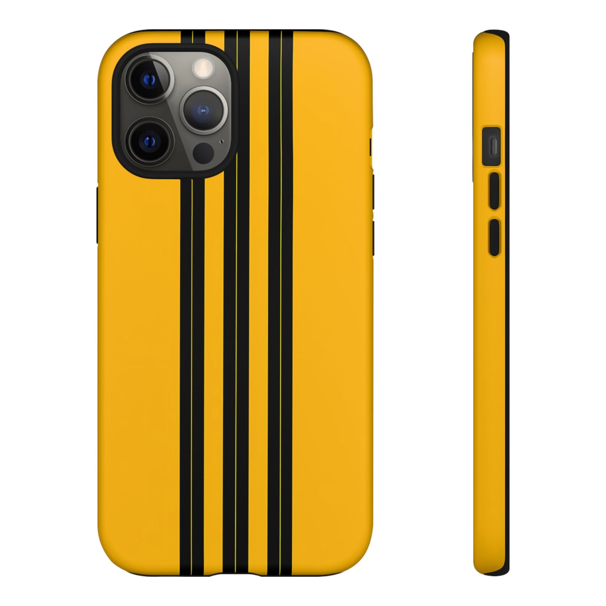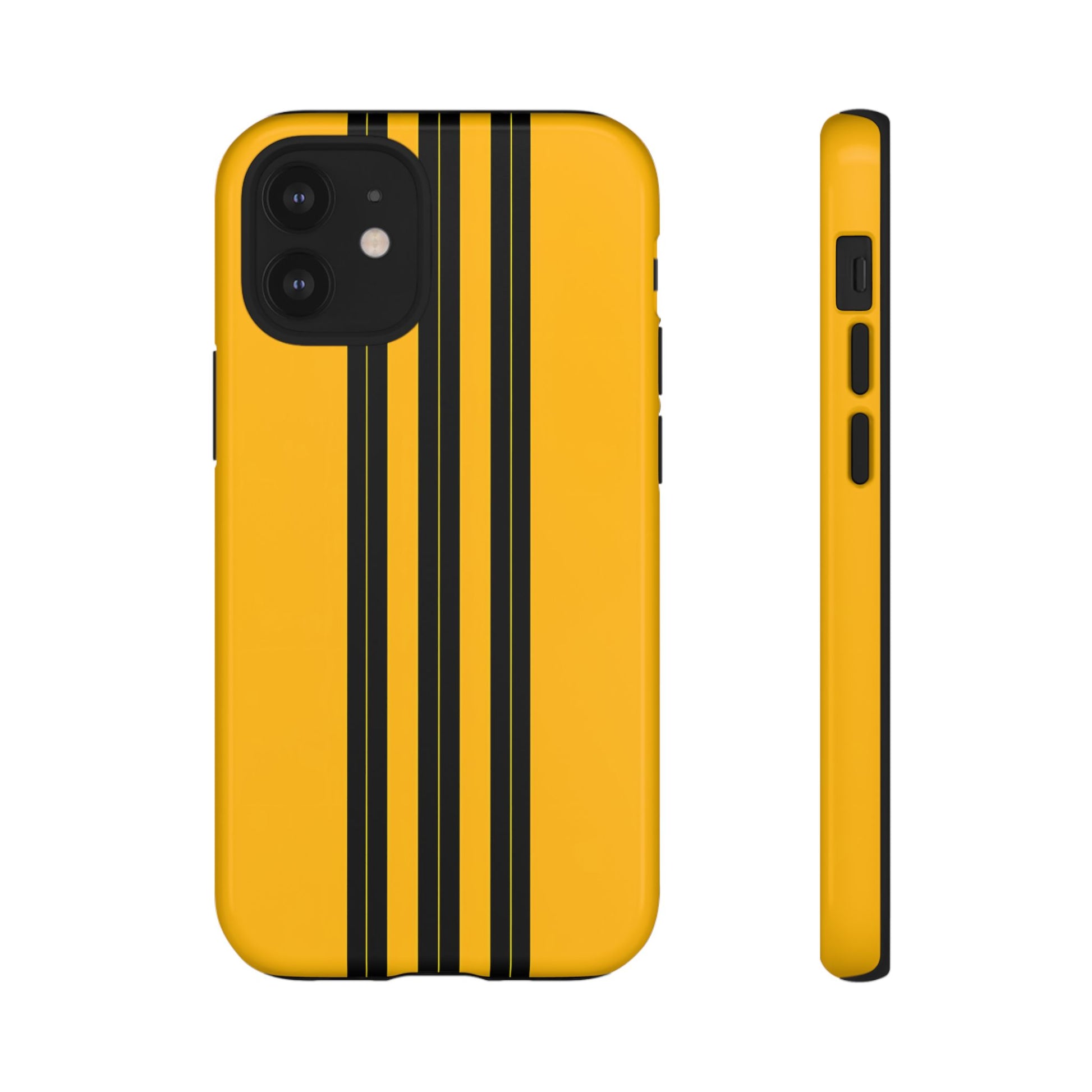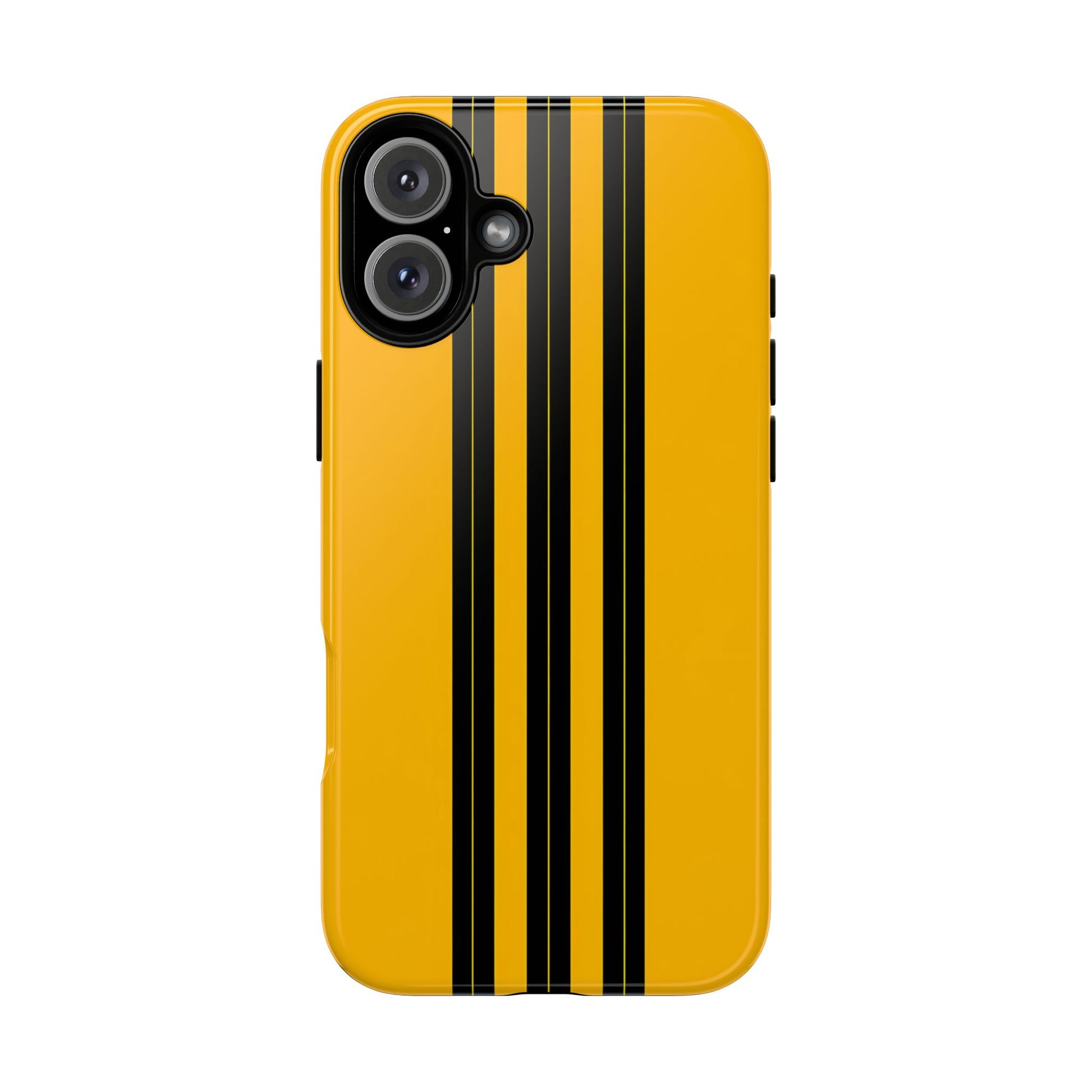 A minimalist, refined design featuring three crisp vertical black stripes arranged on a smooth yellow background, creating a clean, modern, high-contrast aesthetic.