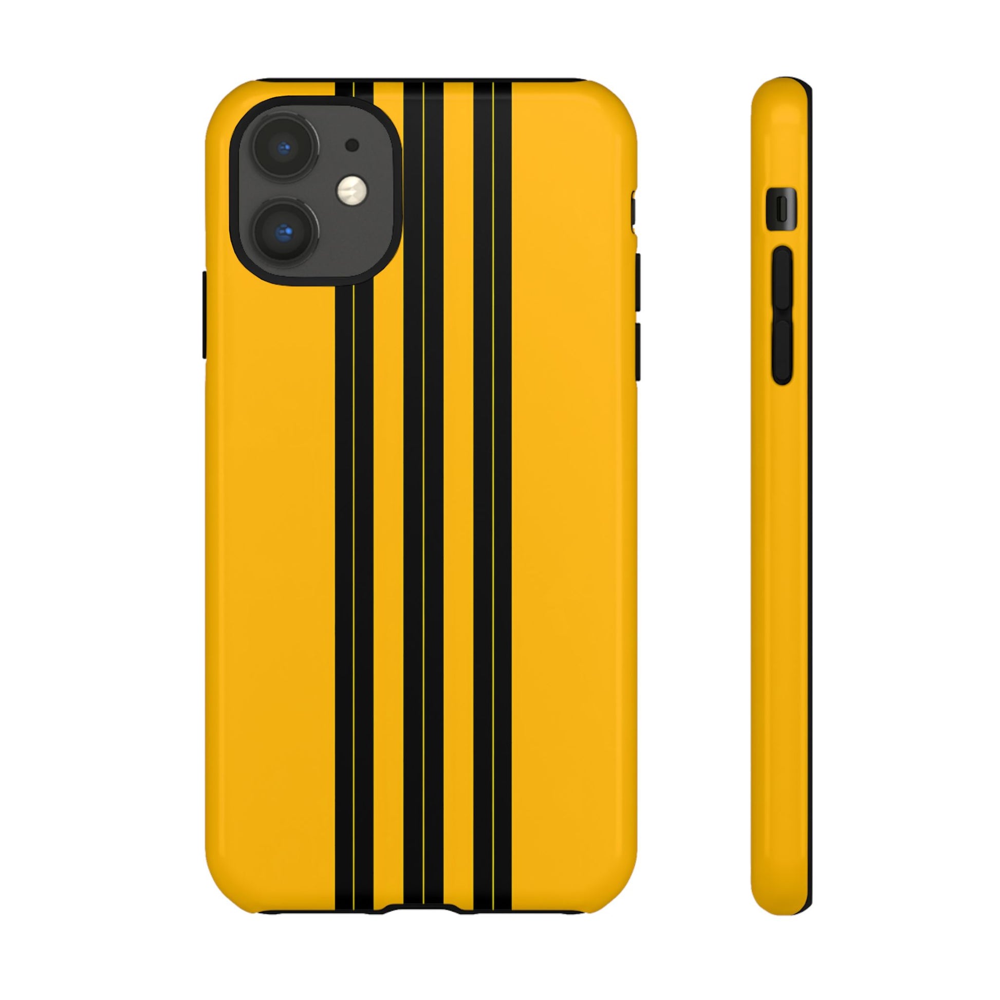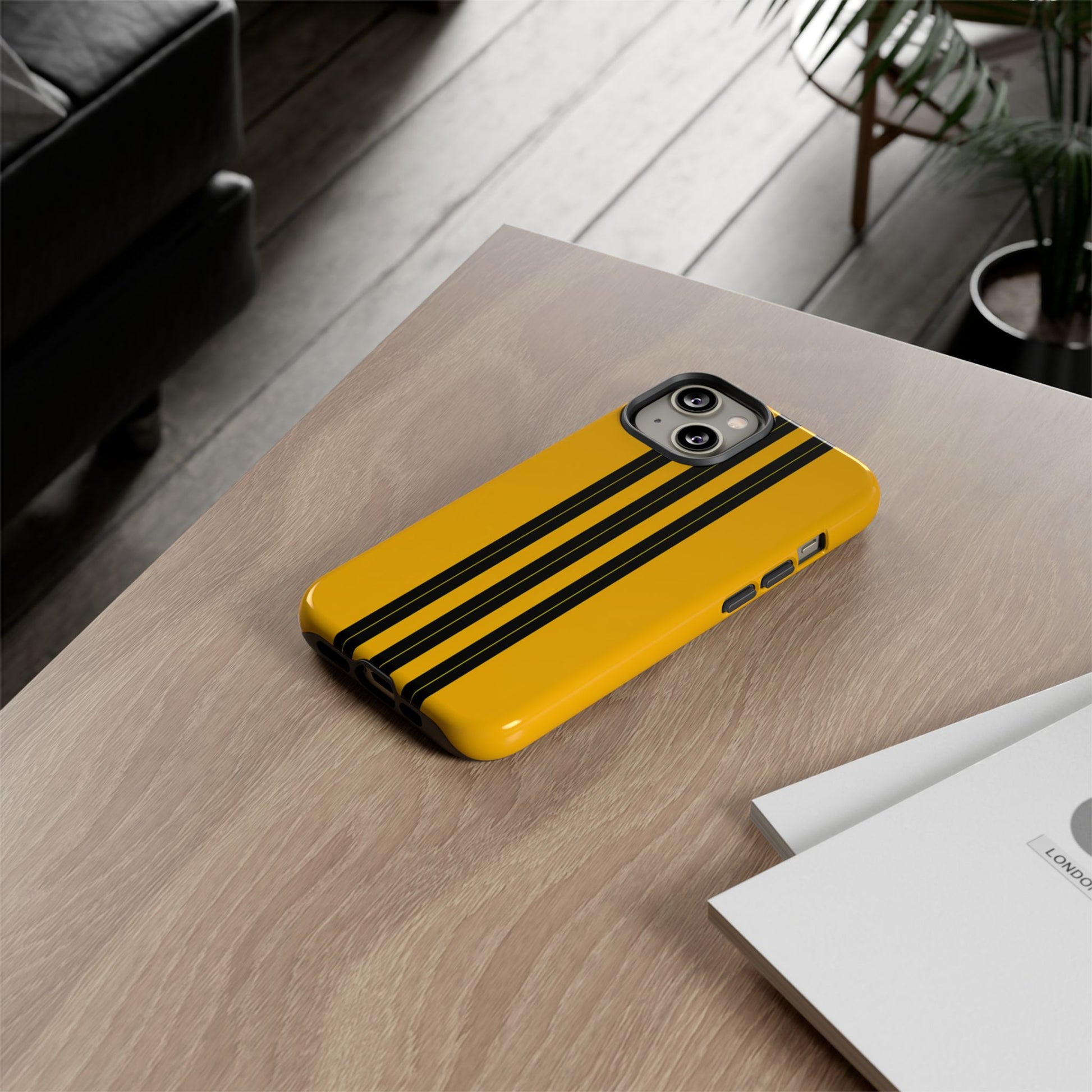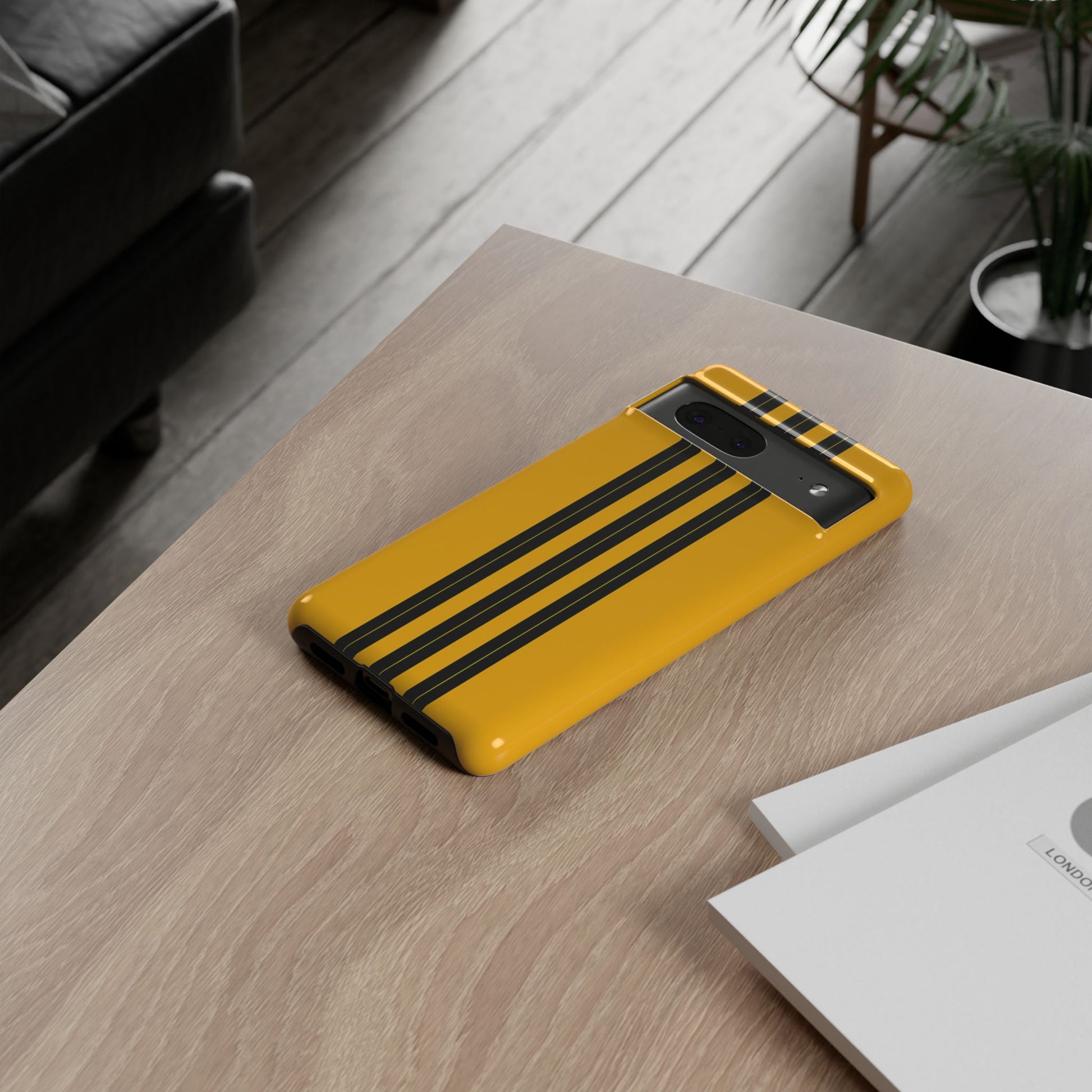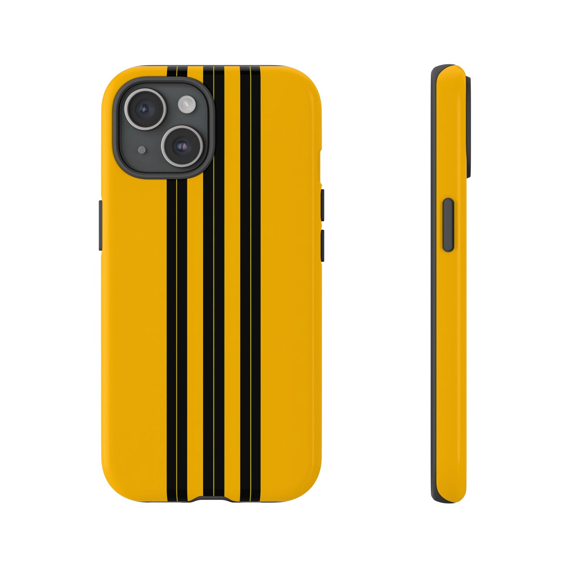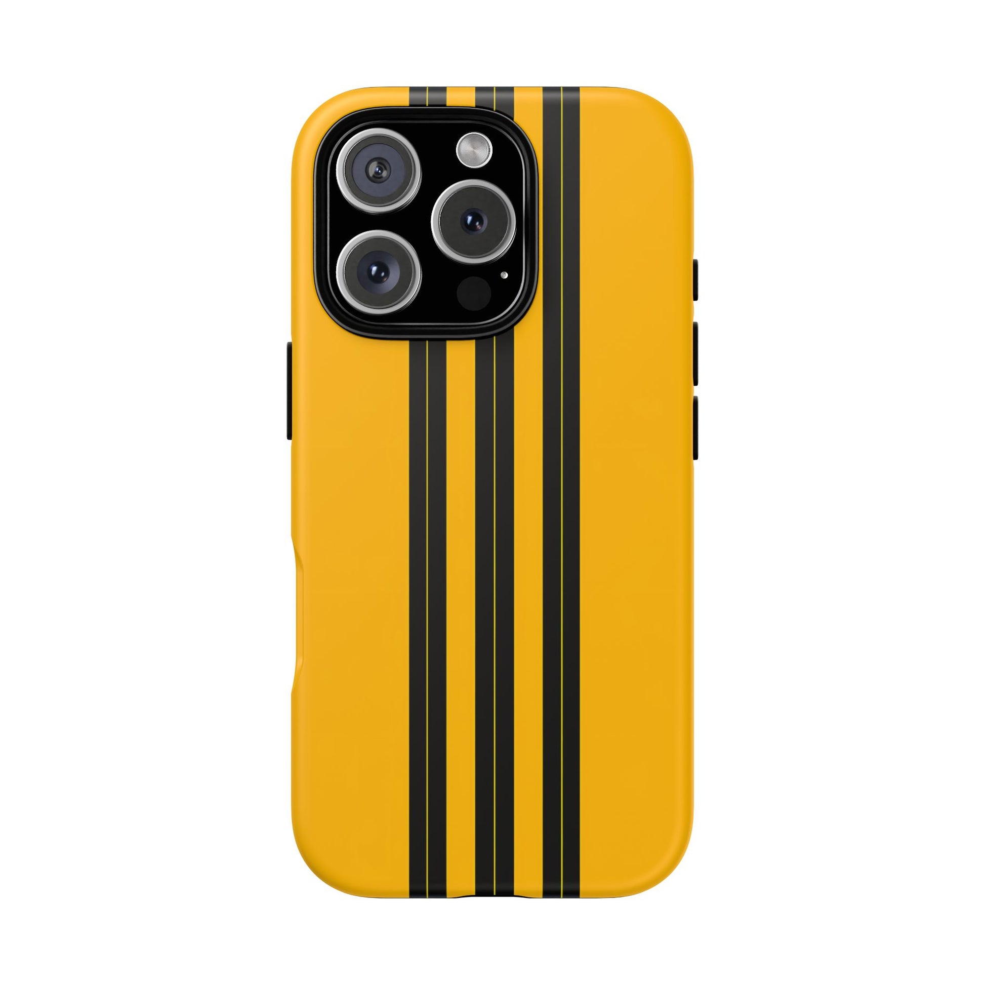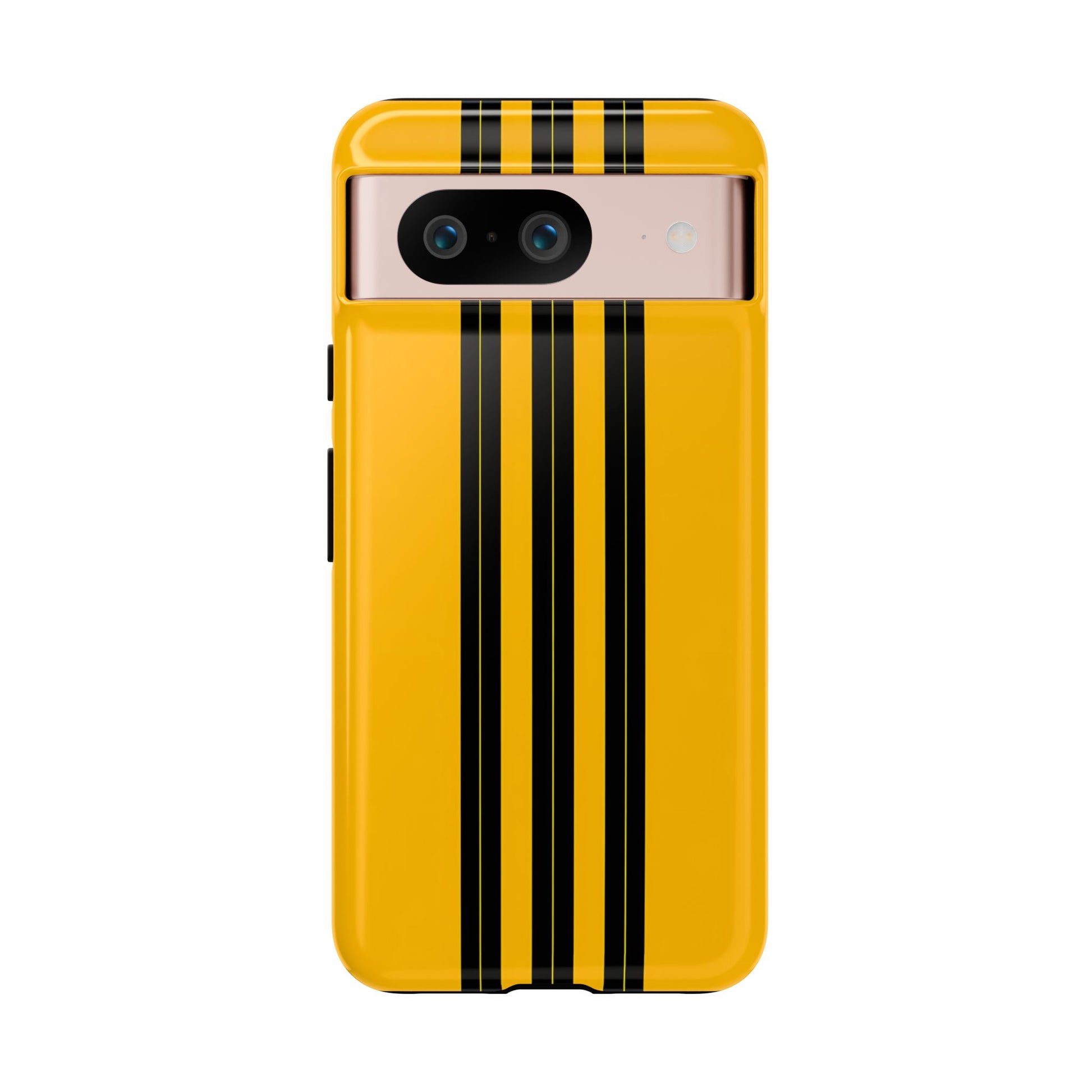 A minimalist, refined design featuring three crisp vertical black stripes arranged on a smooth yellow background, creating a clean, modern, high-contrast aesthetic.