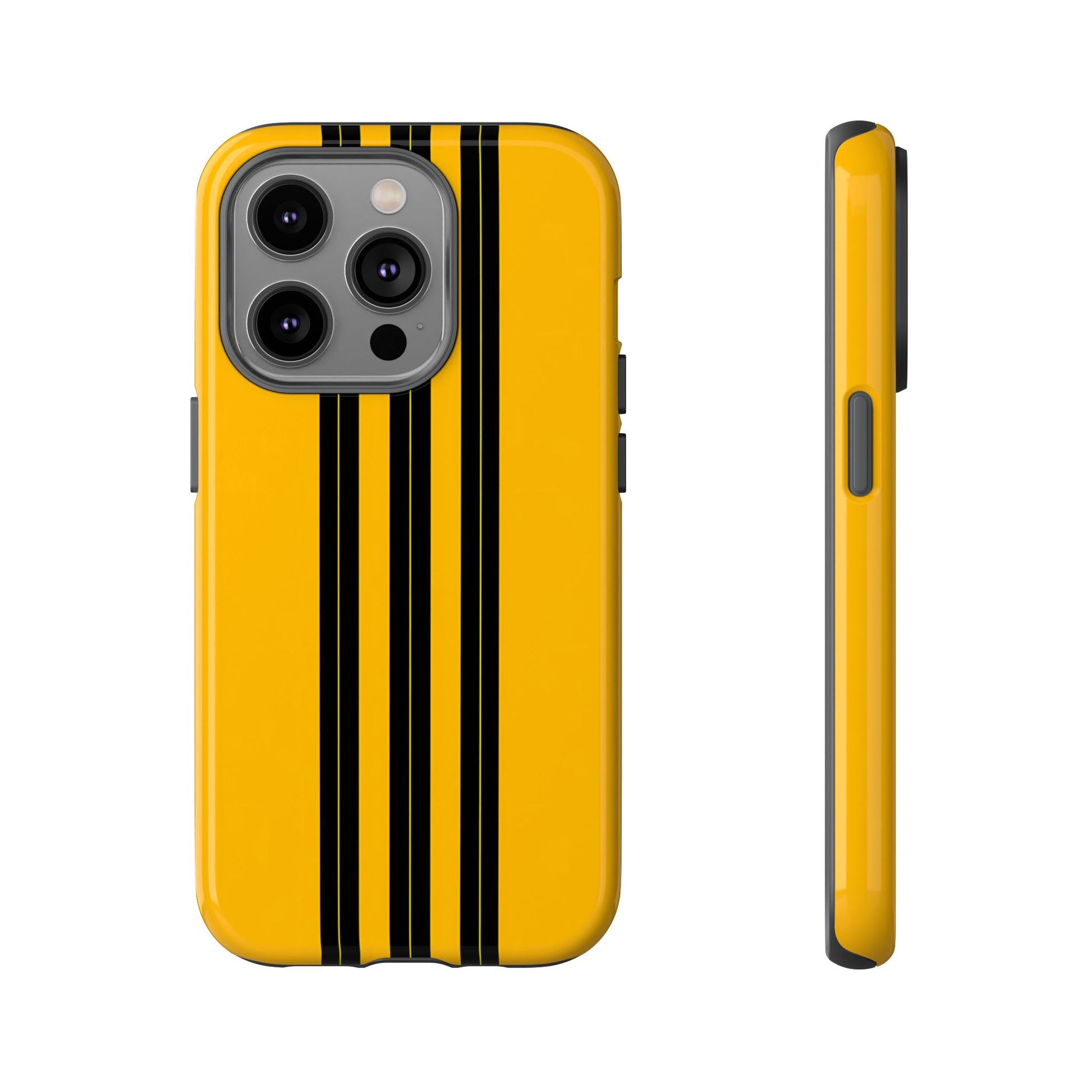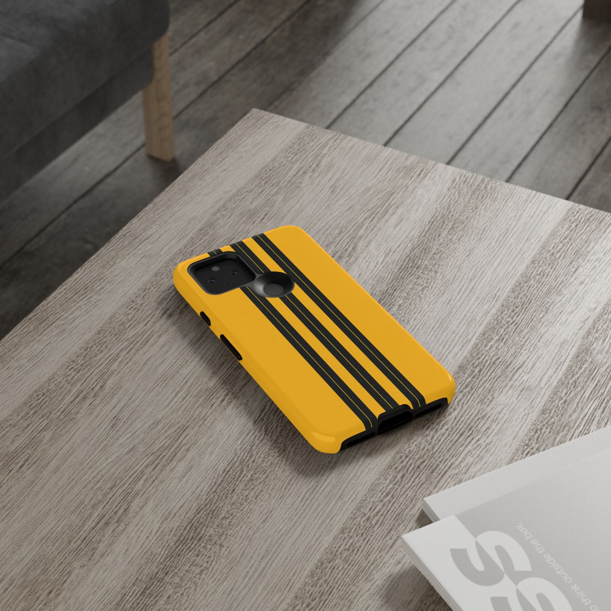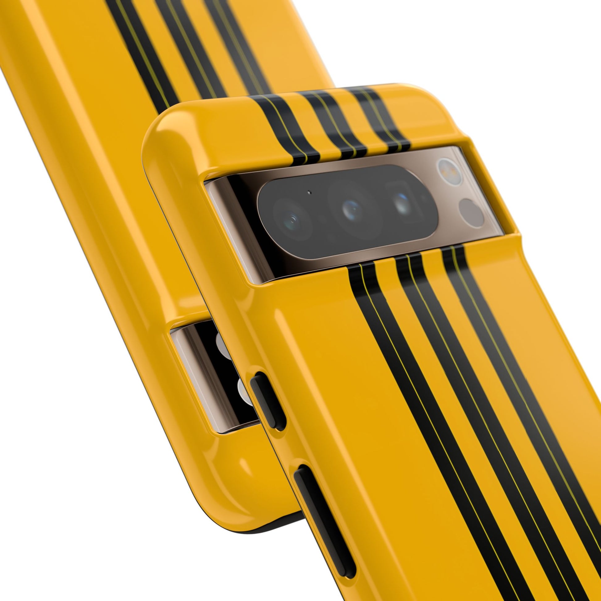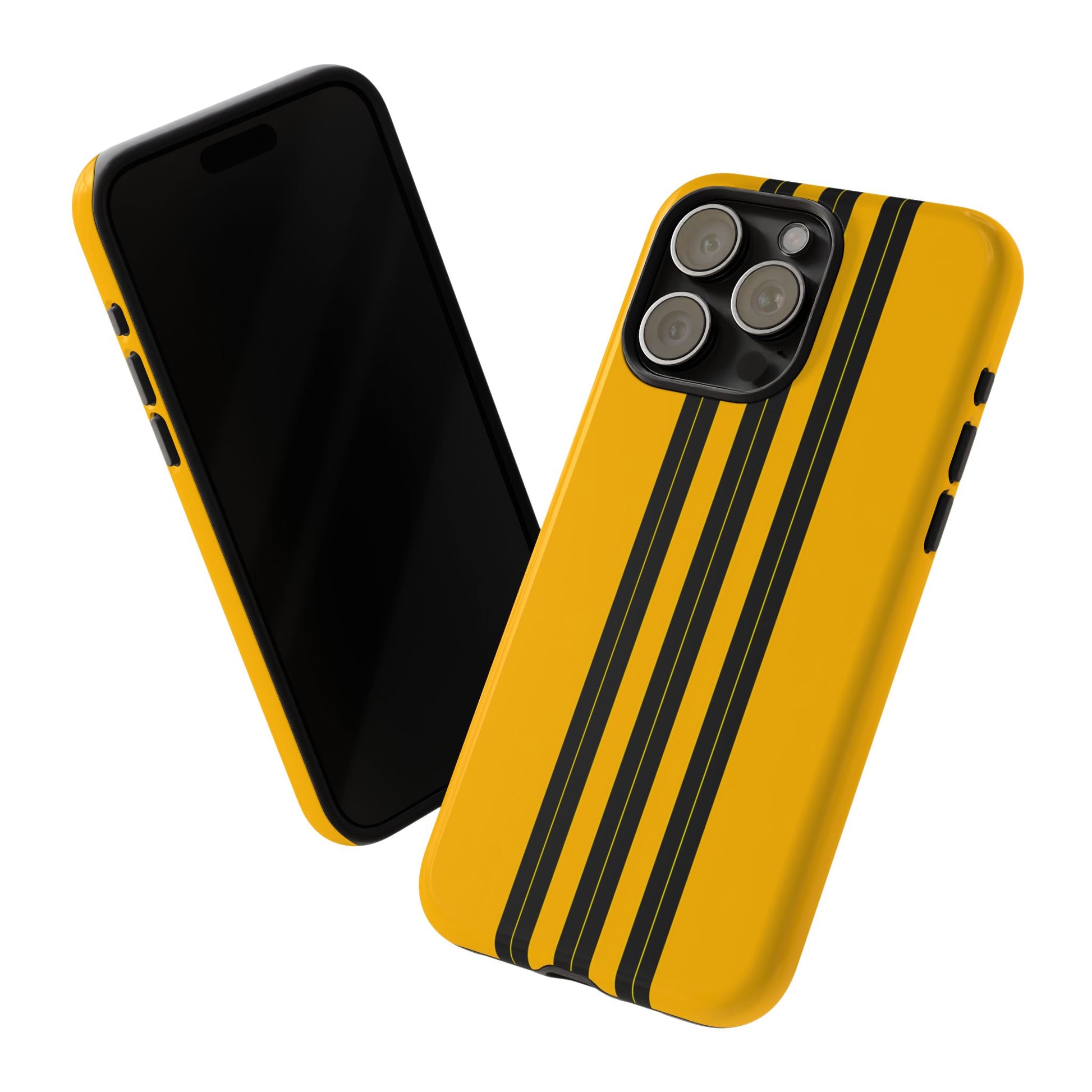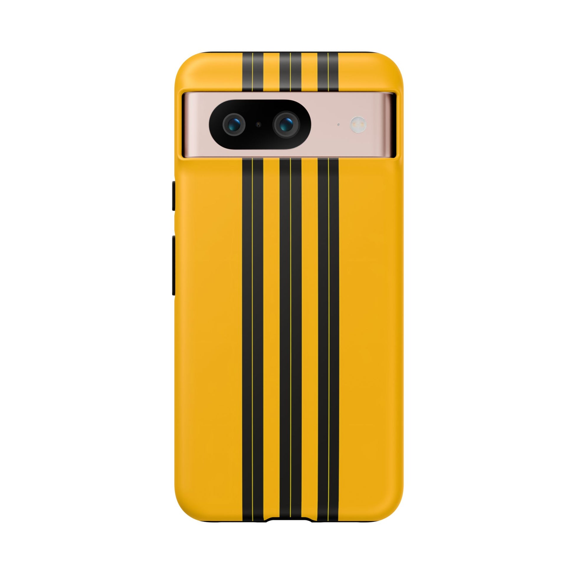 A minimalist, refined design featuring three crisp vertical black stripes arranged on a smooth yellow background, creating a clean, modern, high-contrast aesthetic.