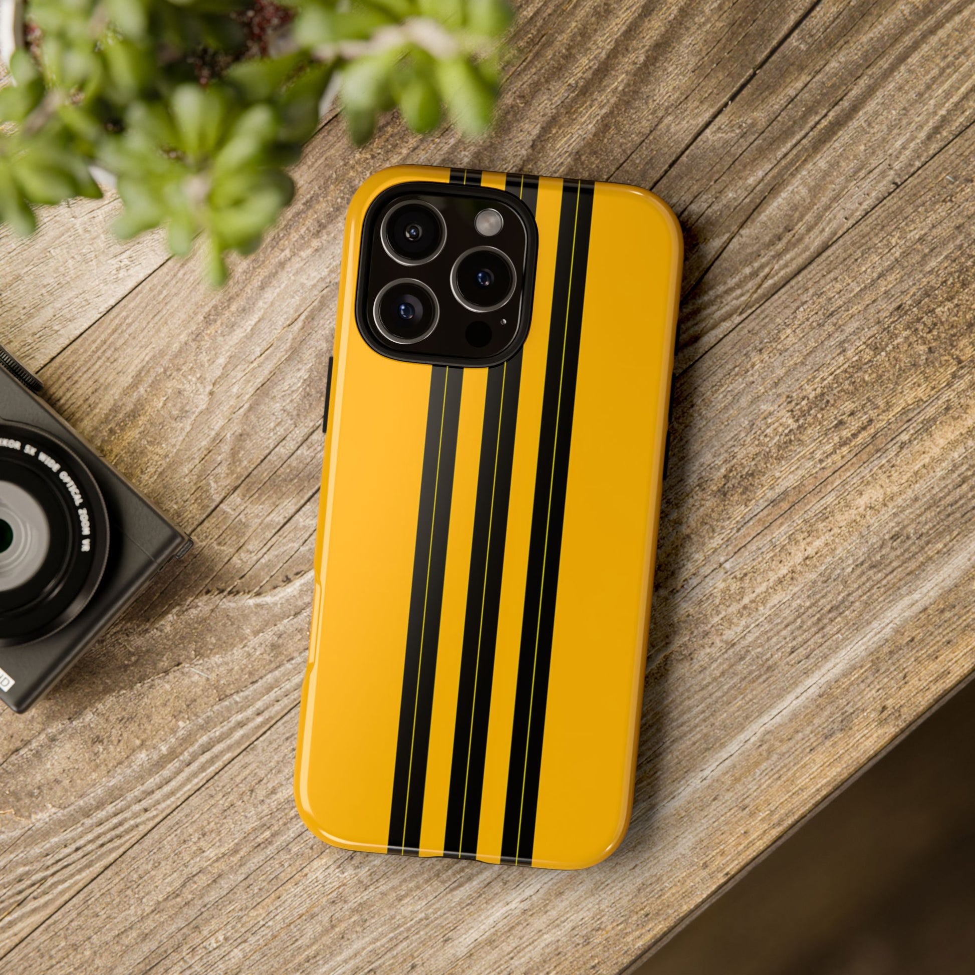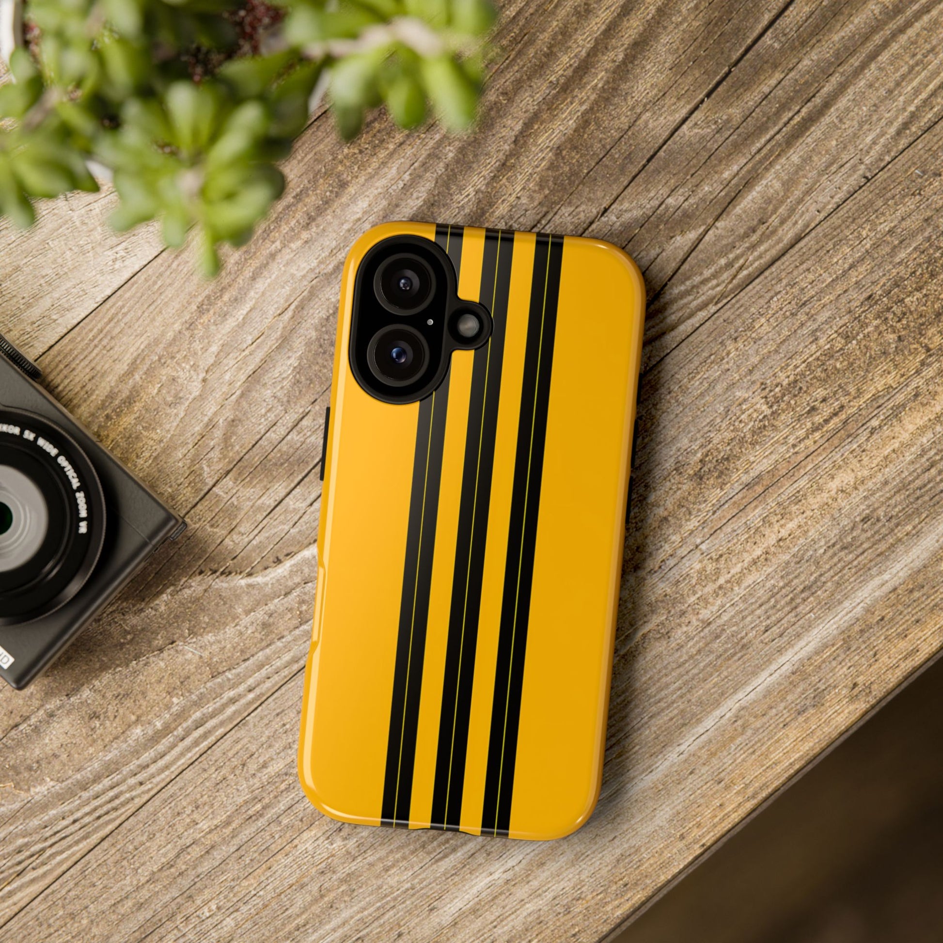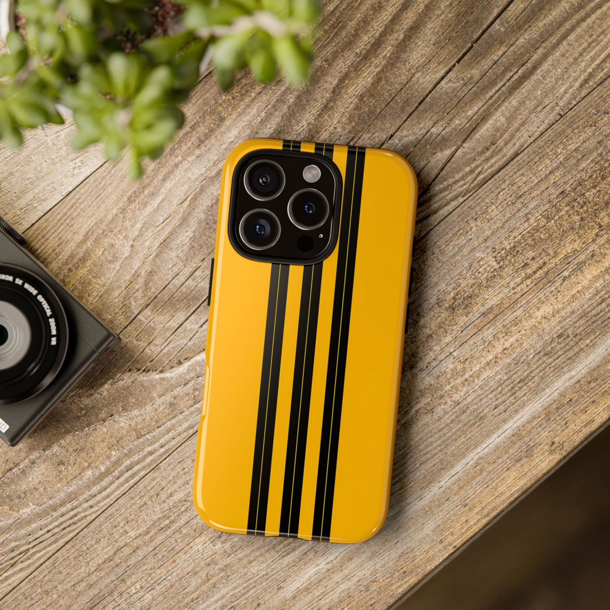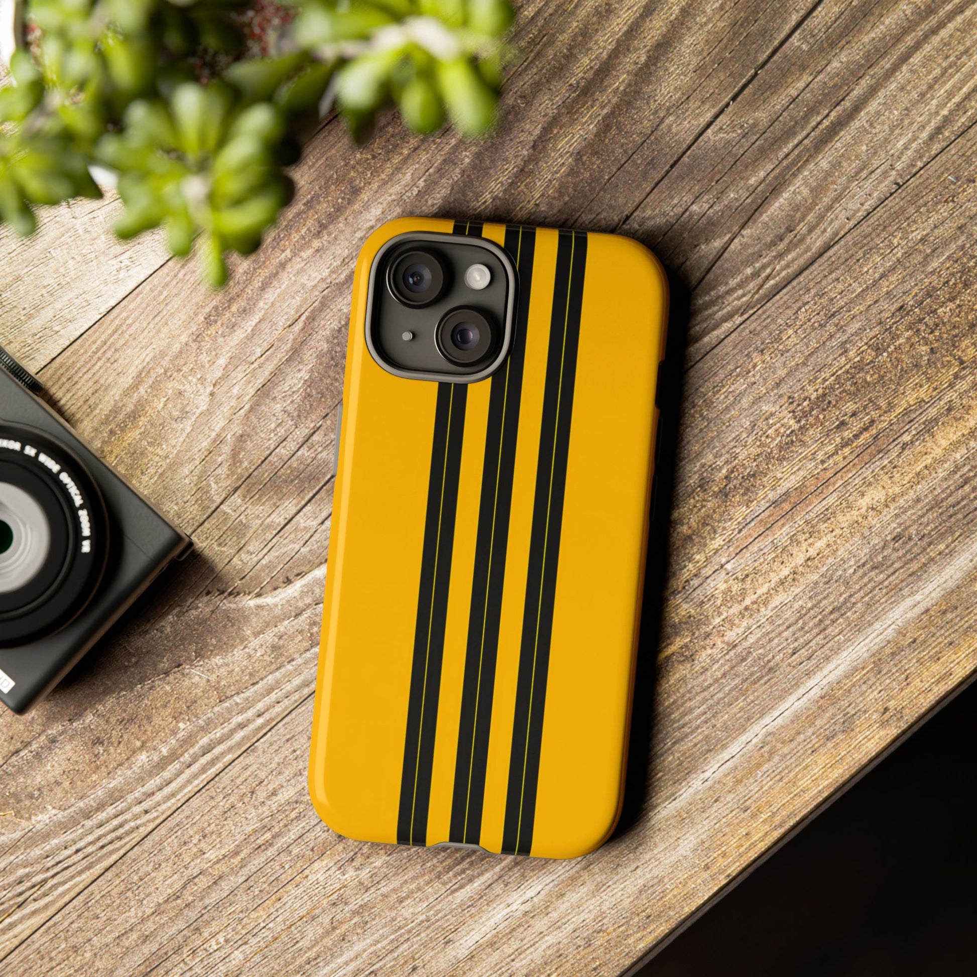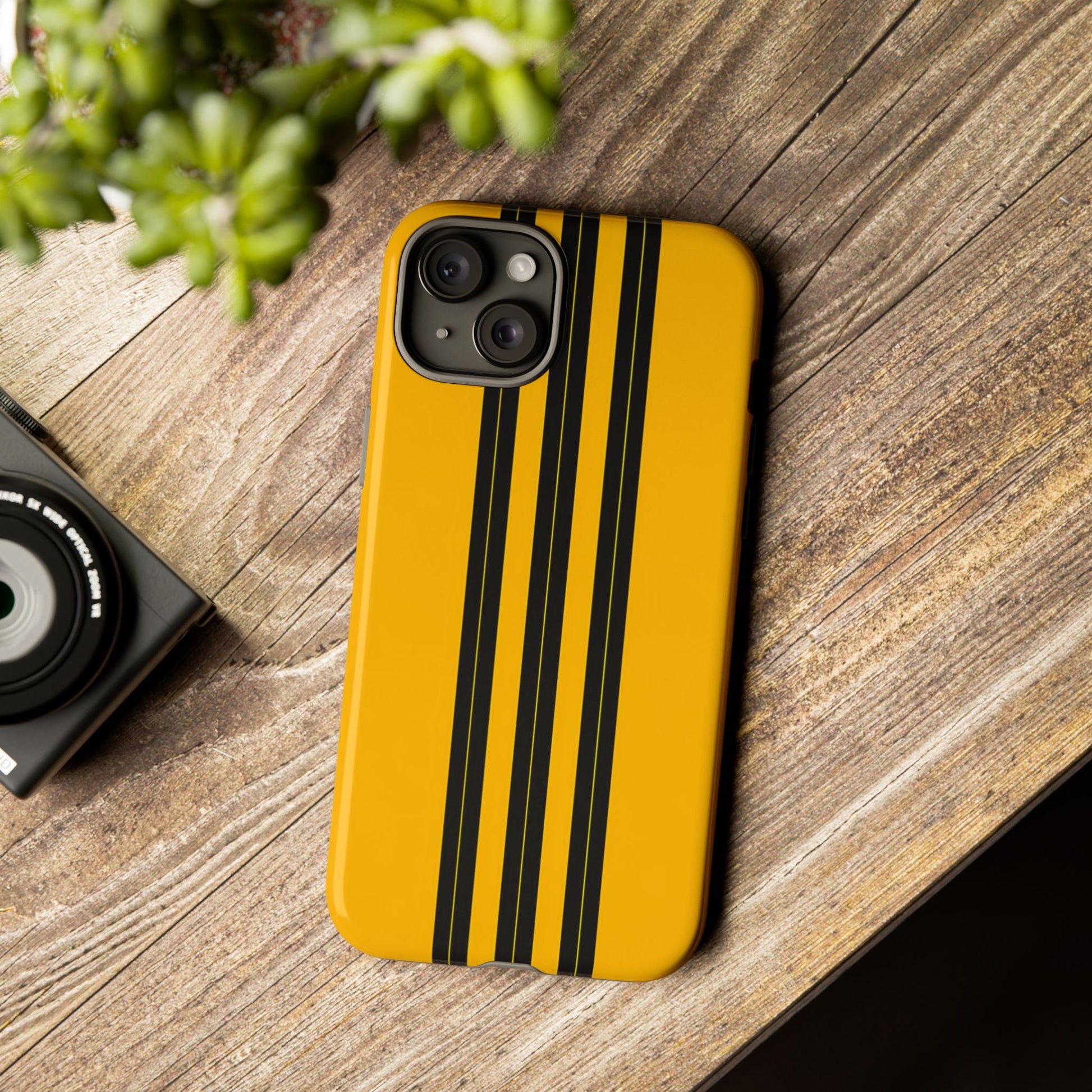 A minimalist, refined design featuring three crisp vertical black stripes arranged on a smooth yellow background, creating a clean, modern, high-contrast aesthetic.
