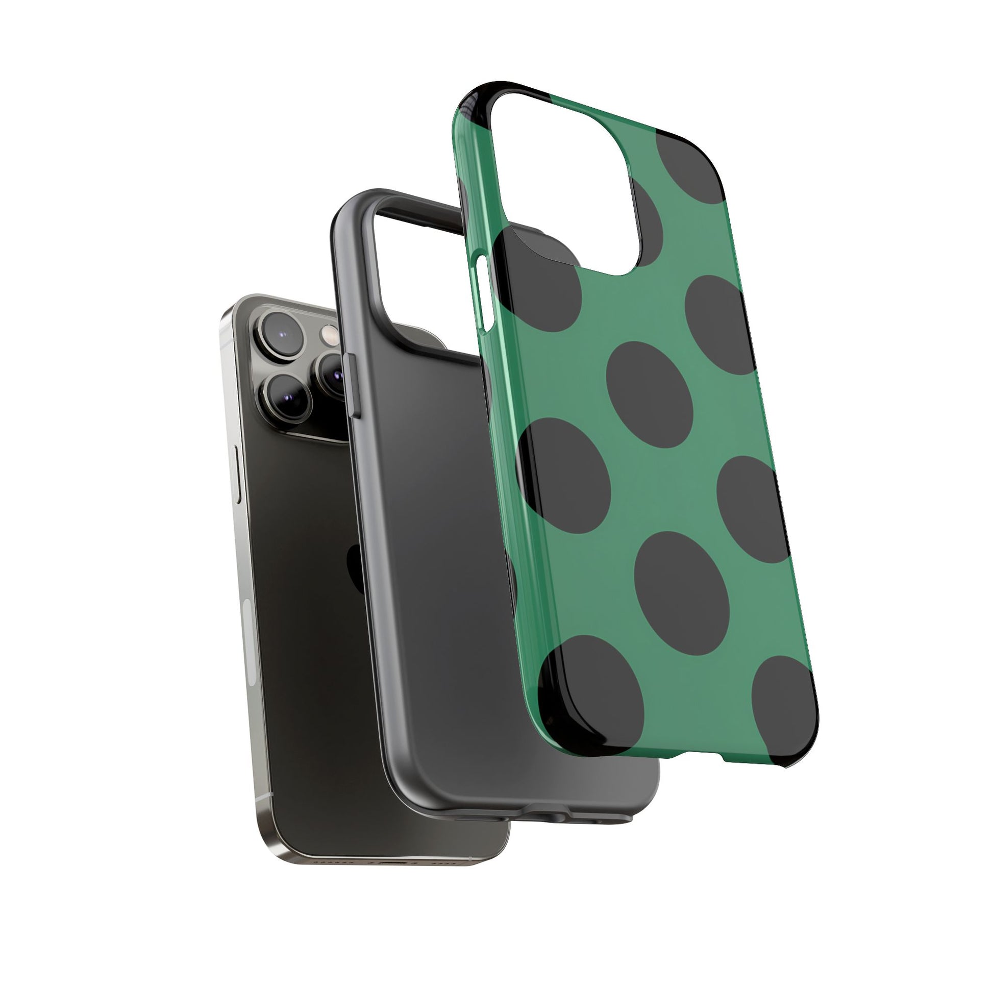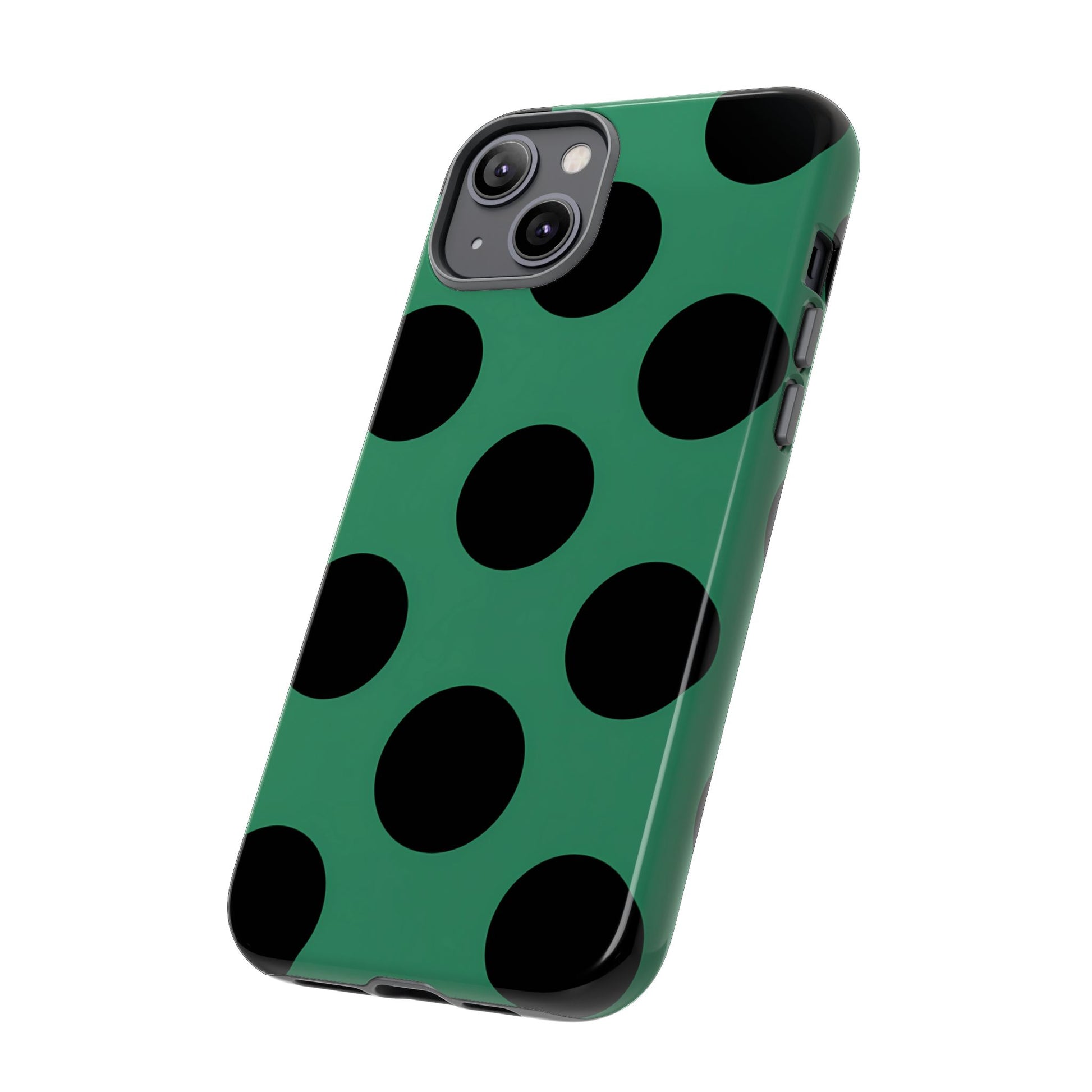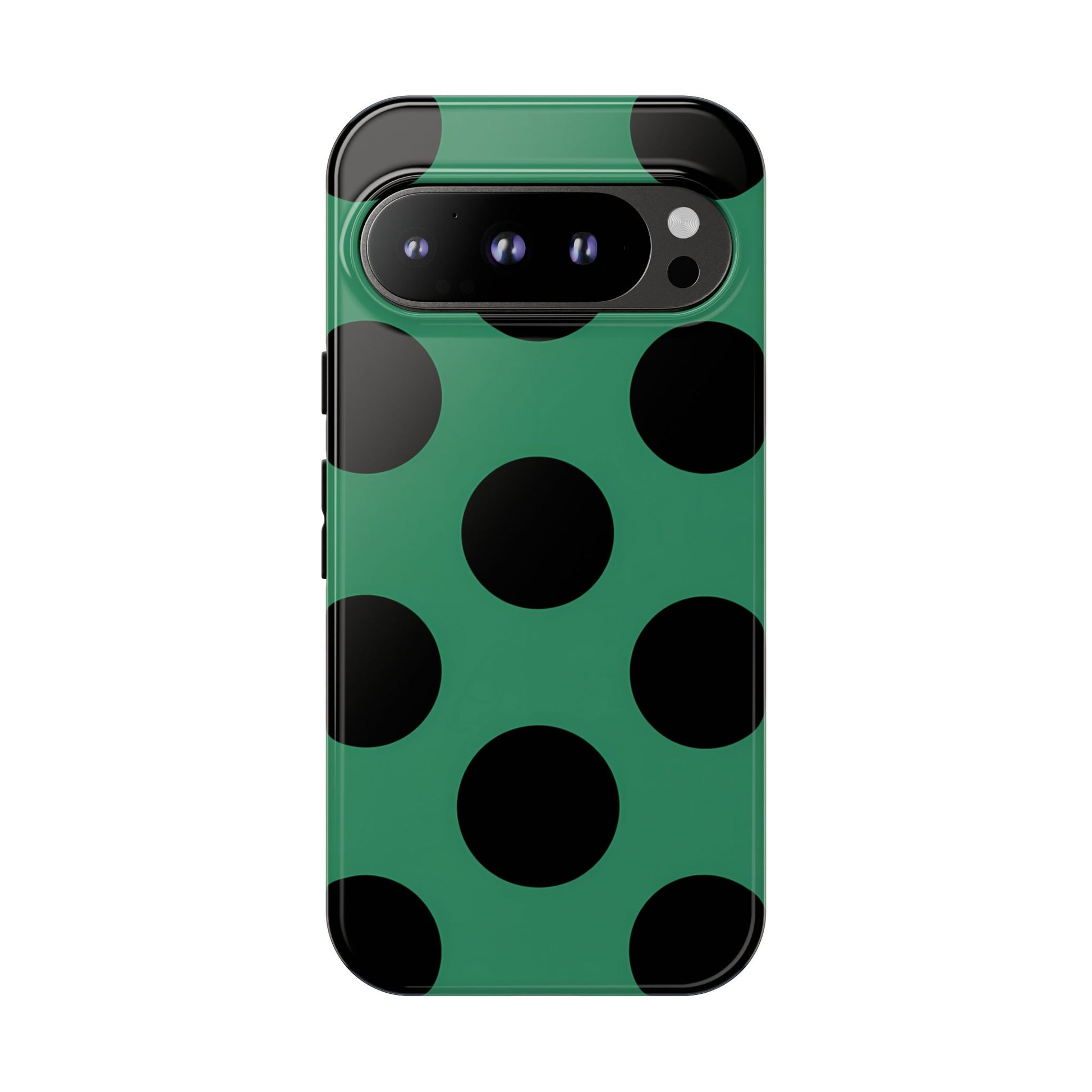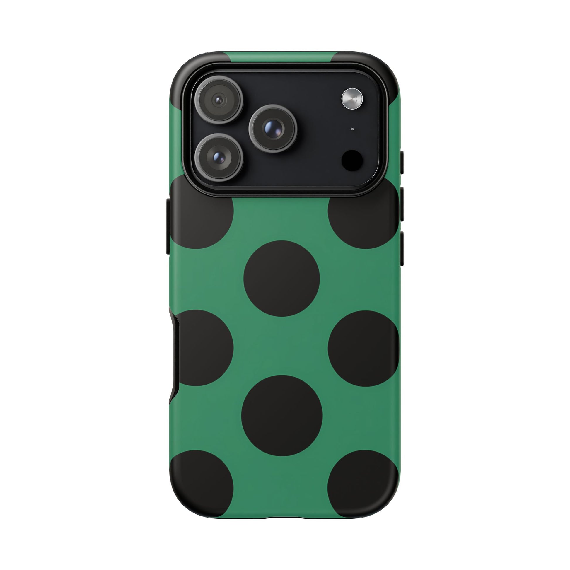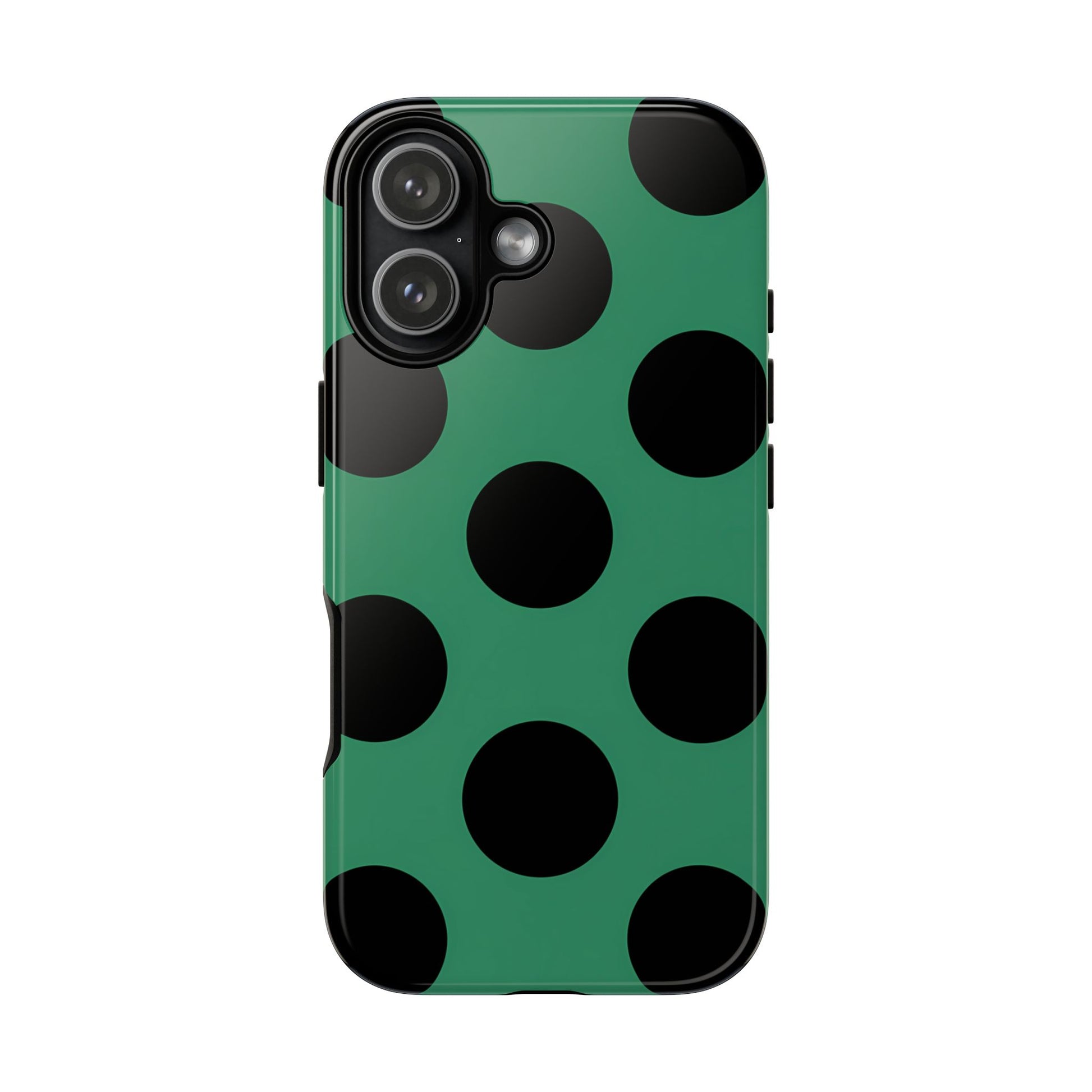 Large matte-black polka dots arranged evenly across a classic retro green background, creating a bold yet minimalist vintage look