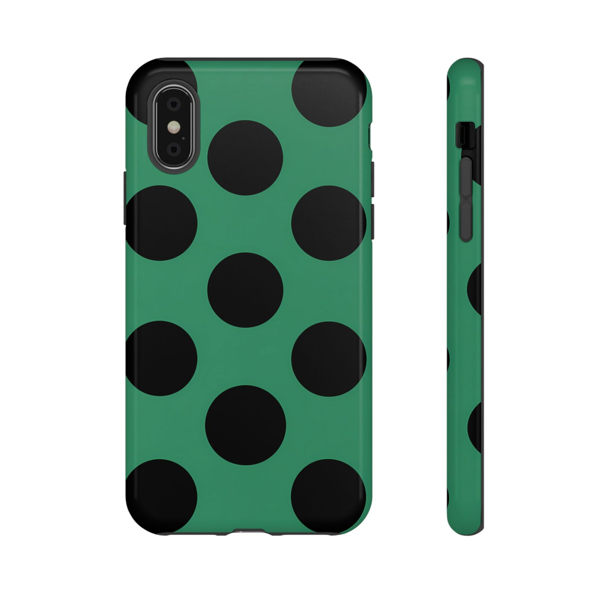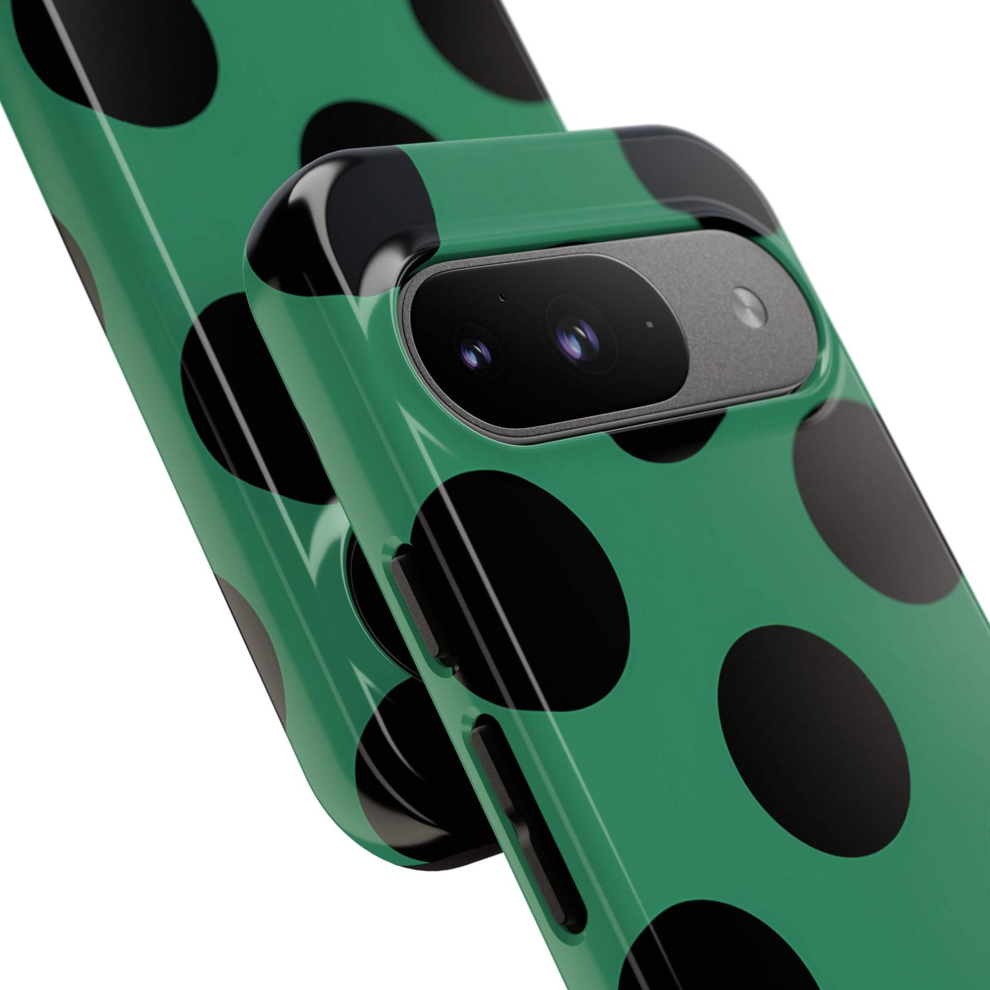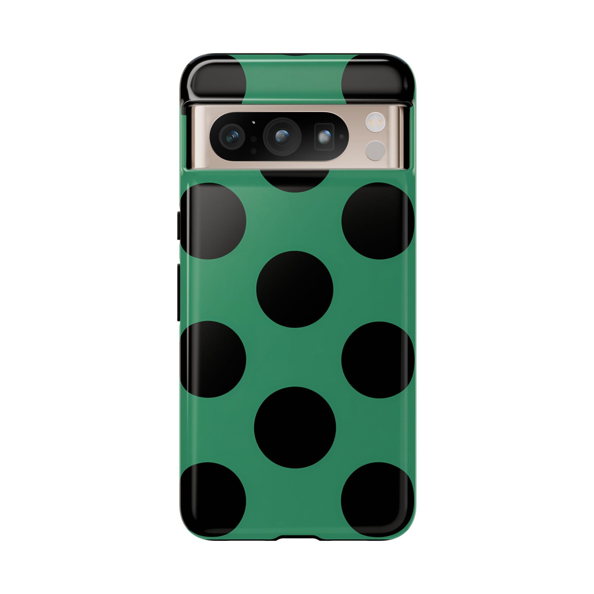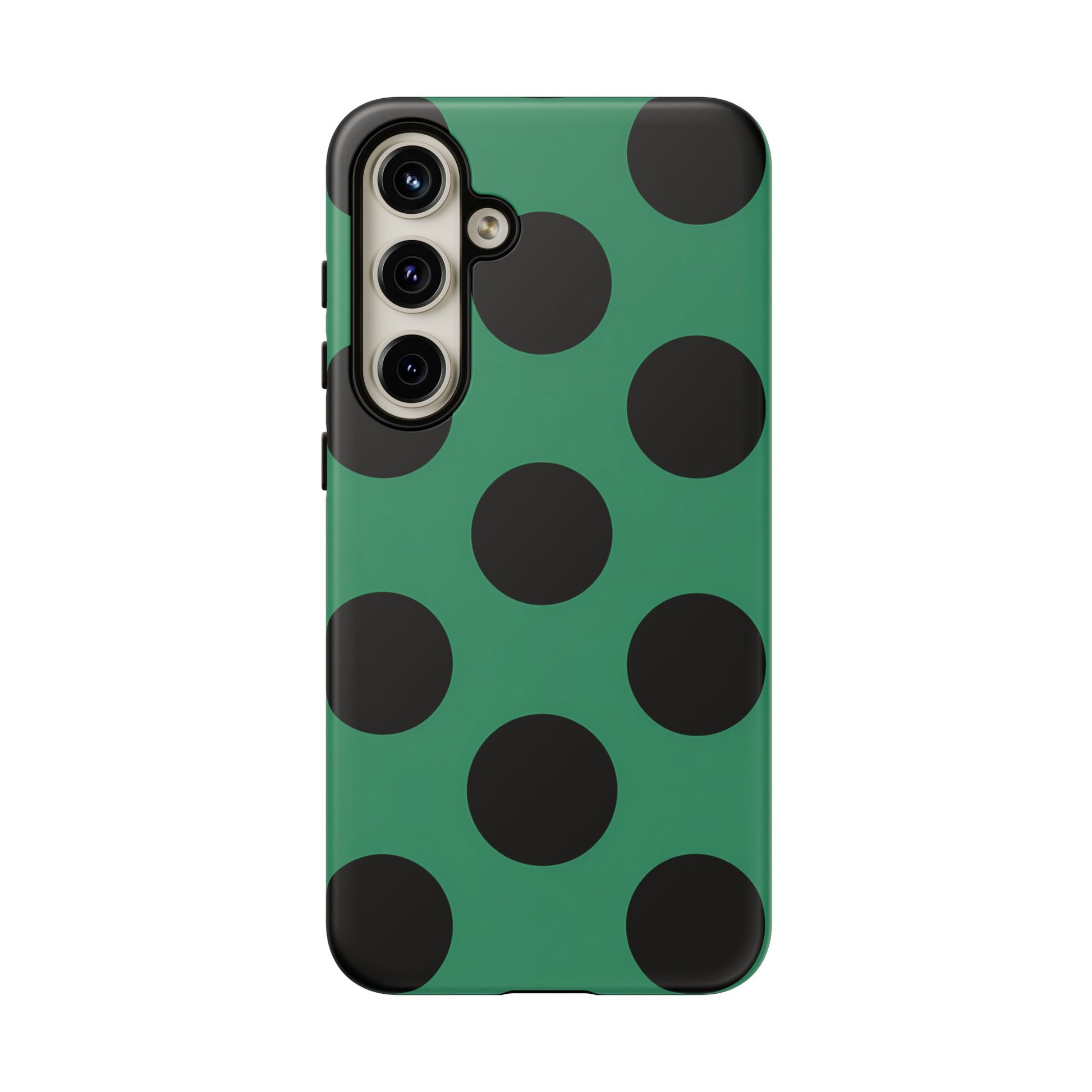 Large matte-black polka dots arranged evenly across a classic retro green background, creating a bold yet minimalist vintage look