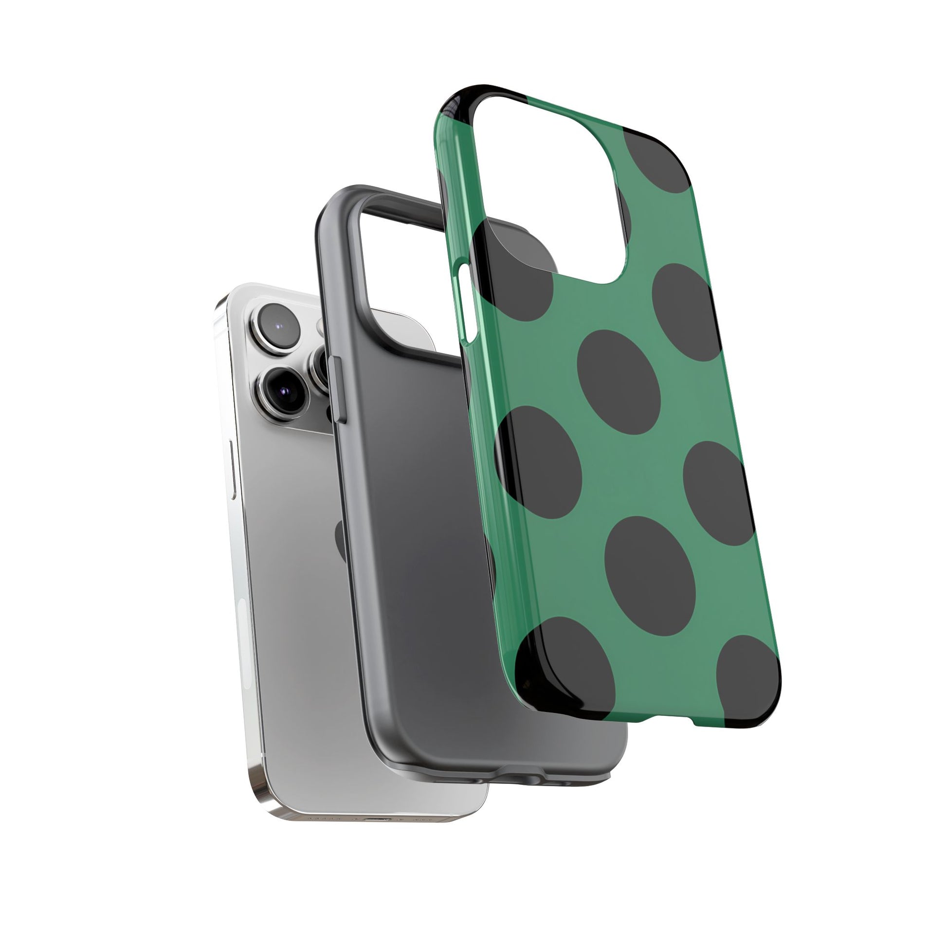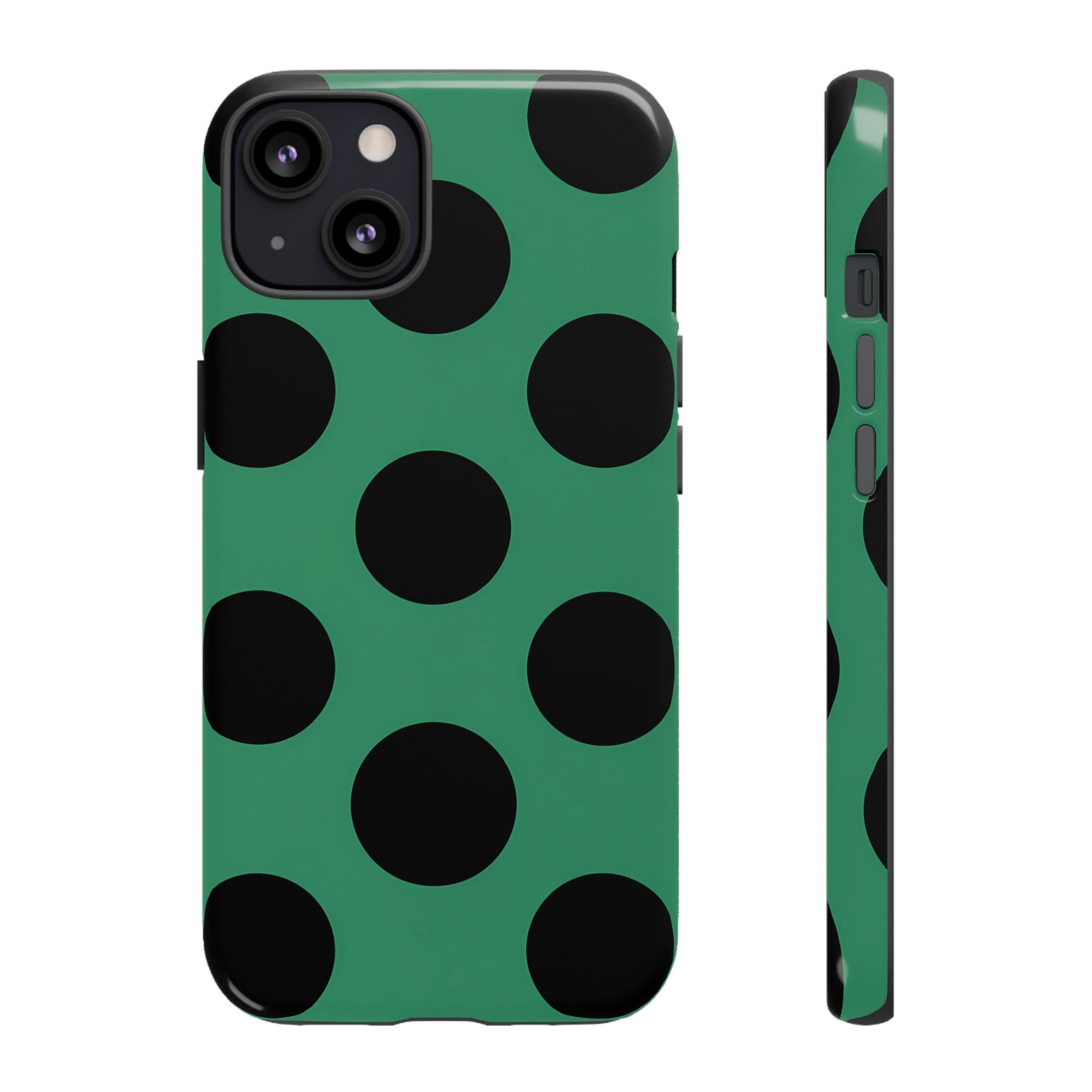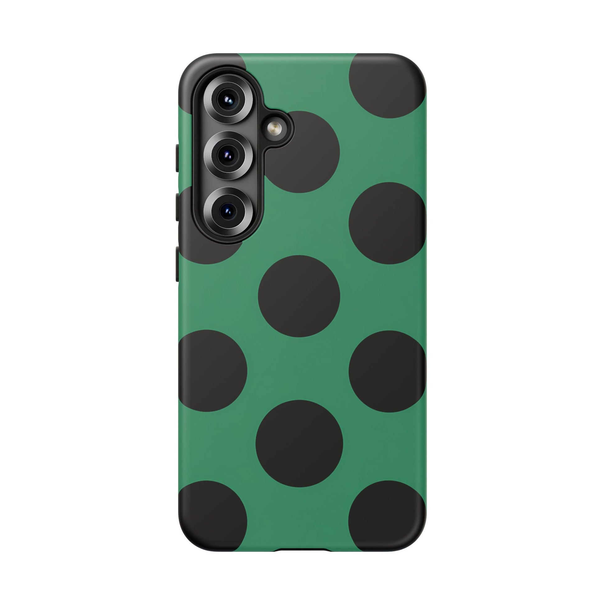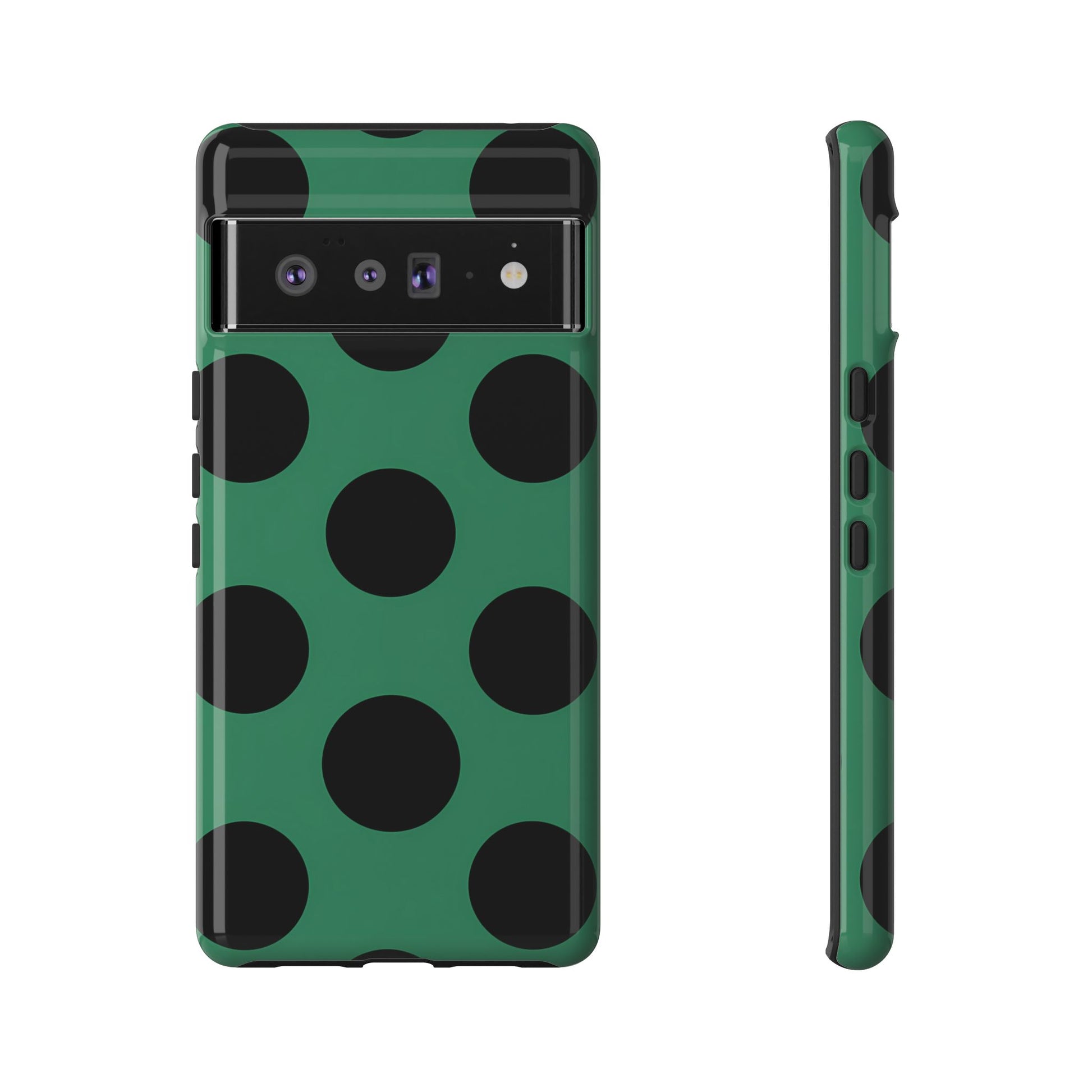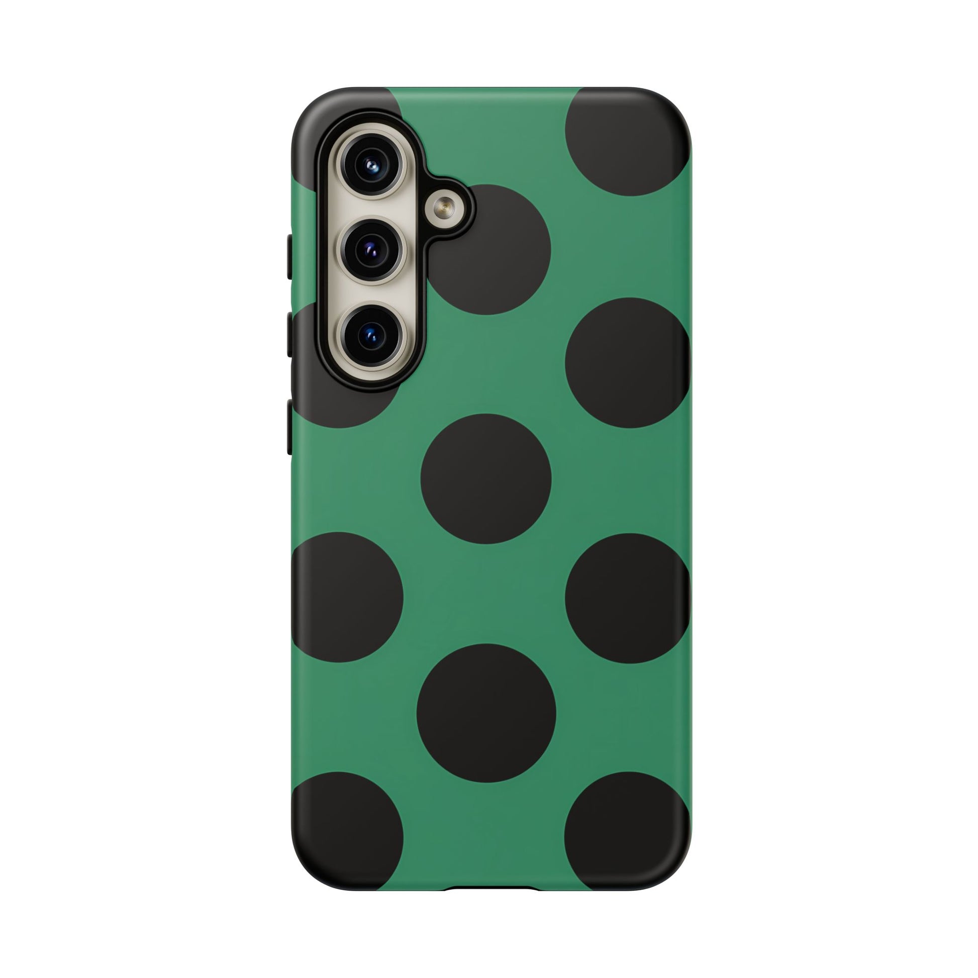 Large matte-black polka dots arranged evenly across a classic retro green background, creating a bold yet minimalist vintage look