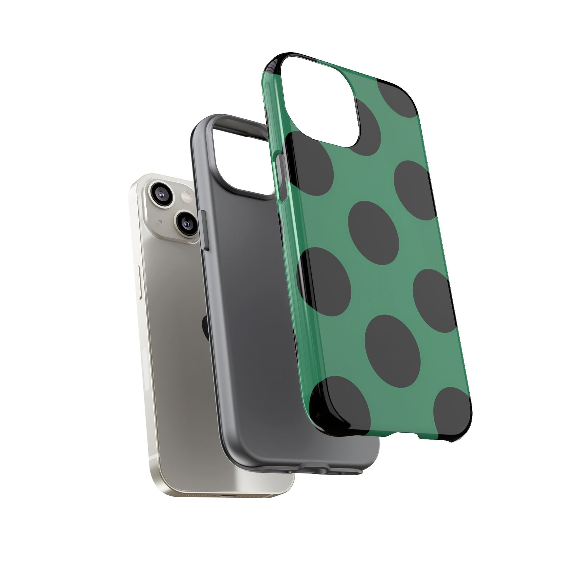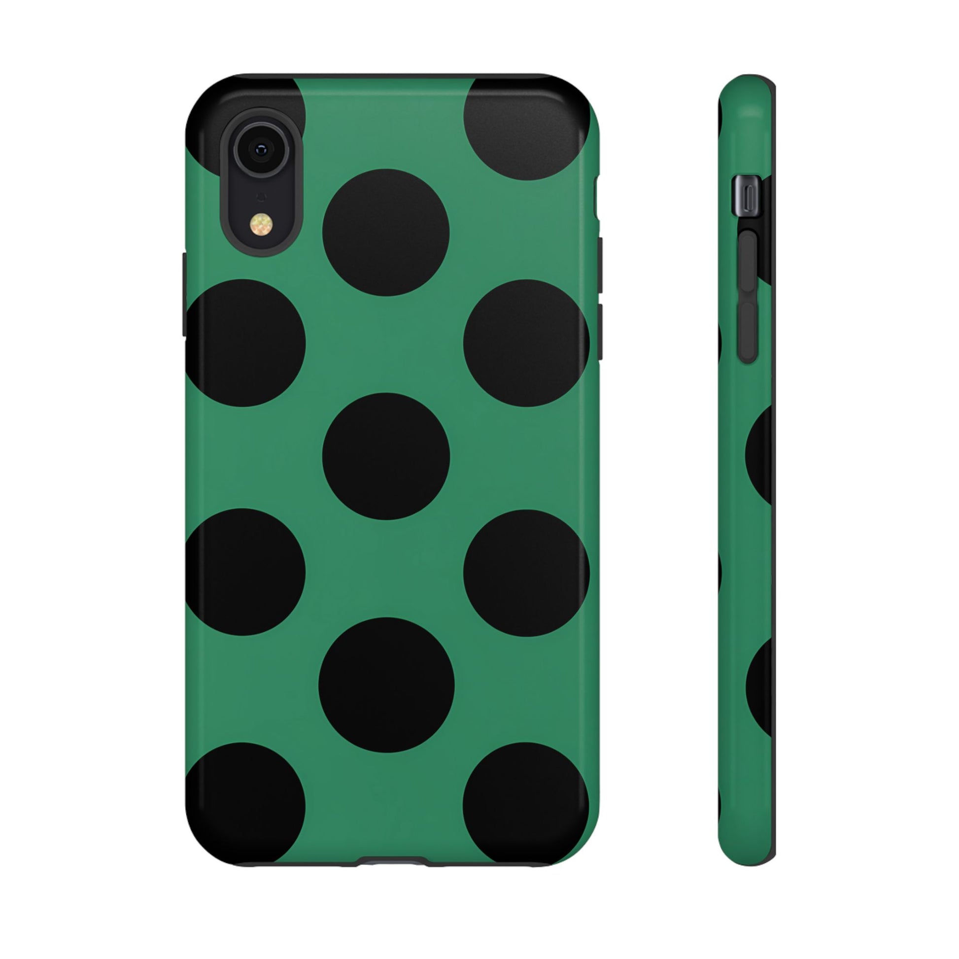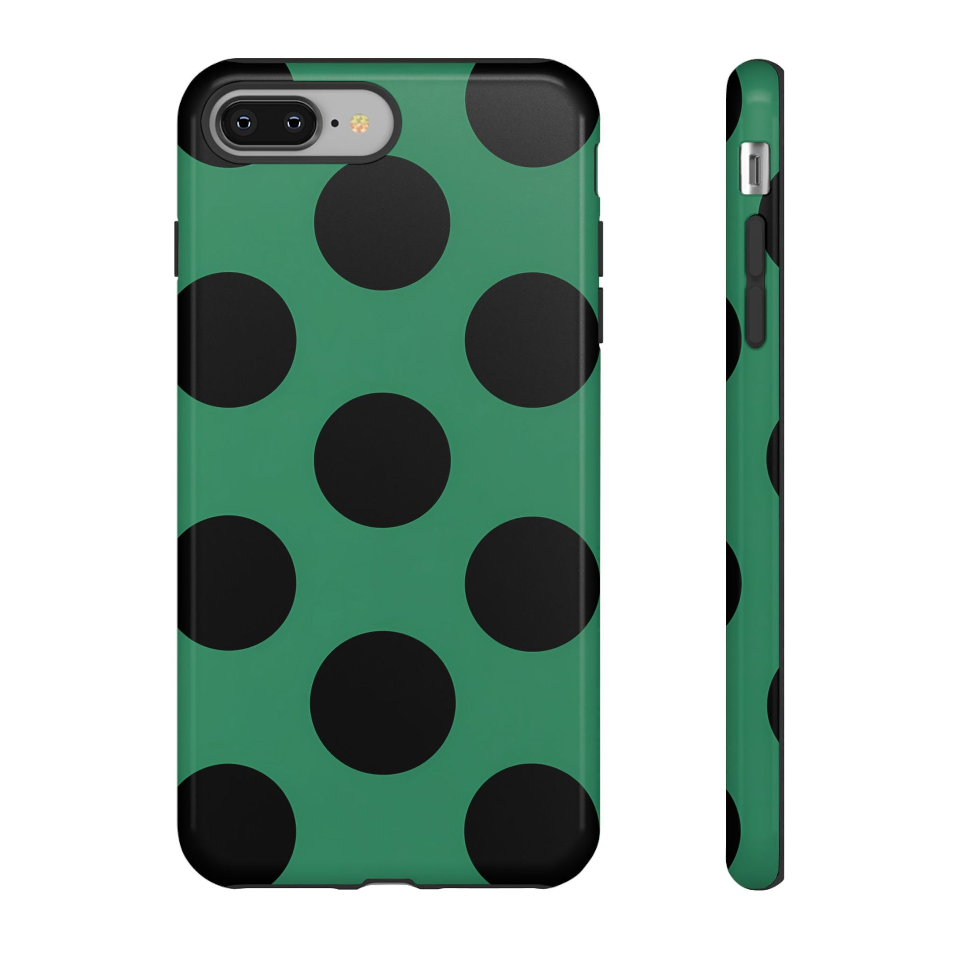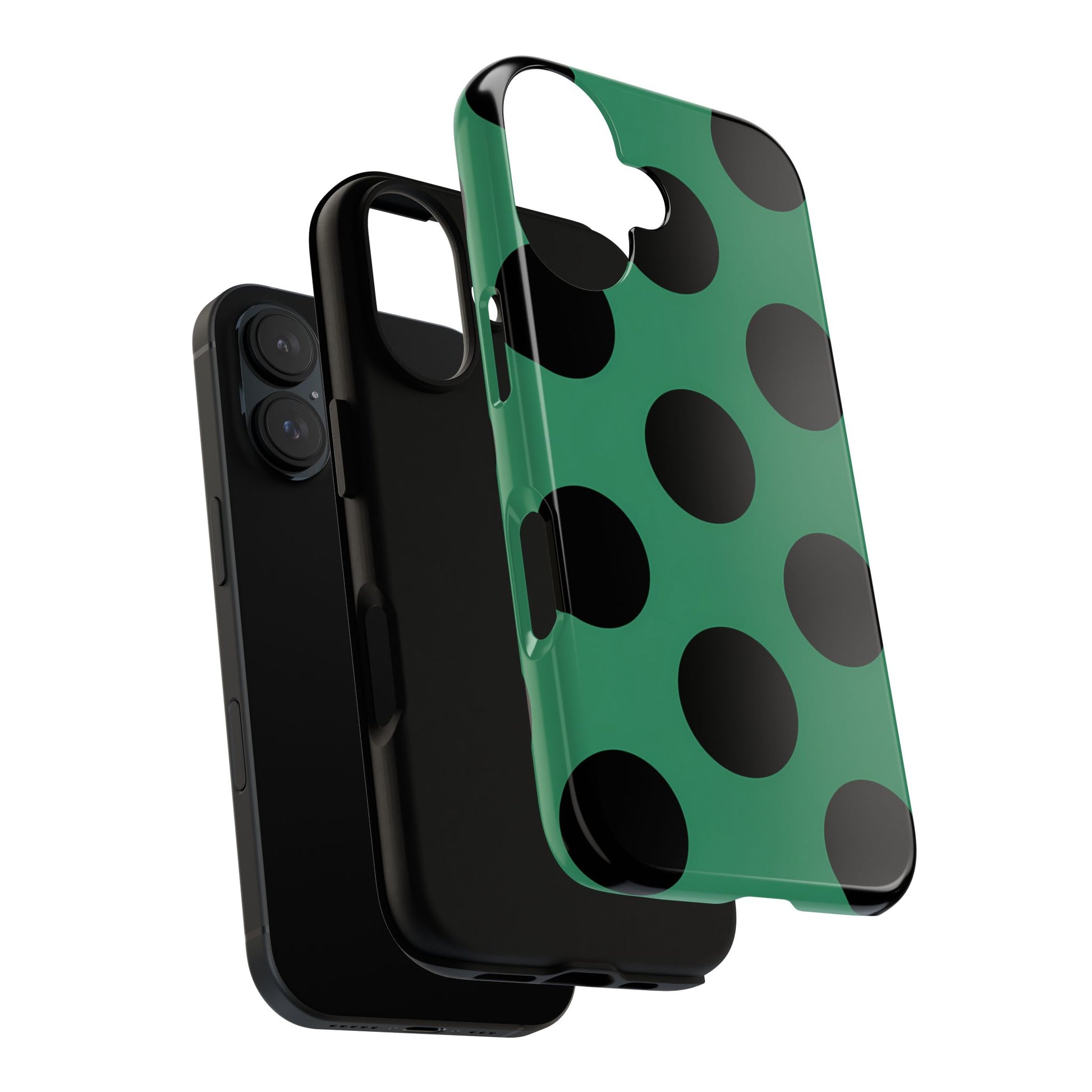 Large matte-black polka dots arranged evenly across a classic retro green background, creating a bold yet minimalist vintage look