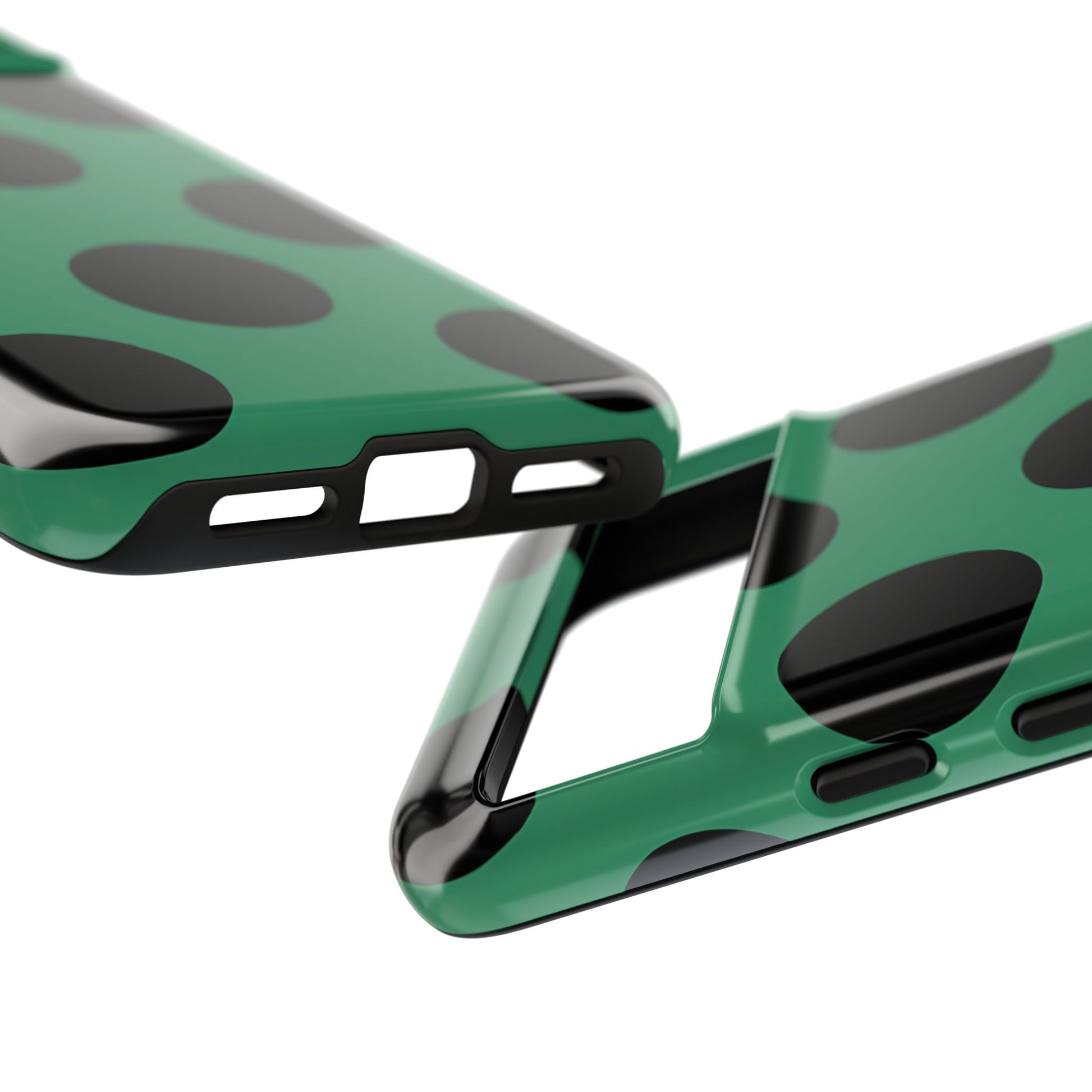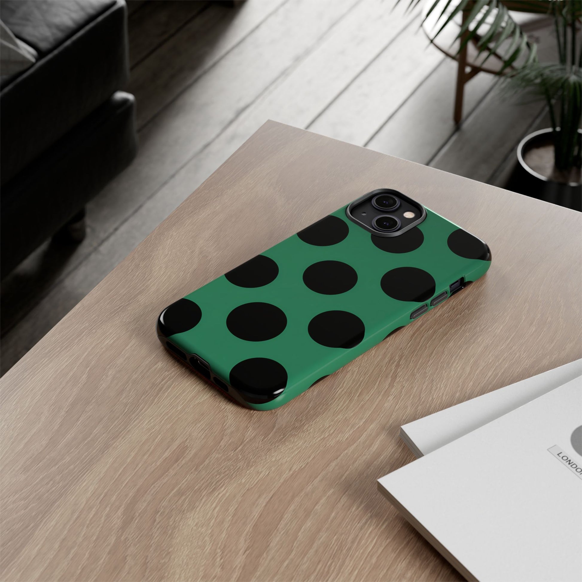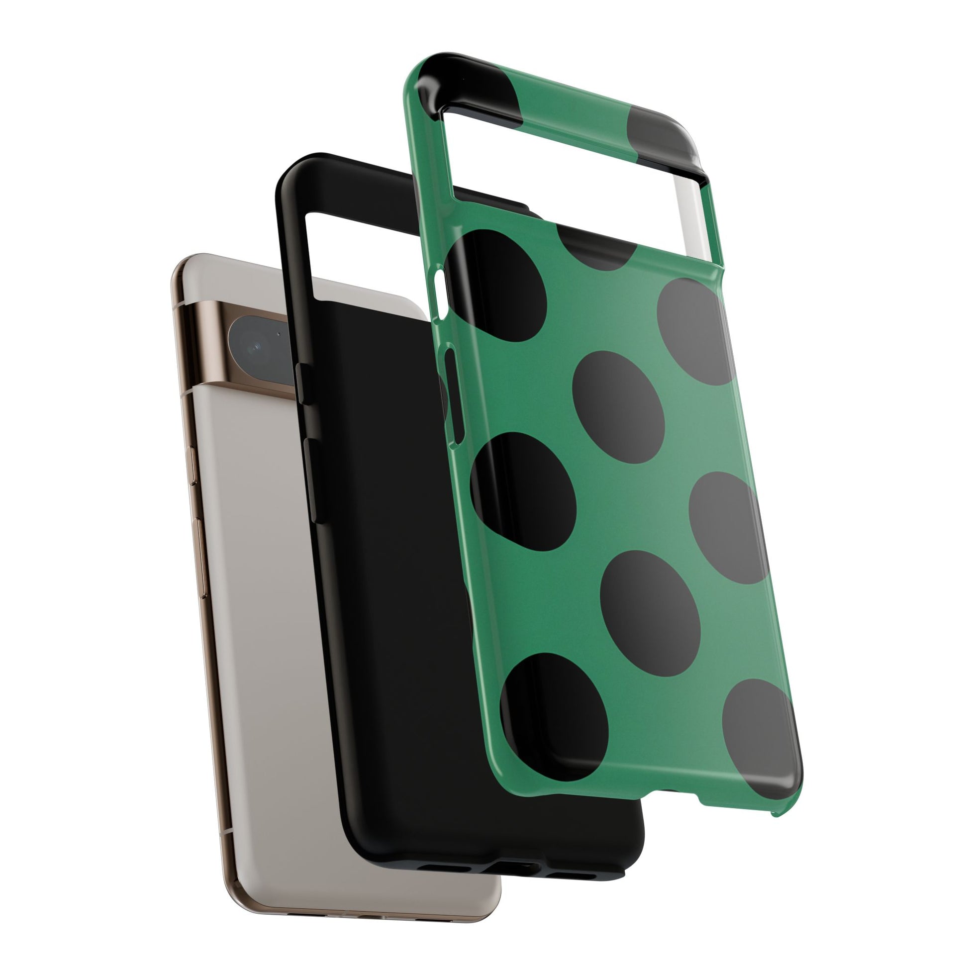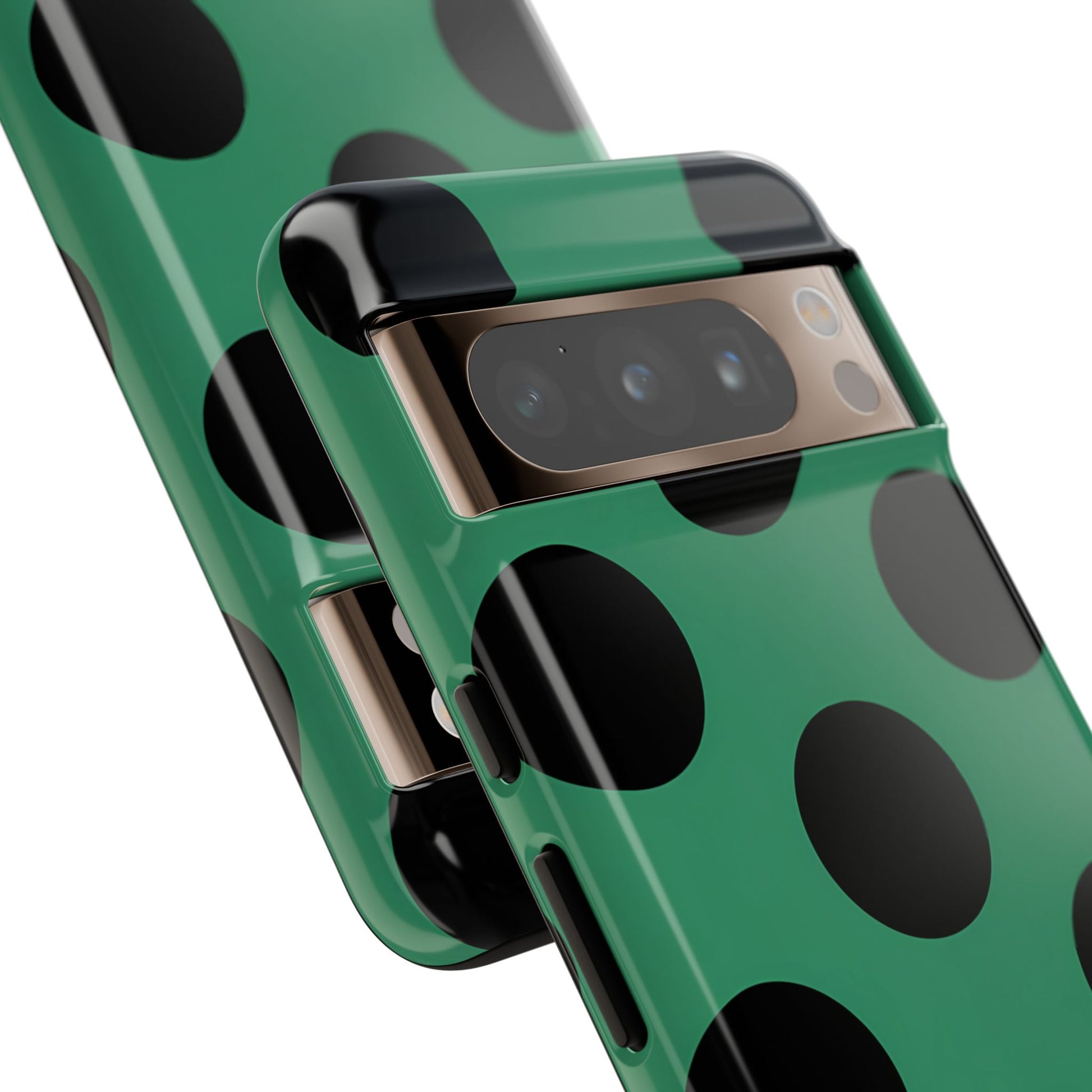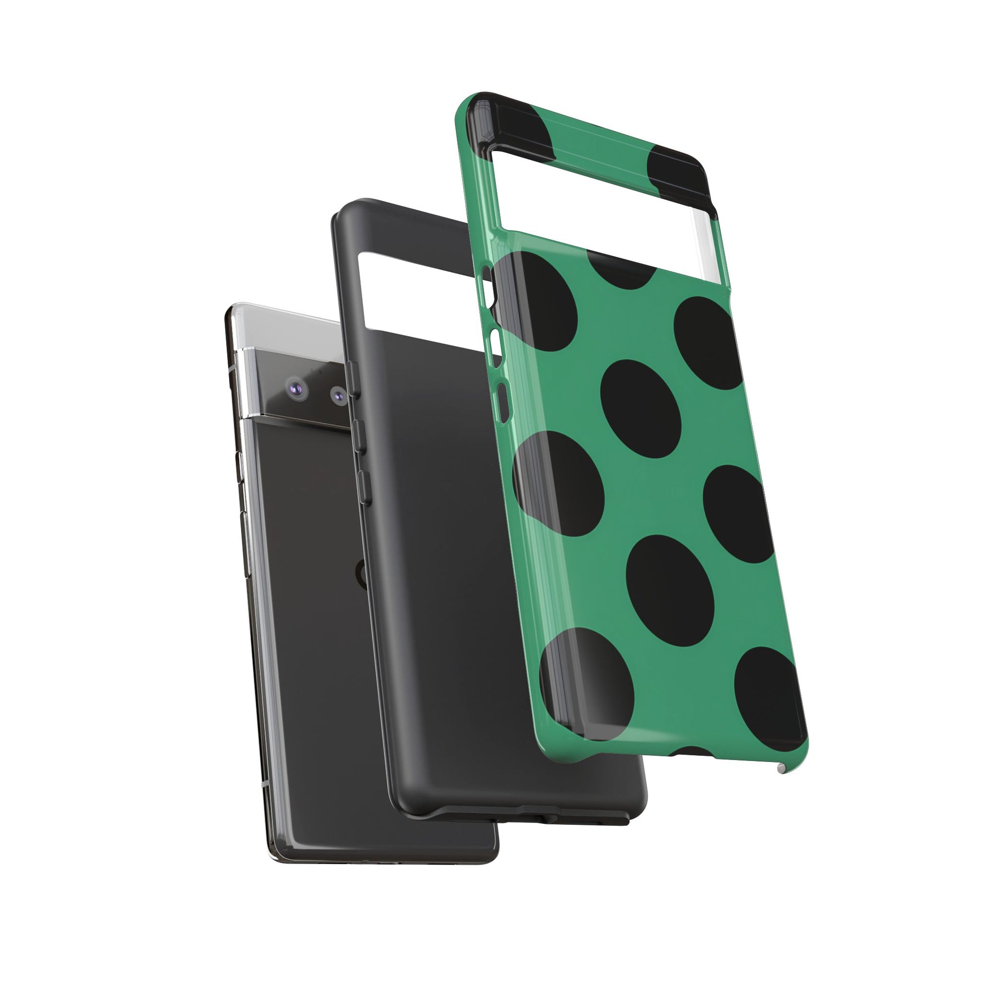 Large matte-black polka dots arranged evenly across a classic retro green background, creating a bold yet minimalist vintage look