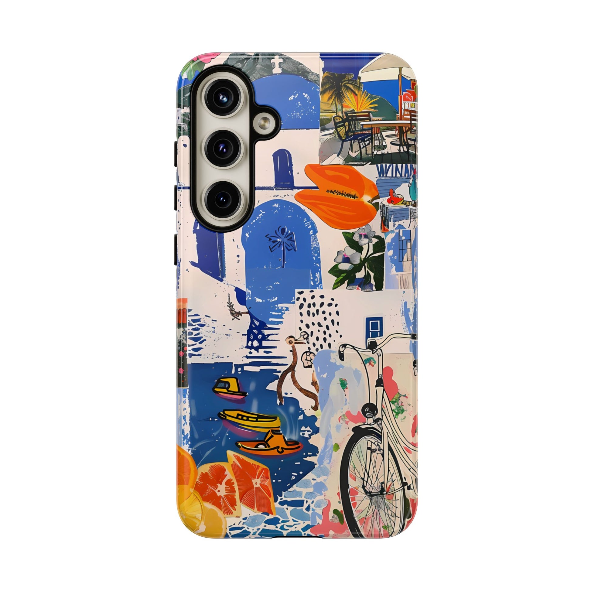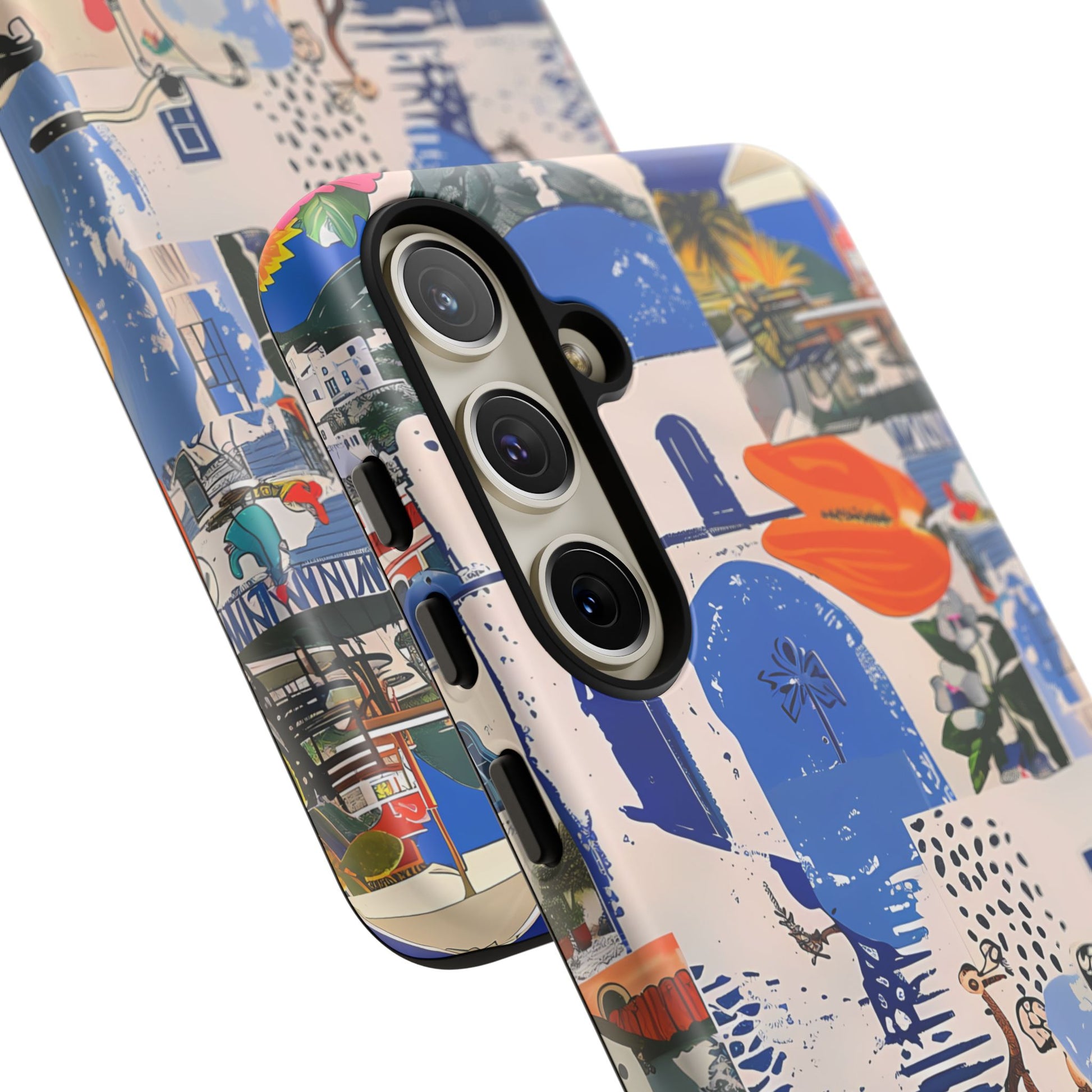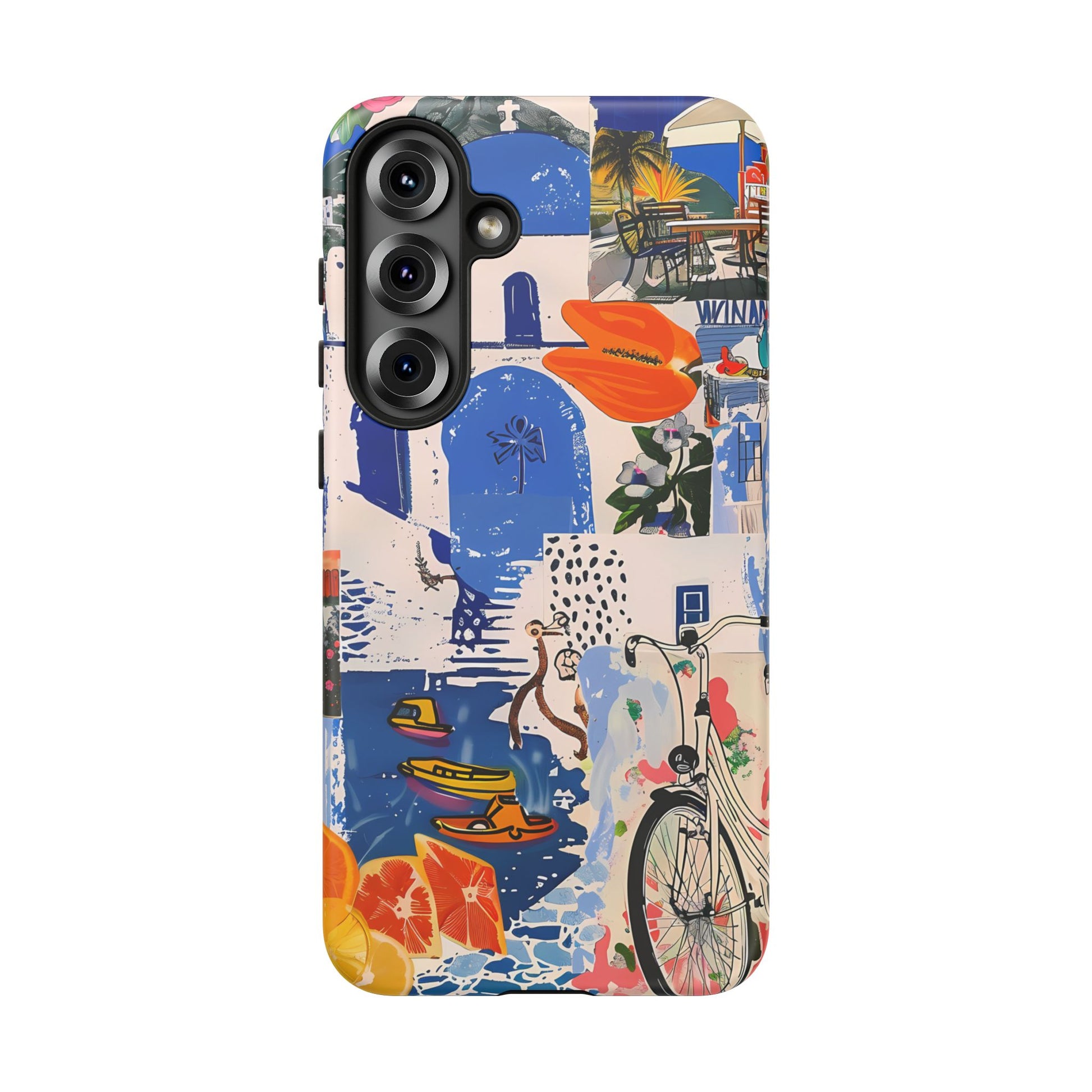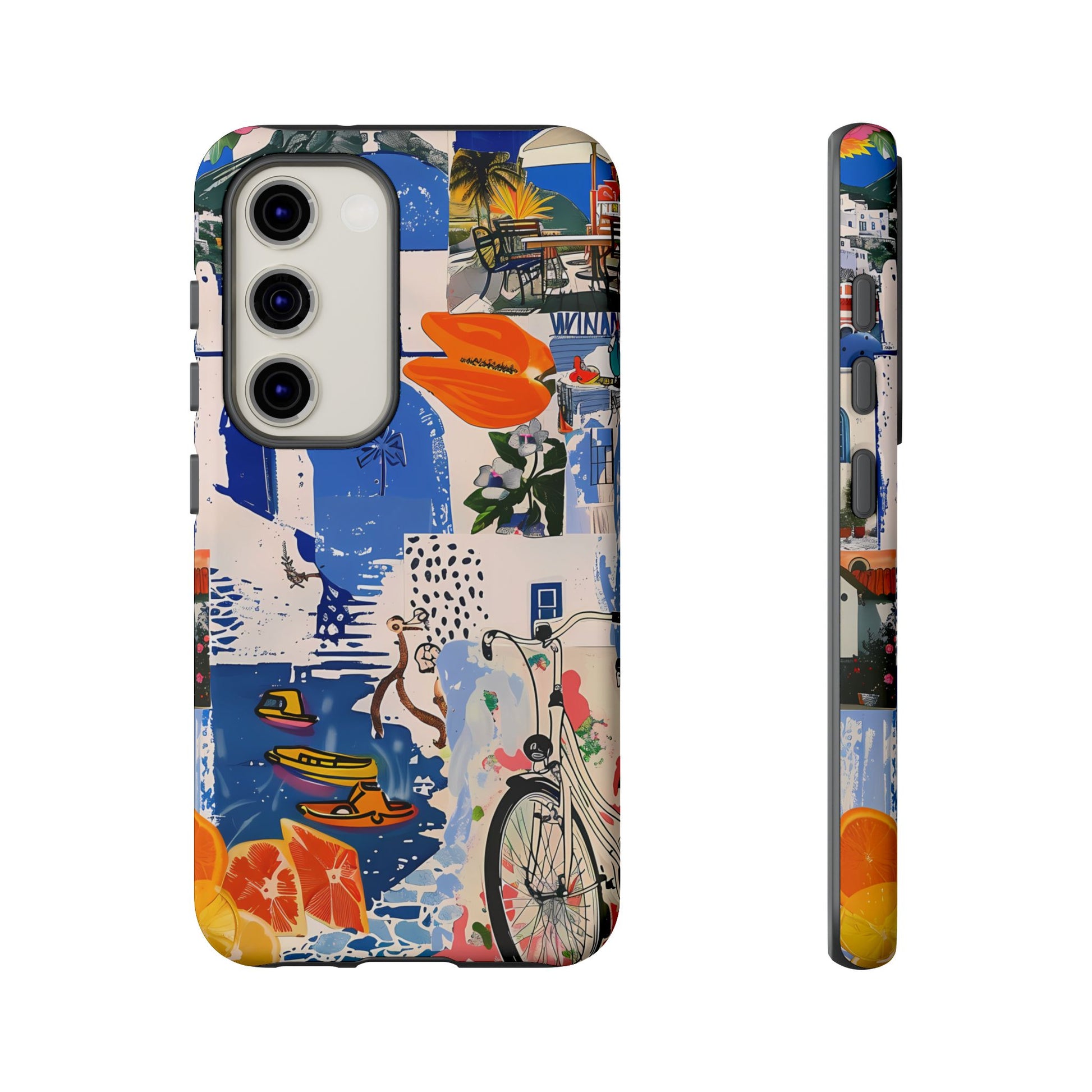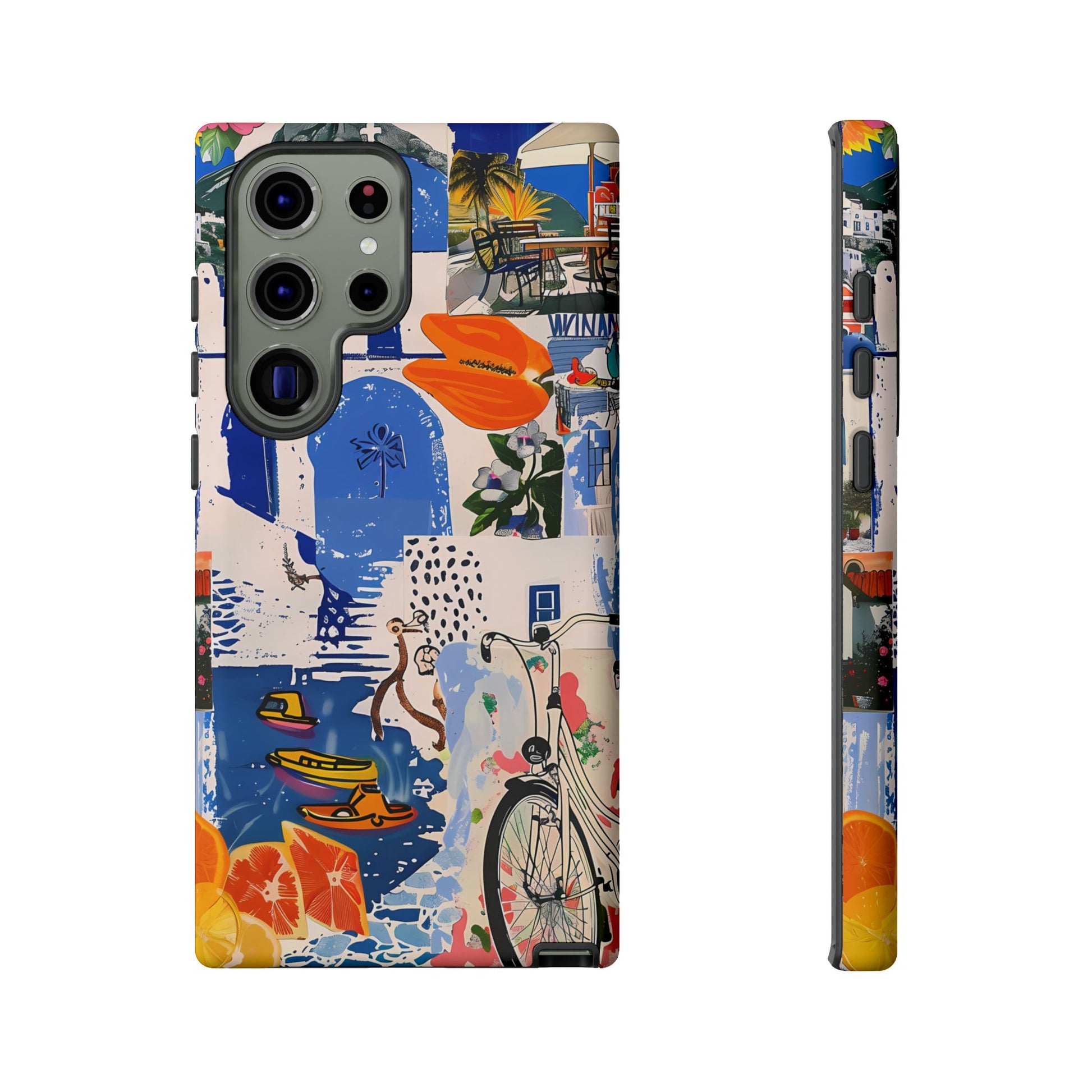 Experience the romance of Santorini with our Santorini Serenade Cover. This captivating collage showcases iconic Greek island scenes, featuring vintage images of blue-domed churches, winding cobblestone streets, and breathtaking cliffside views. Embrace the allure of the Aegean and adorn your phone with the beauty of Santorini