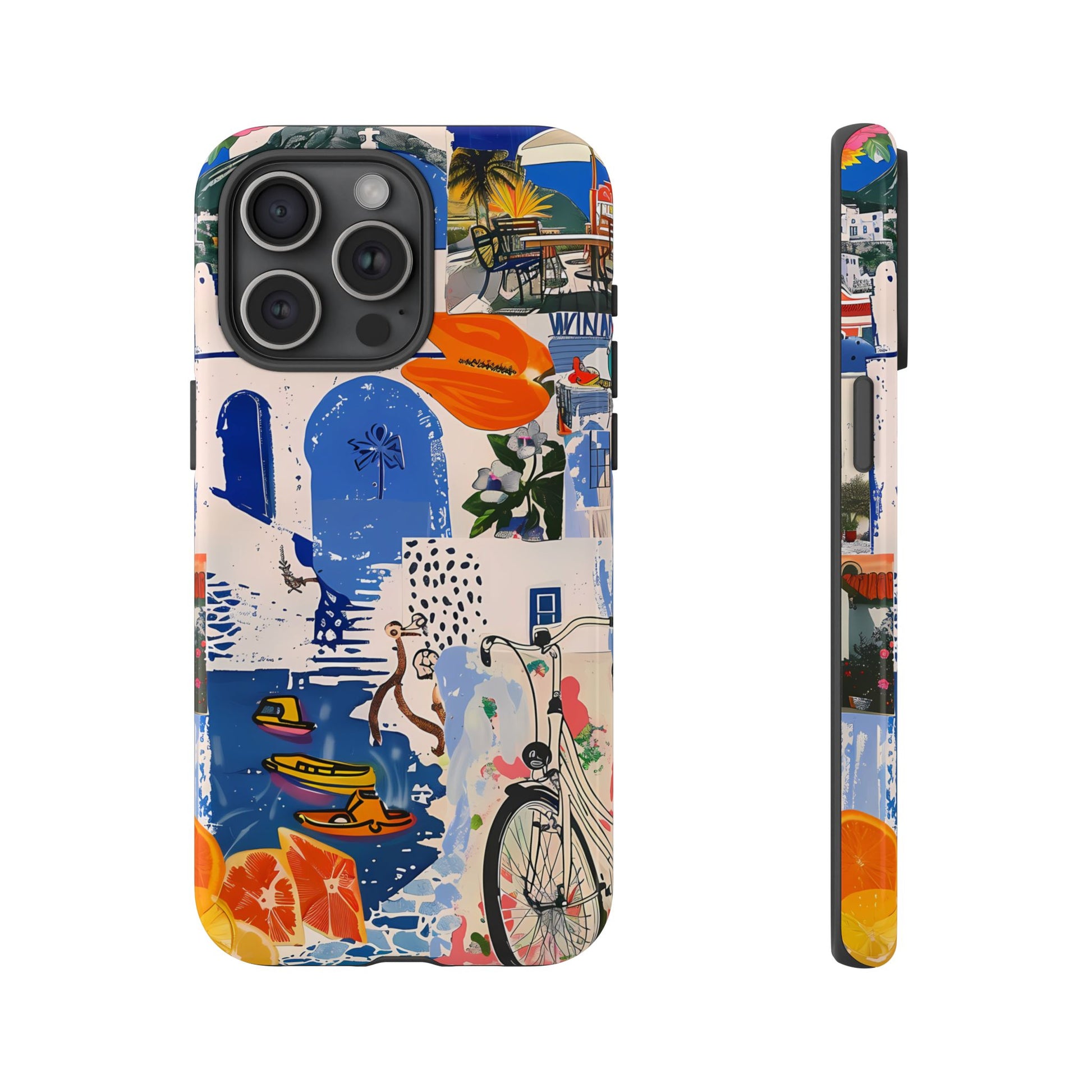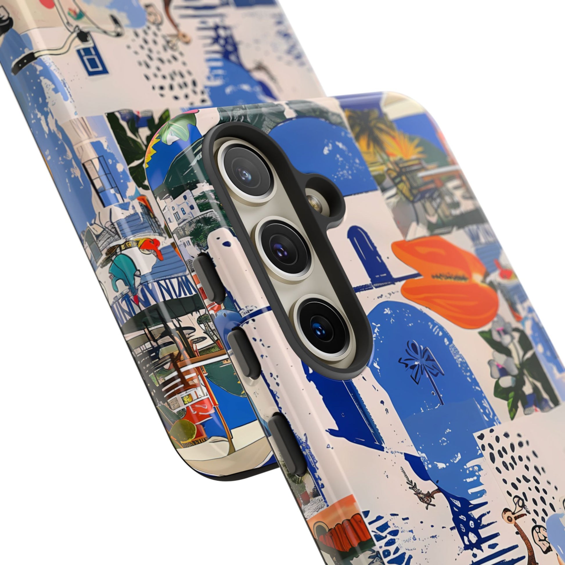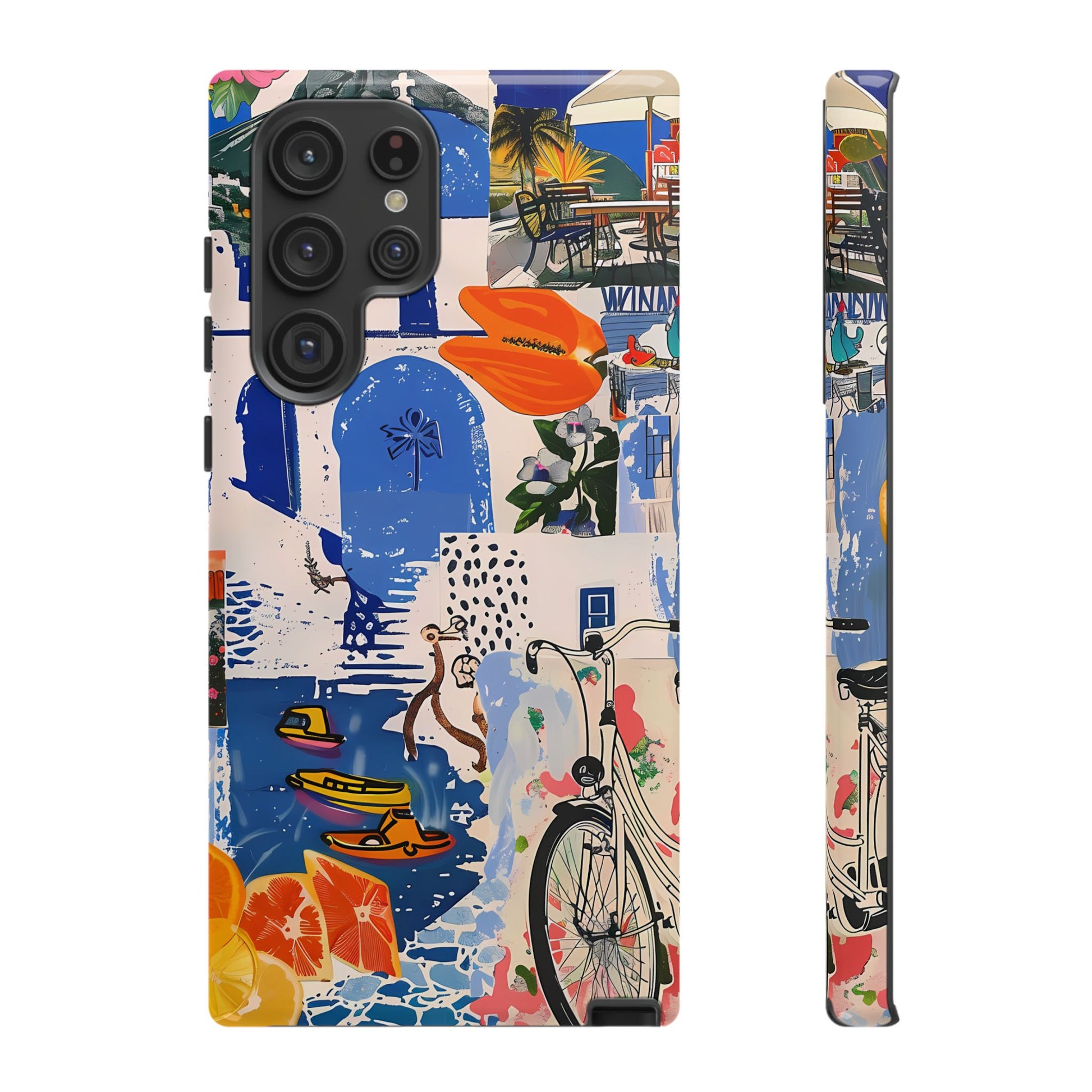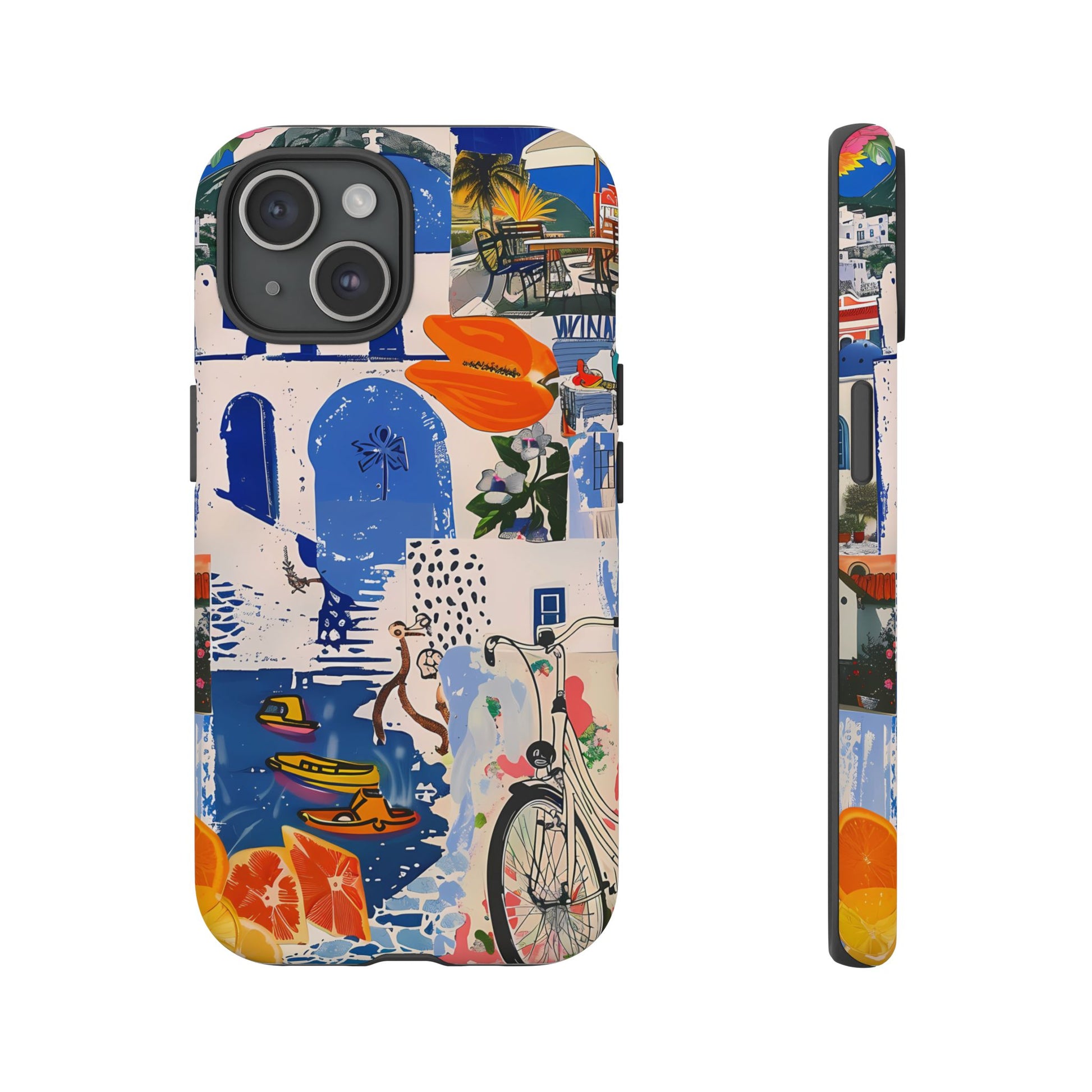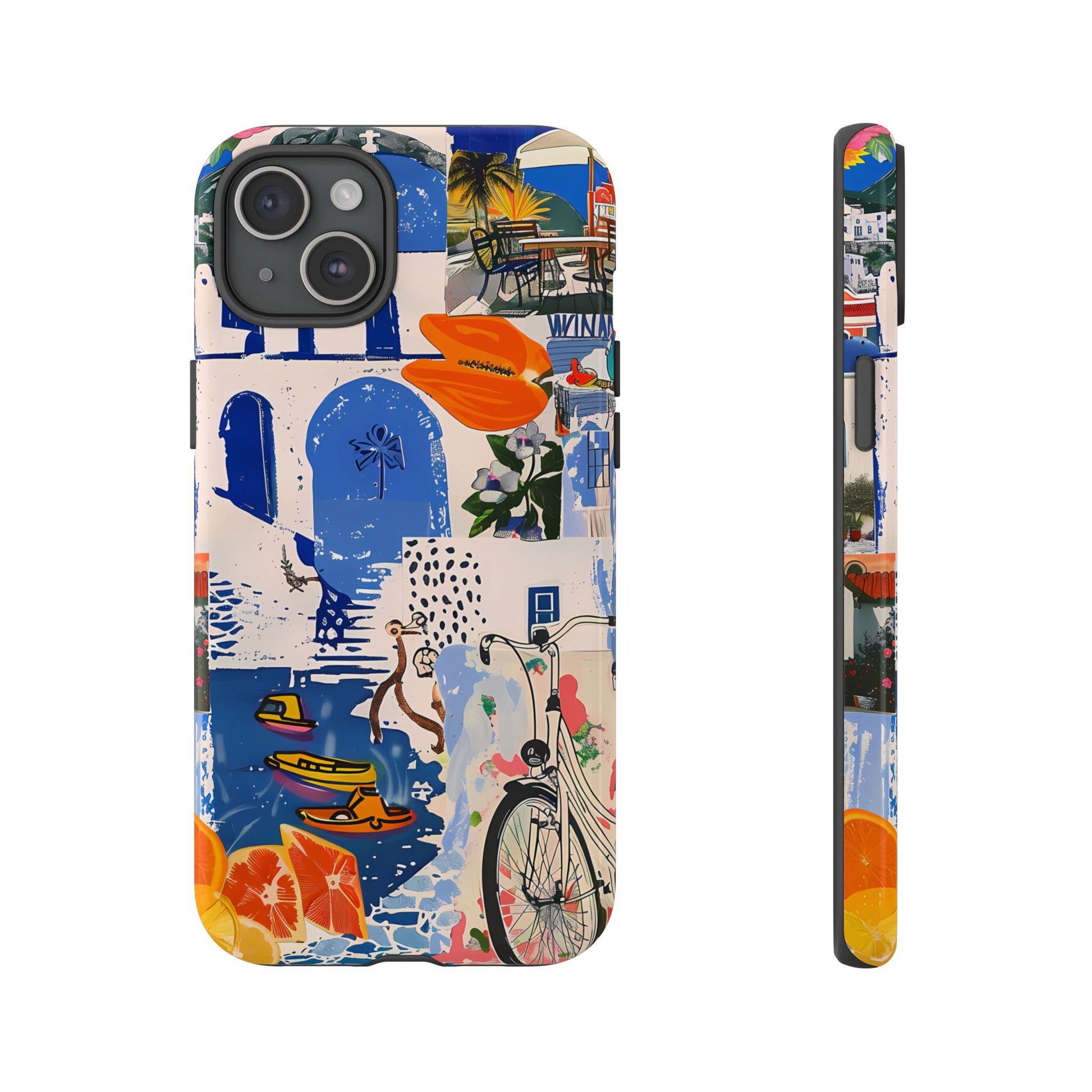 Experience the romance of Santorini with our Santorini Serenade Cover. This captivating collage showcases iconic Greek island scenes, featuring vintage images of blue-domed churches, winding cobblestone streets, and breathtaking cliffside views. Embrace the allure of the Aegean and adorn your phone with the beauty of Santorini