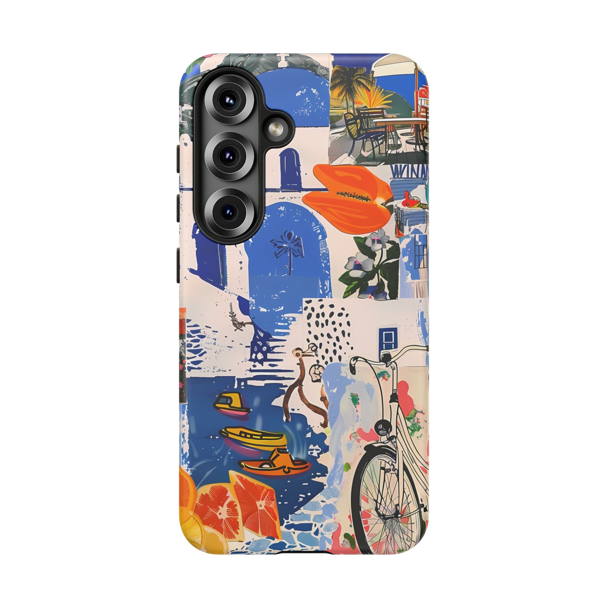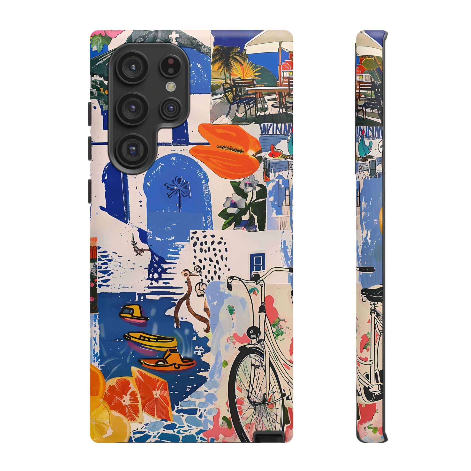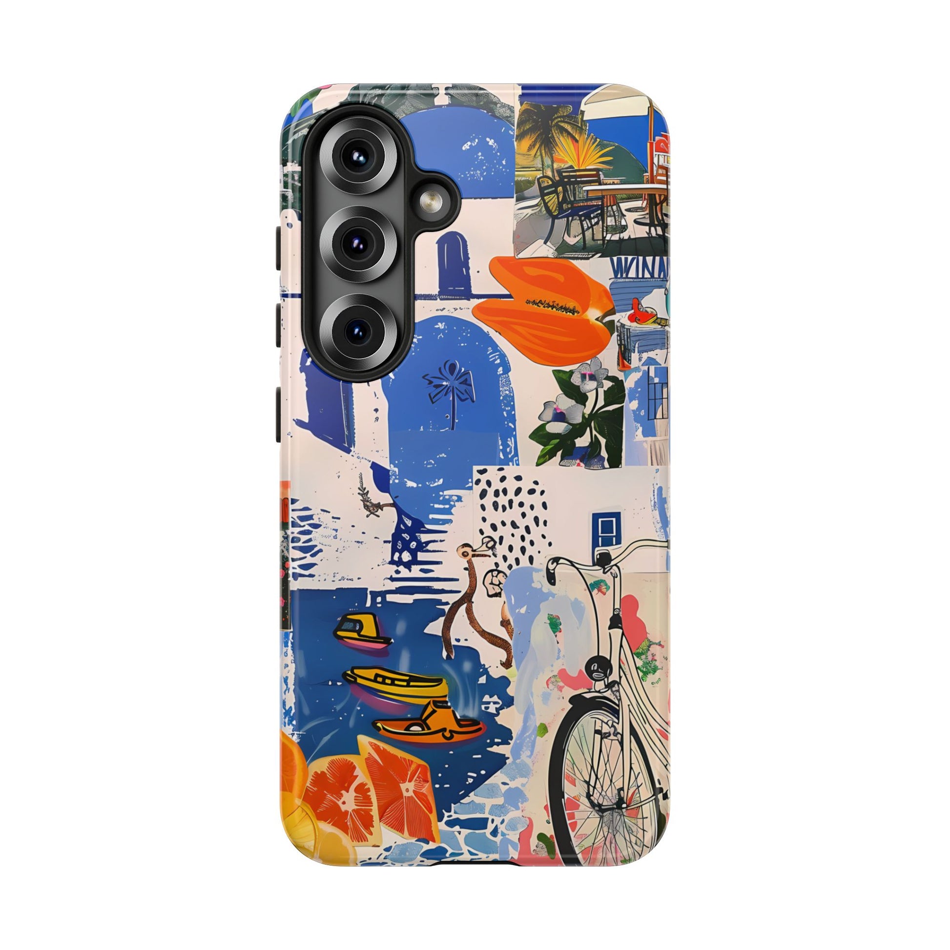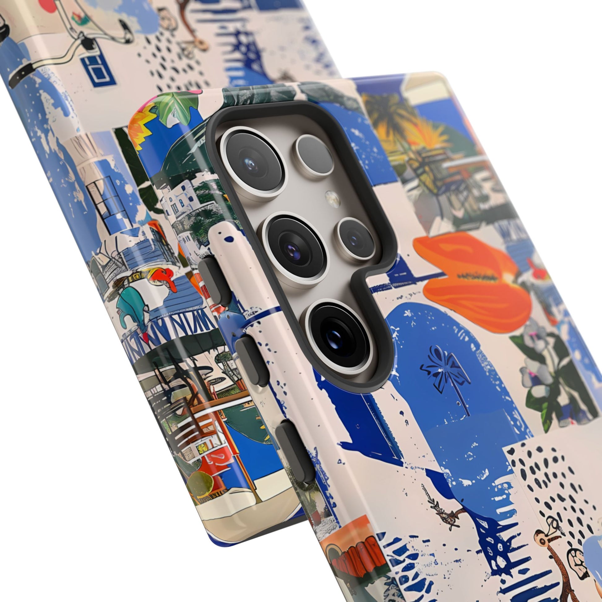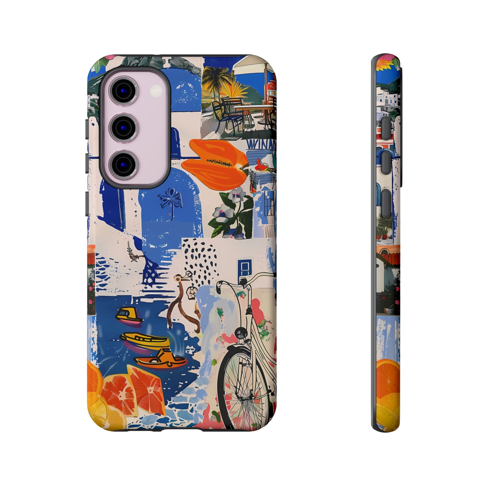 Experience the romance of Santorini with our Santorini Serenade Cover. This captivating collage showcases iconic Greek island scenes, featuring vintage images of blue-domed churches, winding cobblestone streets, and breathtaking cliffside views. Embrace the allure of the Aegean and adorn your phone with the beauty of Santorini