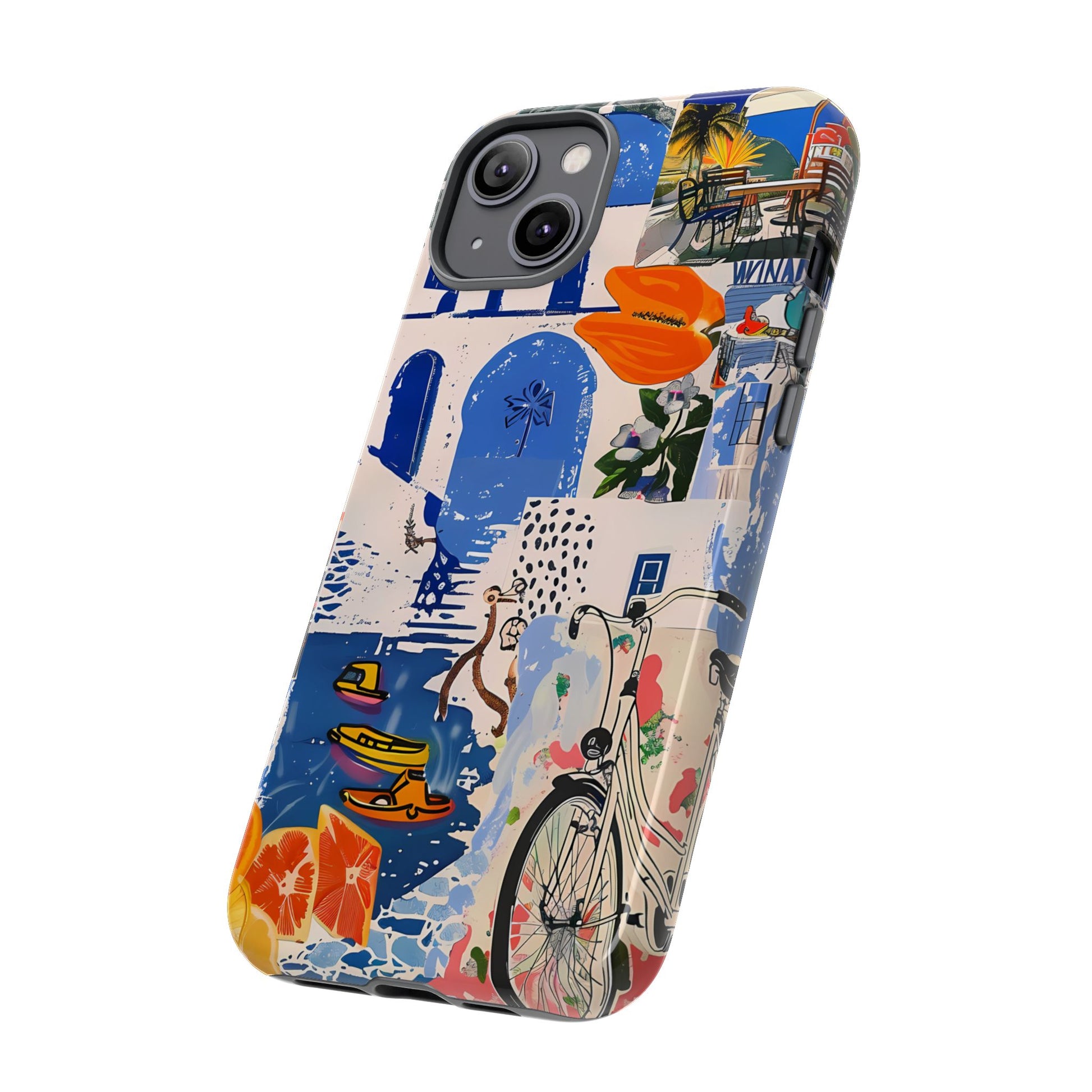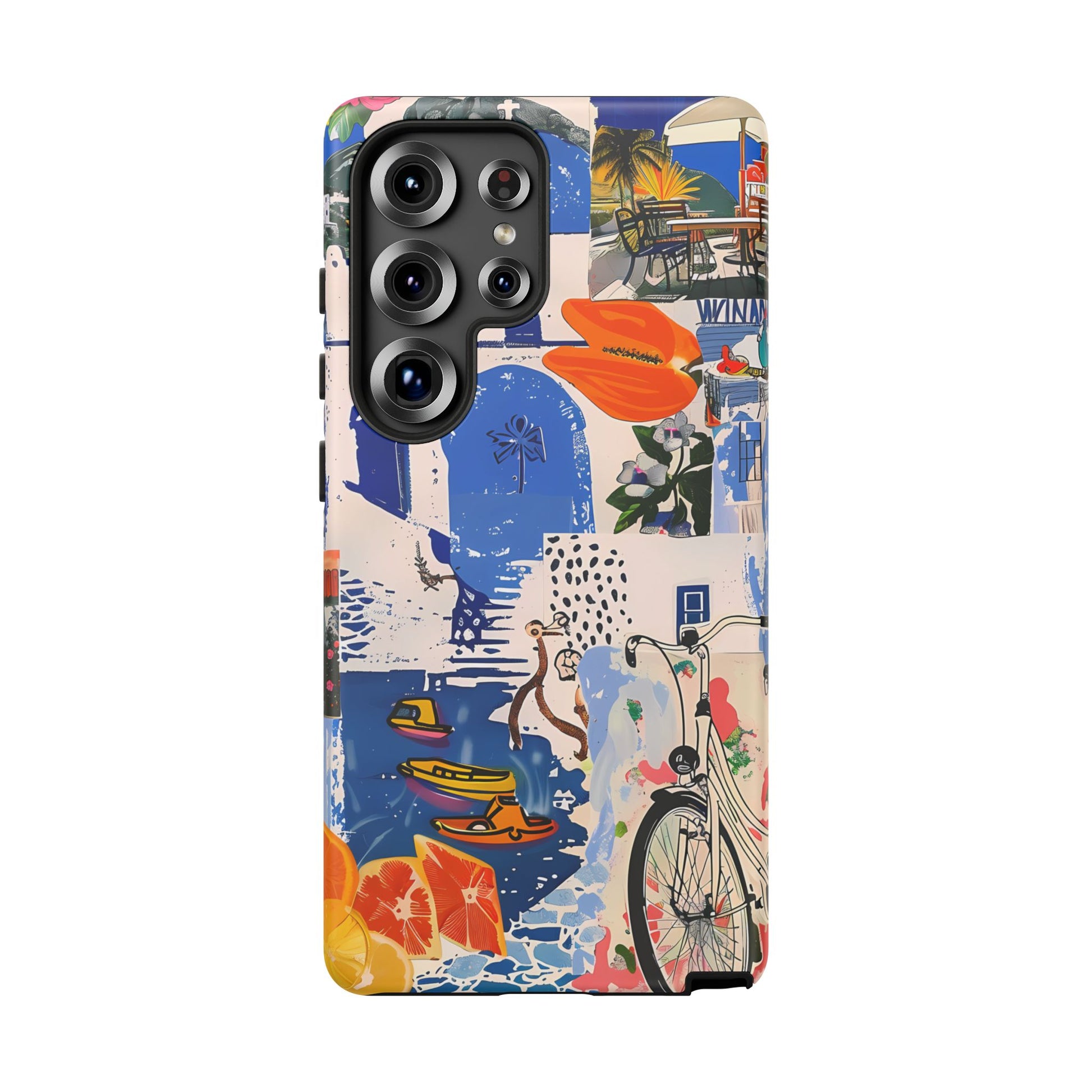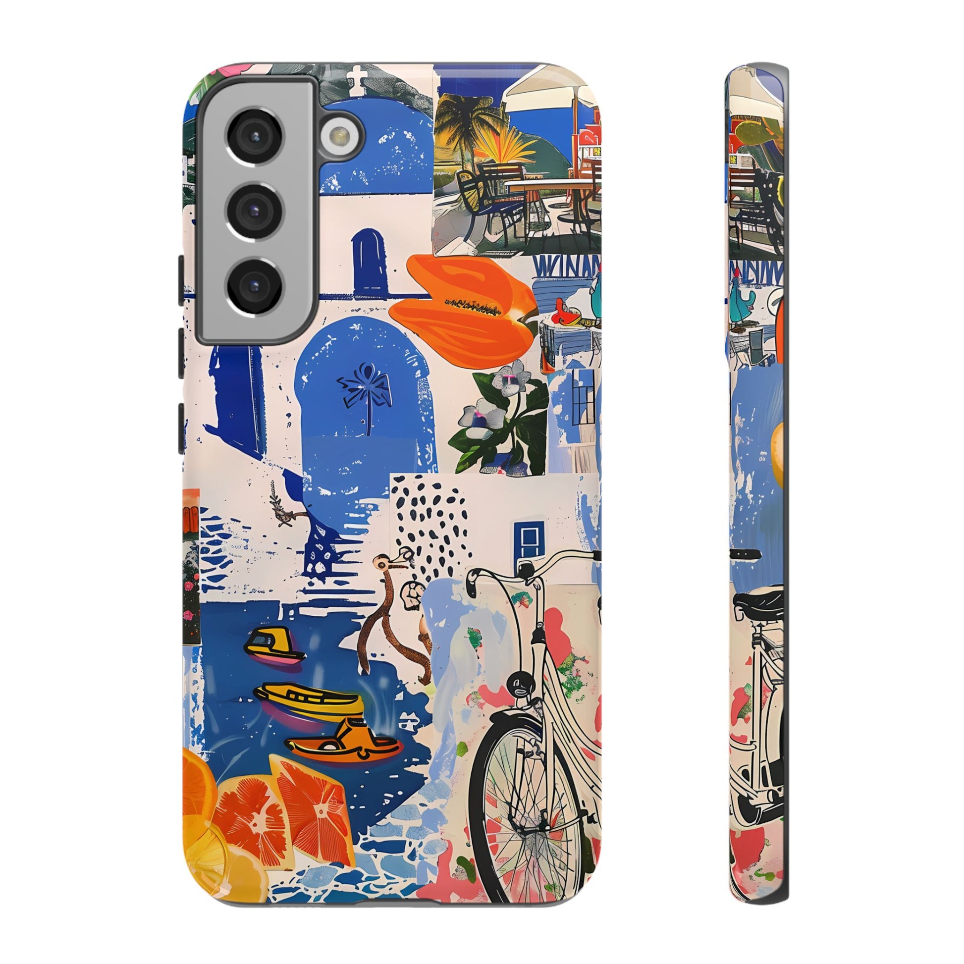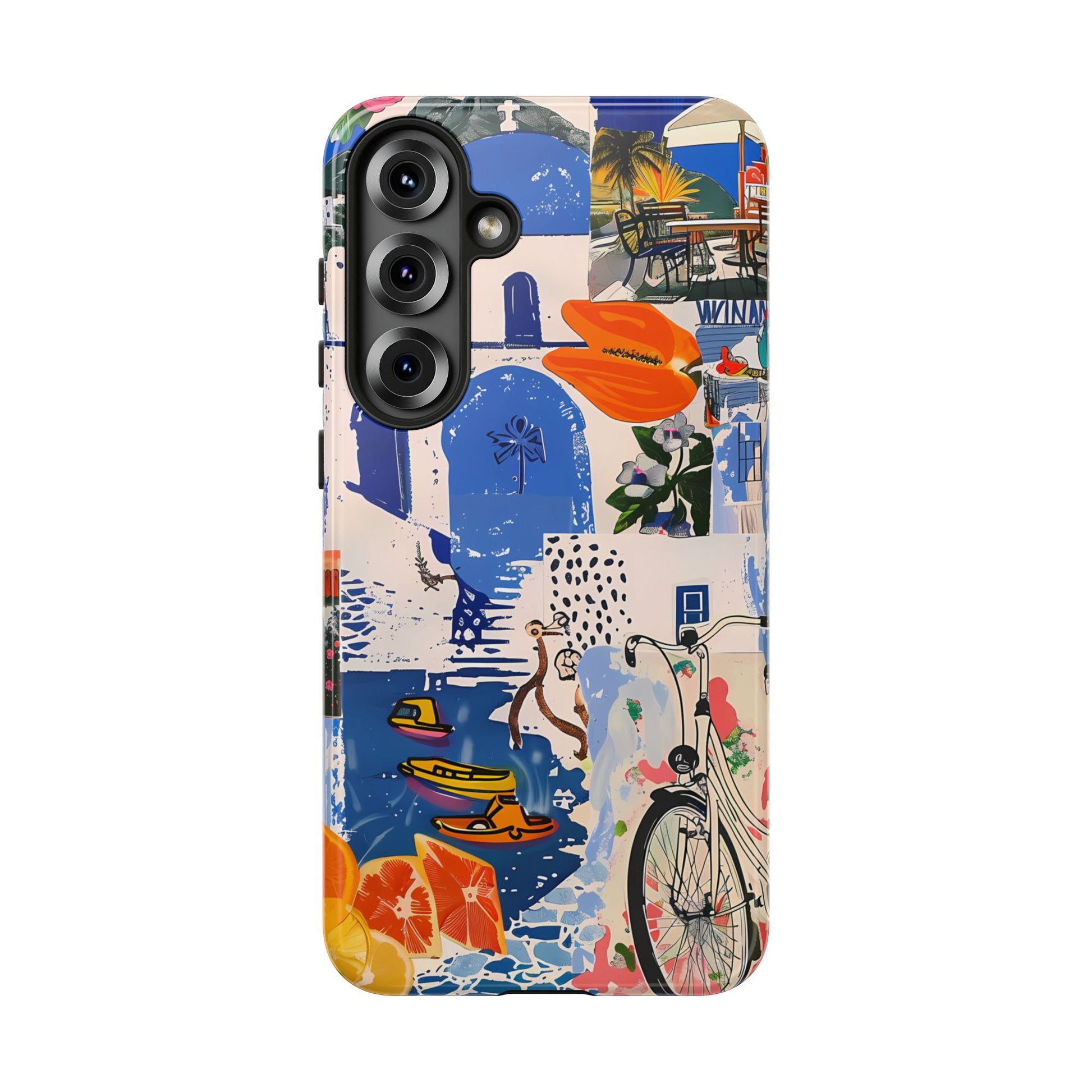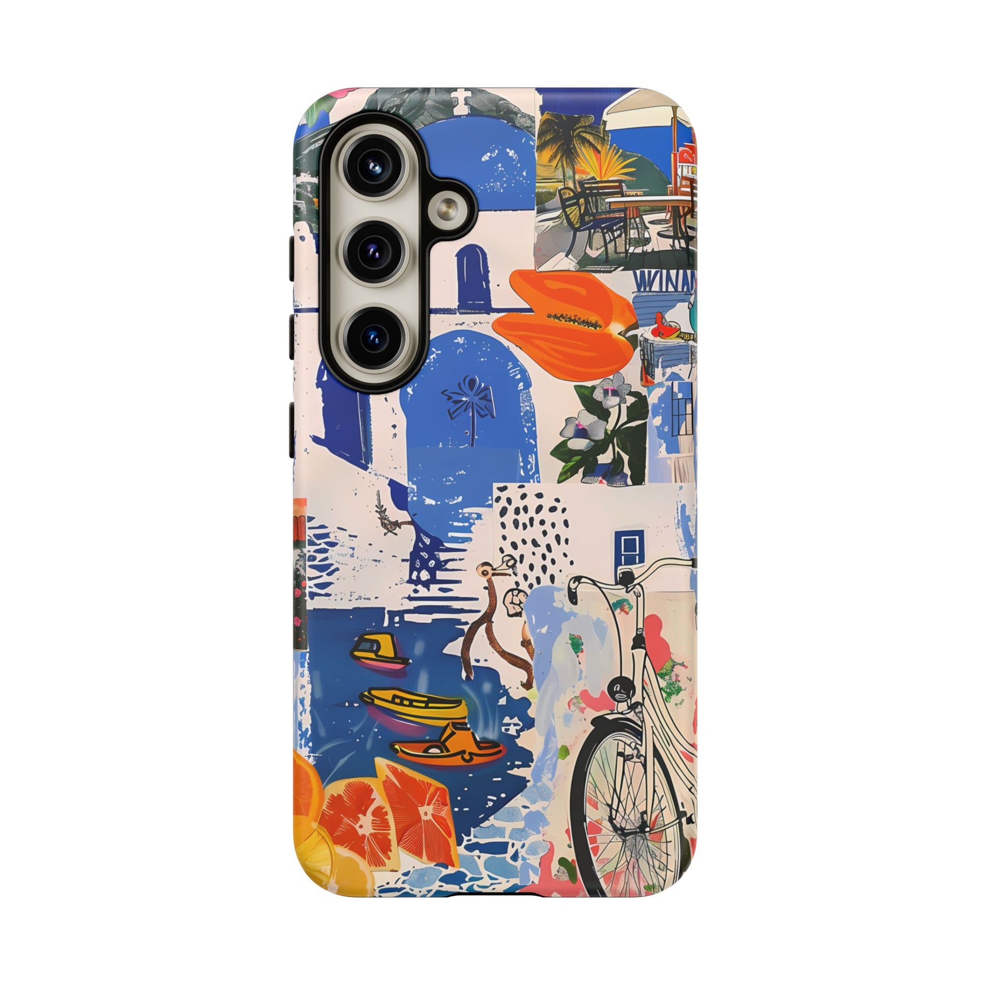 Experience the romance of Santorini with our Santorini Serenade Cover. This captivating collage showcases iconic Greek island scenes, featuring vintage images of blue-domed churches, winding cobblestone streets, and breathtaking cliffside views. Embrace the allure of the Aegean and adorn your phone with the beauty of Santorini