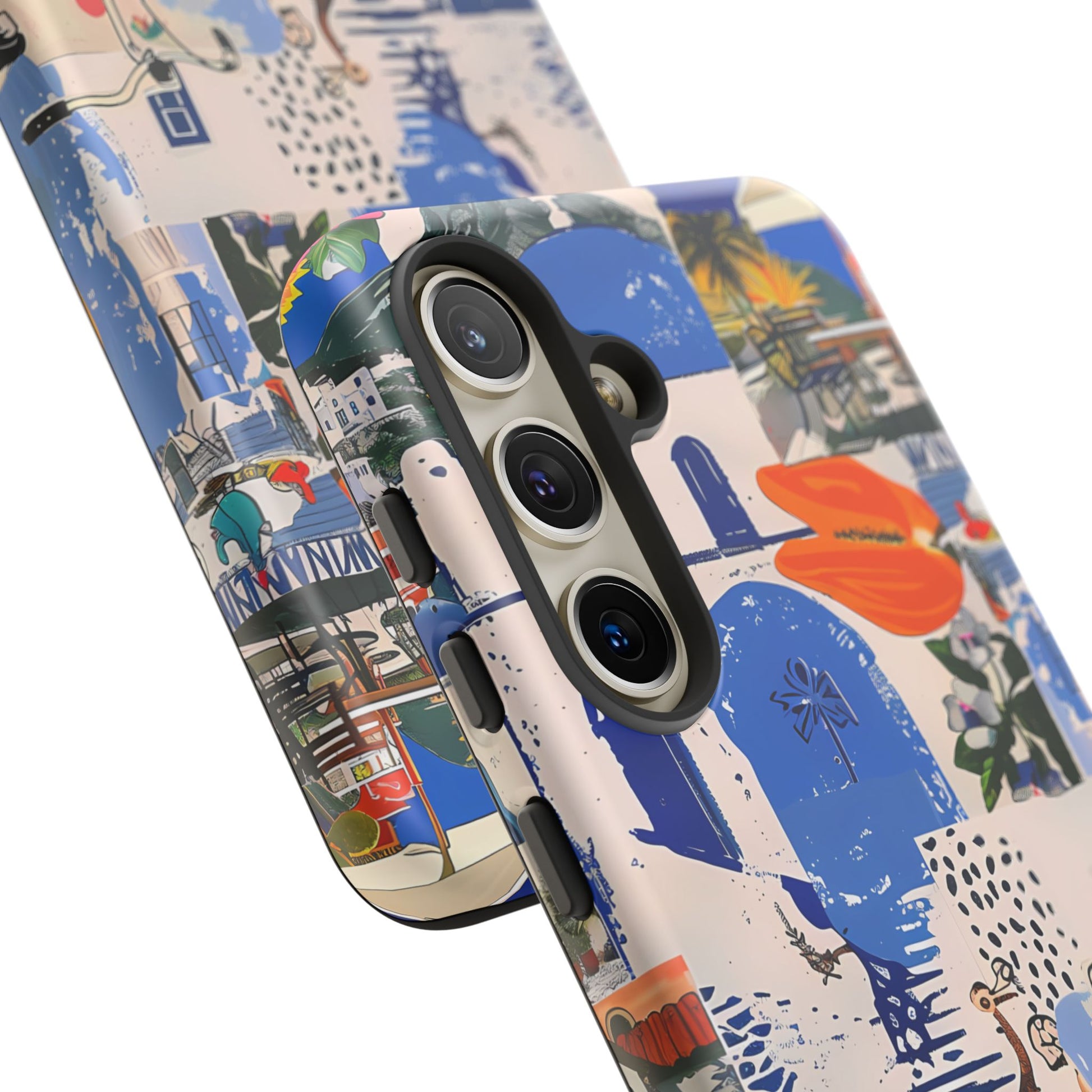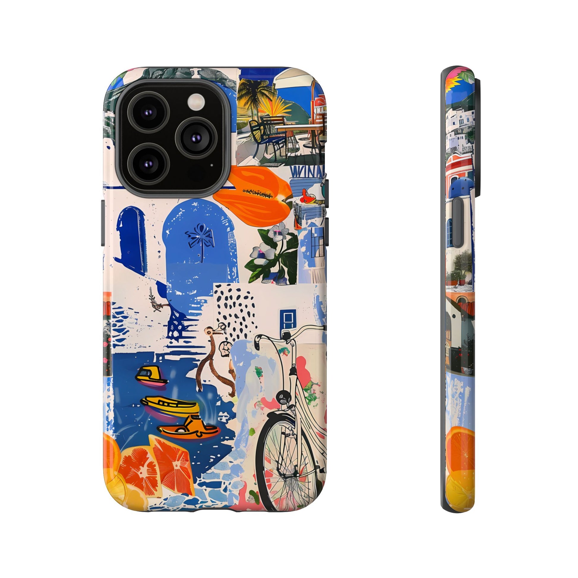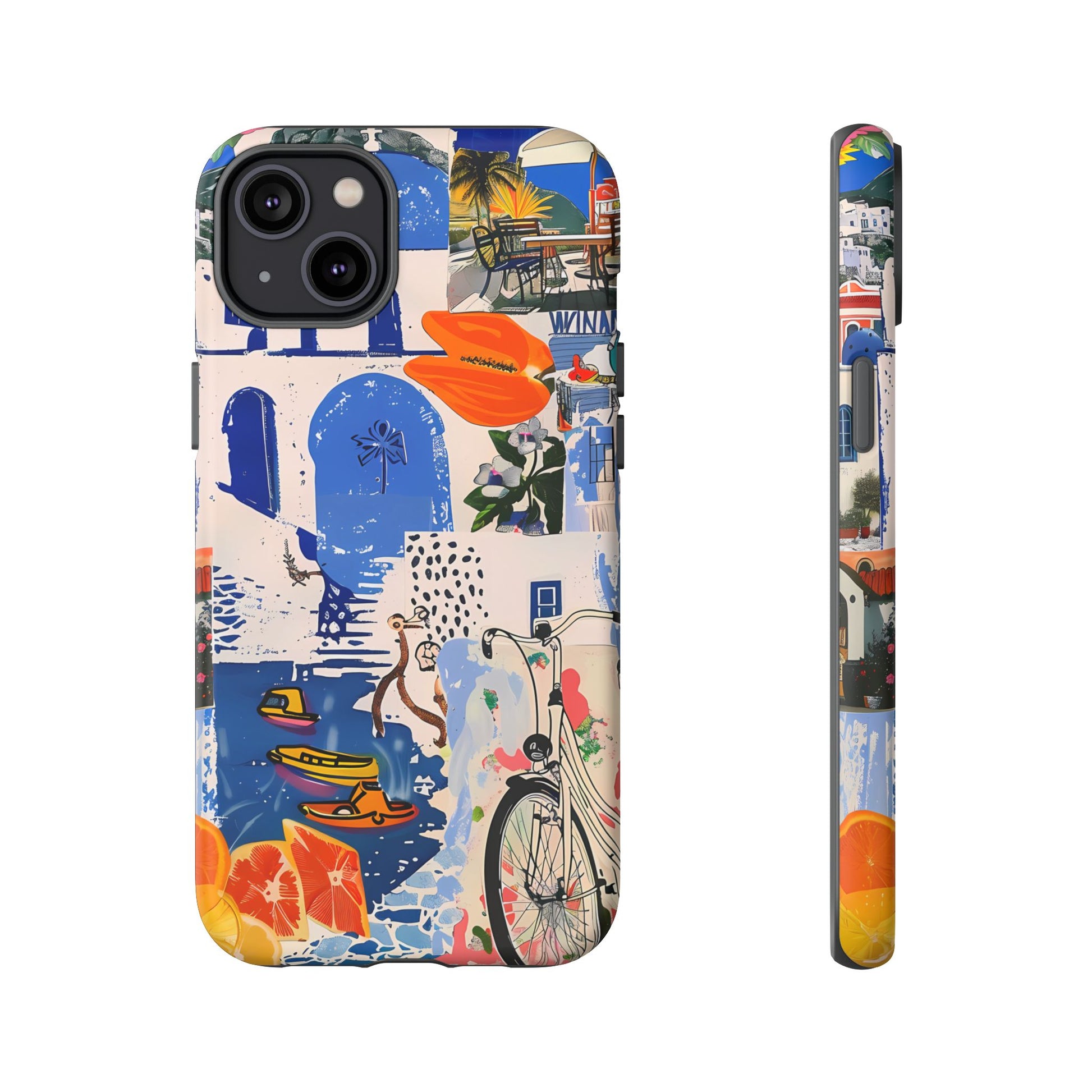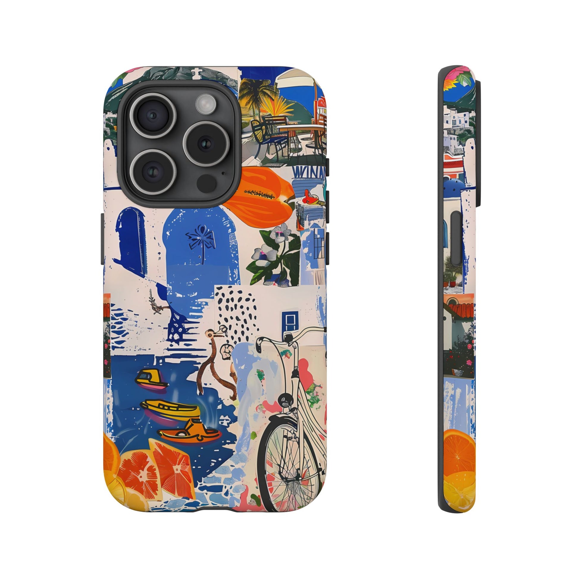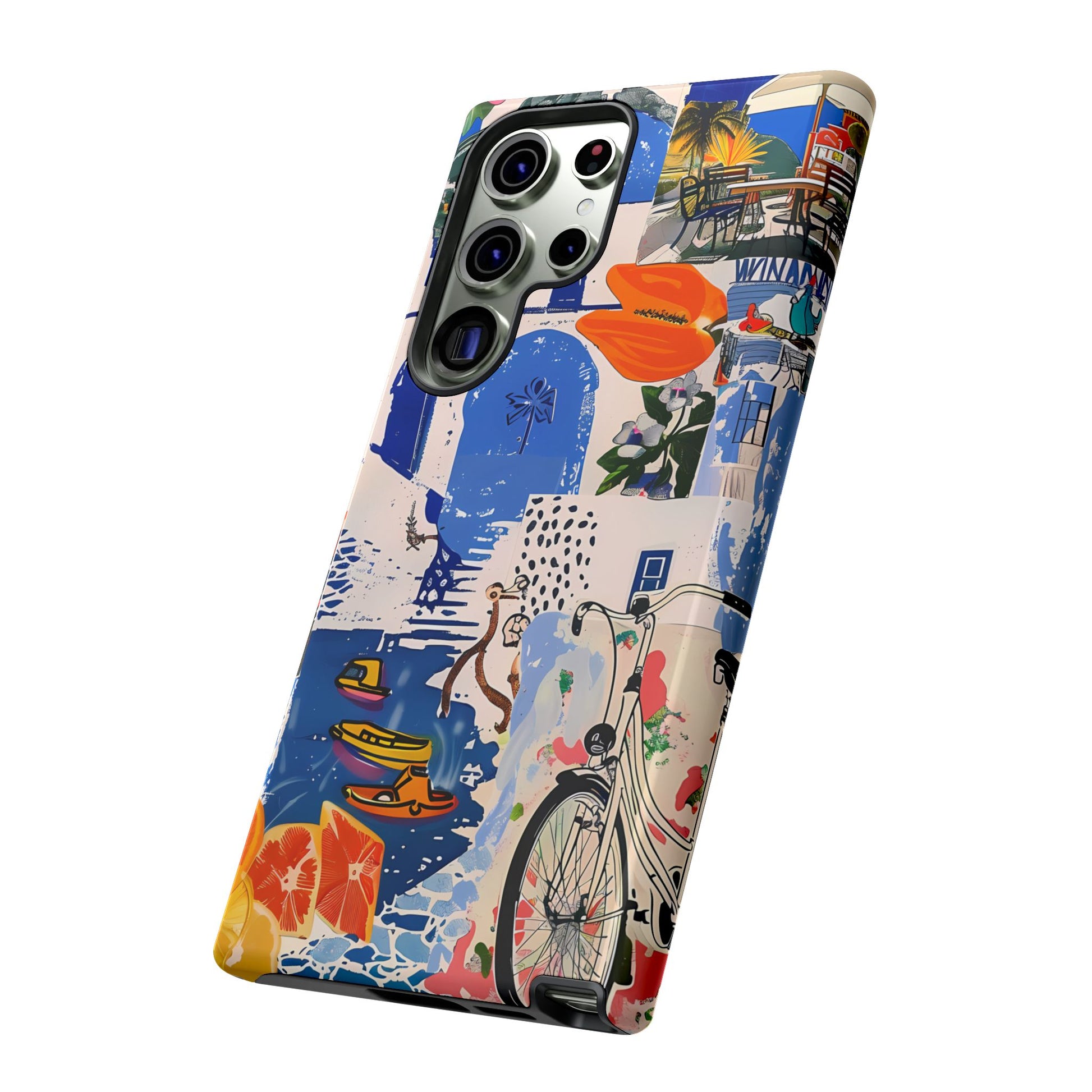 Experience the romance of Santorini with our Santorini Serenade Cover. This captivating collage showcases iconic Greek island scenes, featuring vintage images of blue-domed churches, winding cobblestone streets, and breathtaking cliffside views. Embrace the allure of the Aegean and adorn your phone with the beauty of Santorini