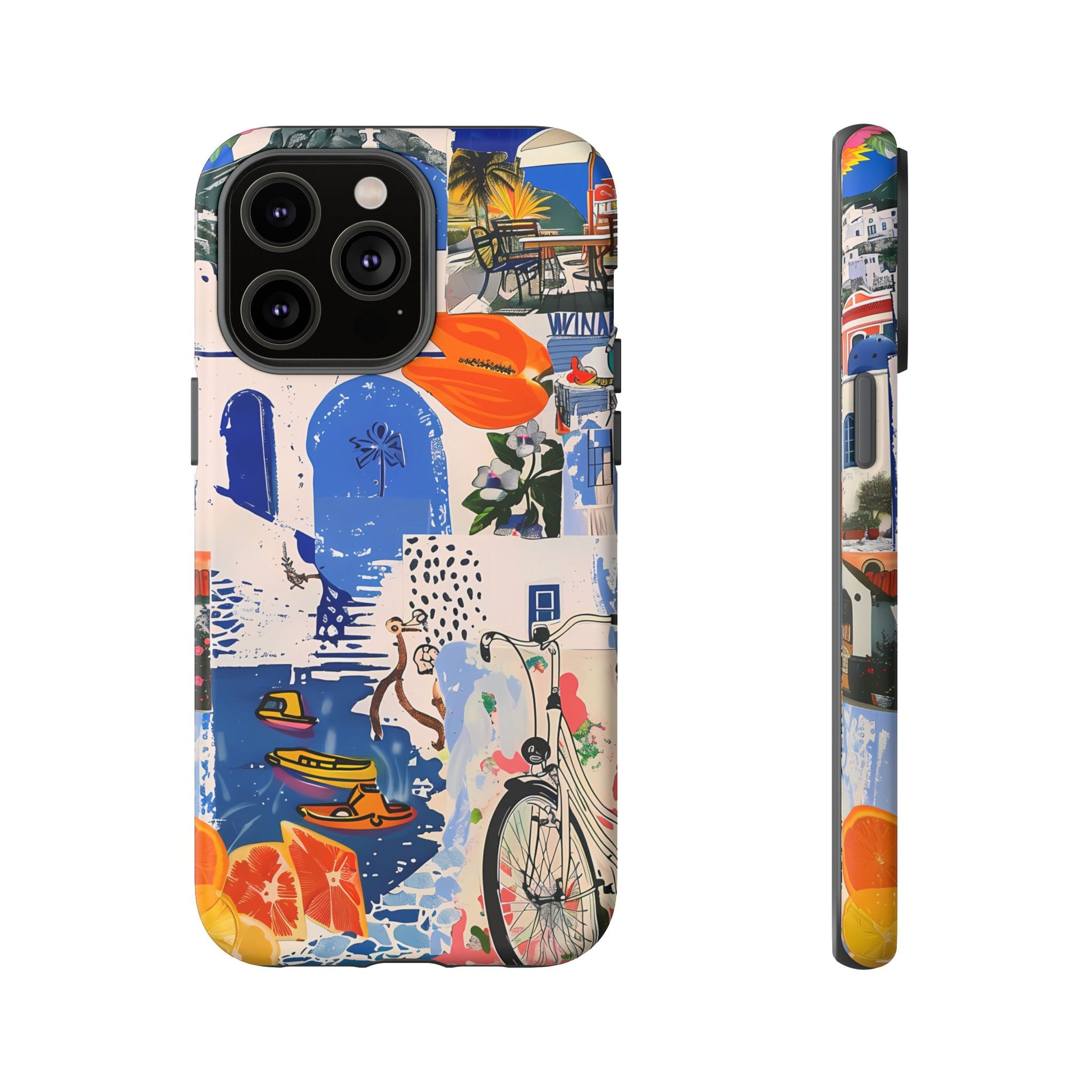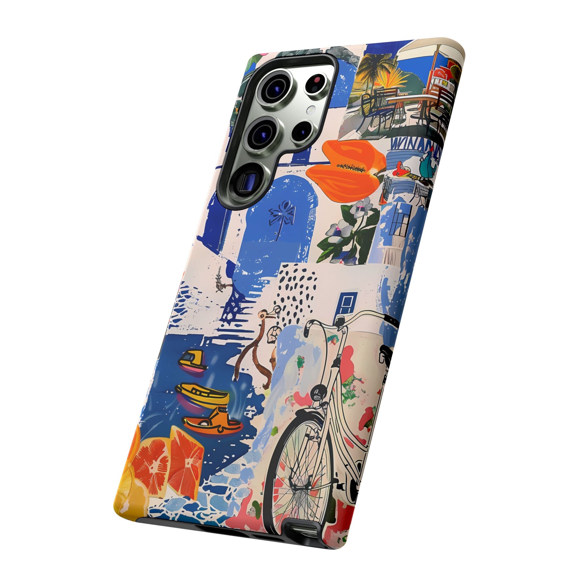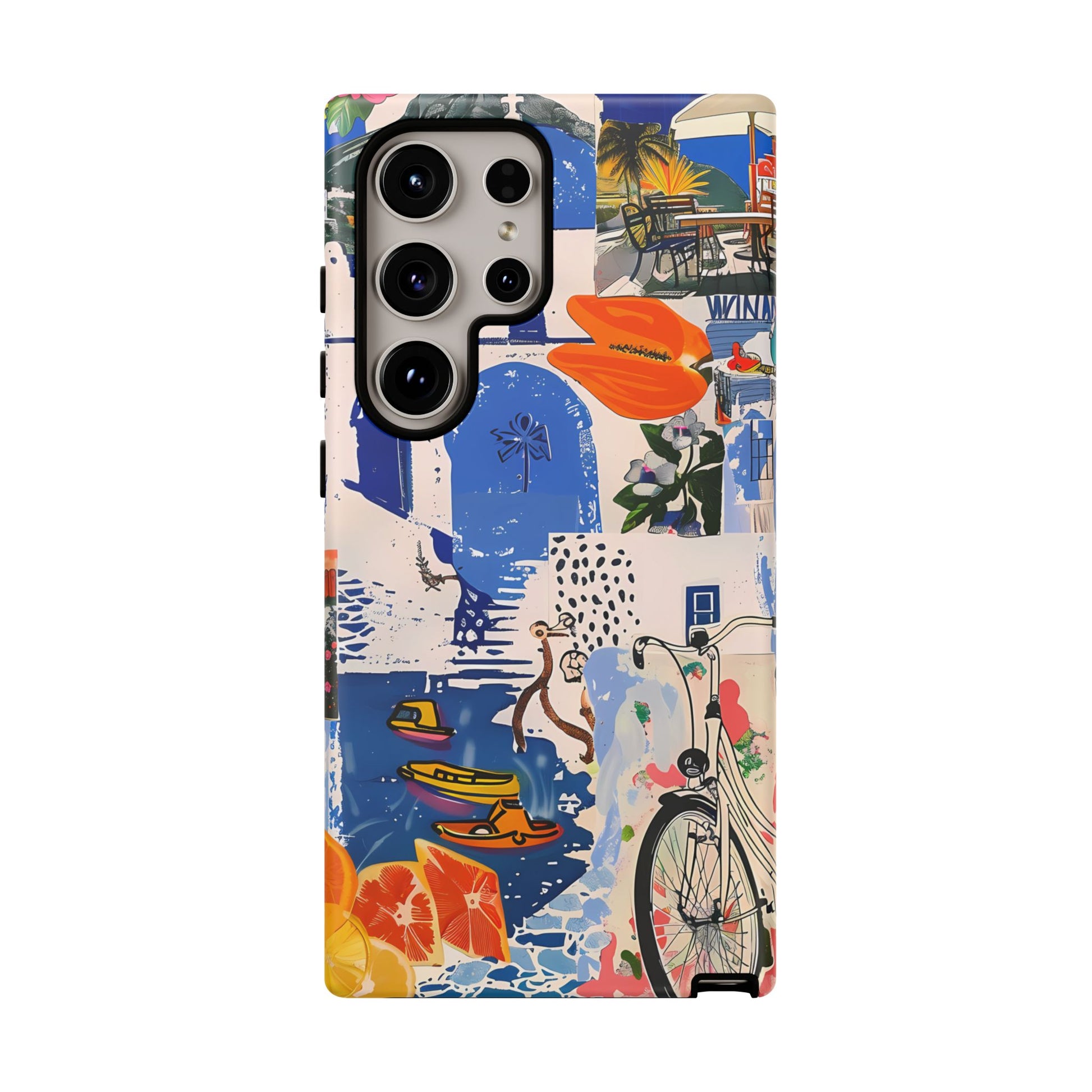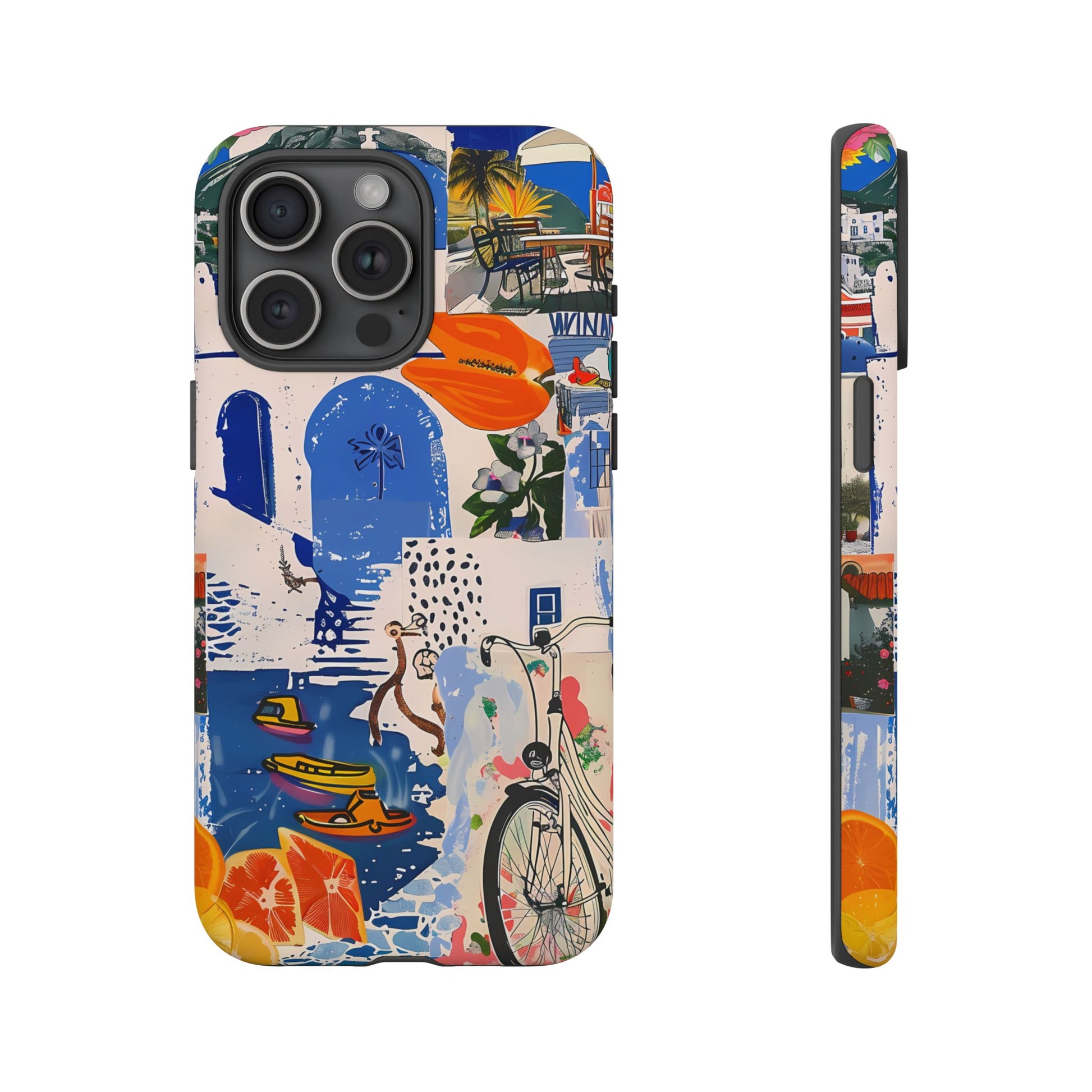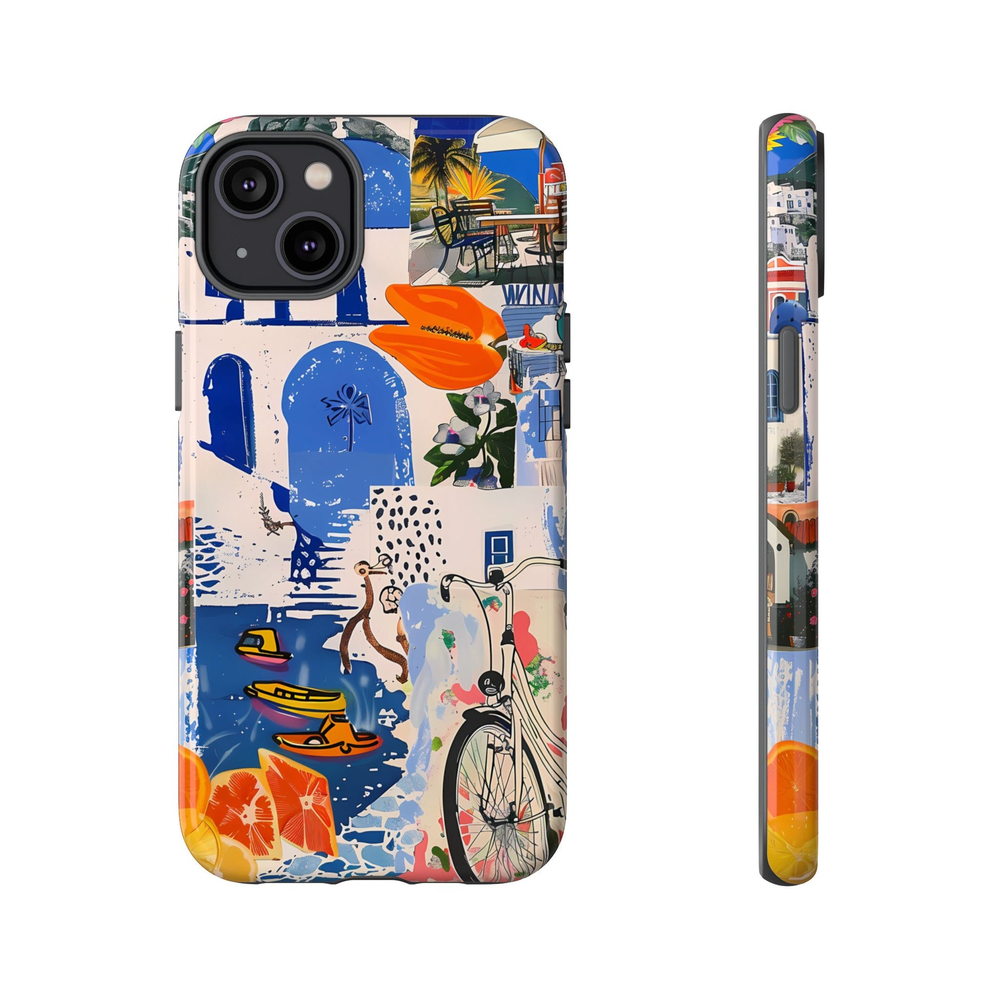 Experience the romance of Santorini with our Santorini Serenade Cover. This captivating collage showcases iconic Greek island scenes, featuring vintage images of blue-domed churches, winding cobblestone streets, and breathtaking cliffside views. Embrace the allure of the Aegean and adorn your phone with the beauty of Santorini