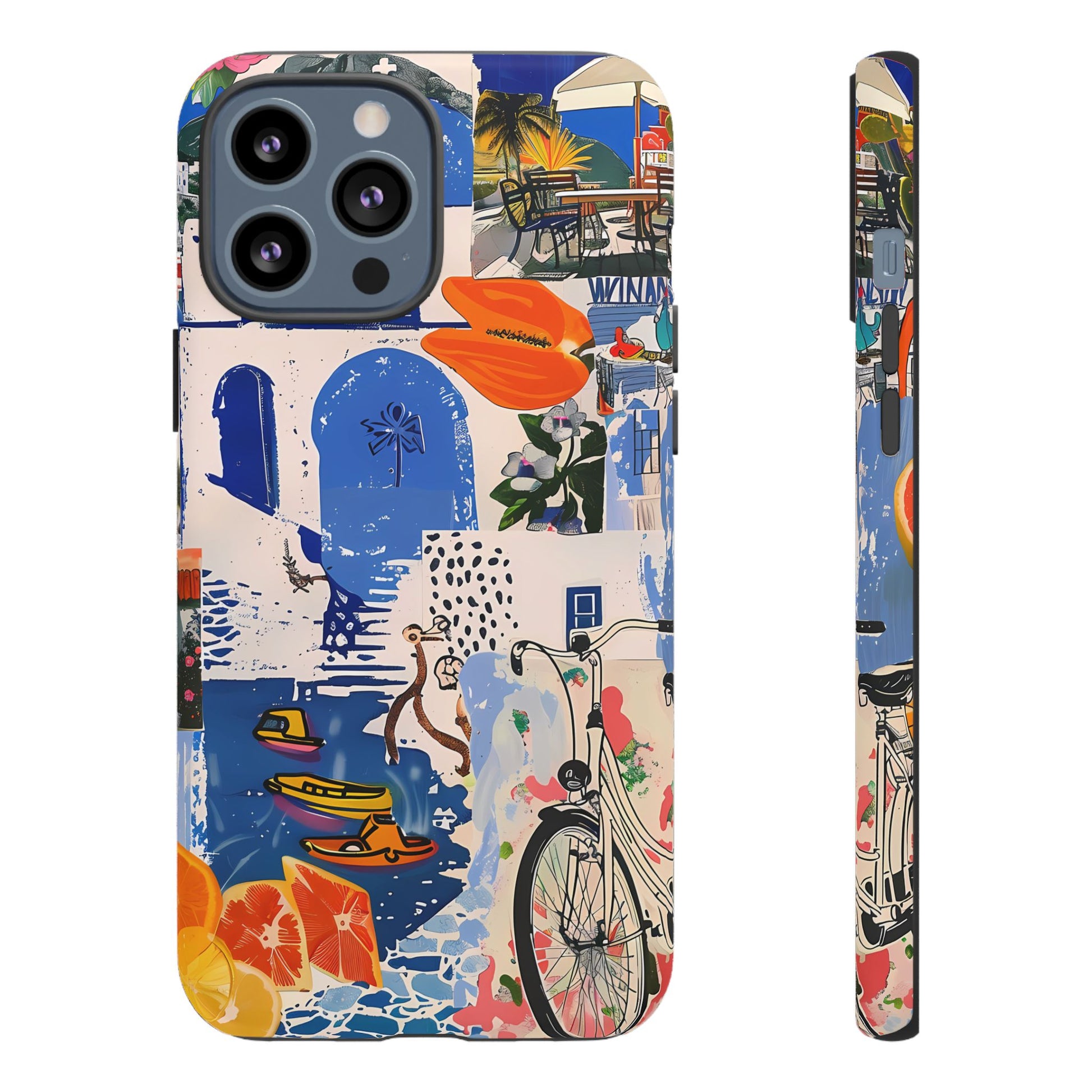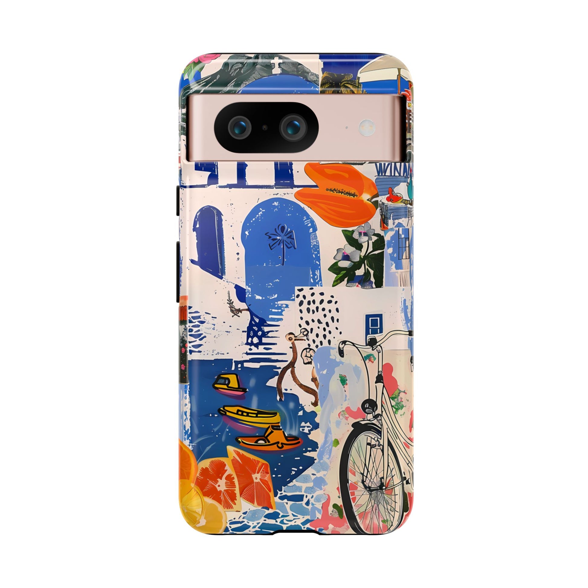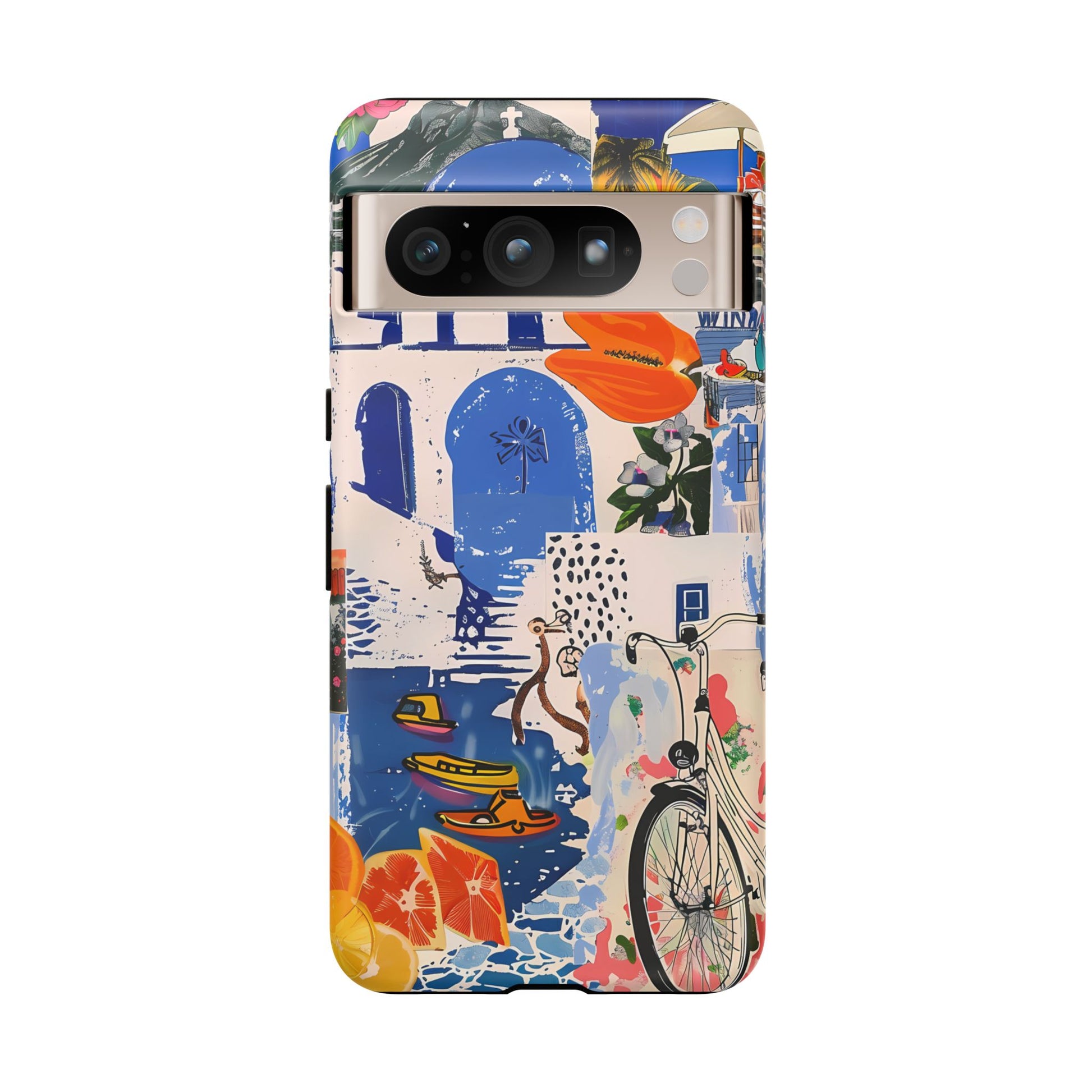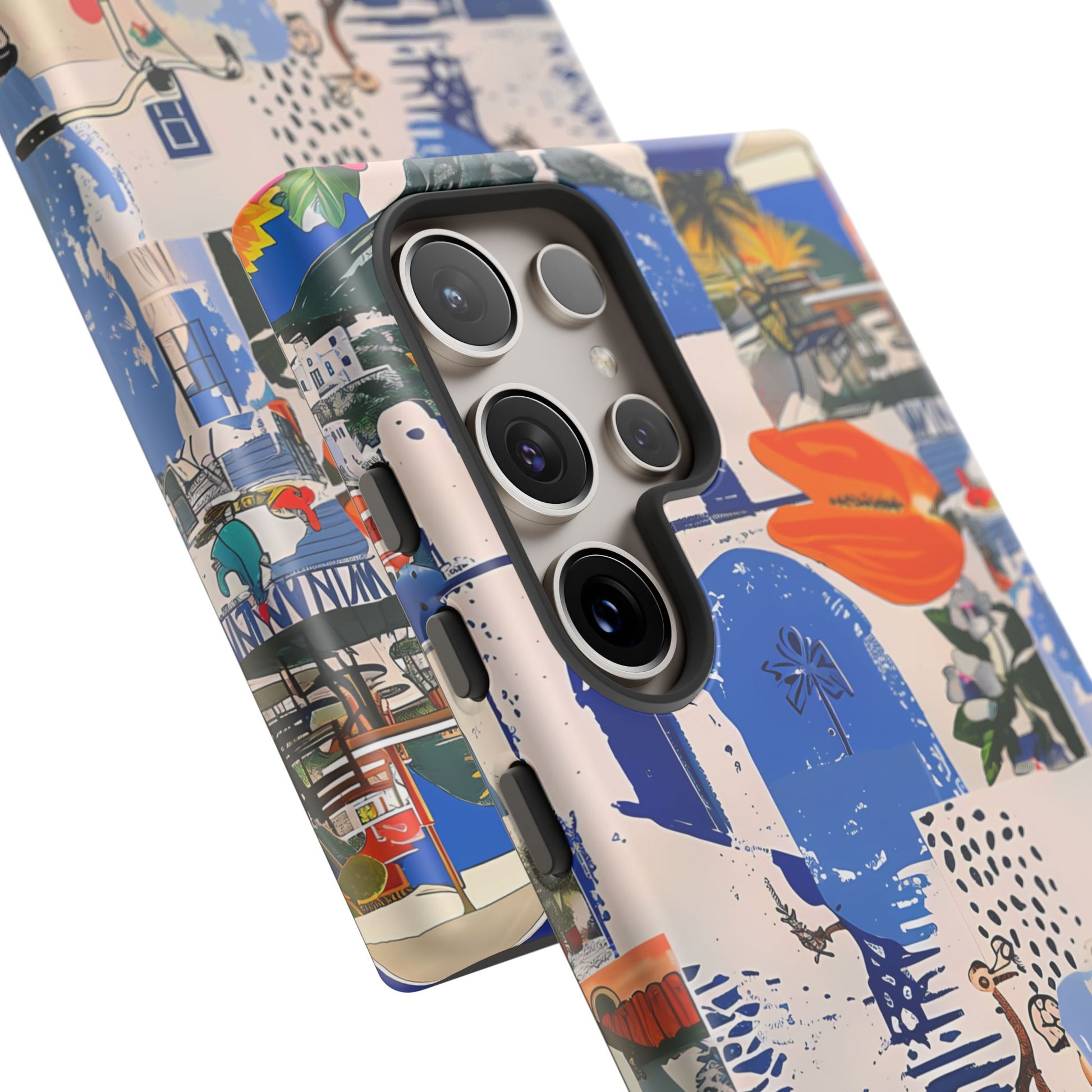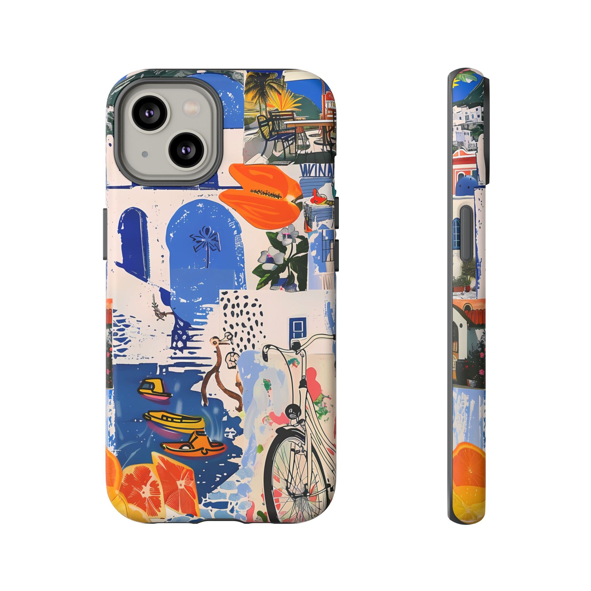 Experience the romance of Santorini with our Santorini Serenade Cover. This captivating collage showcases iconic Greek island scenes, featuring vintage images of blue-domed churches, winding cobblestone streets, and breathtaking cliffside views. Embrace the allure of the Aegean and adorn your phone with the beauty of Santorini