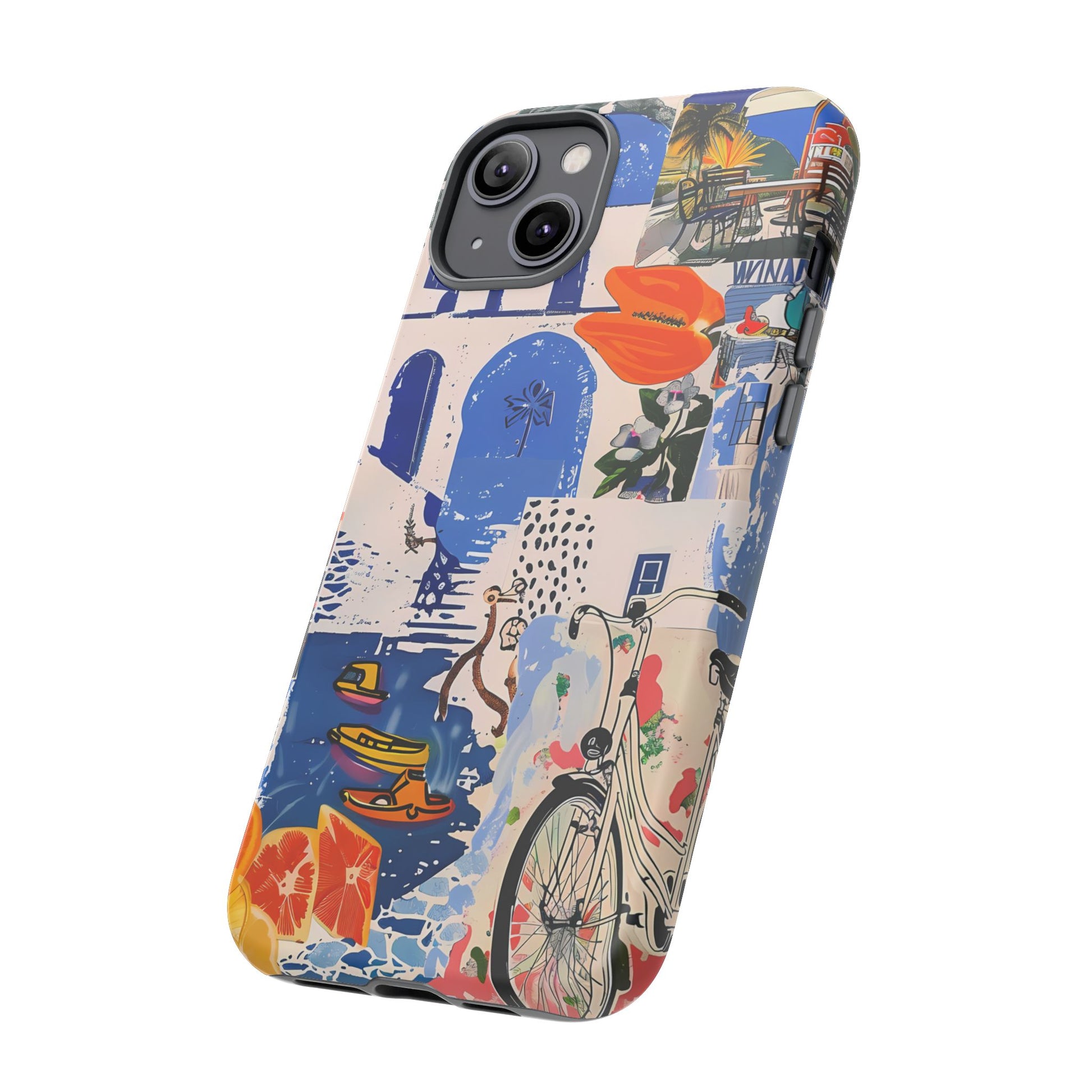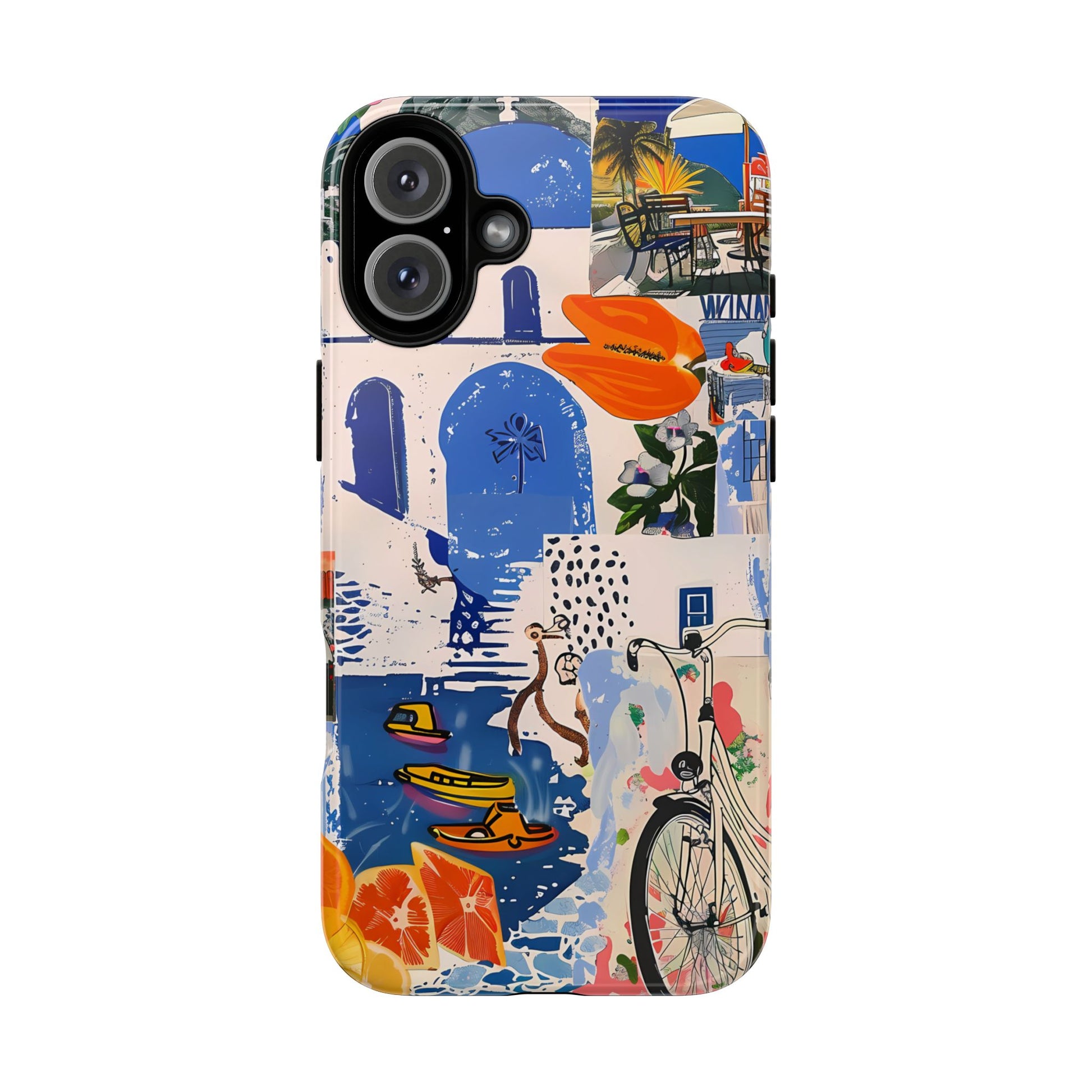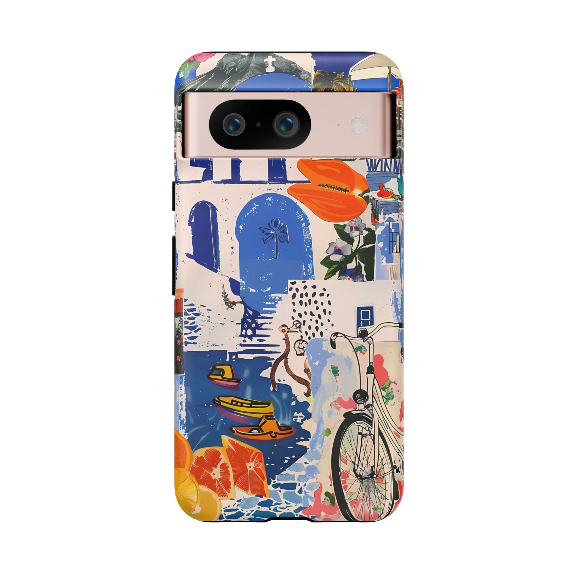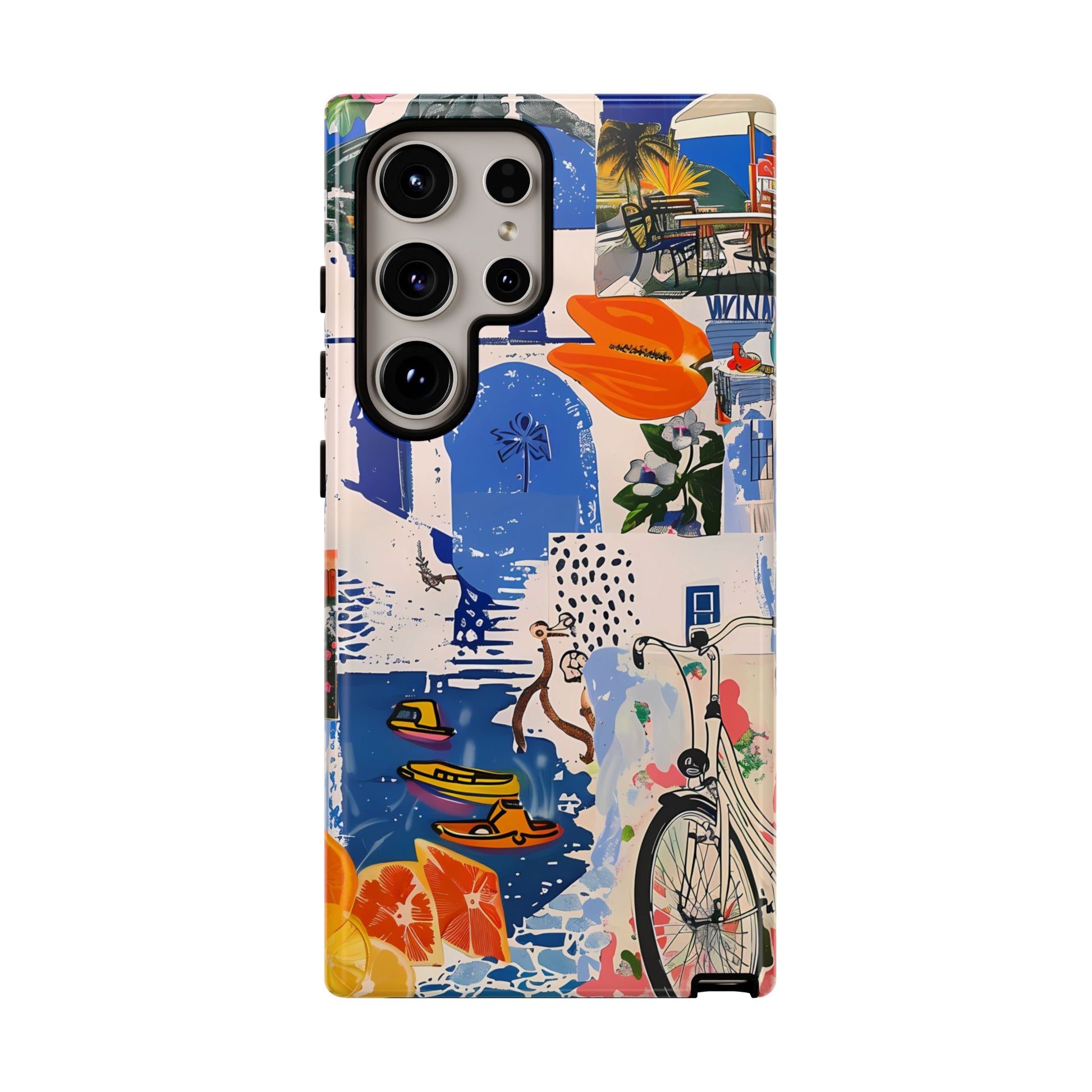 Experience the romance of Santorini with our Santorini Serenade Cover. This captivating collage showcases iconic Greek island scenes, featuring vintage images of blue-domed churches, winding cobblestone streets, and breathtaking cliffside views. Embrace the allure of the Aegean and adorn your phone with the beauty of Santorini