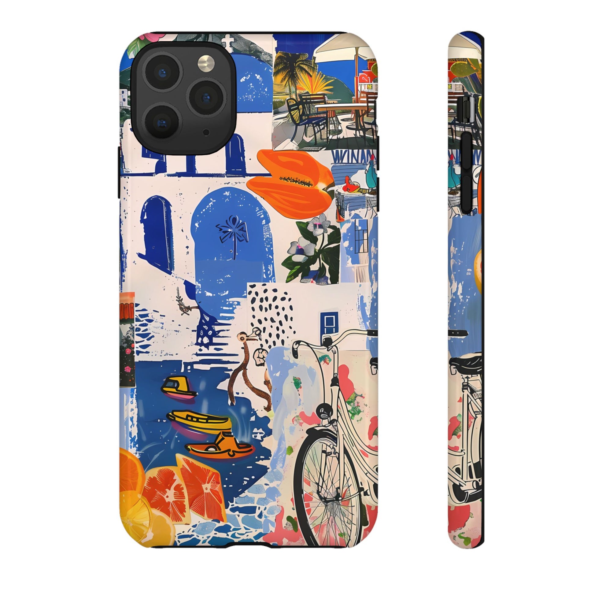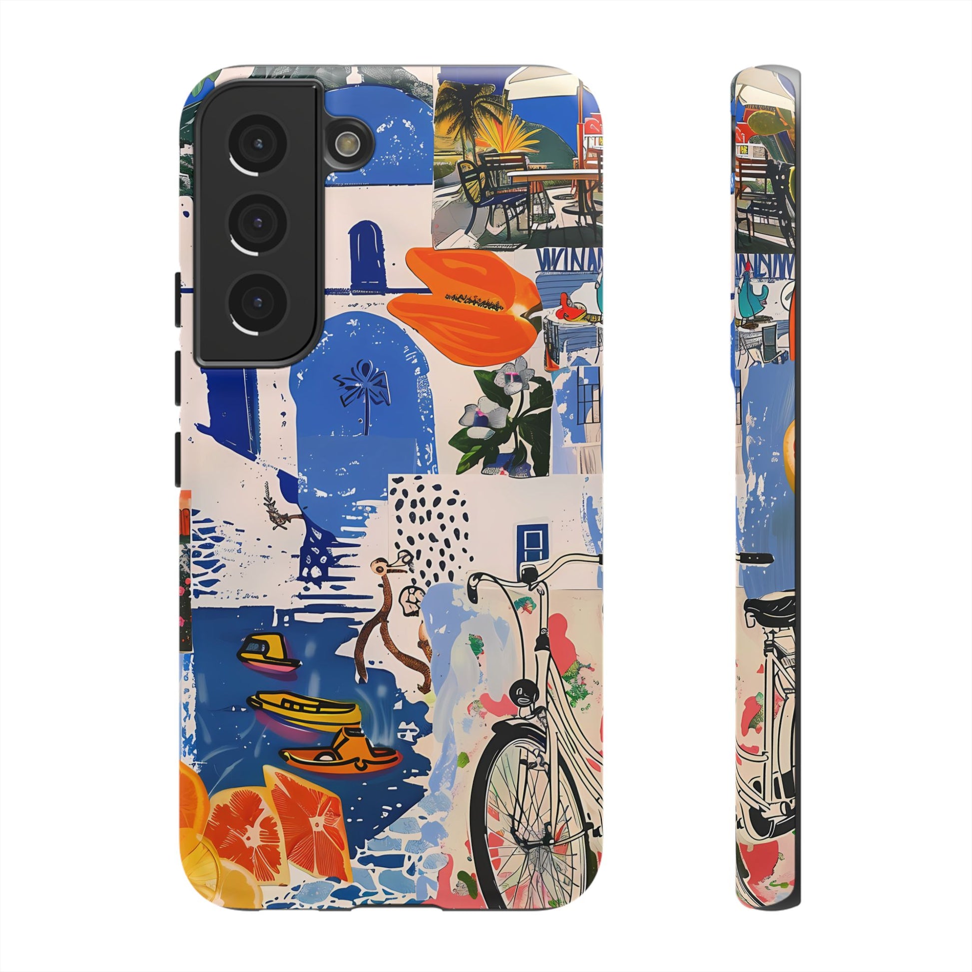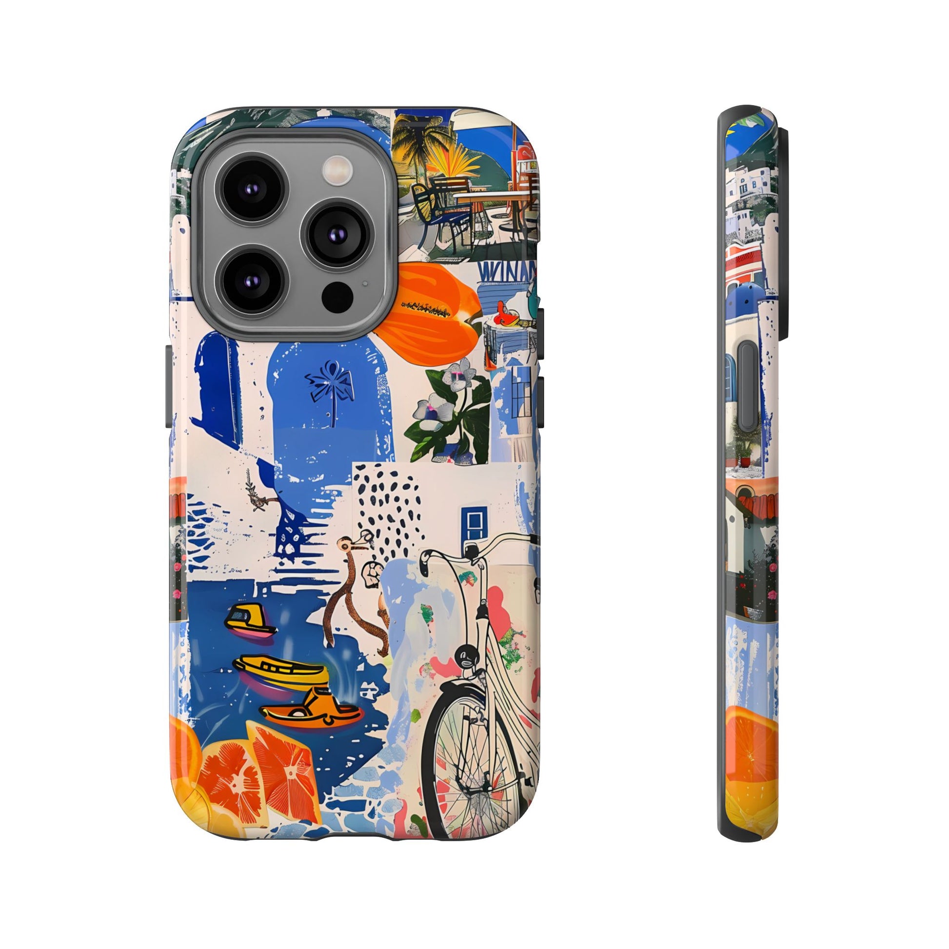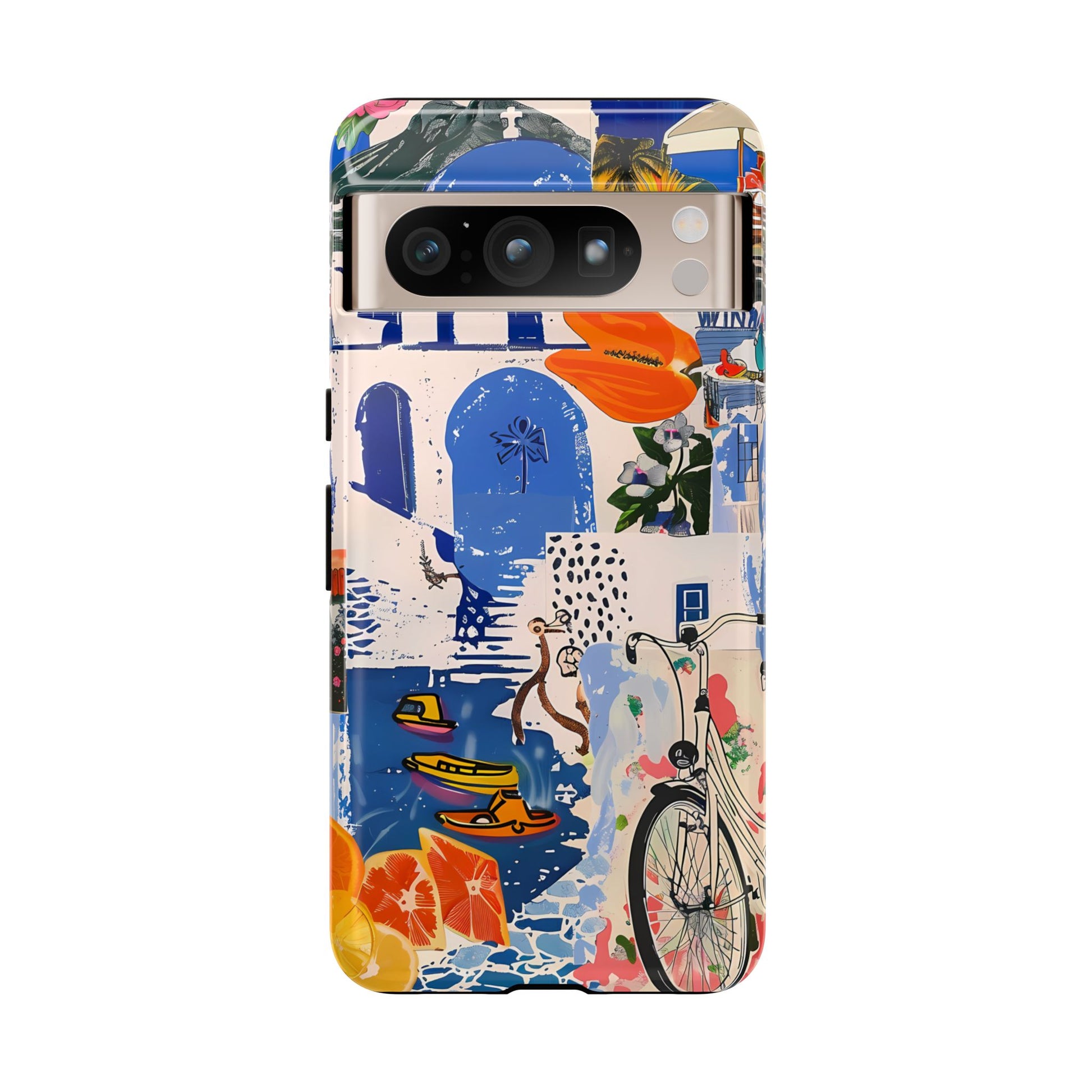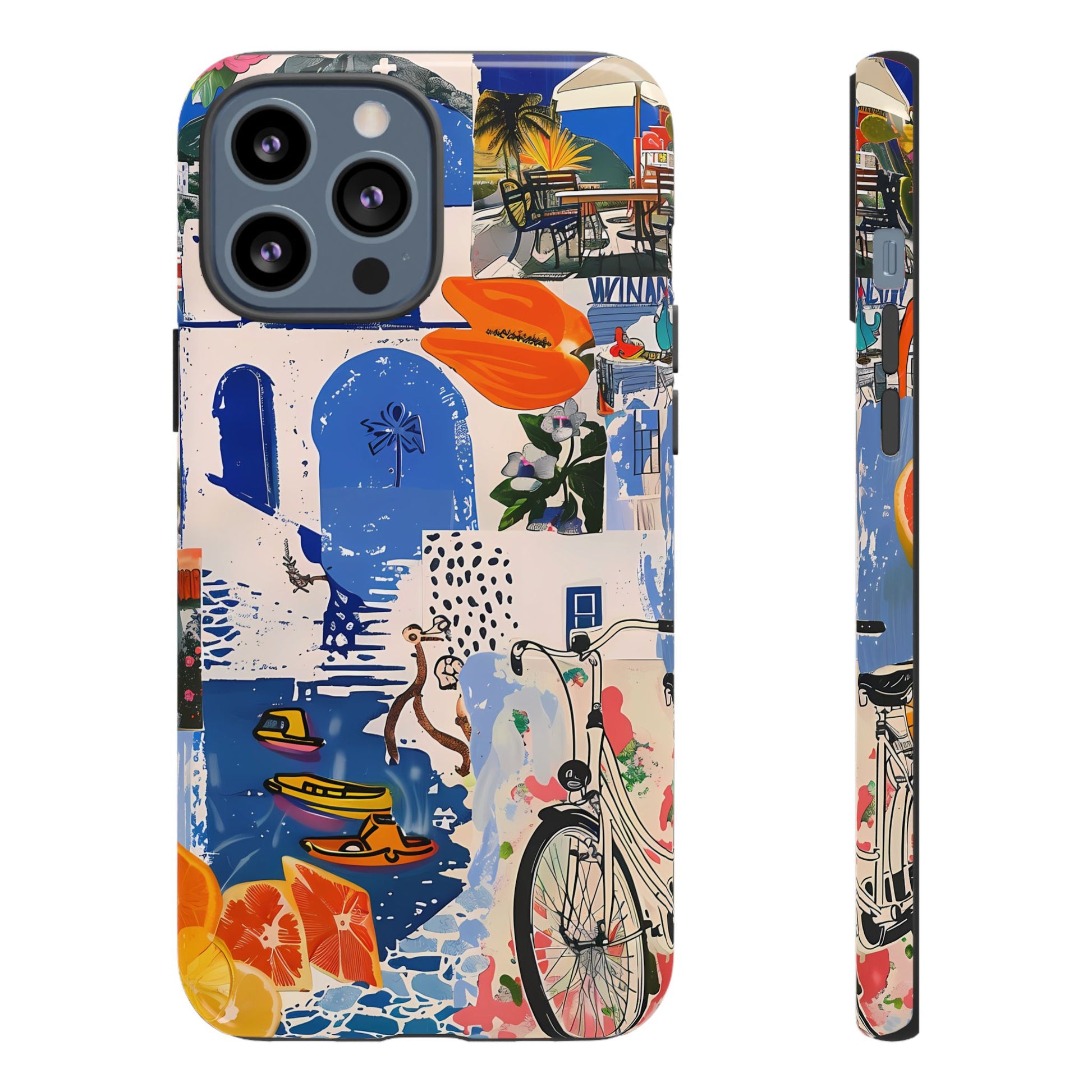 Experience the romance of Santorini with our Santorini Serenade Cover. This captivating collage showcases iconic Greek island scenes, featuring vintage images of blue-domed churches, winding cobblestone streets, and breathtaking cliffside views. Embrace the allure of the Aegean and adorn your phone with the beauty of Santorini