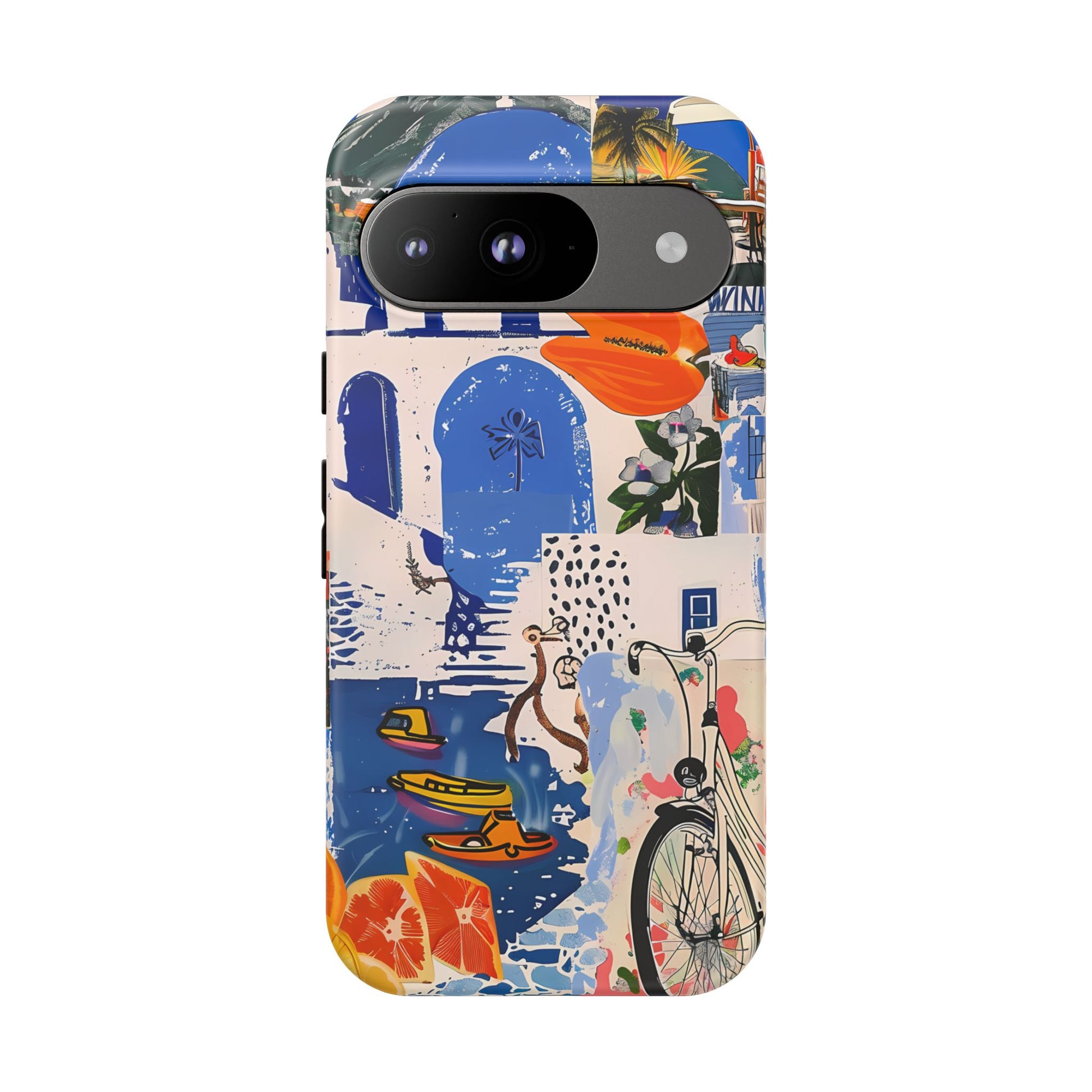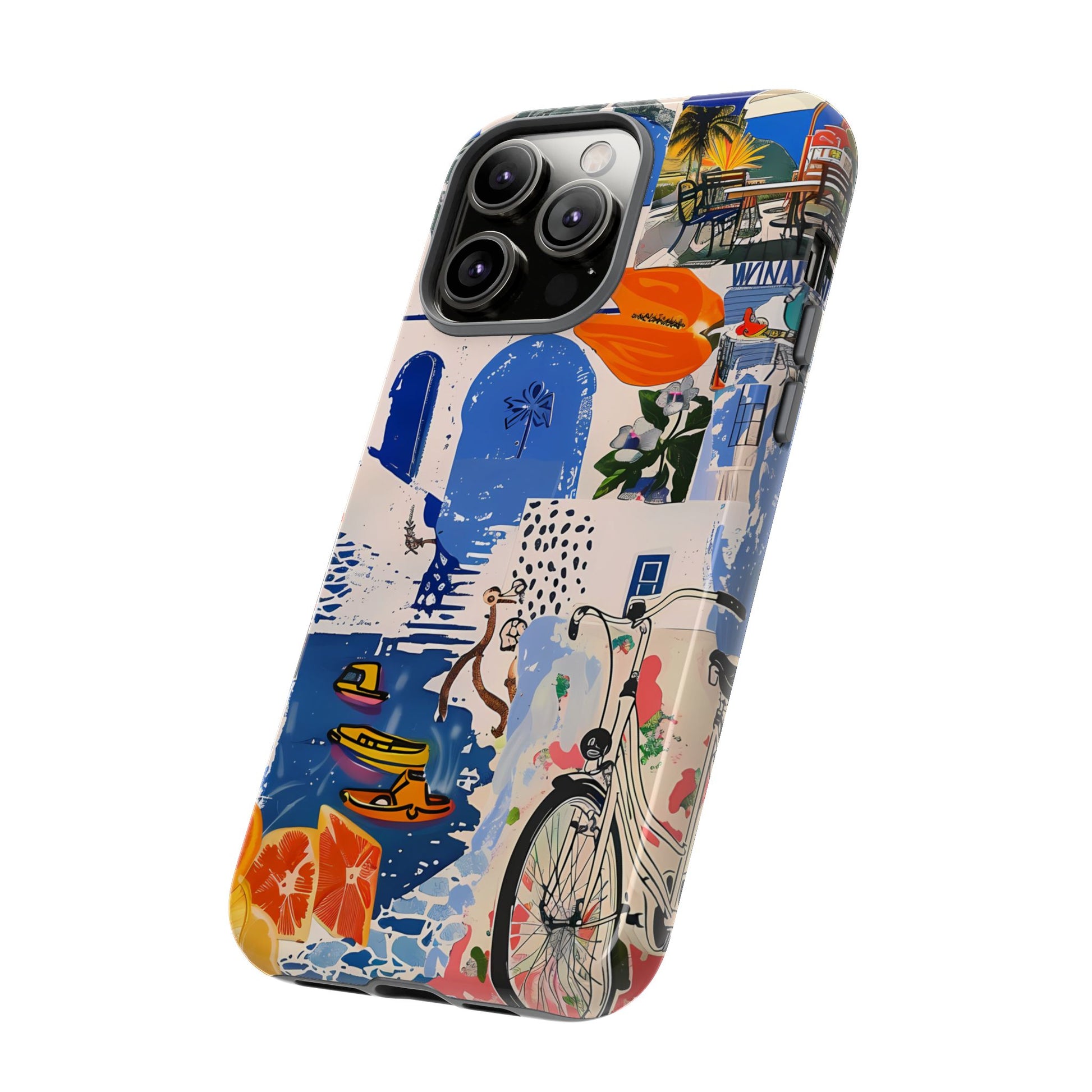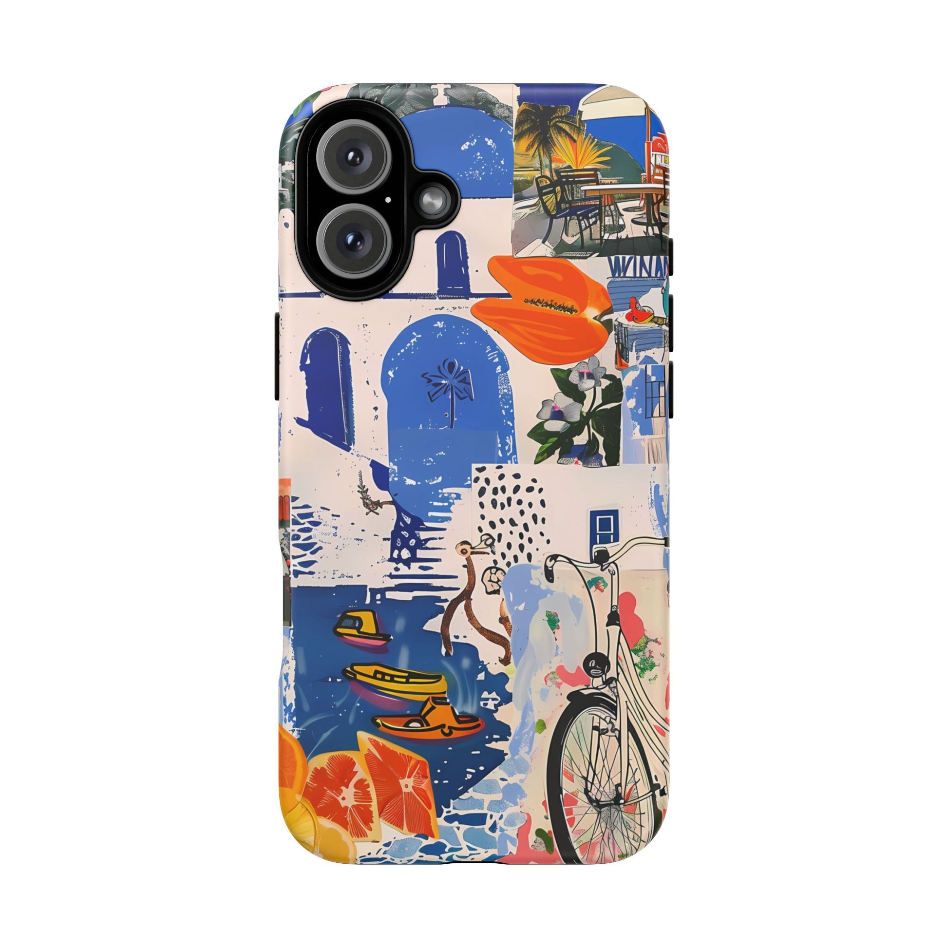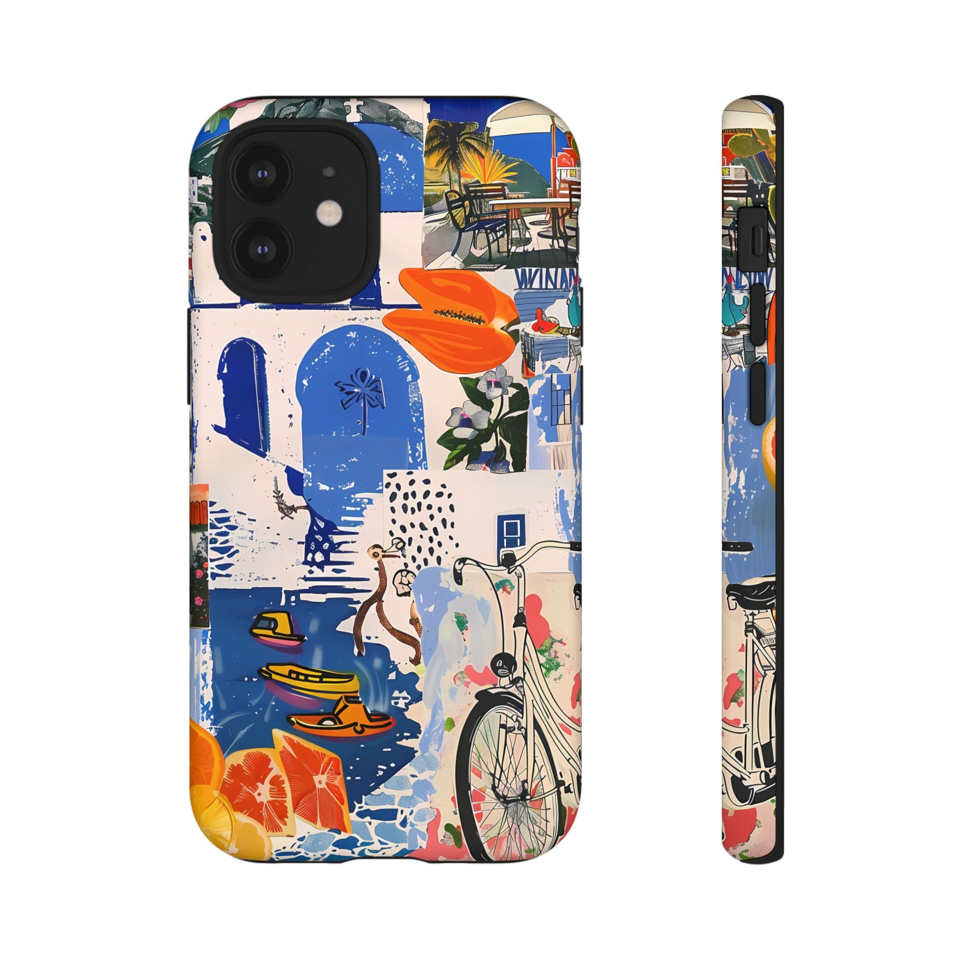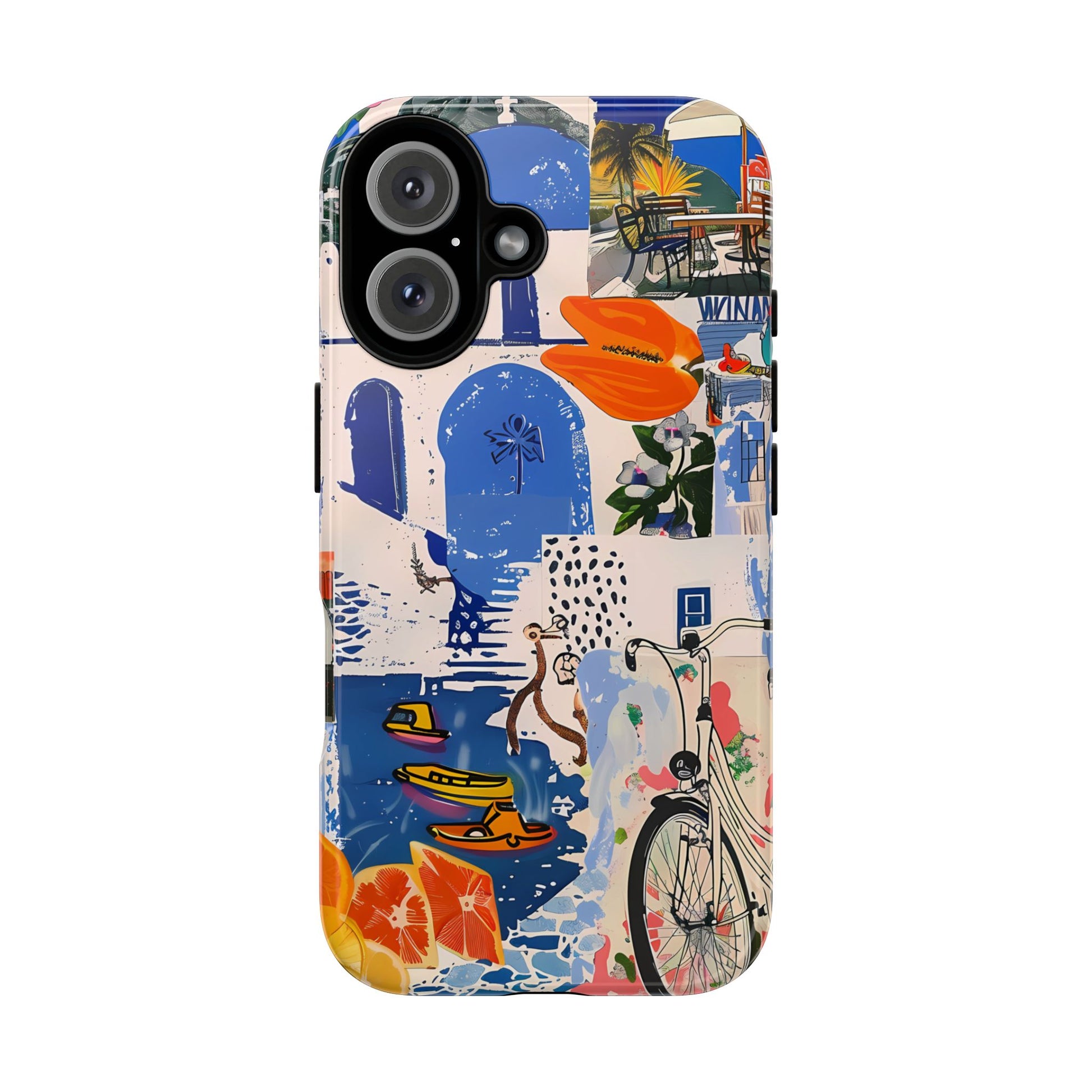Experience the romance of Santorini with our Santorini Serenade Cover. This captivating collage showcases iconic Greek island scenes, featuring vintage images of blue-domed churches, winding cobblestone streets, and breathtaking cliffside views. Embrace the allure of the Aegean and adorn your phone with the beauty of Santorini