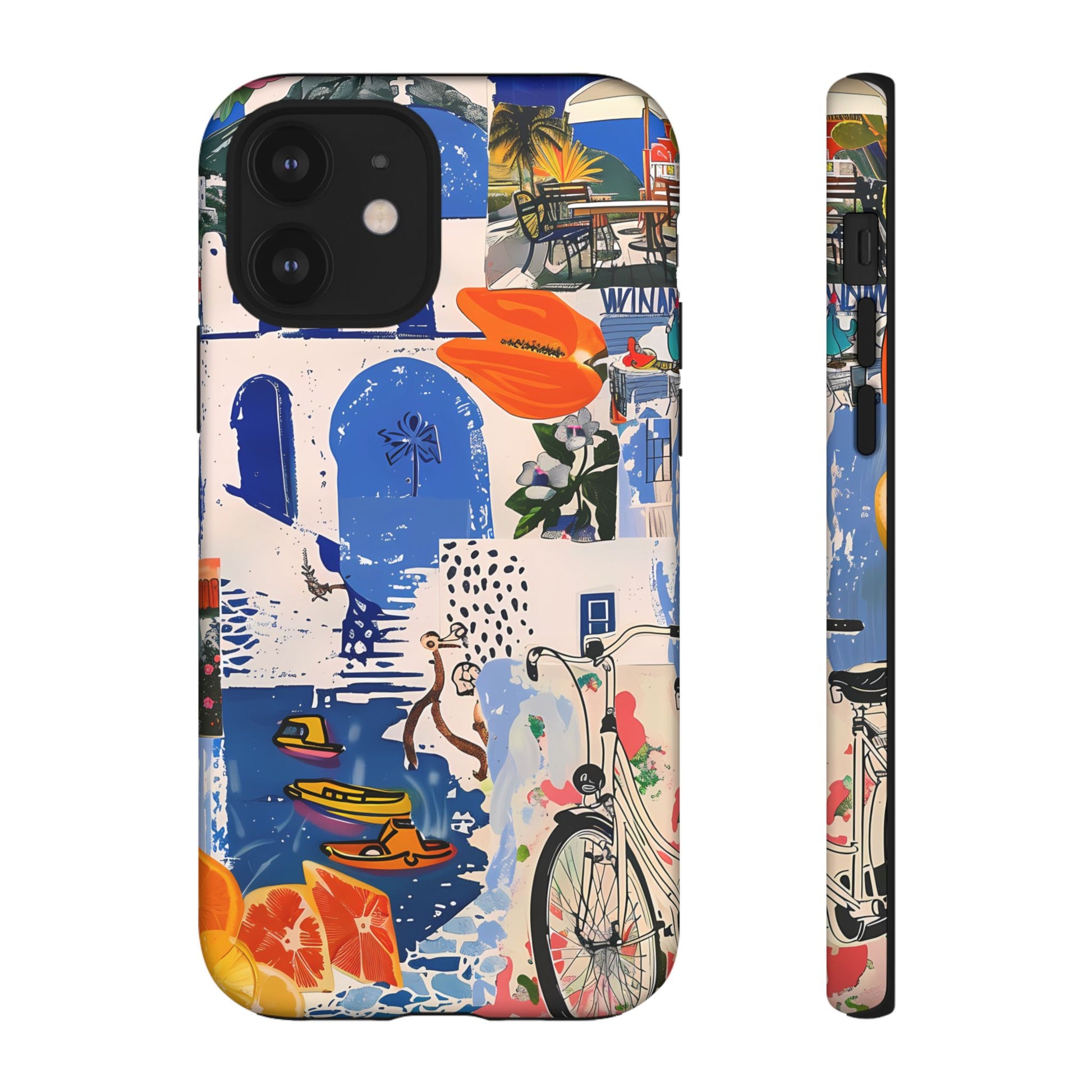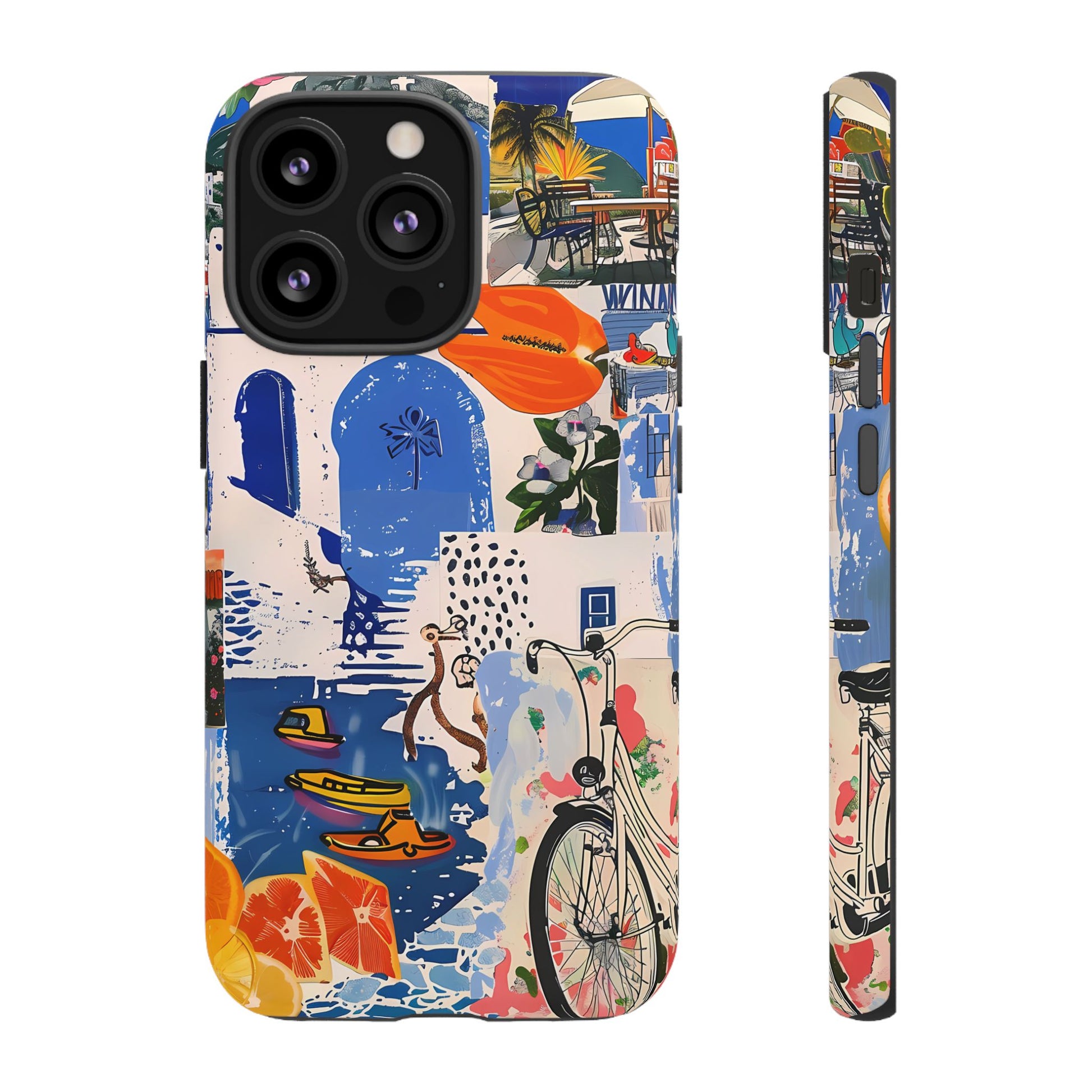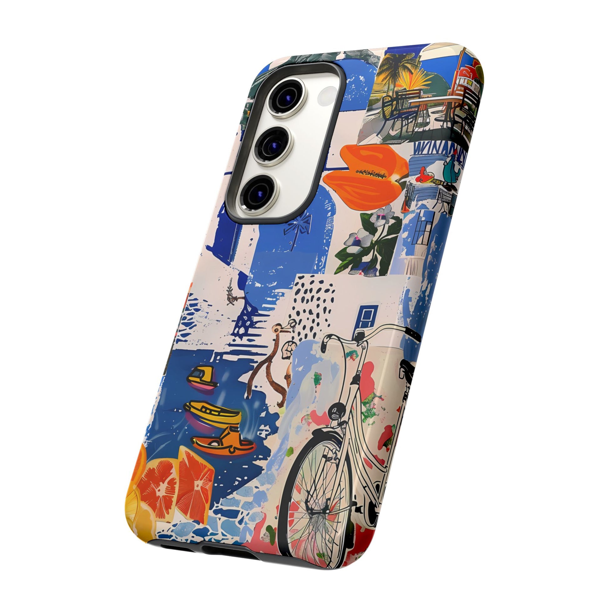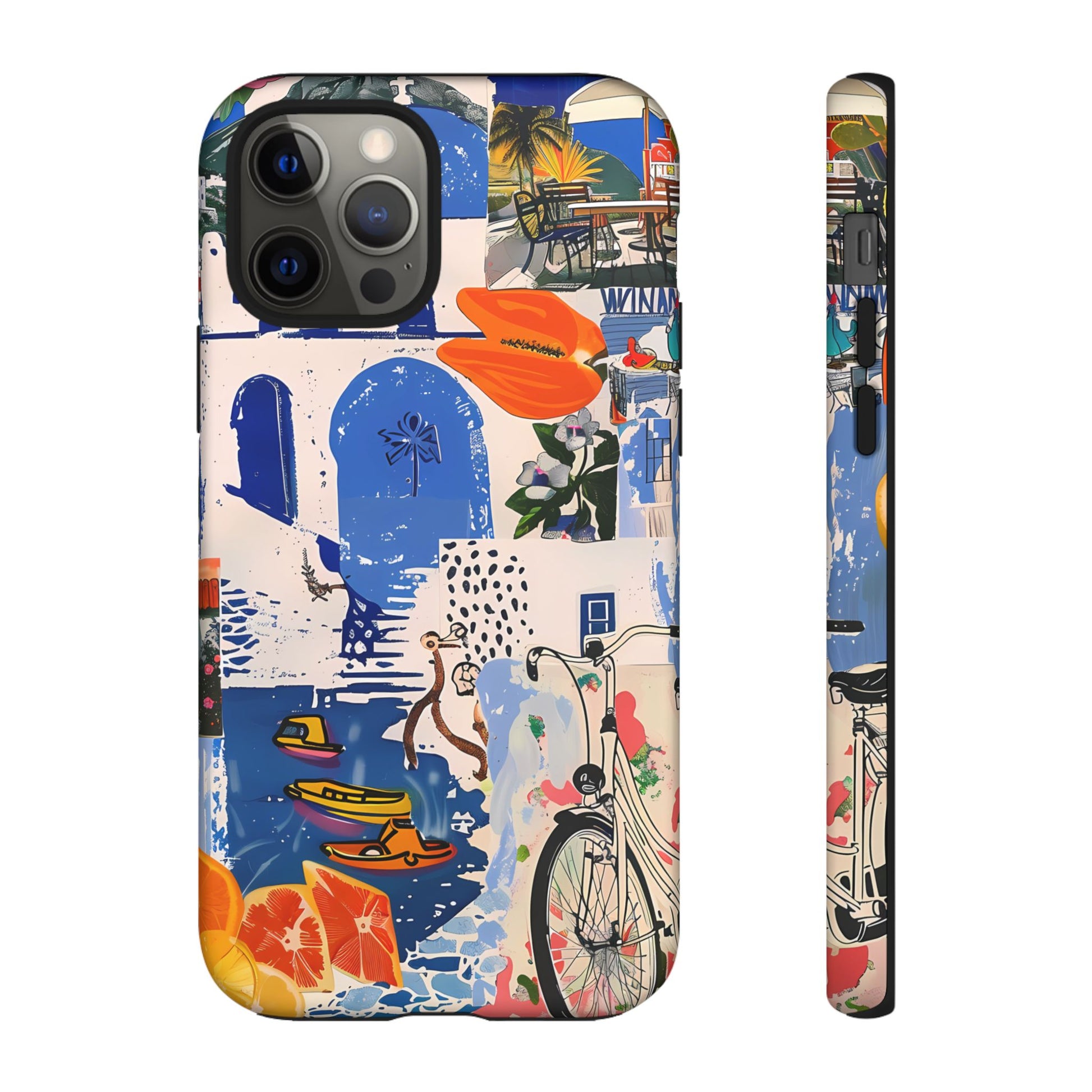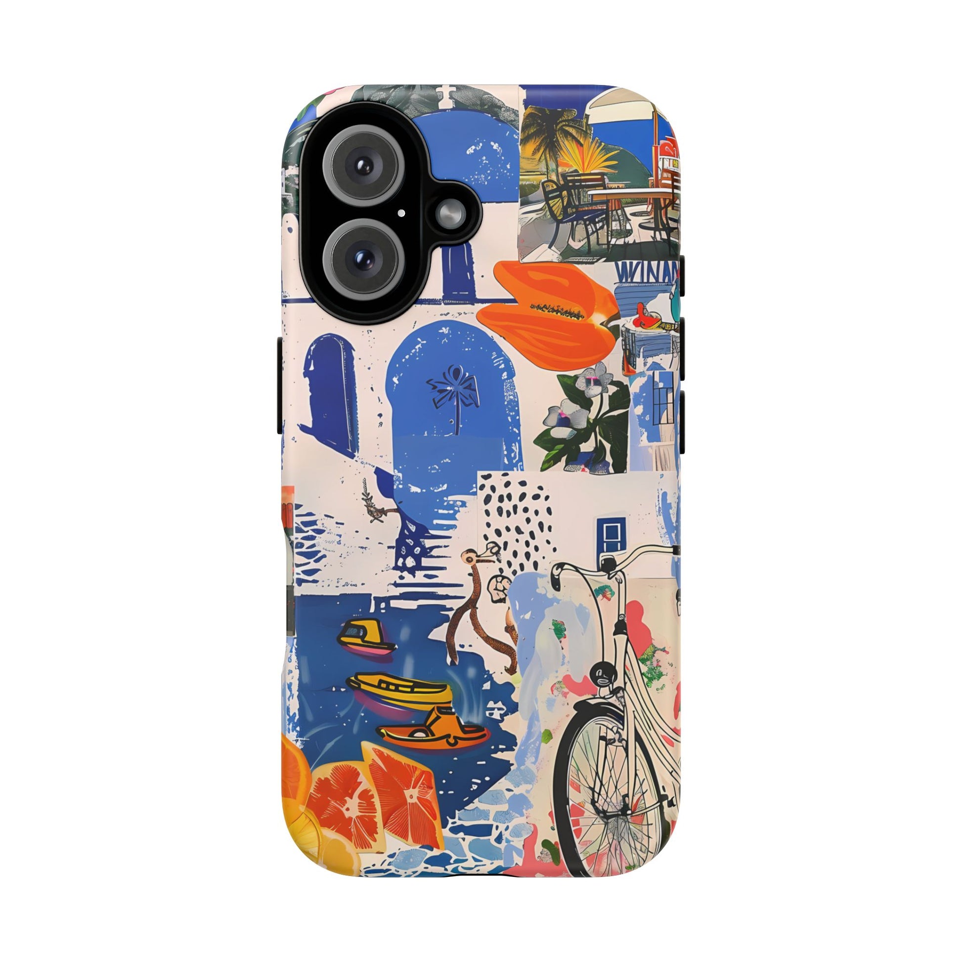 Experience the romance of Santorini with our Santorini Serenade Cover. This captivating collage showcases iconic Greek island scenes, featuring vintage images of blue-domed churches, winding cobblestone streets, and breathtaking cliffside views. Embrace the allure of the Aegean and adorn your phone with the beauty of Santorini