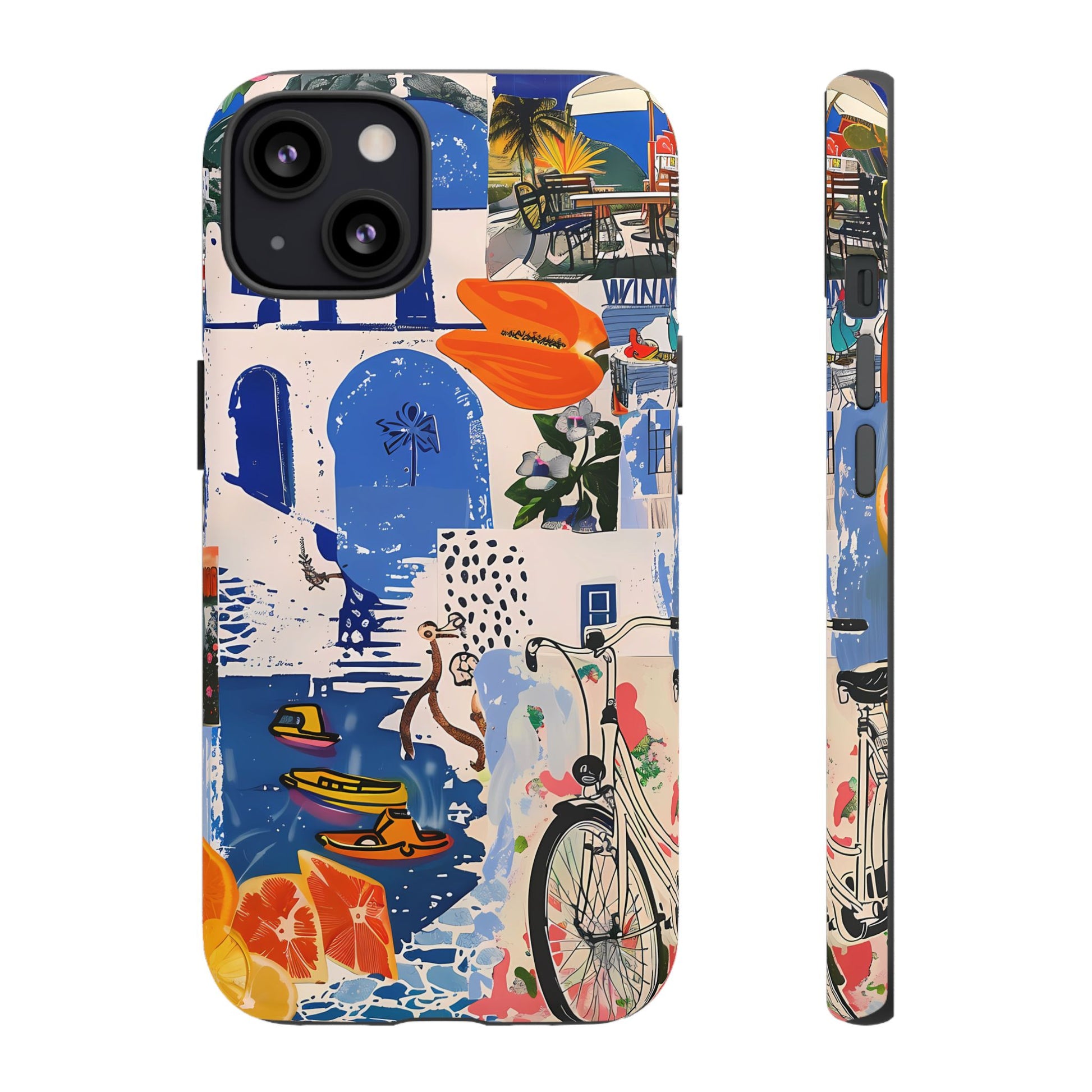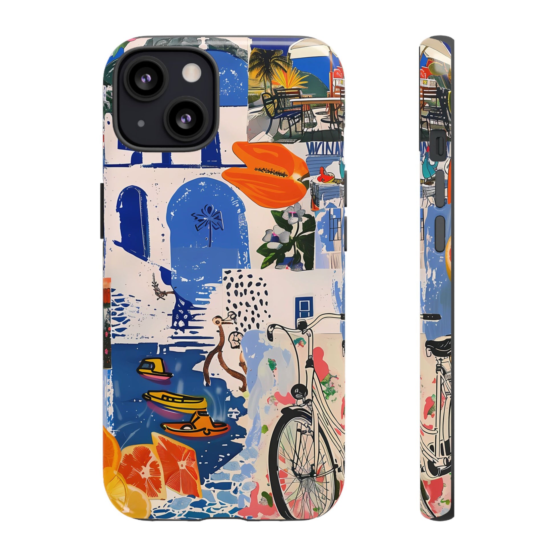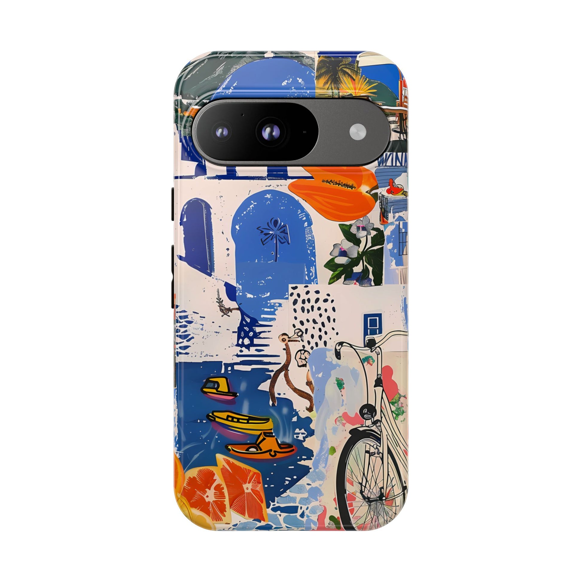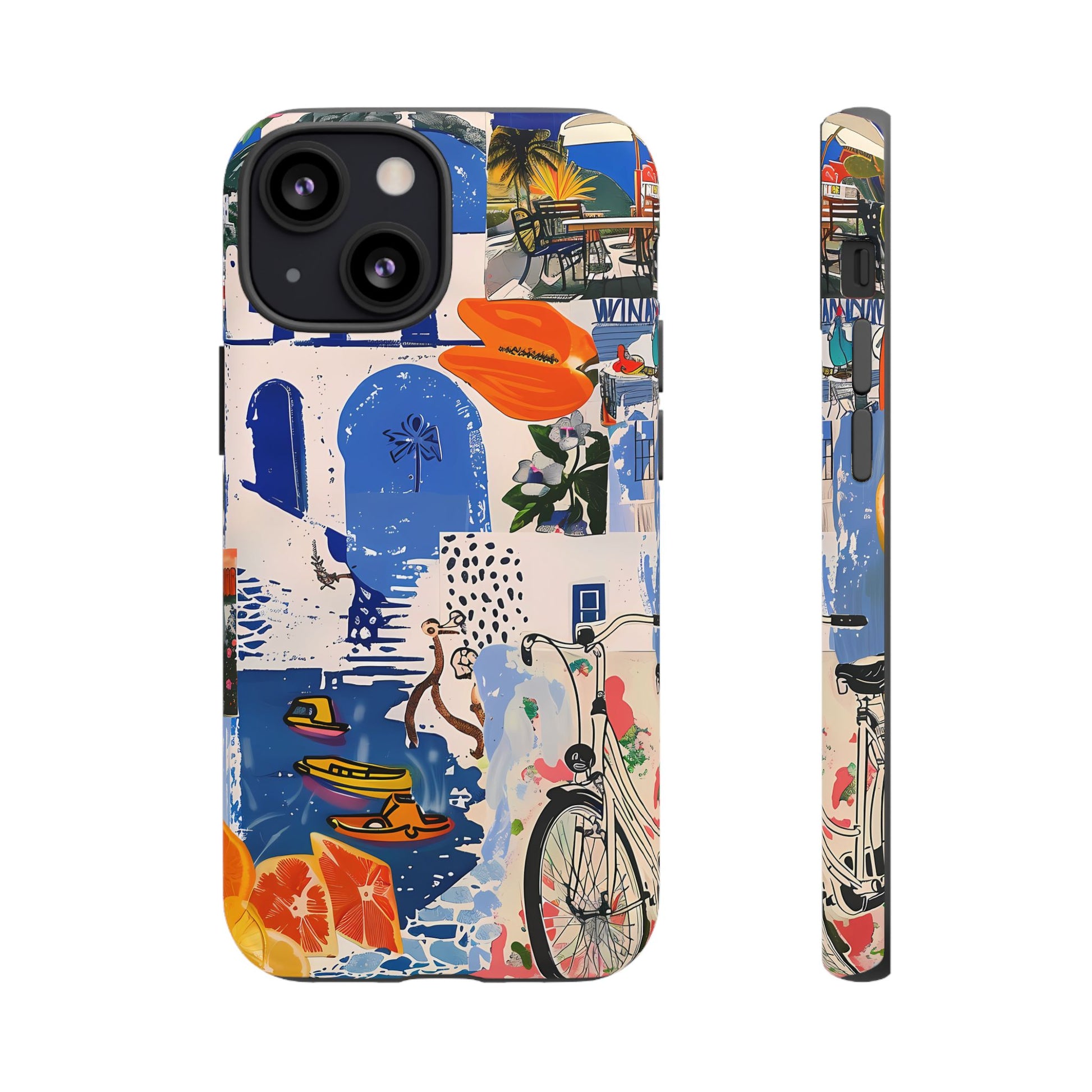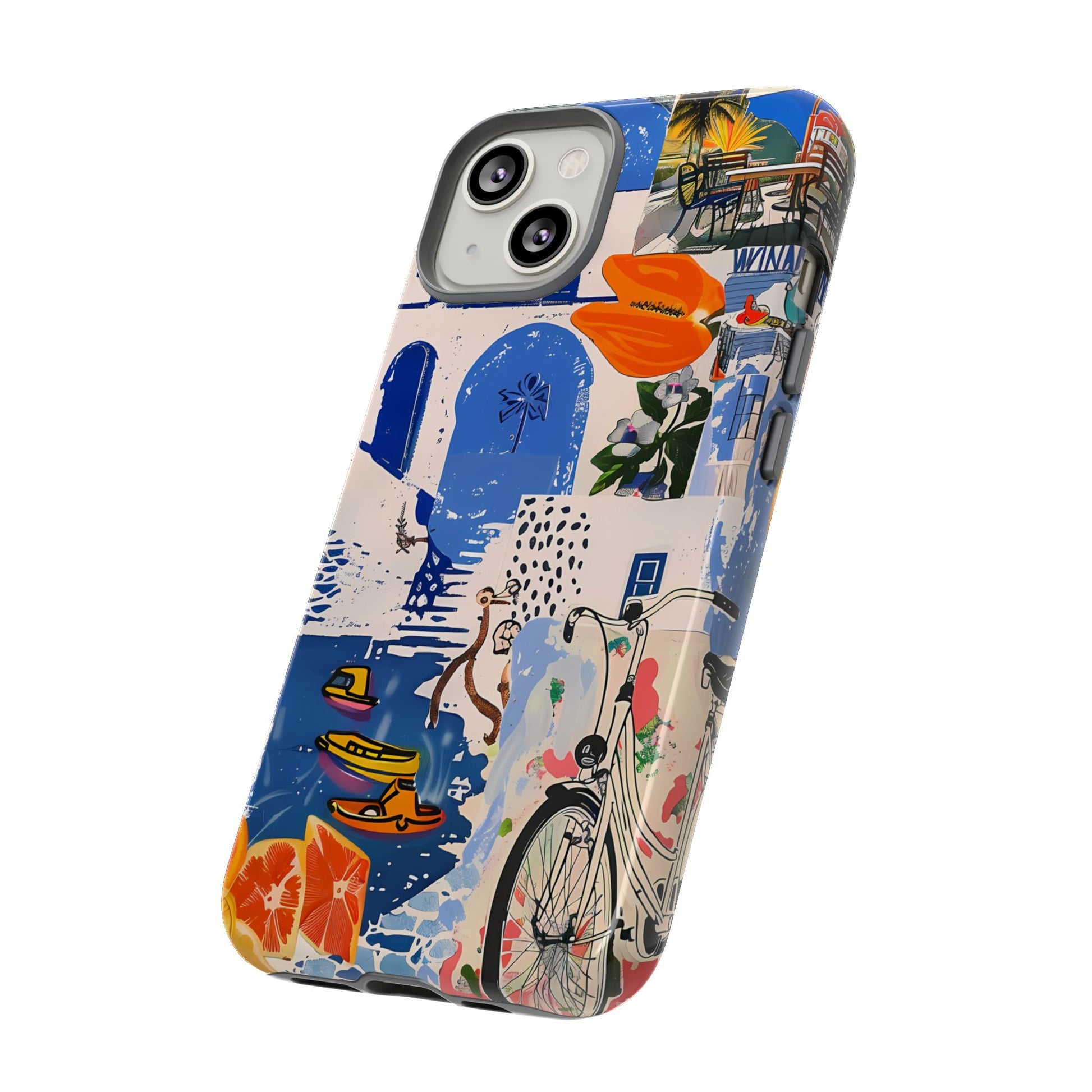 Experience the romance of Santorini with our Santorini Serenade Cover. This captivating collage showcases iconic Greek island scenes, featuring vintage images of blue-domed churches, winding cobblestone streets, and breathtaking cliffside views. Embrace the allure of the Aegean and adorn your phone with the beauty of Santorini