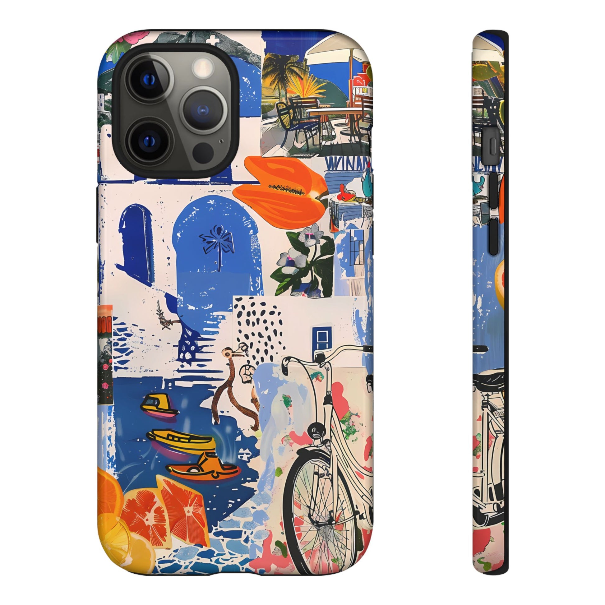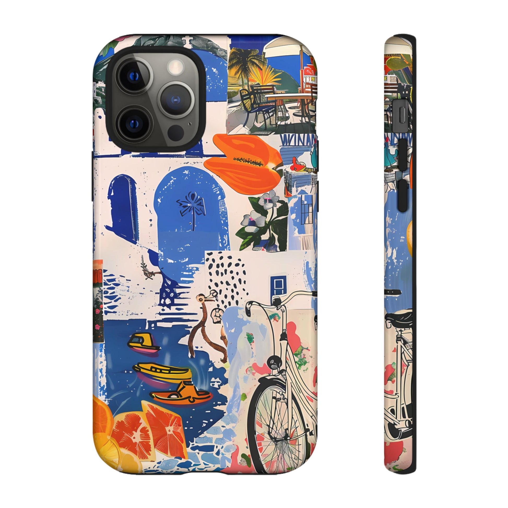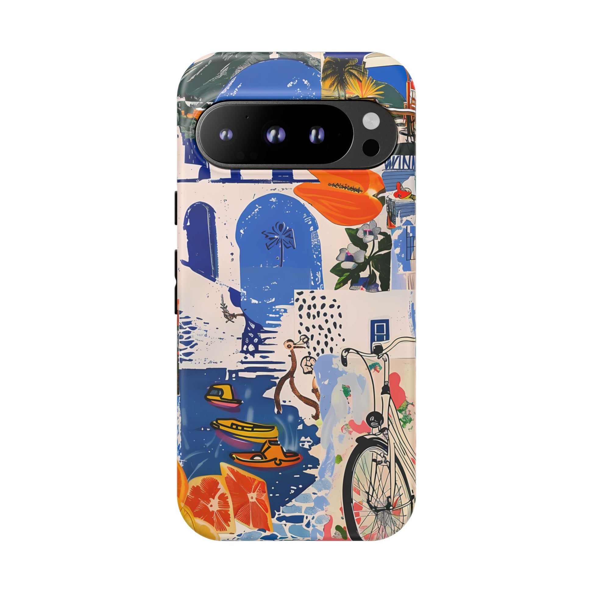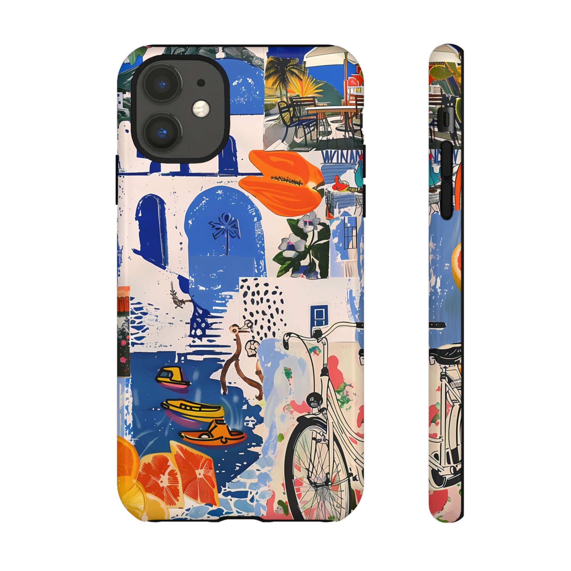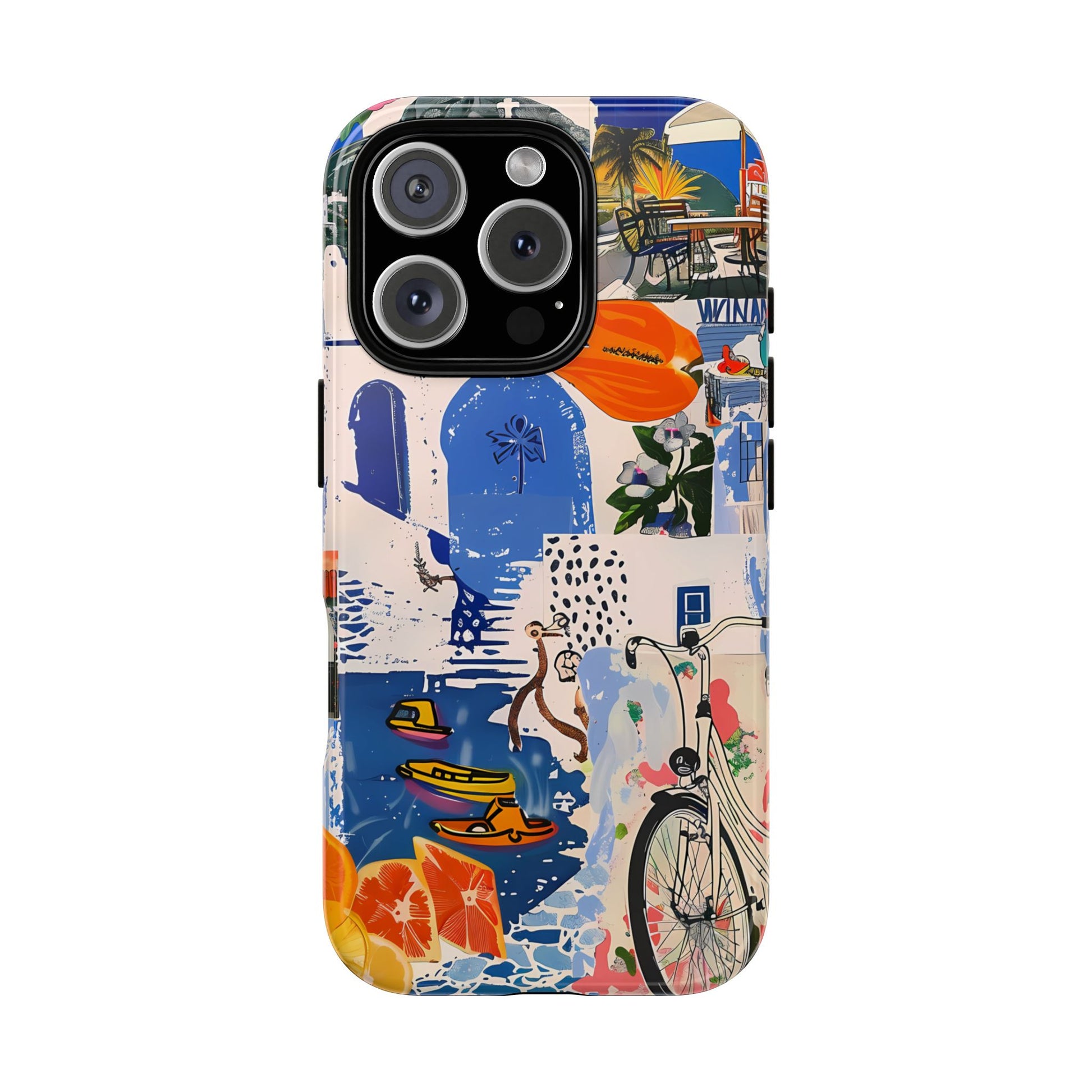 Experience the romance of Santorini with our Santorini Serenade Cover. This captivating collage showcases iconic Greek island scenes, featuring vintage images of blue-domed churches, winding cobblestone streets, and breathtaking cliffside views. Embrace the allure of the Aegean and adorn your phone with the beauty of Santorini