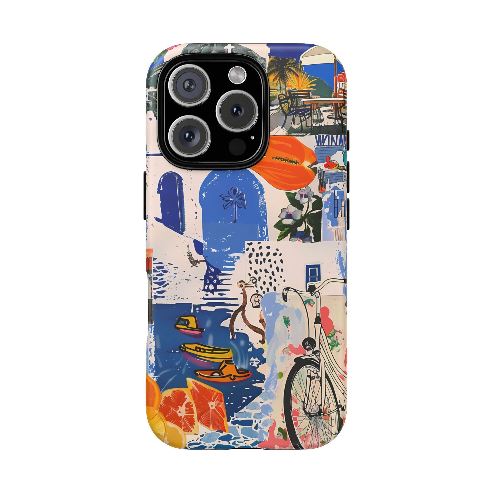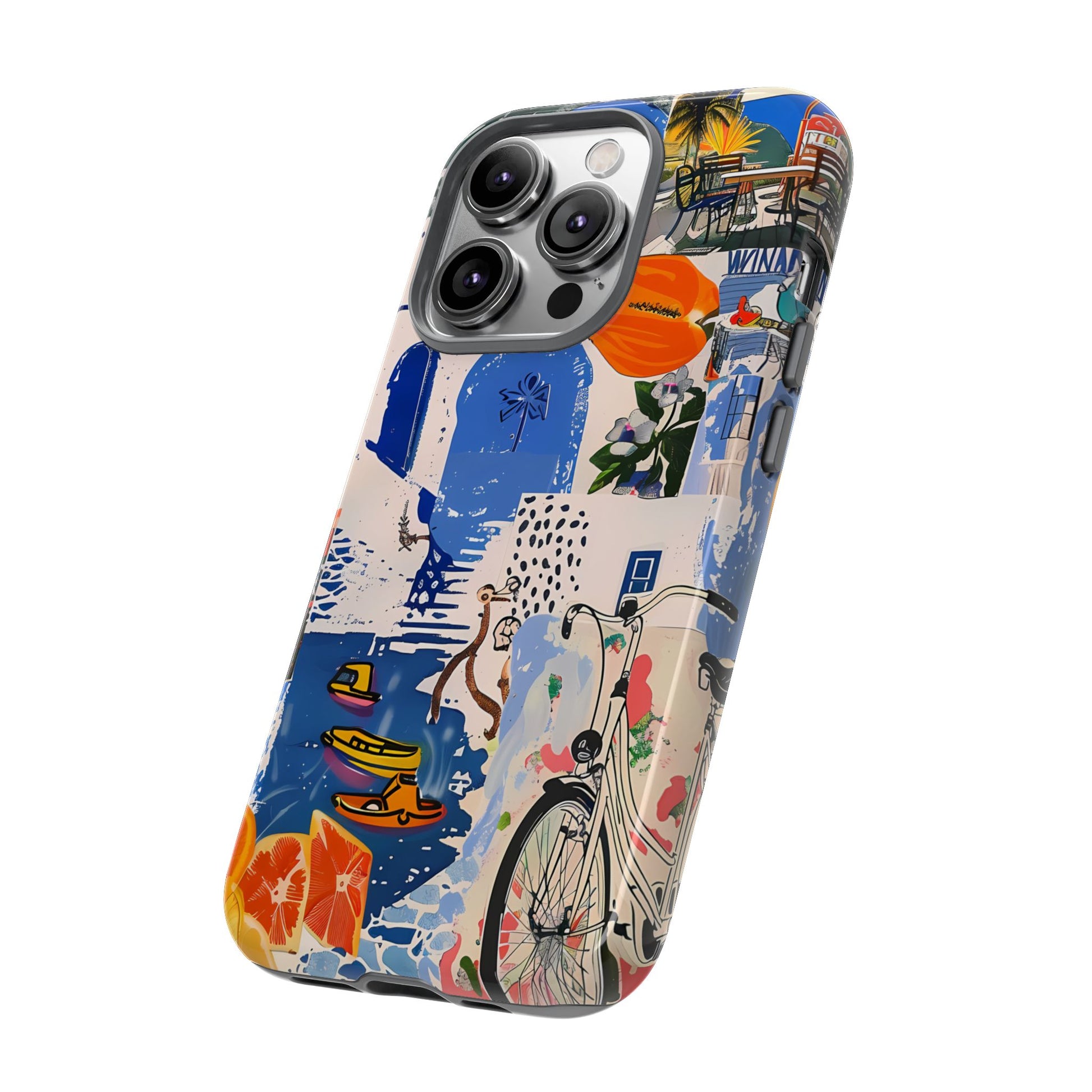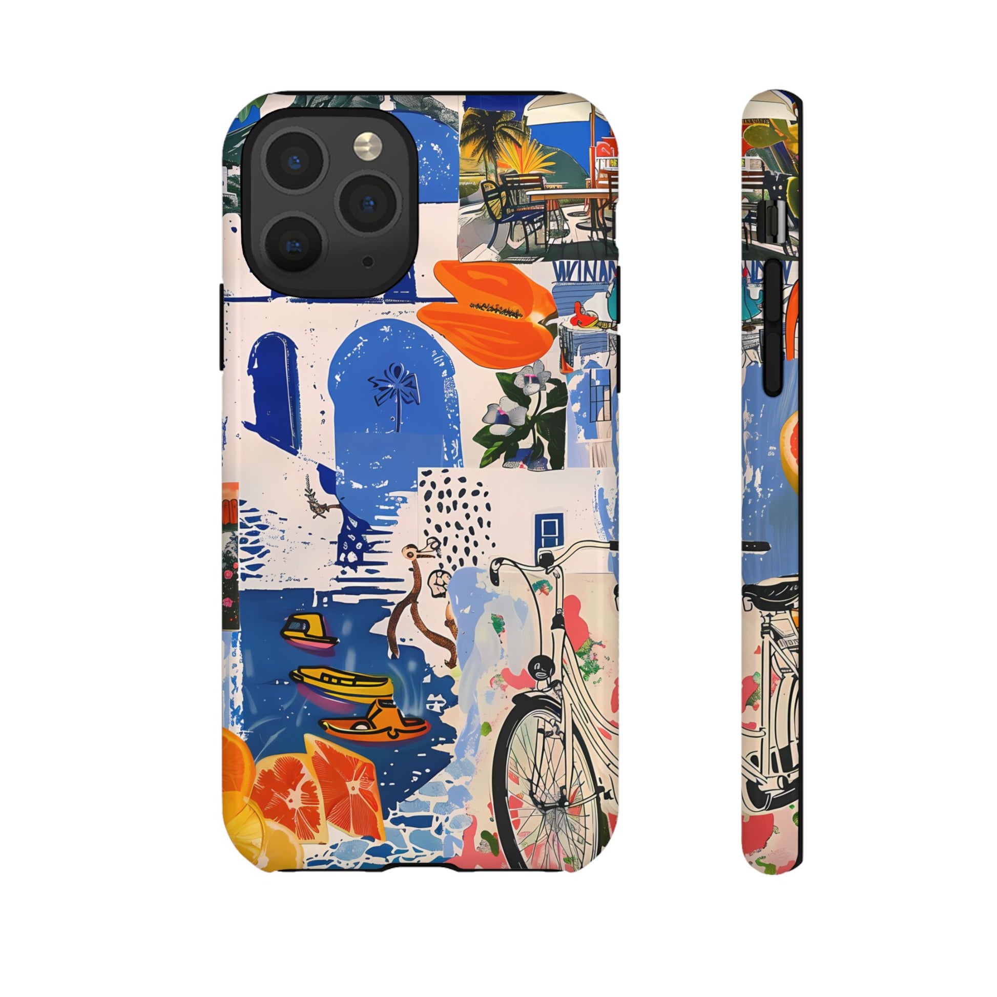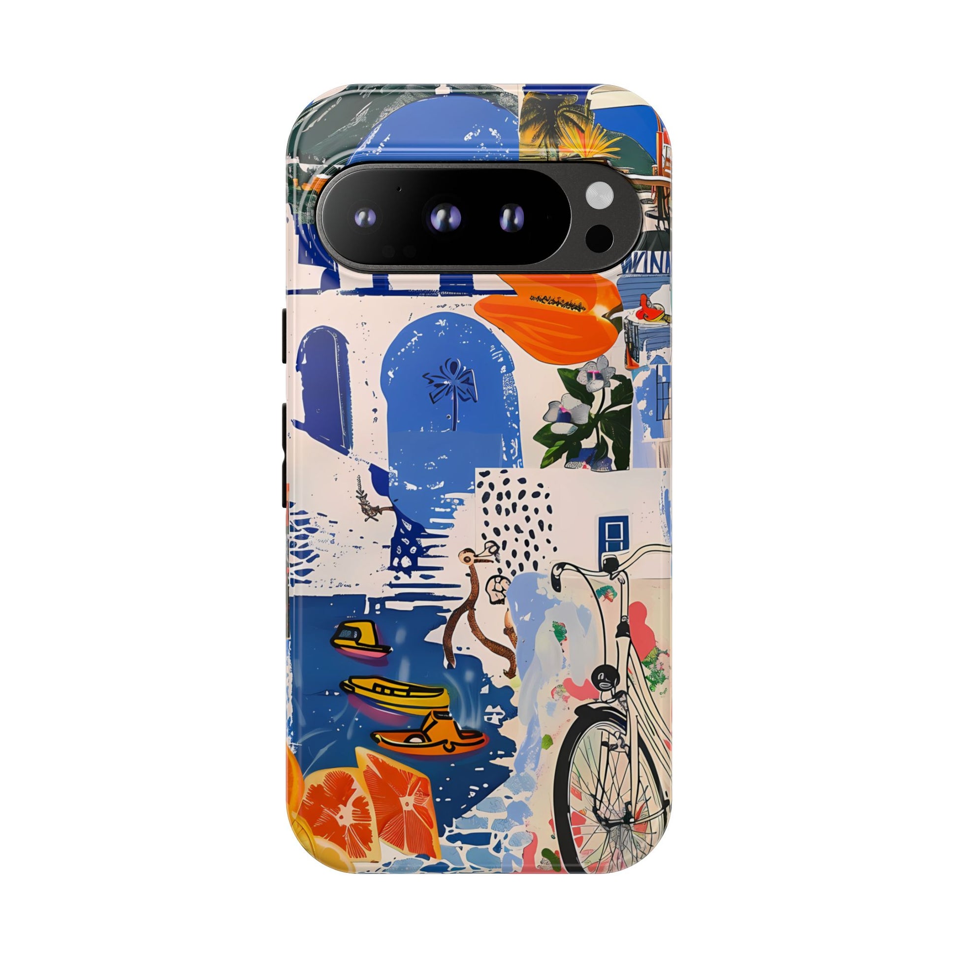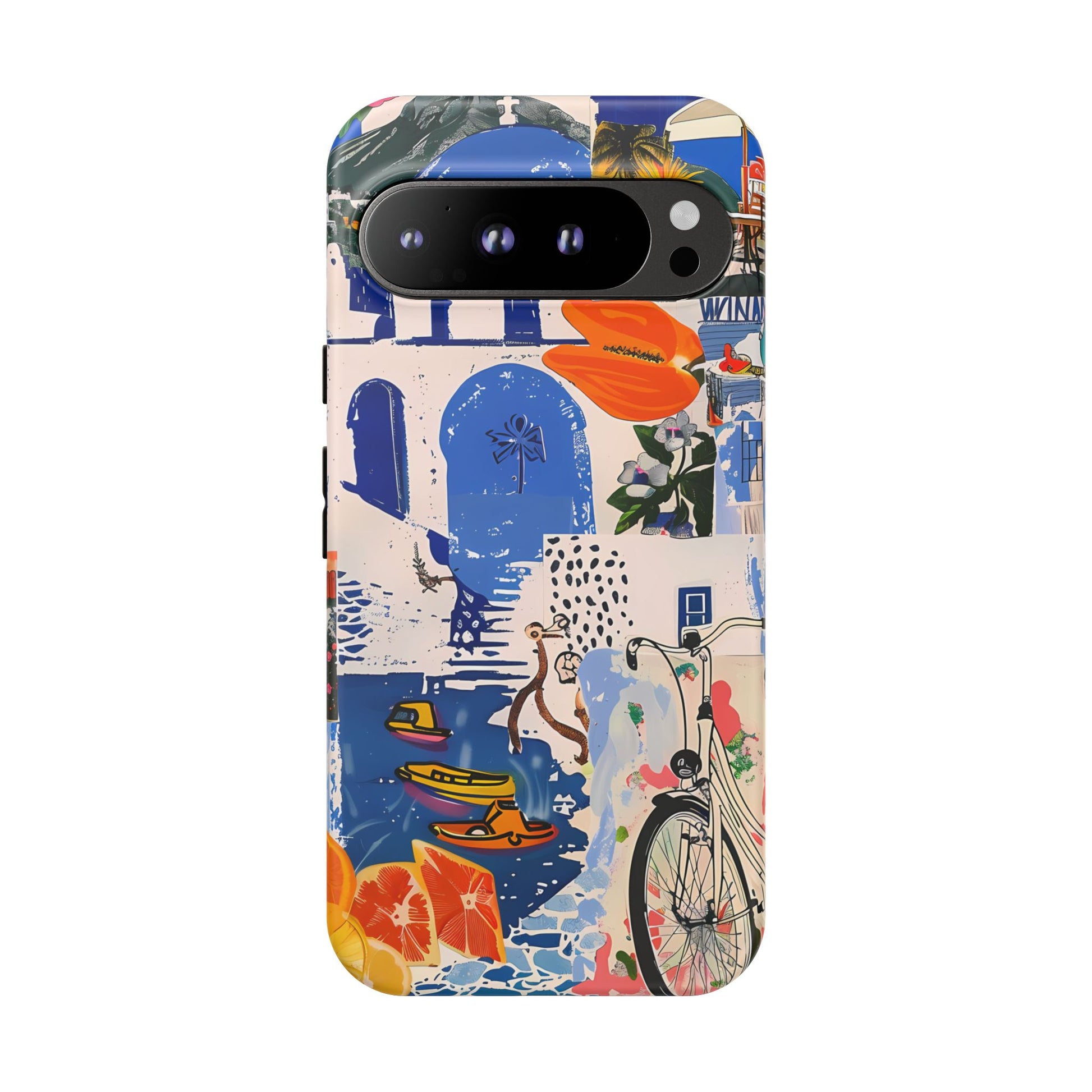 Experience the romance of Santorini with our Santorini Serenade Cover. This captivating collage showcases iconic Greek island scenes, featuring vintage images of blue-domed churches, winding cobblestone streets, and breathtaking cliffside views. Embrace the allure of the Aegean and adorn your phone with the beauty of Santorini