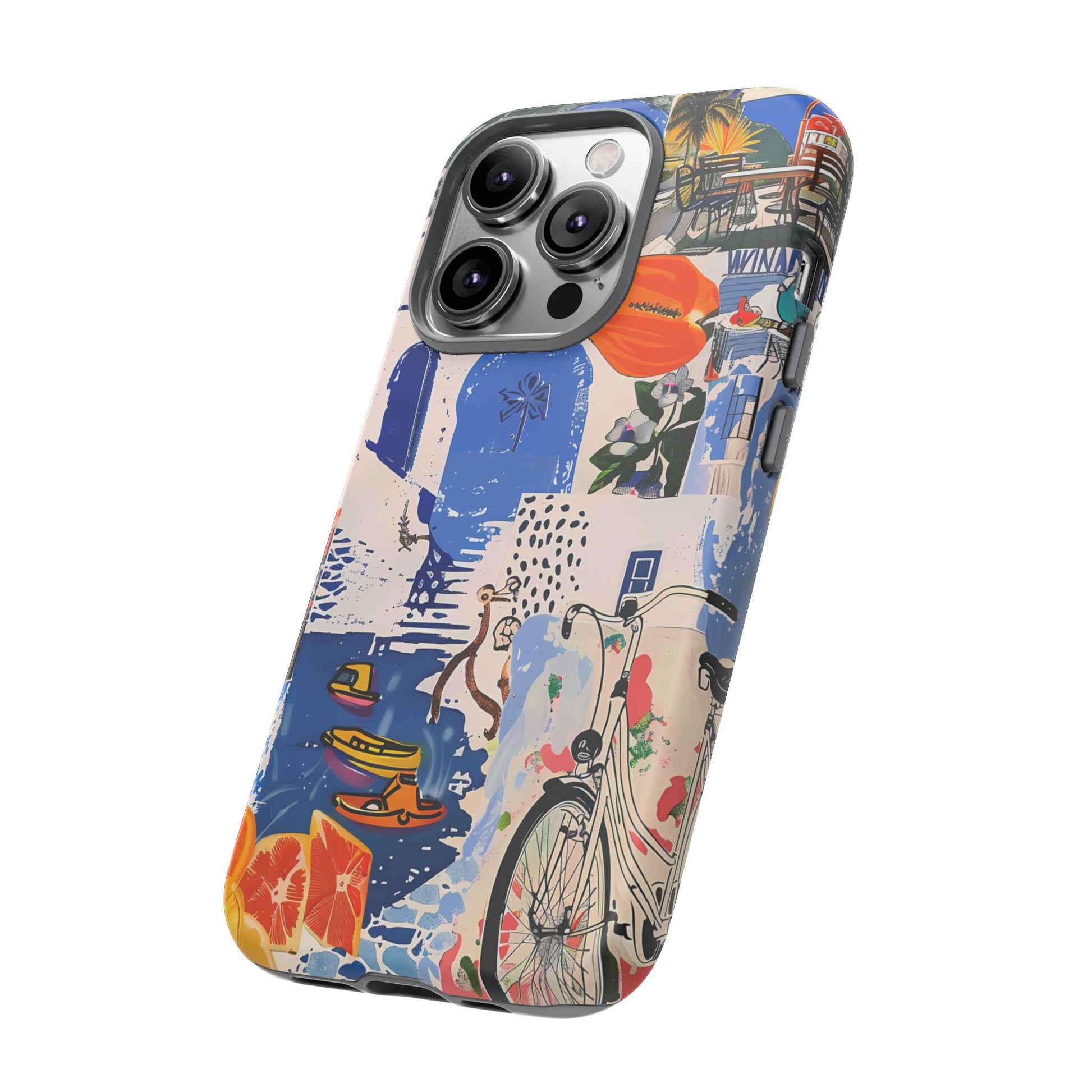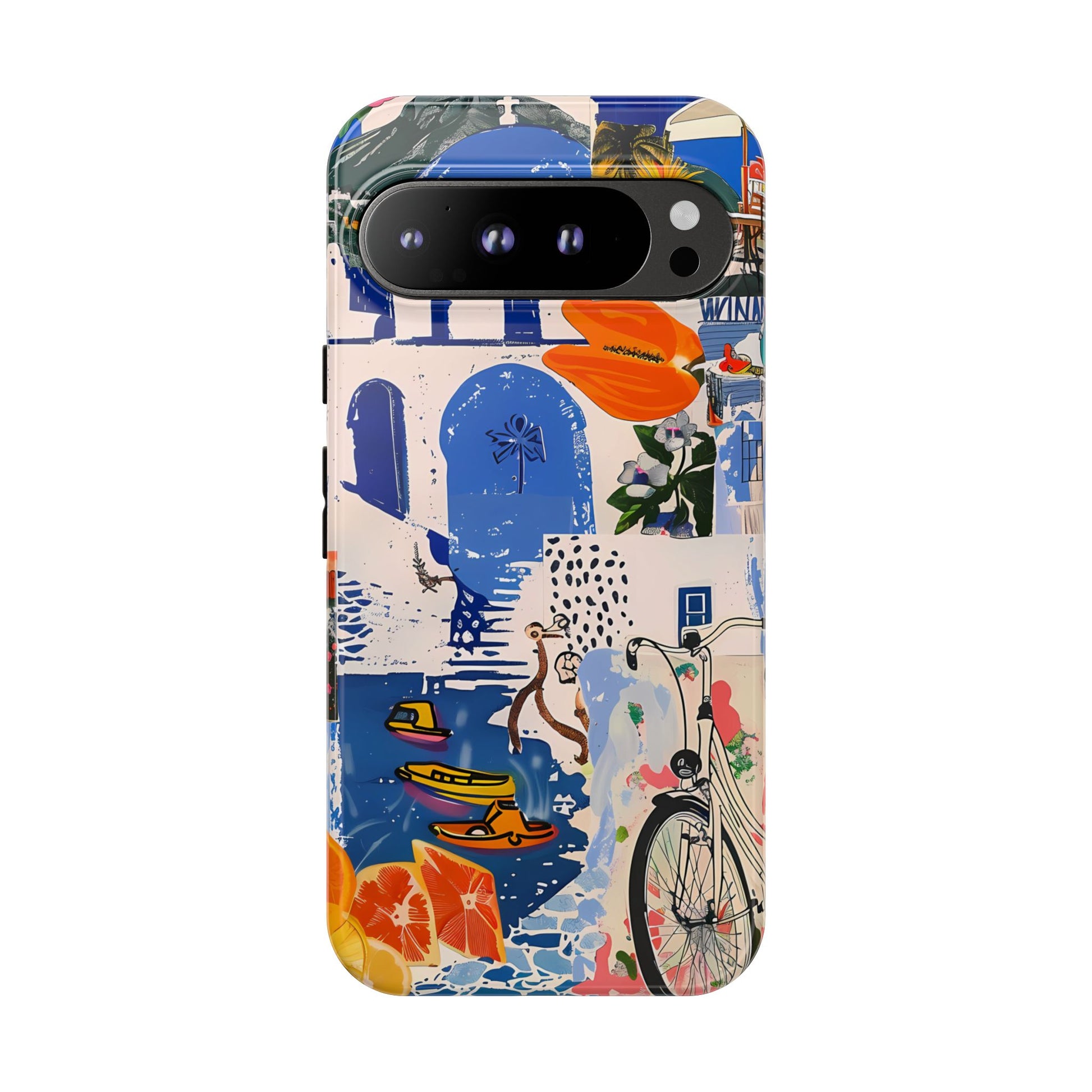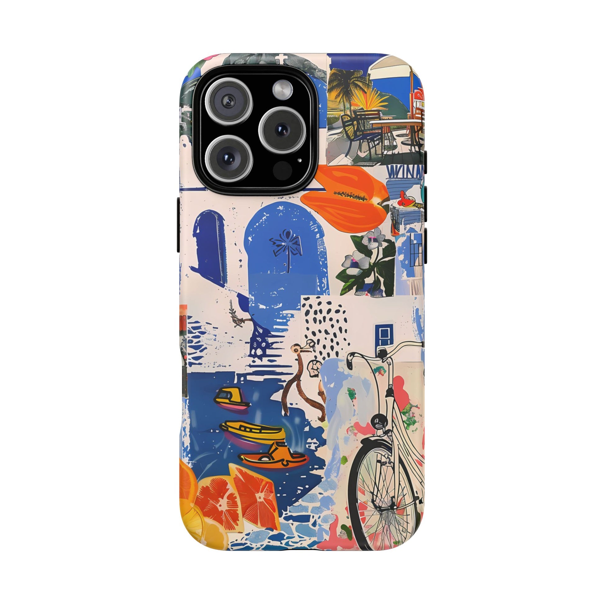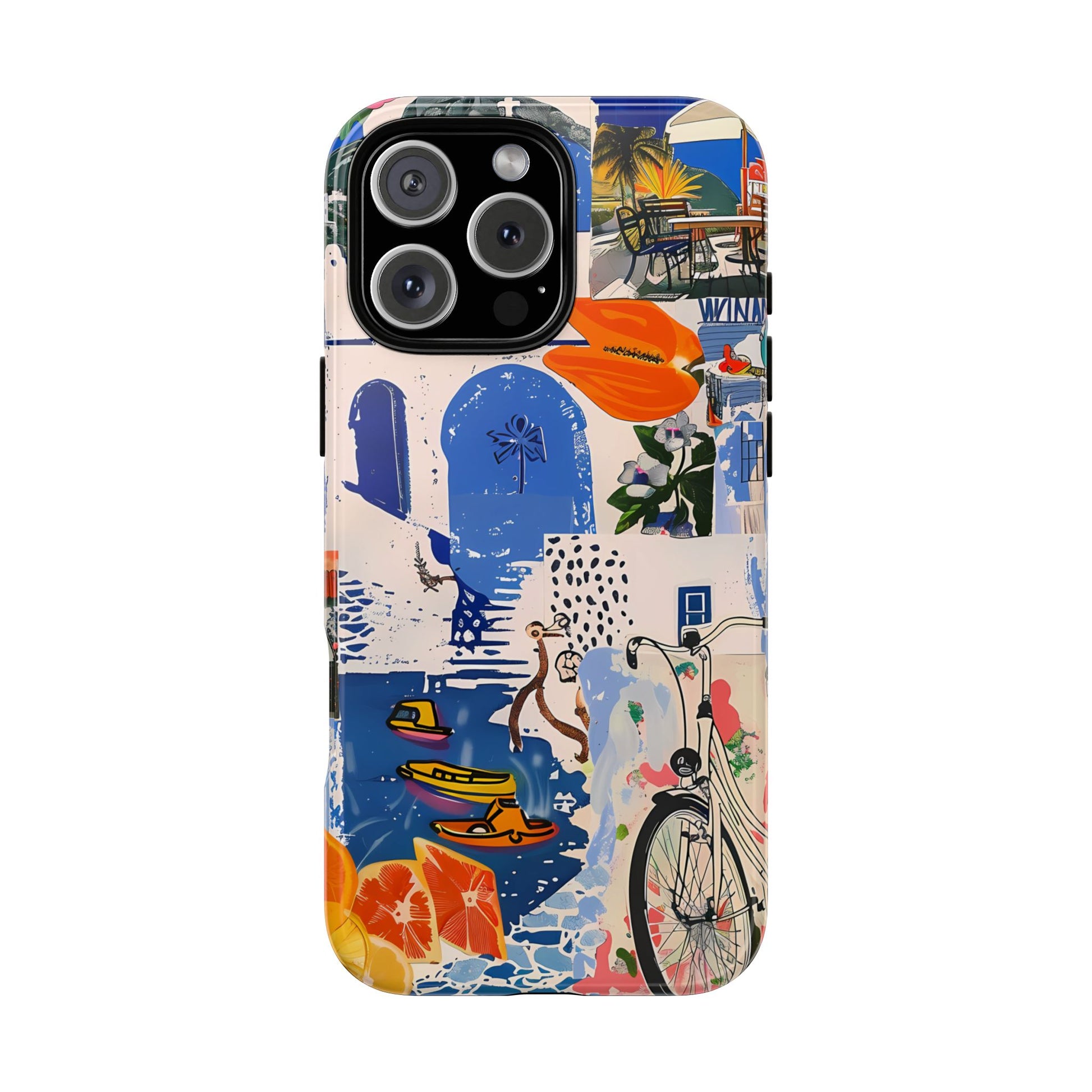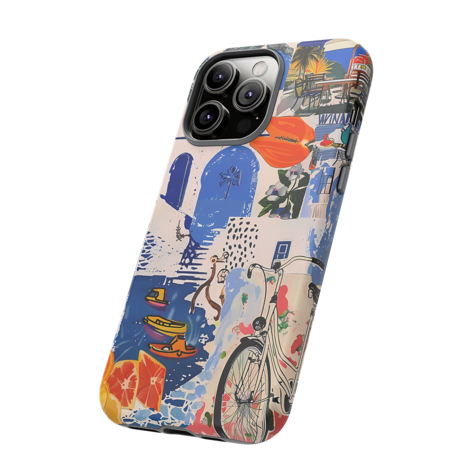 Experience the romance of Santorini with our Santorini Serenade Cover. This captivating collage showcases iconic Greek island scenes, featuring vintage images of blue-domed churches, winding cobblestone streets, and breathtaking cliffside views. Embrace the allure of the Aegean and adorn your phone with the beauty of Santorini