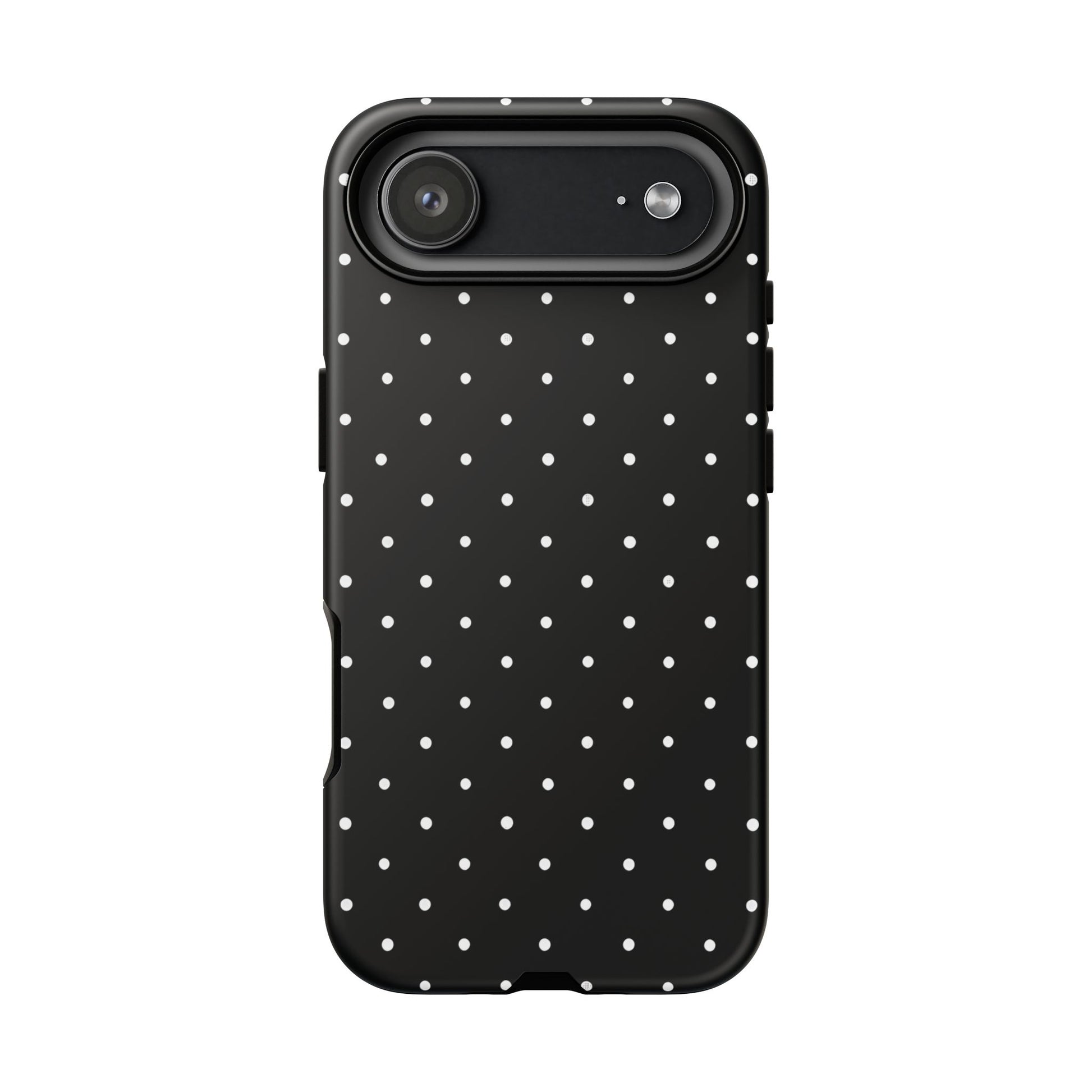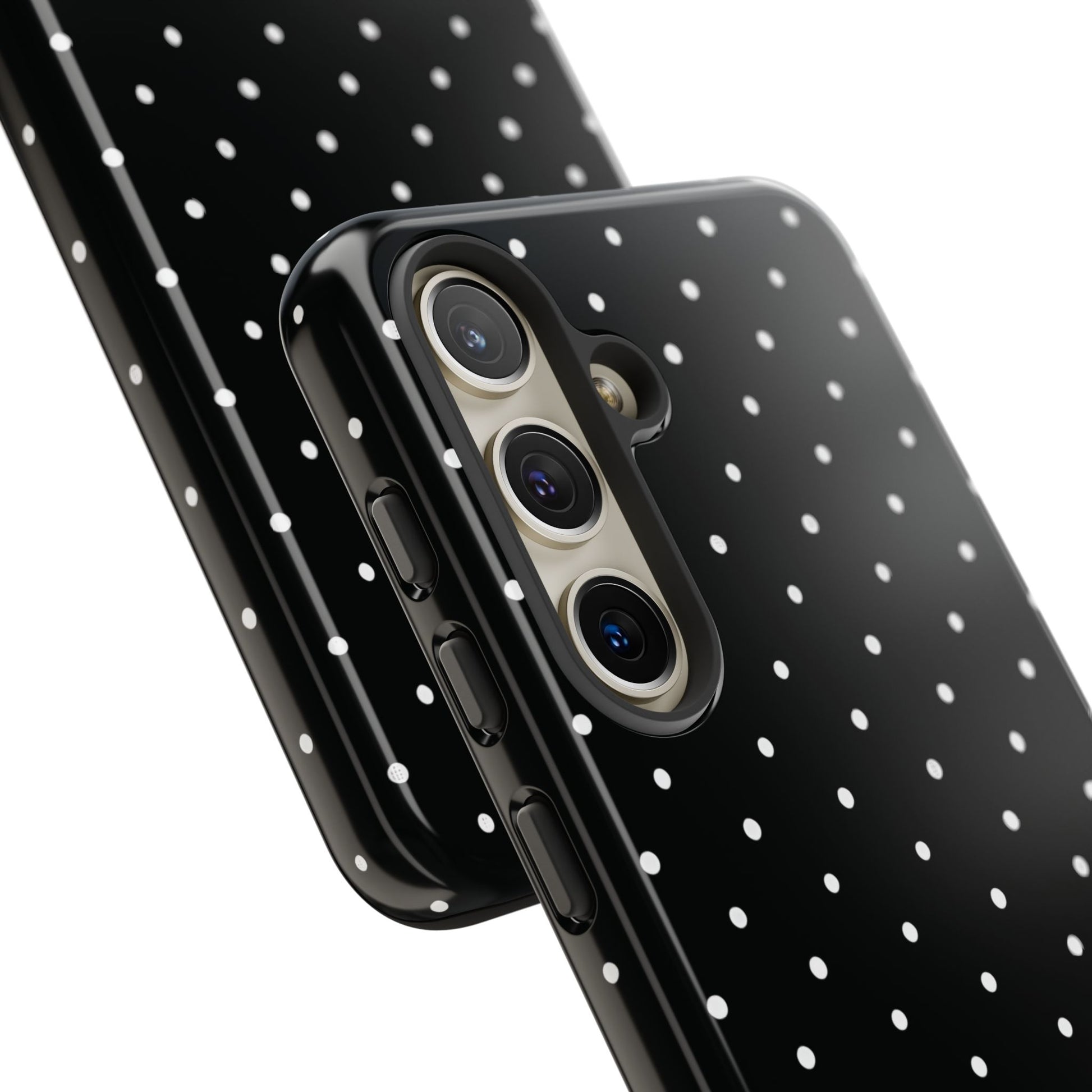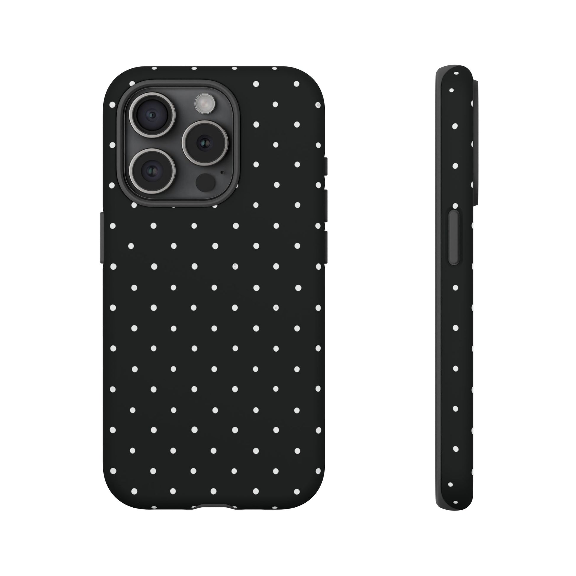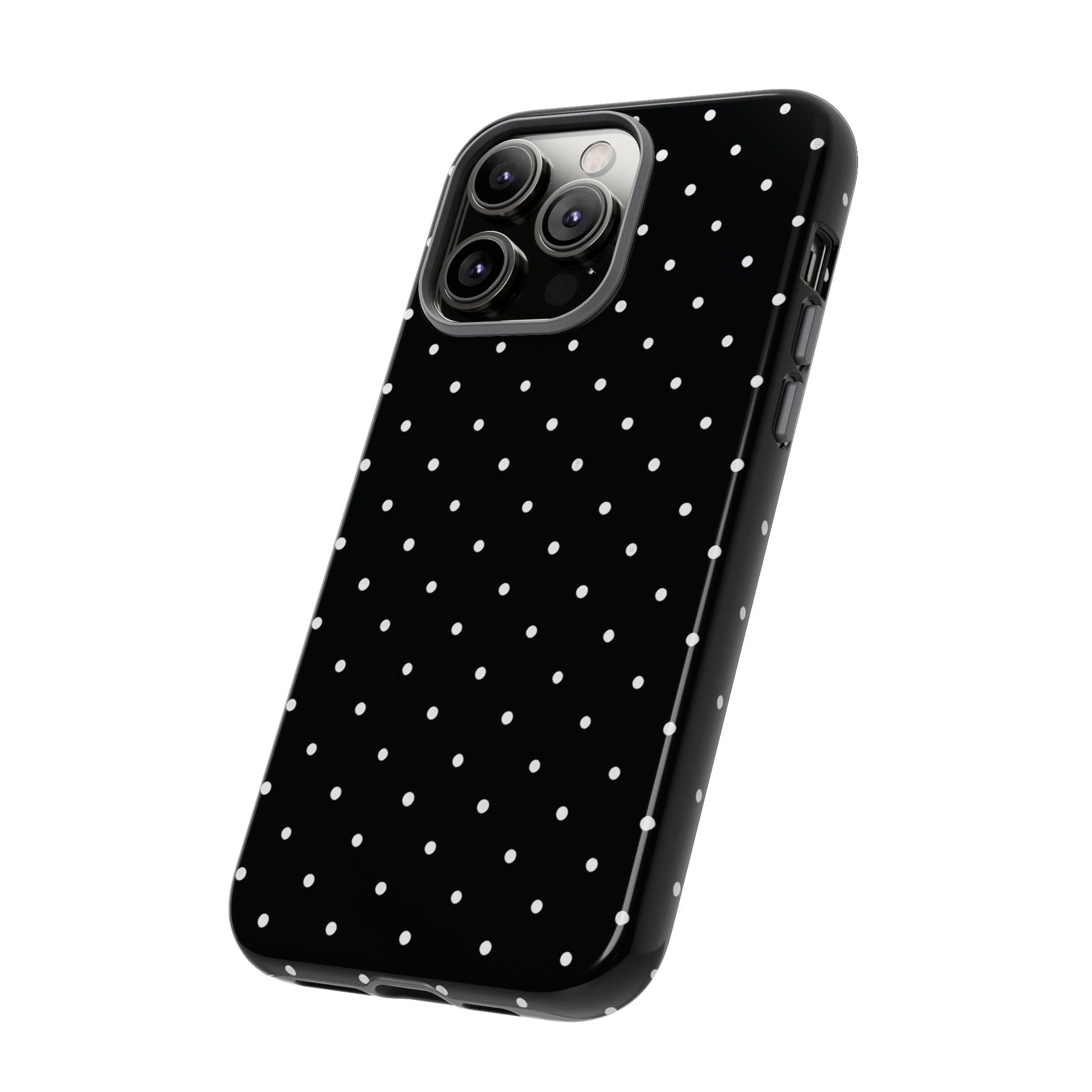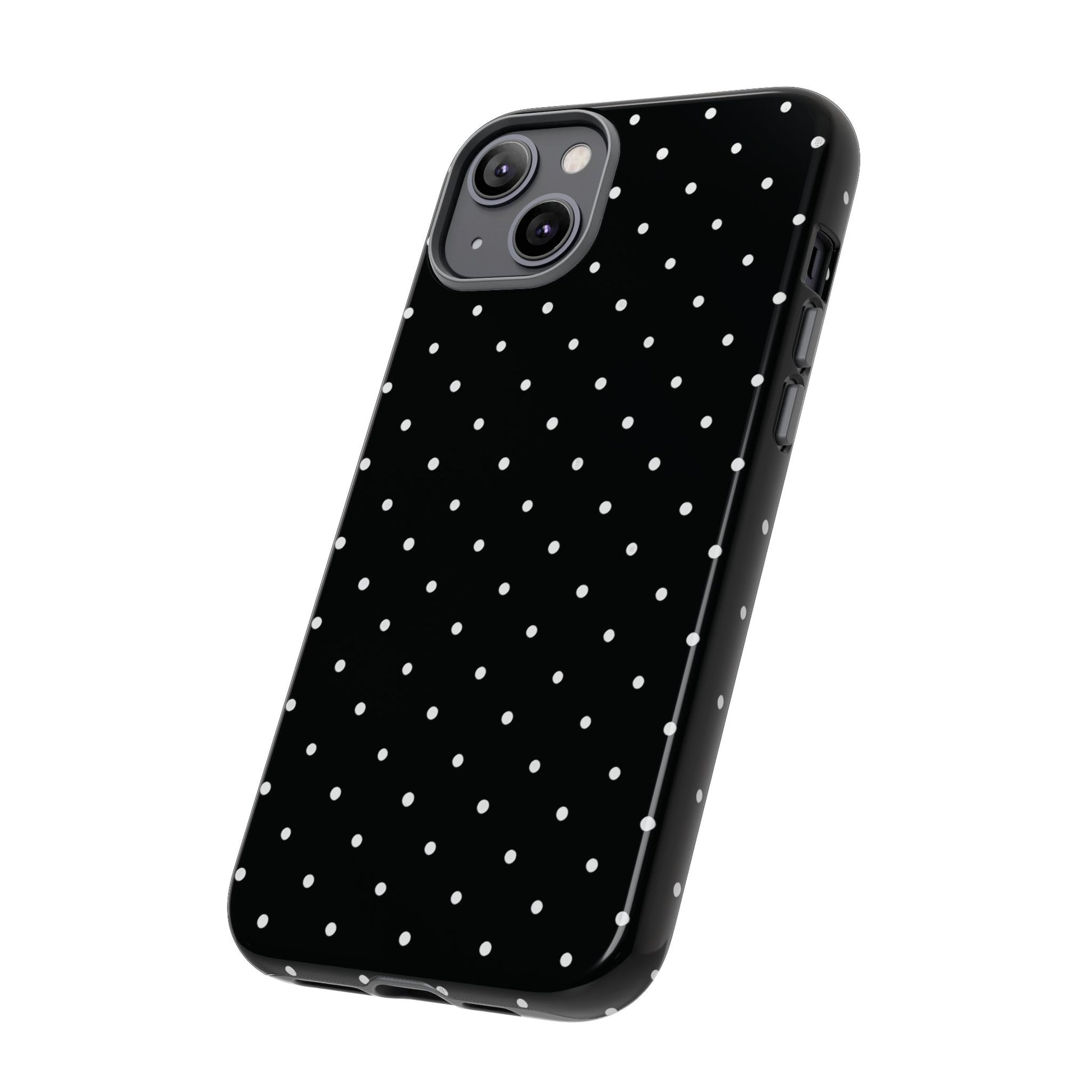 White dots scatter neatly across a deep black canvas, creating a clean and timeless repeating pattern. Subtle matte tones enhance the elegant simplicity of this classic design.