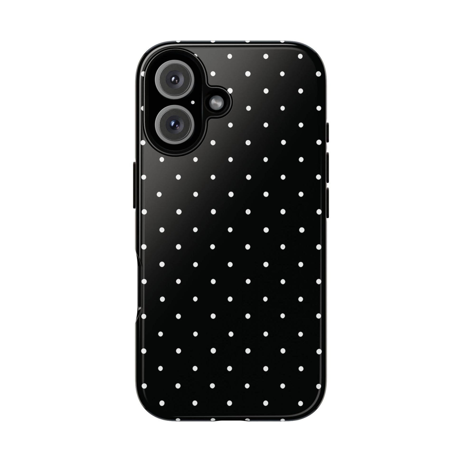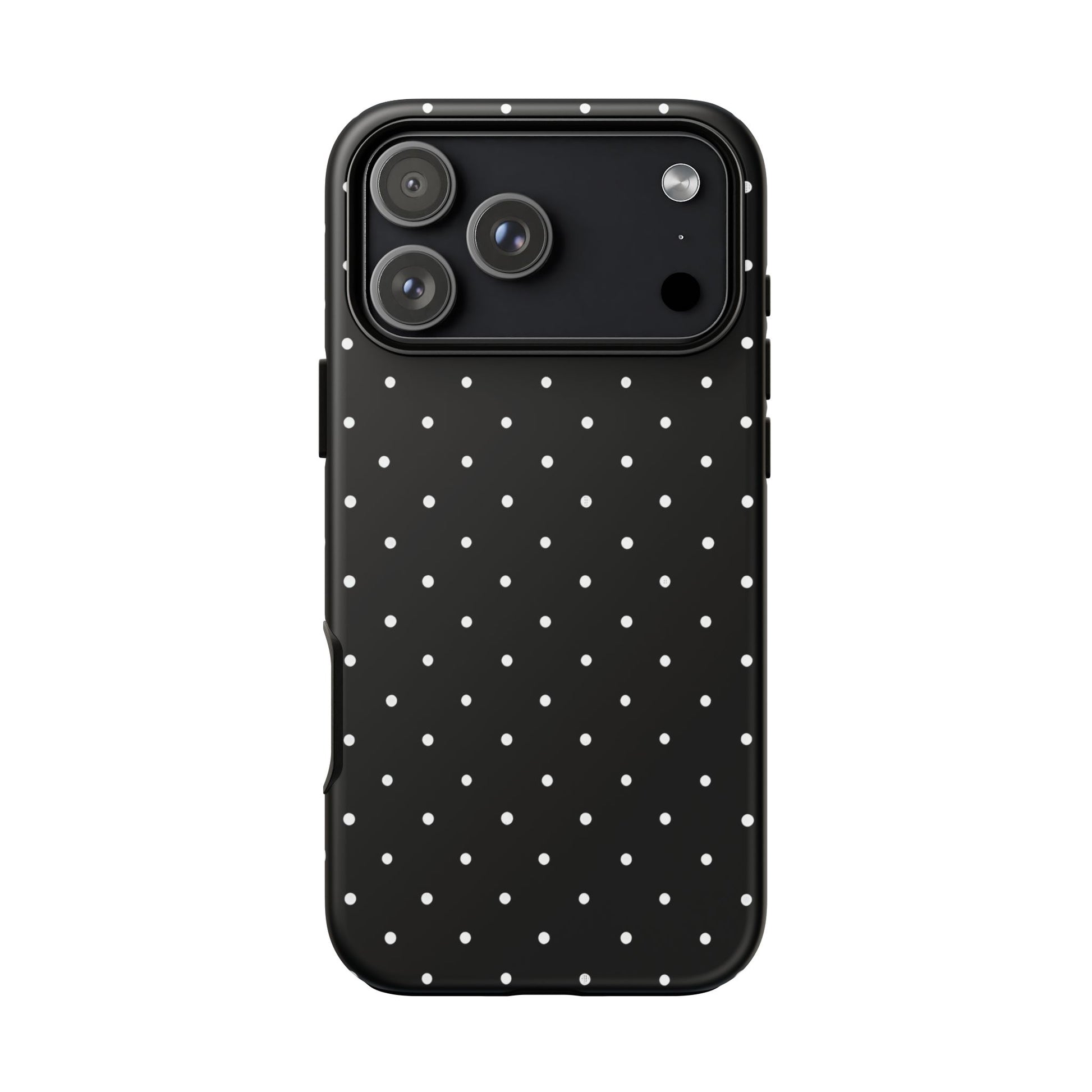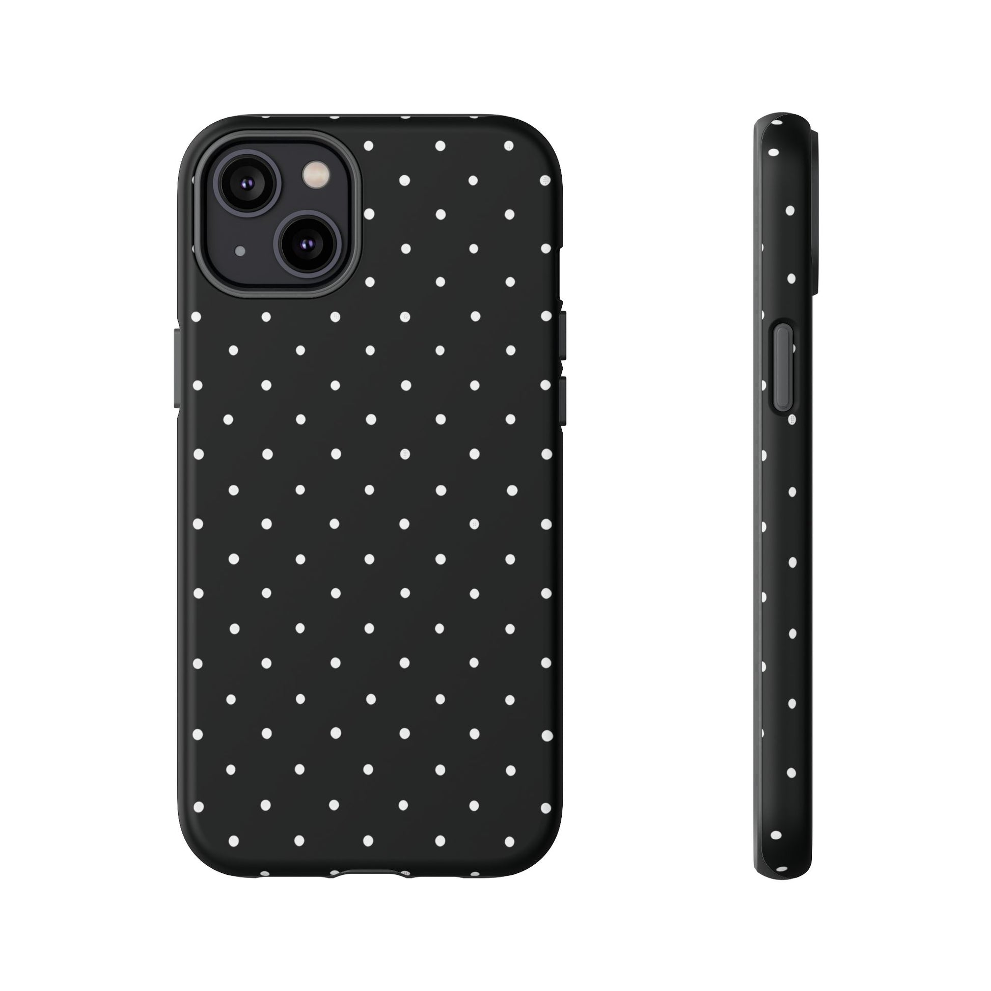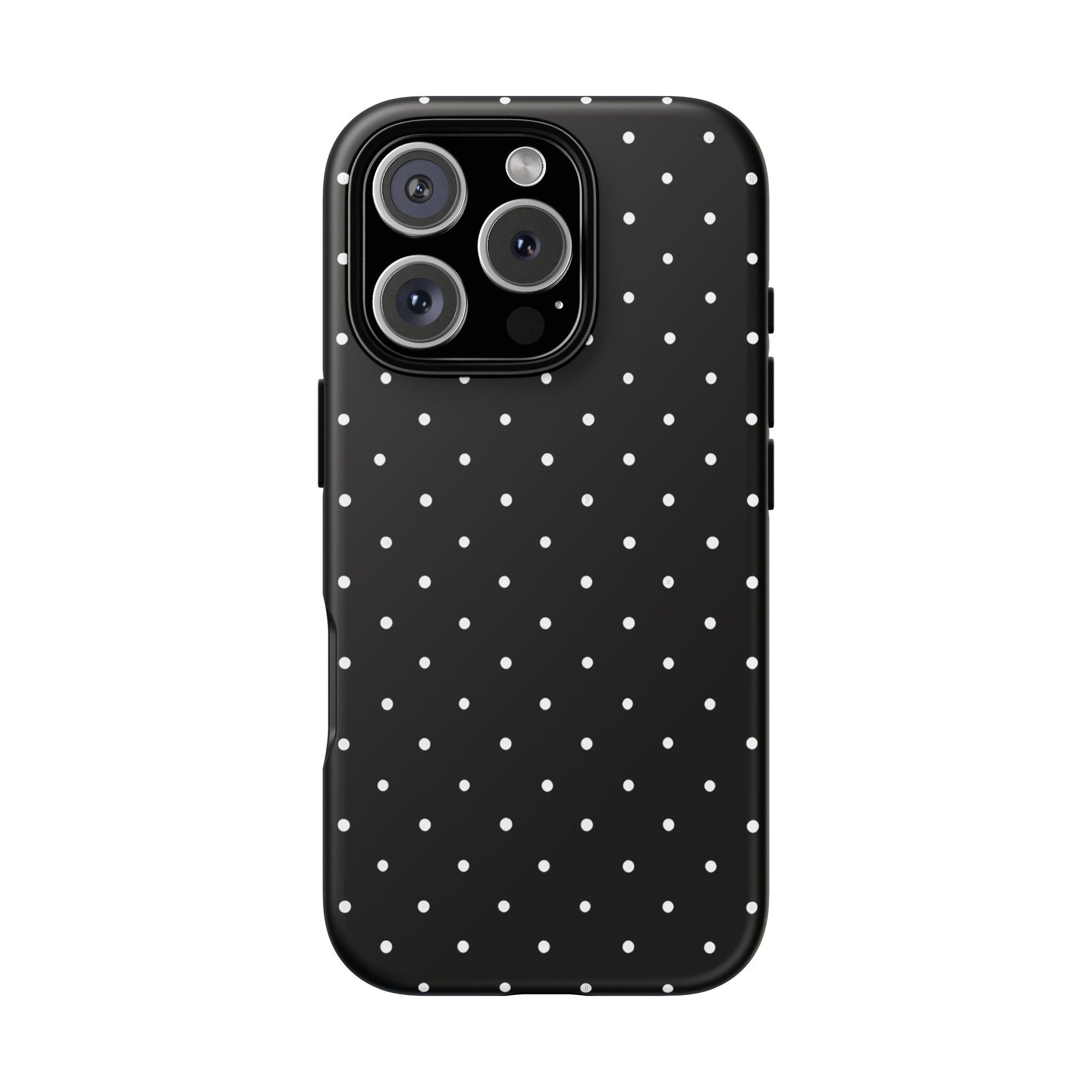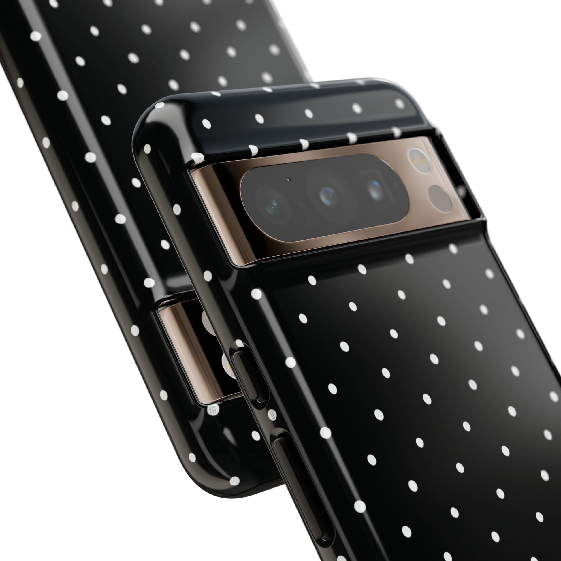 White dots scatter neatly across a deep black canvas, creating a clean and timeless repeating pattern. Subtle matte tones enhance the elegant simplicity of this classic design.