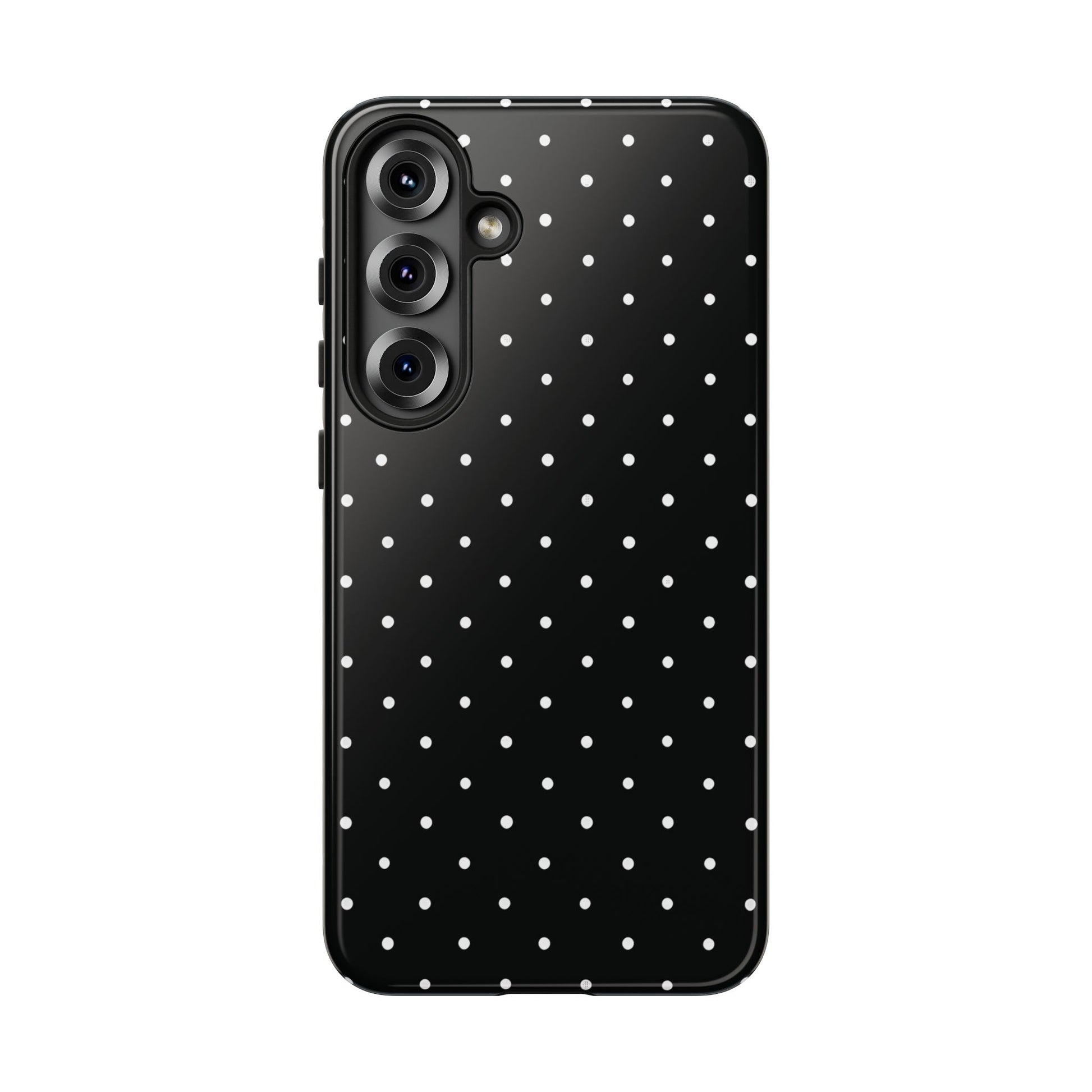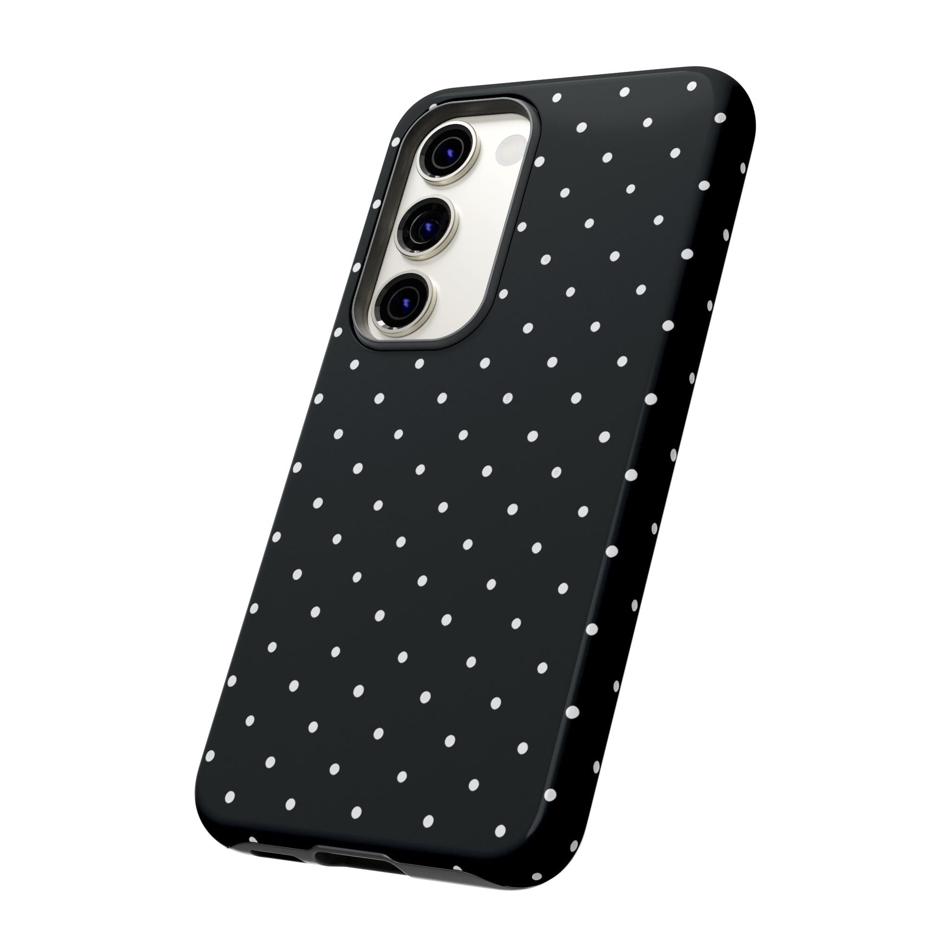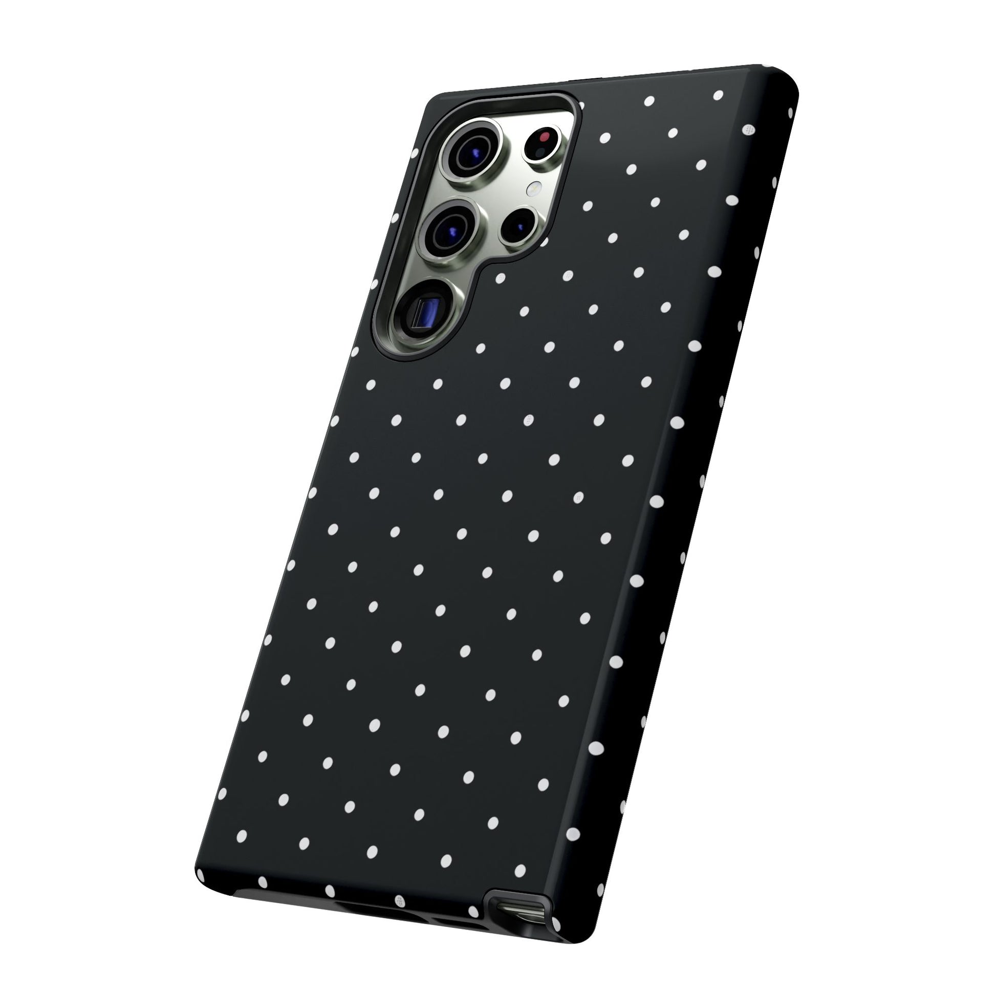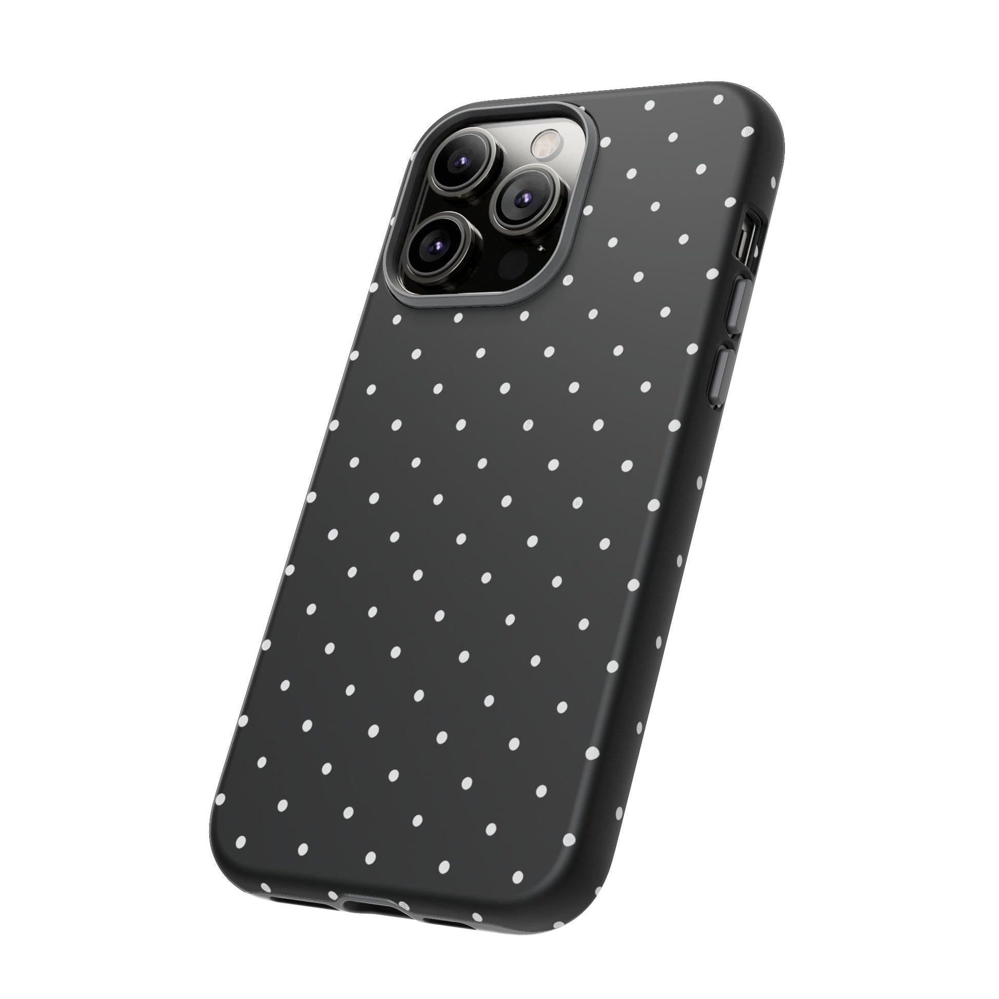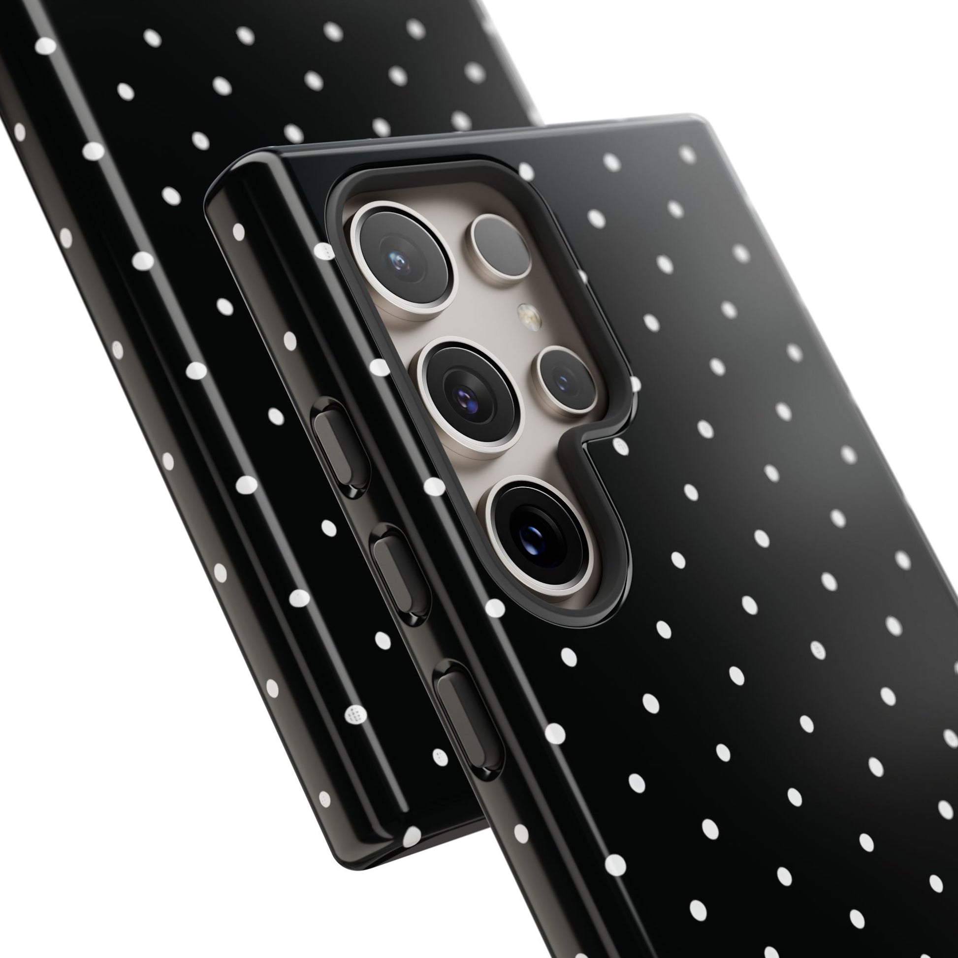 White dots scatter neatly across a deep black canvas, creating a clean and timeless repeating pattern. Subtle matte tones enhance the elegant simplicity of this classic design.