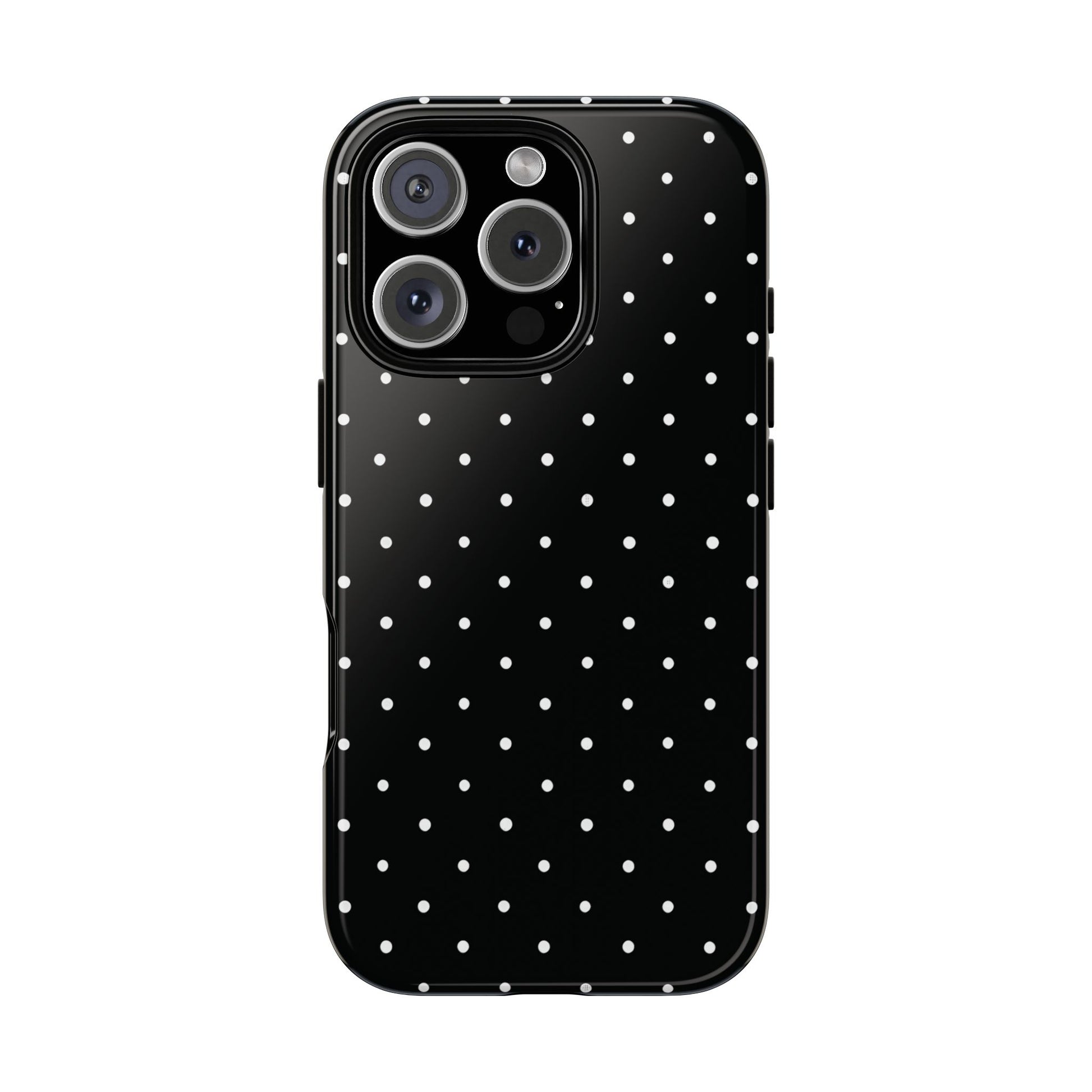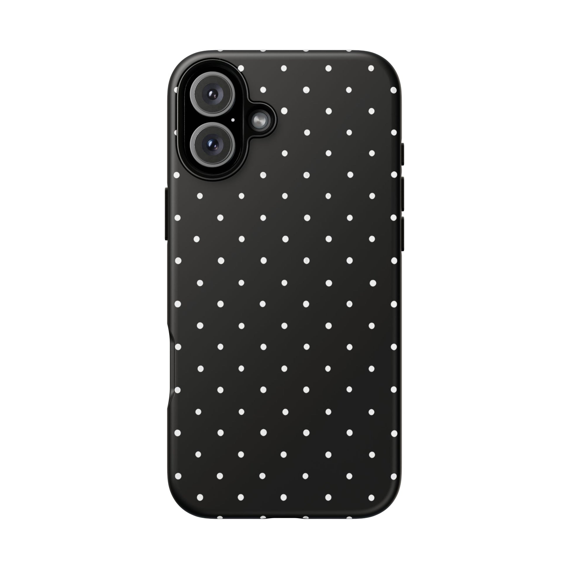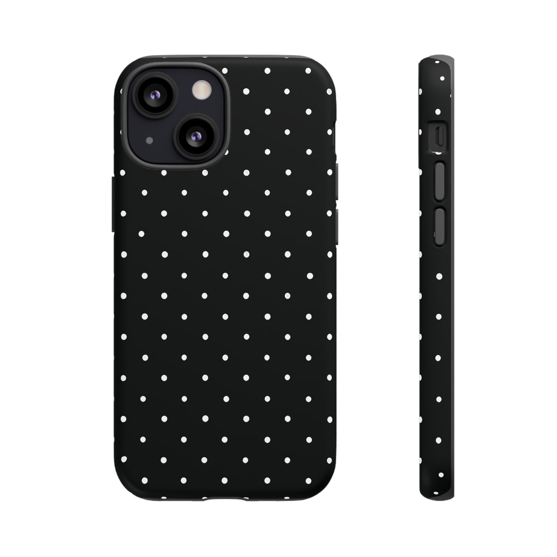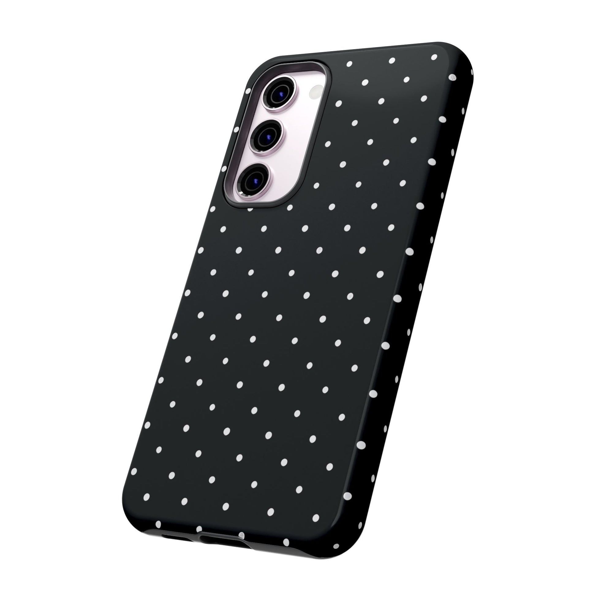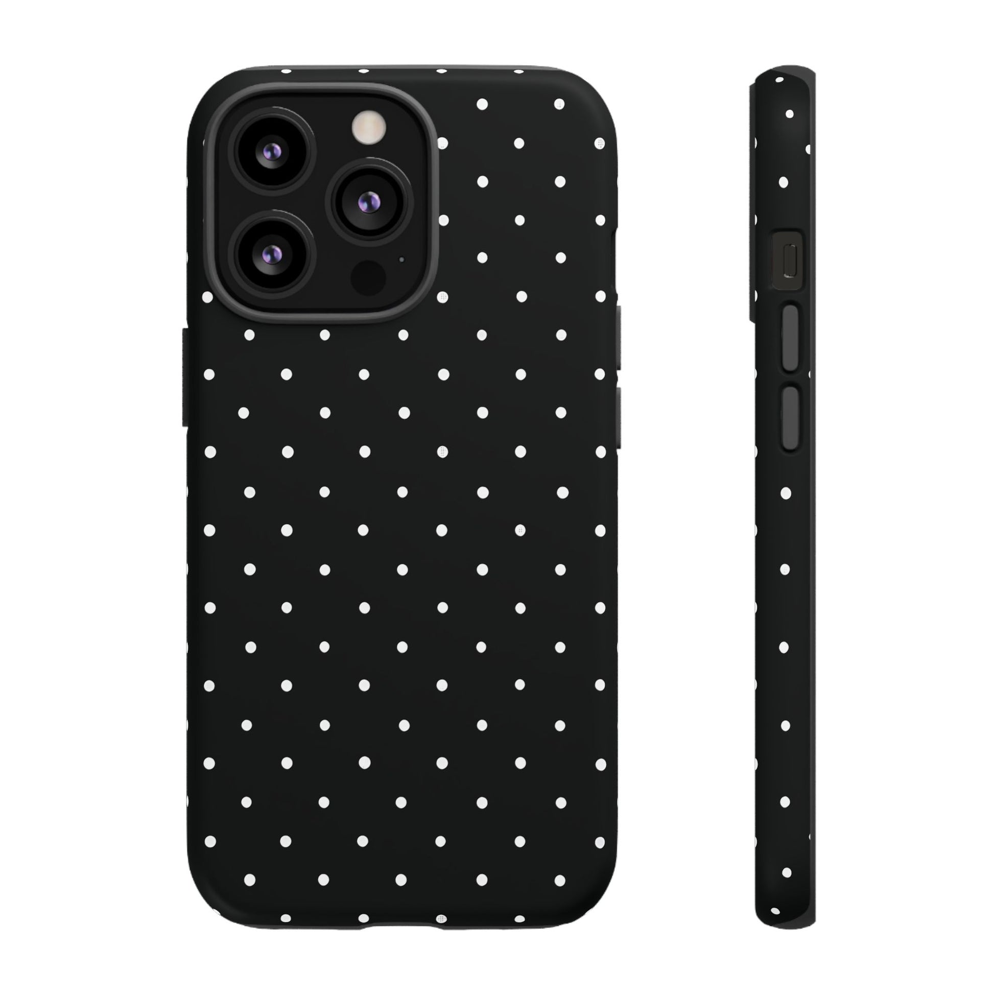 White dots scatter neatly across a deep black canvas, creating a clean and timeless repeating pattern. Subtle matte tones enhance the elegant simplicity of this classic design.