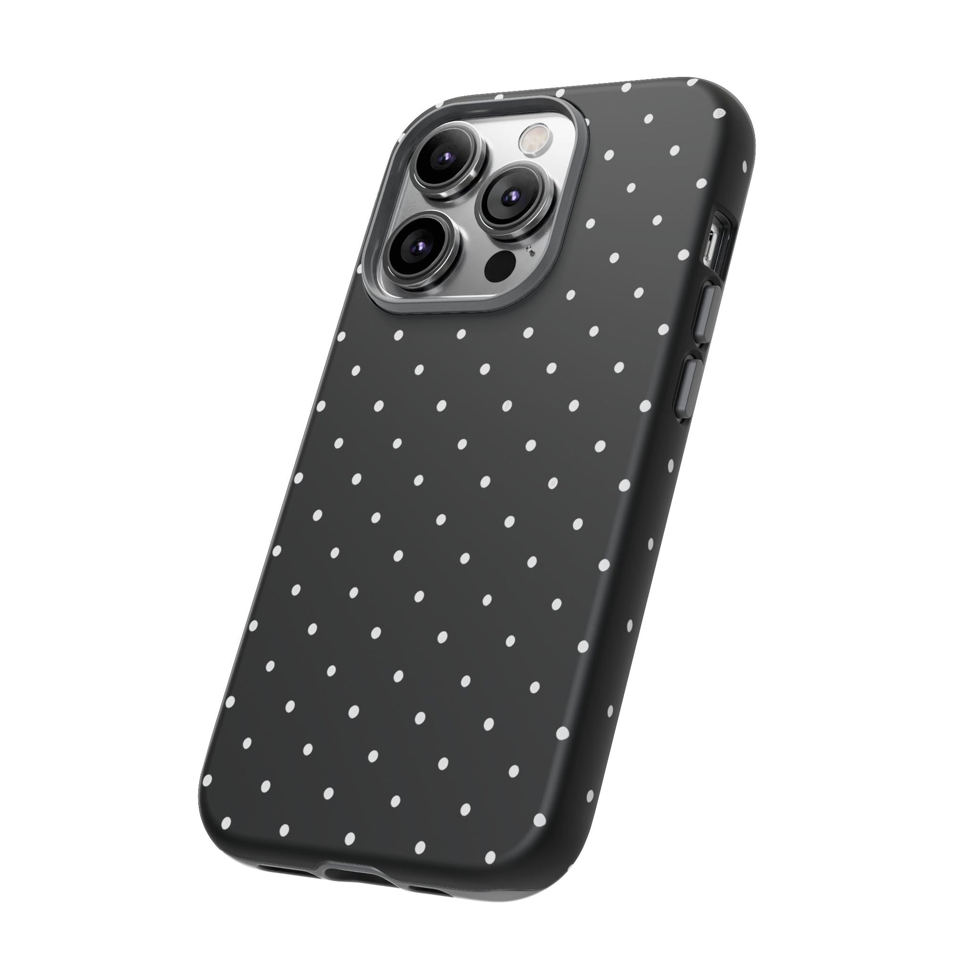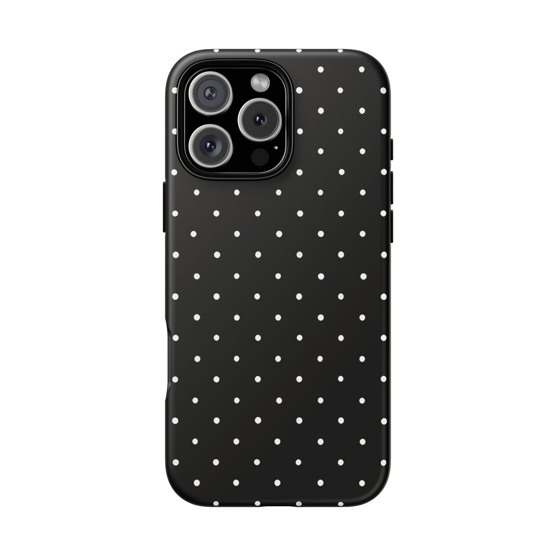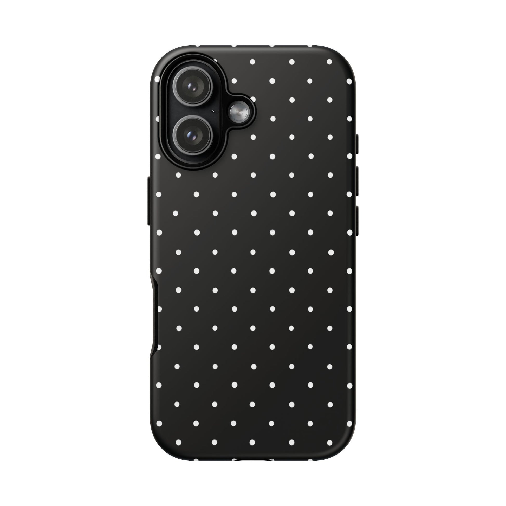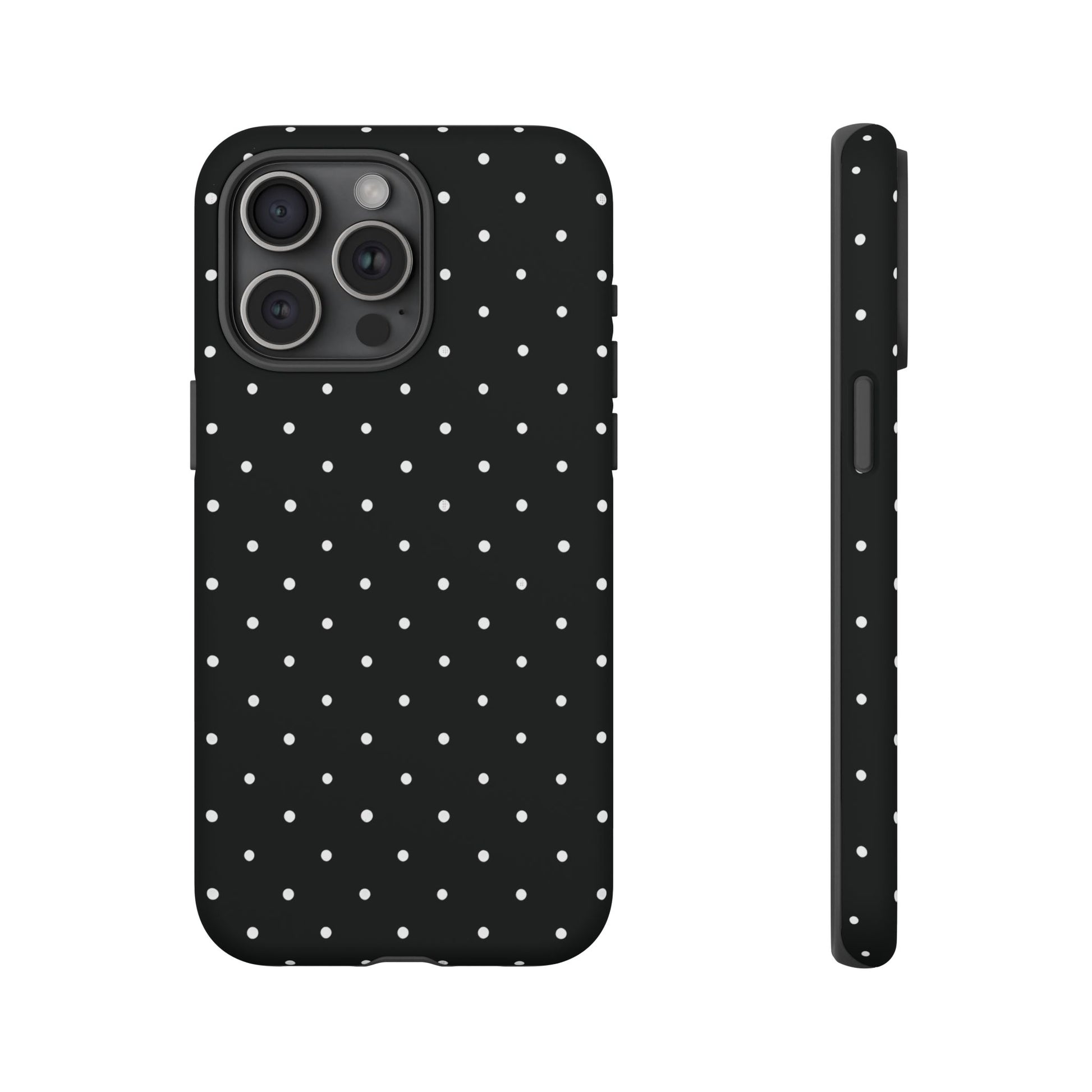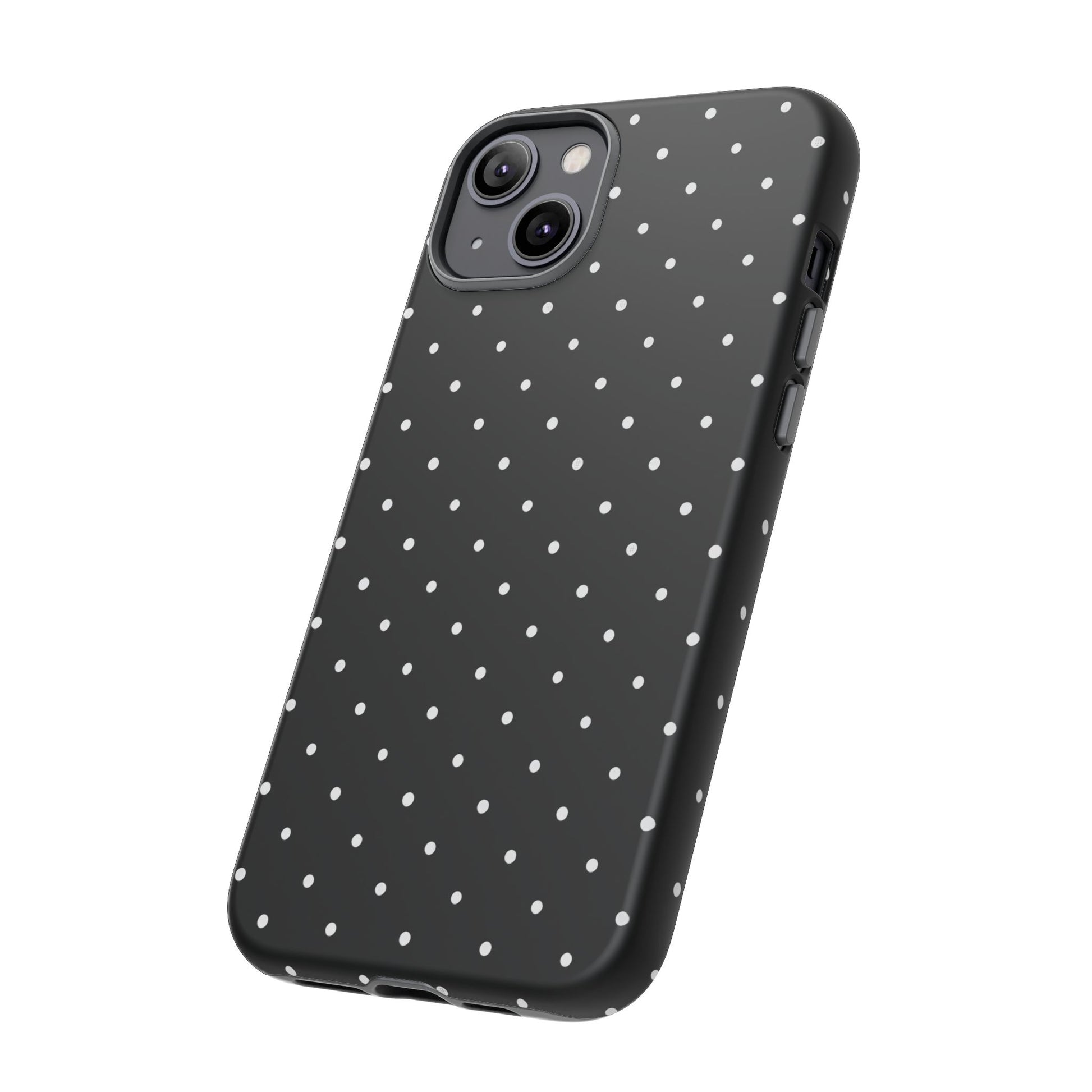White dots scatter neatly across a deep black canvas, creating a clean and timeless repeating pattern. Subtle matte tones enhance the elegant simplicity of this classic design.