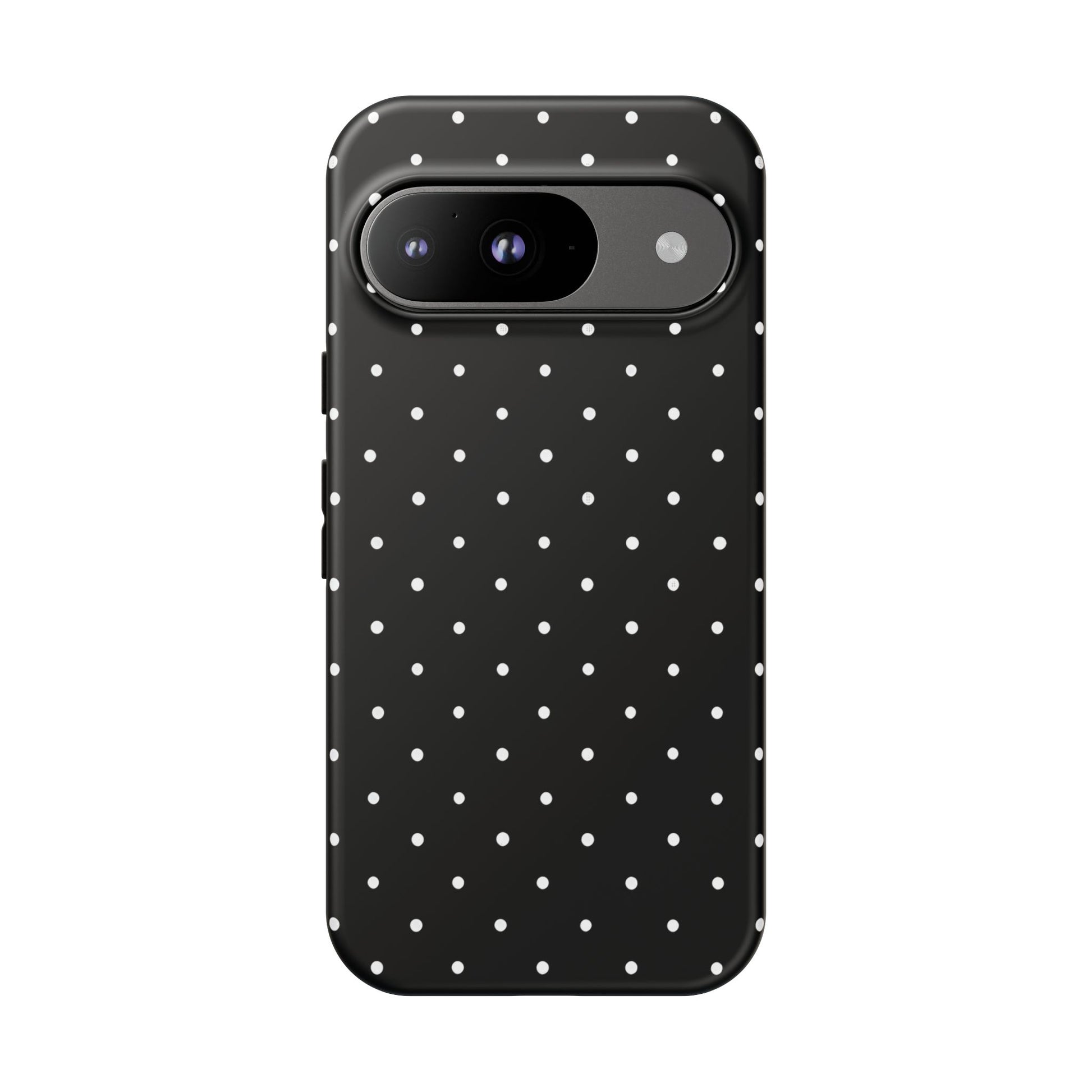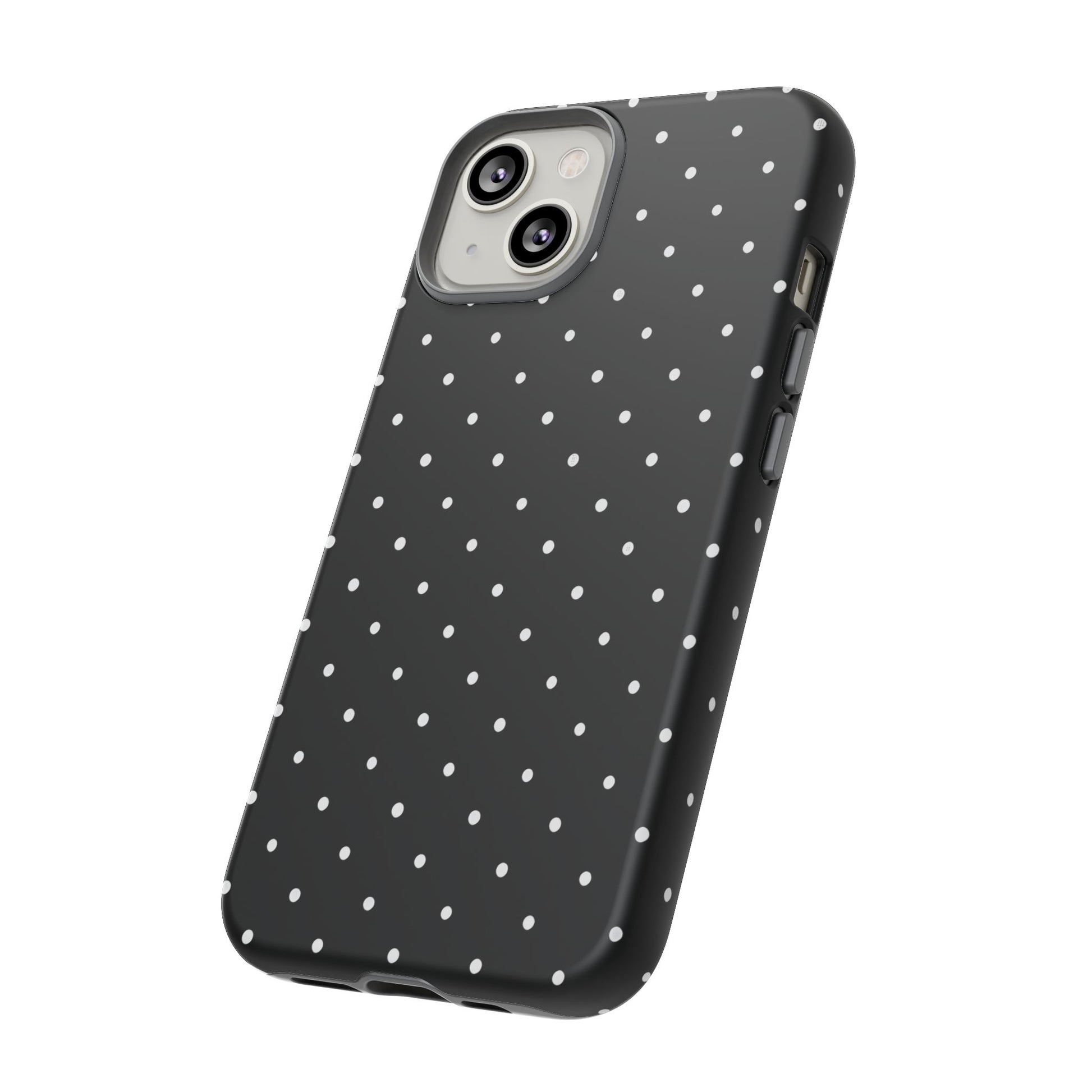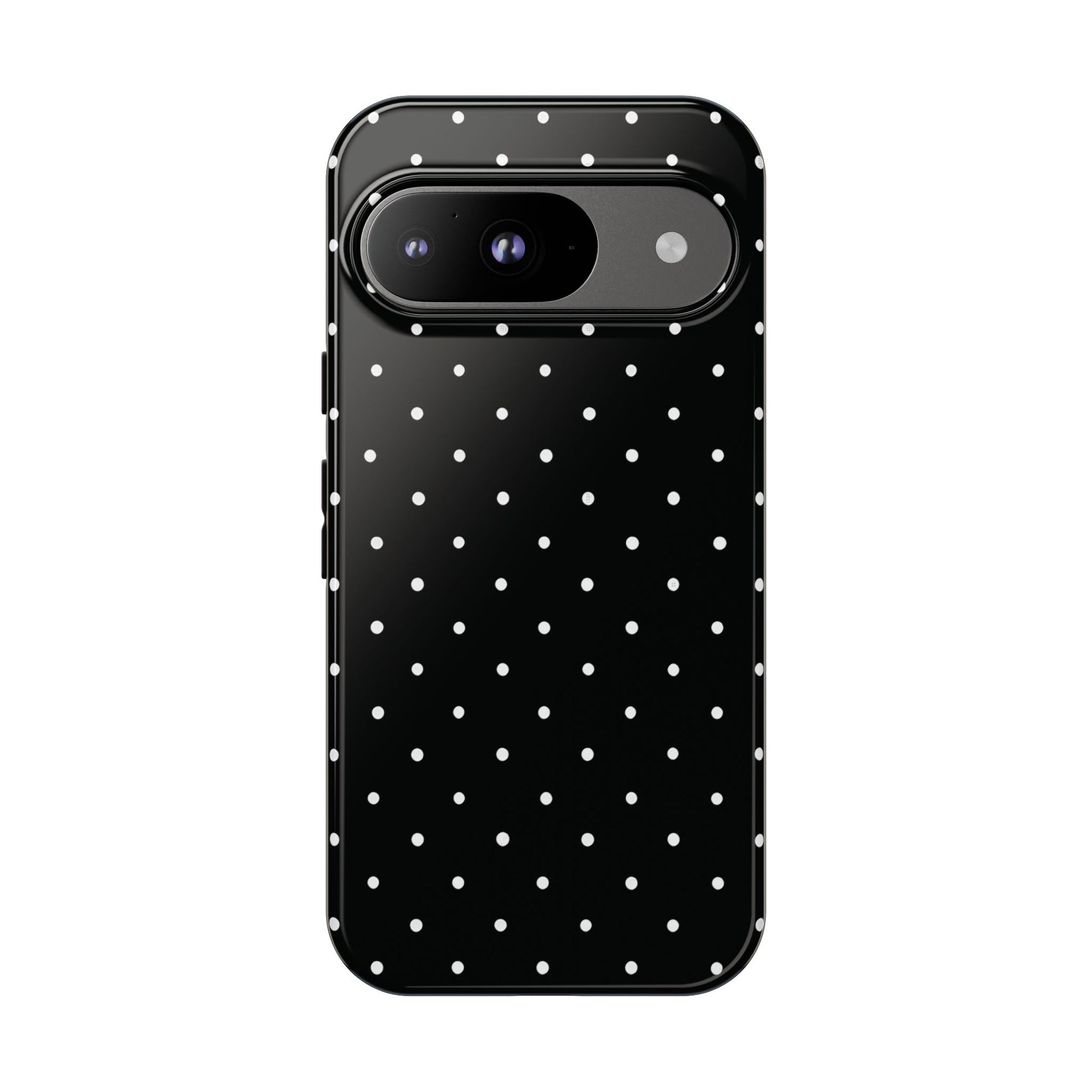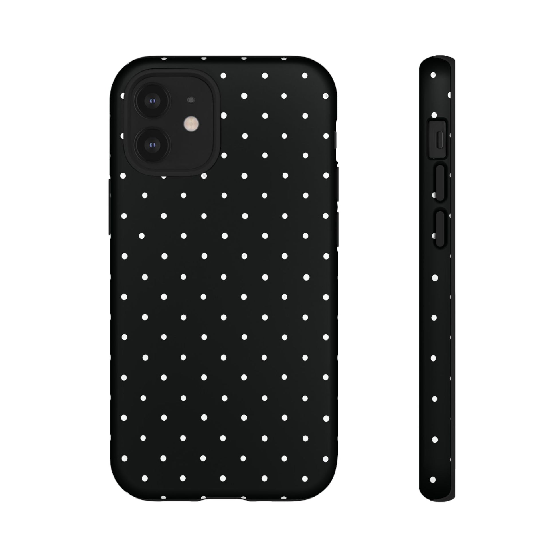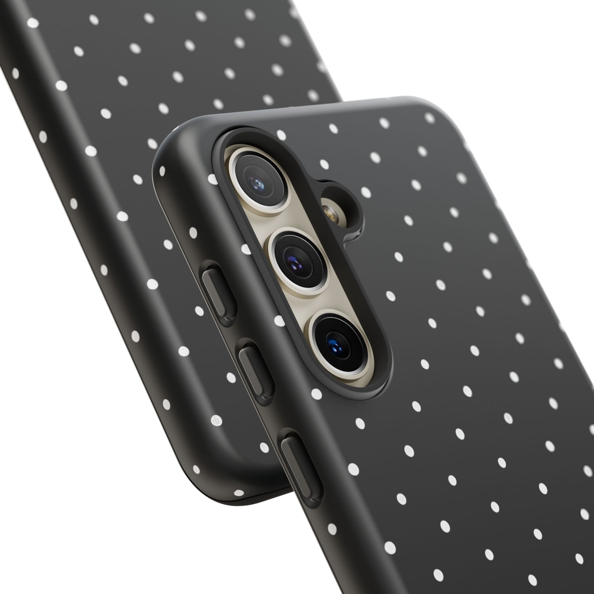White dots scatter neatly across a deep black canvas, creating a clean and timeless repeating pattern. Subtle matte tones enhance the elegant simplicity of this classic design.
