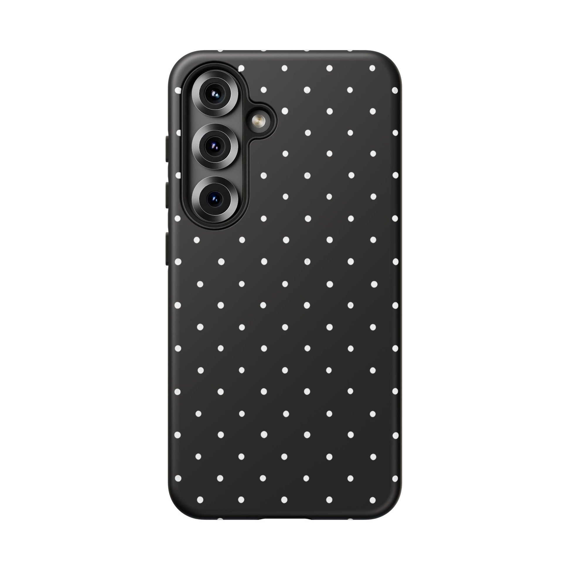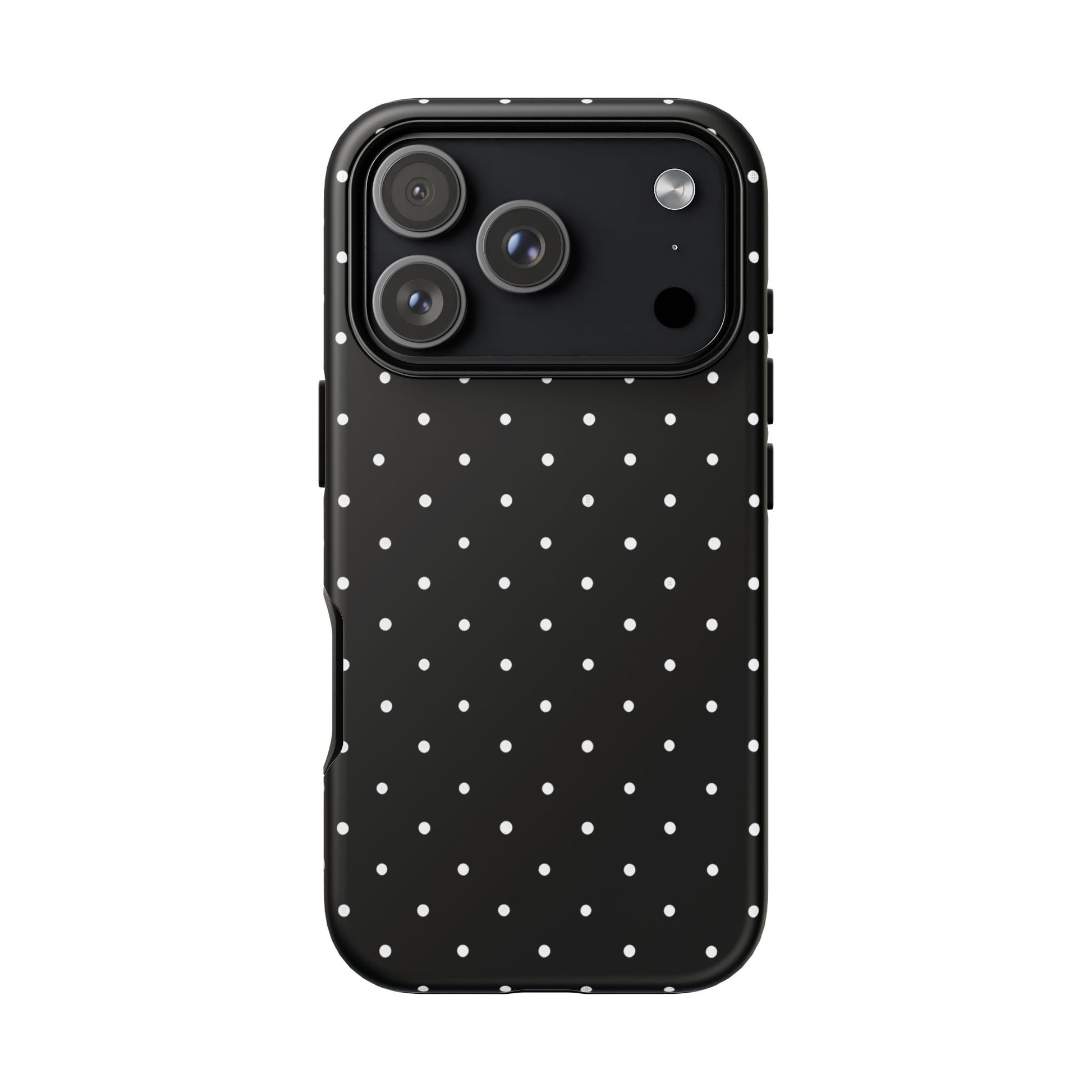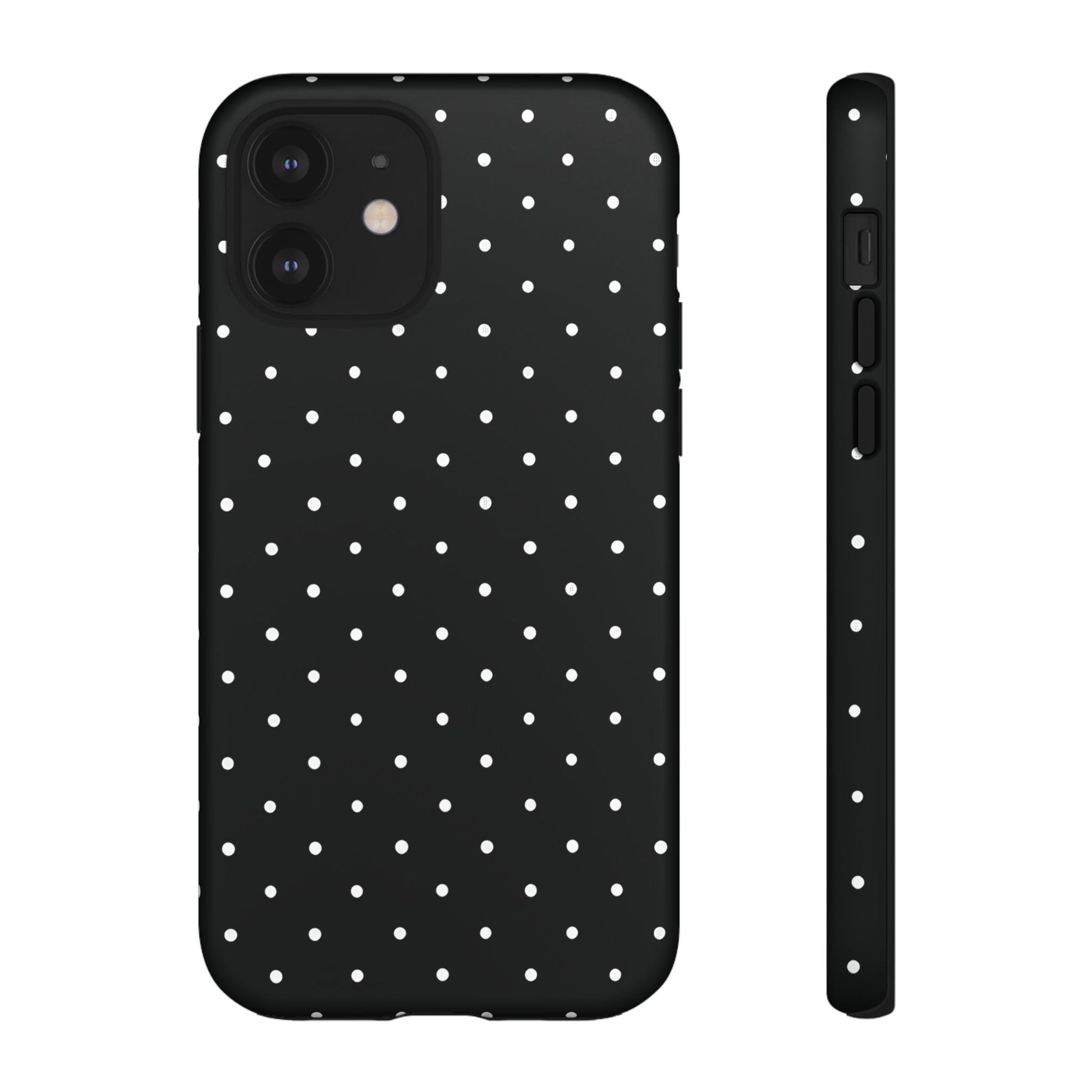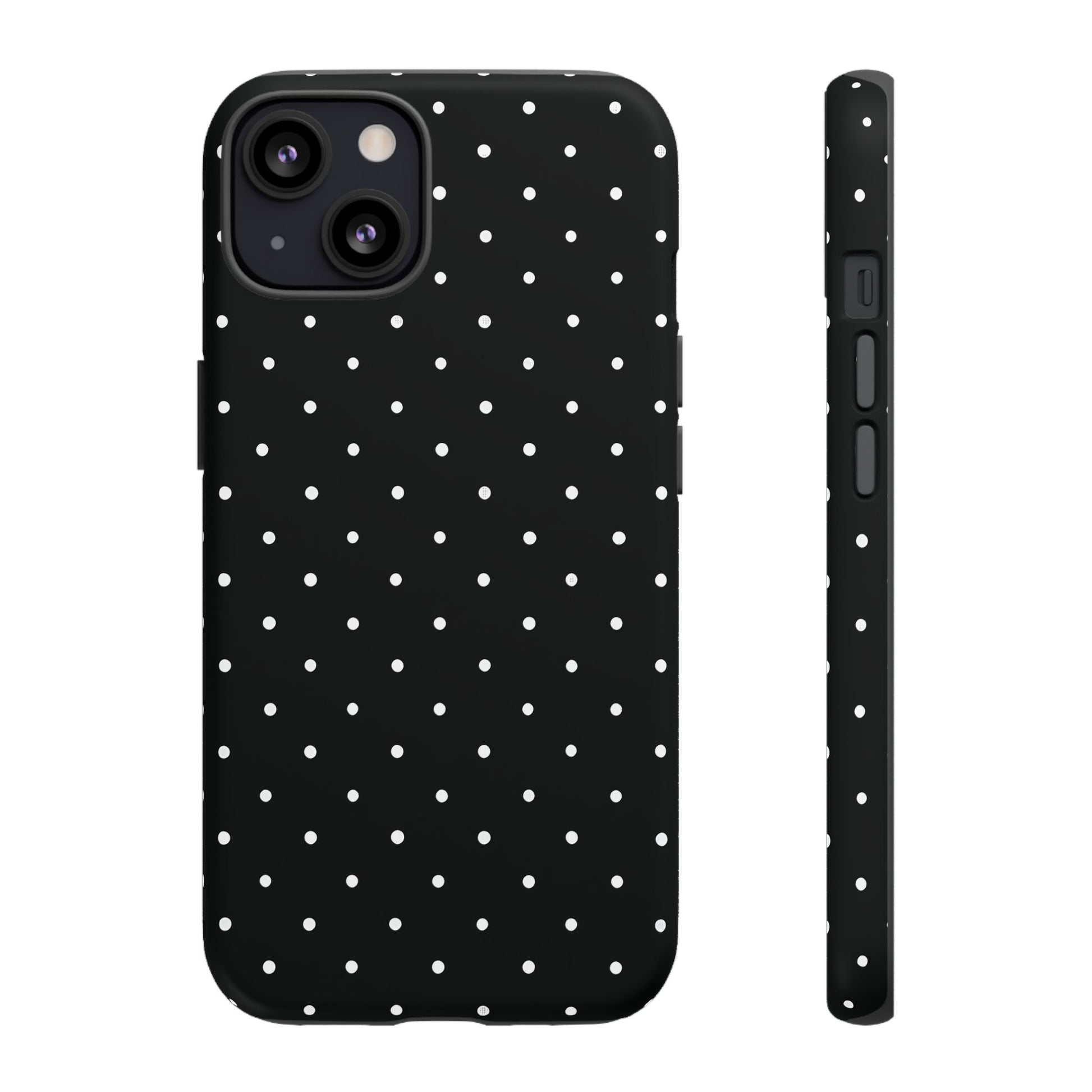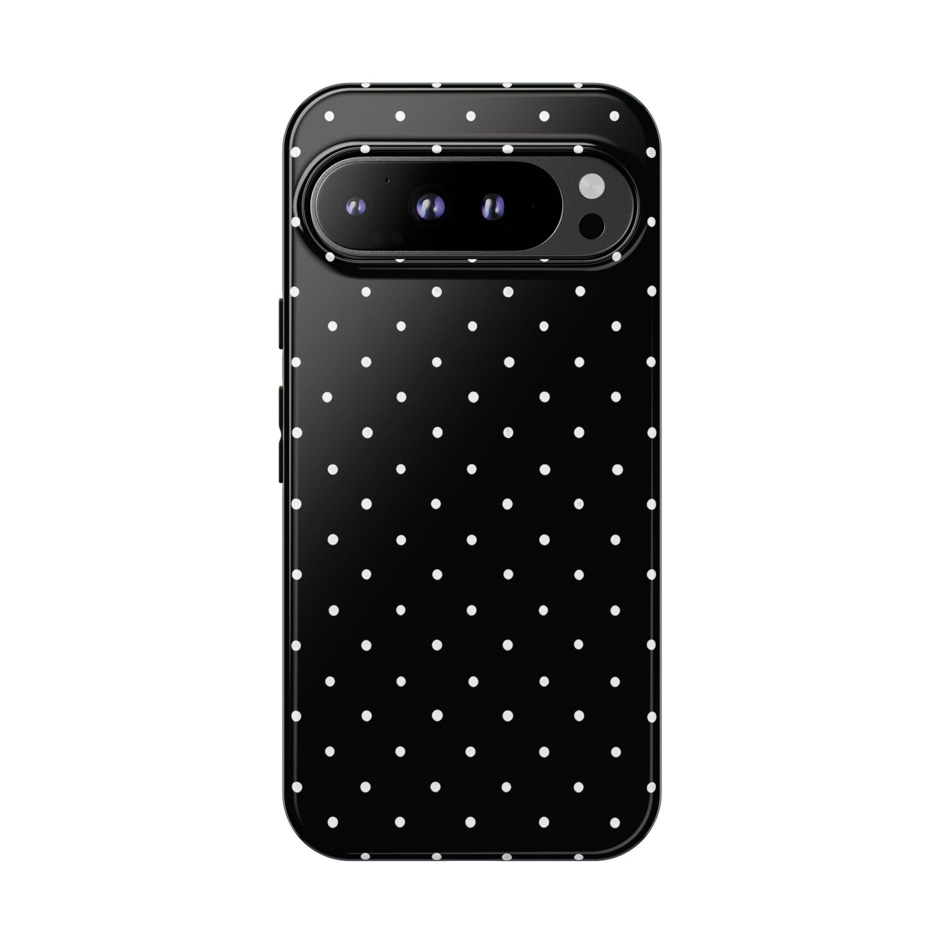 White dots scatter neatly across a deep black canvas, creating a clean and timeless repeating pattern. Subtle matte tones enhance the elegant simplicity of this classic design.