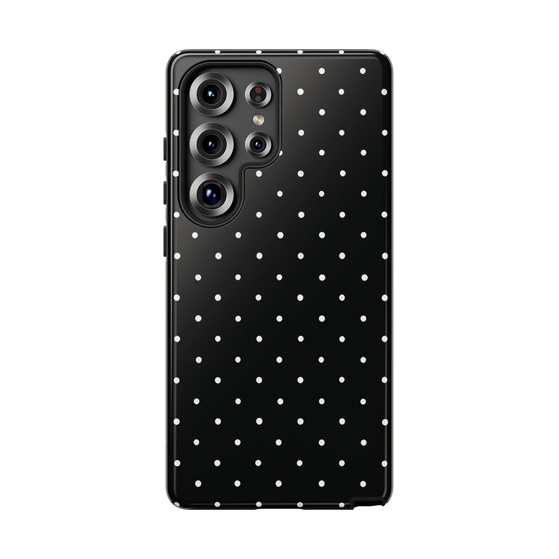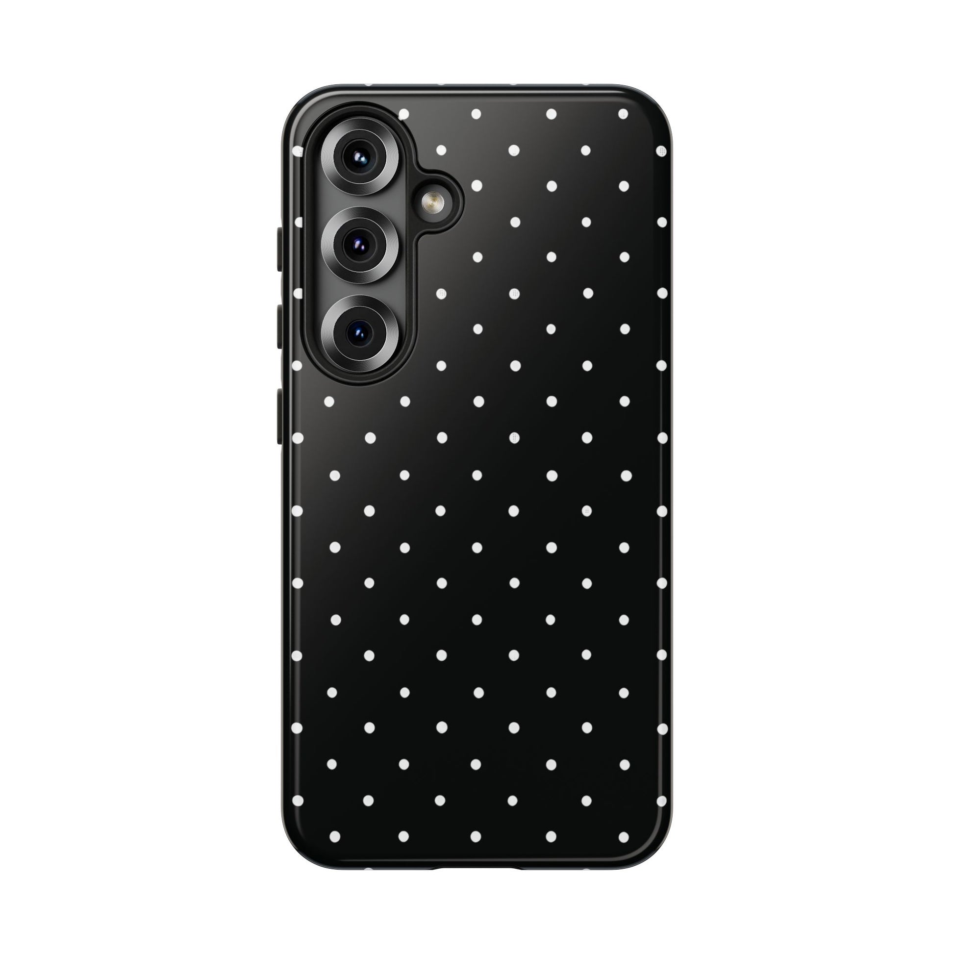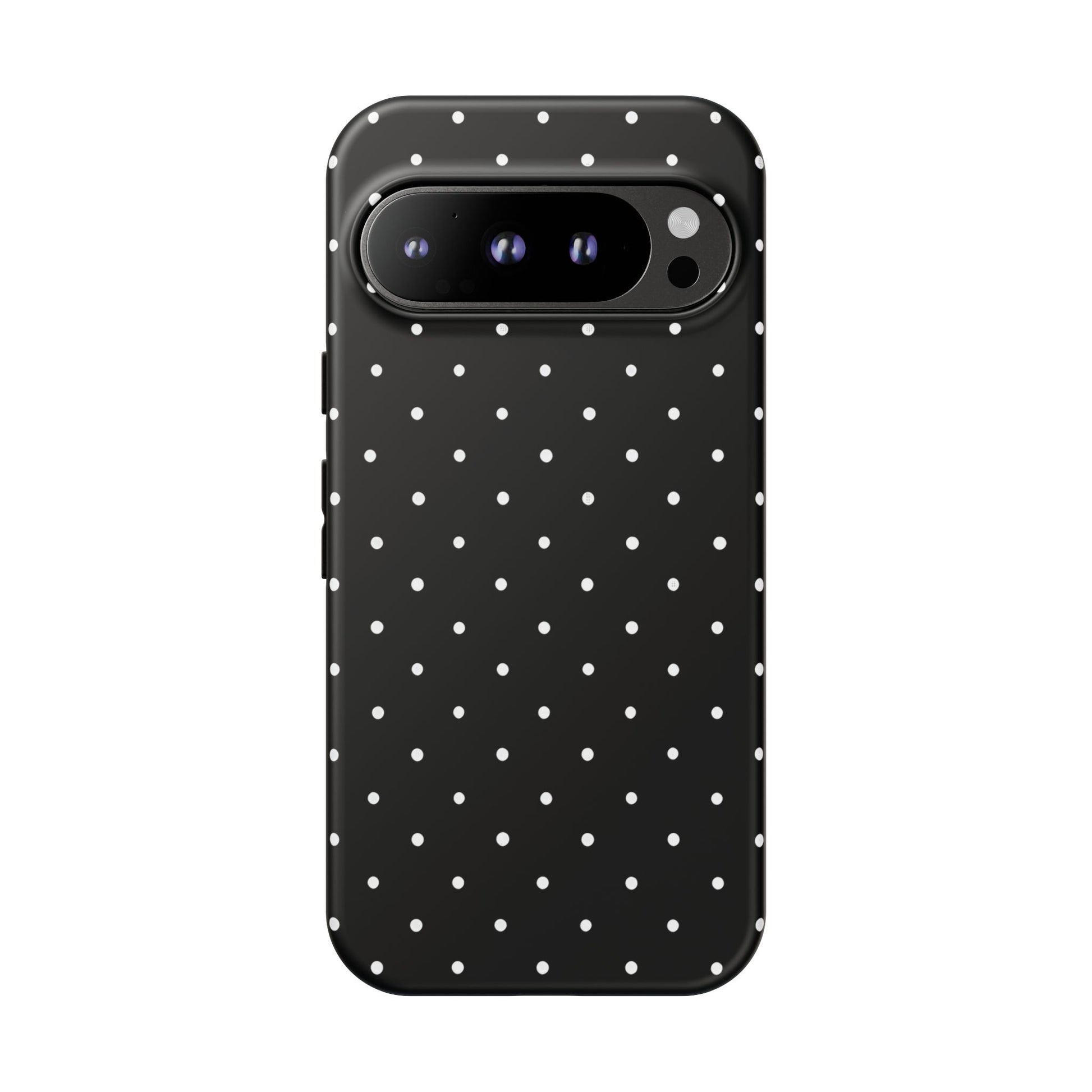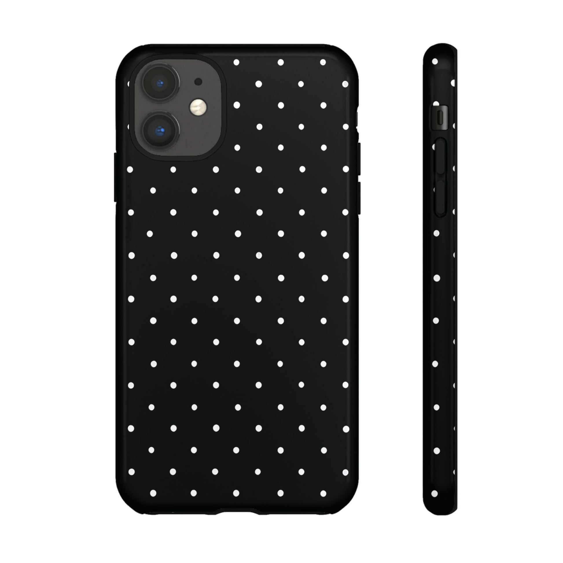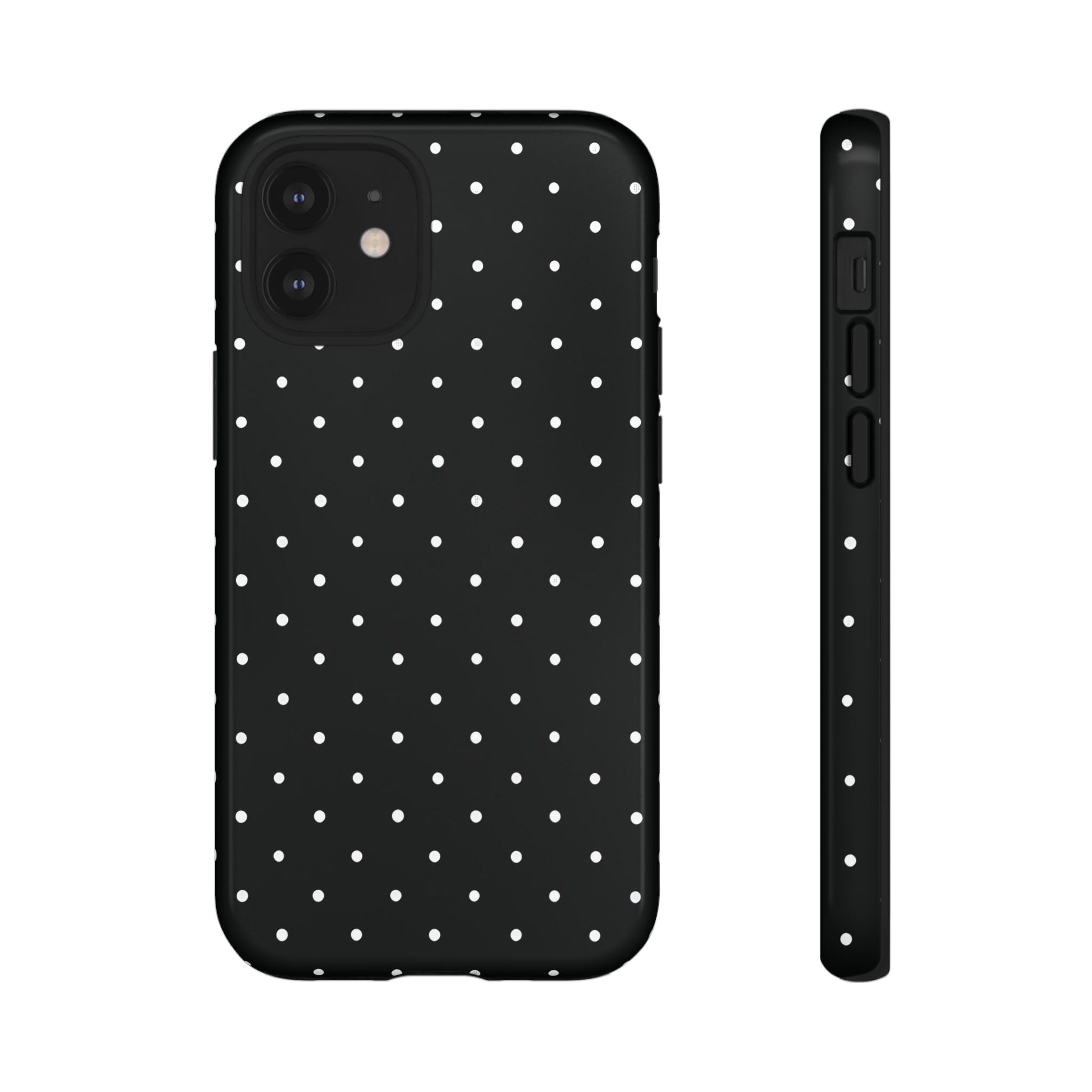 White dots scatter neatly across a deep black canvas, creating a clean and timeless repeating pattern. Subtle matte tones enhance the elegant simplicity of this classic design.