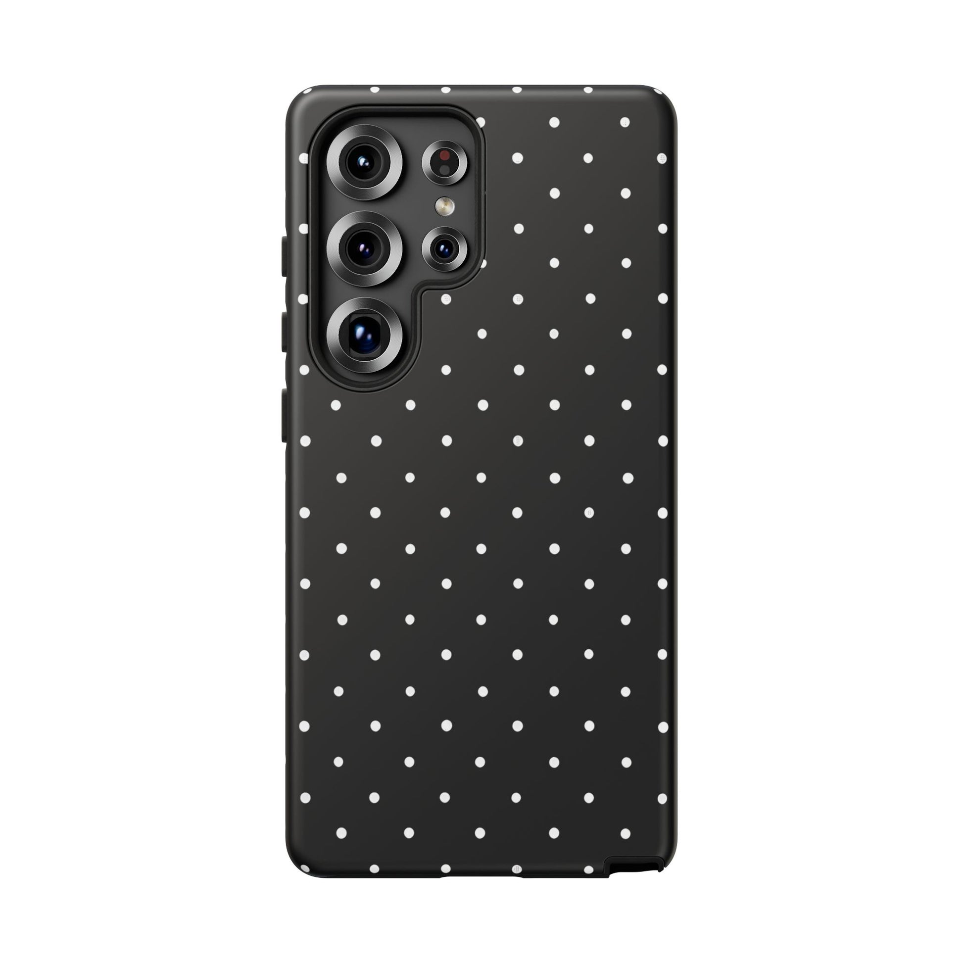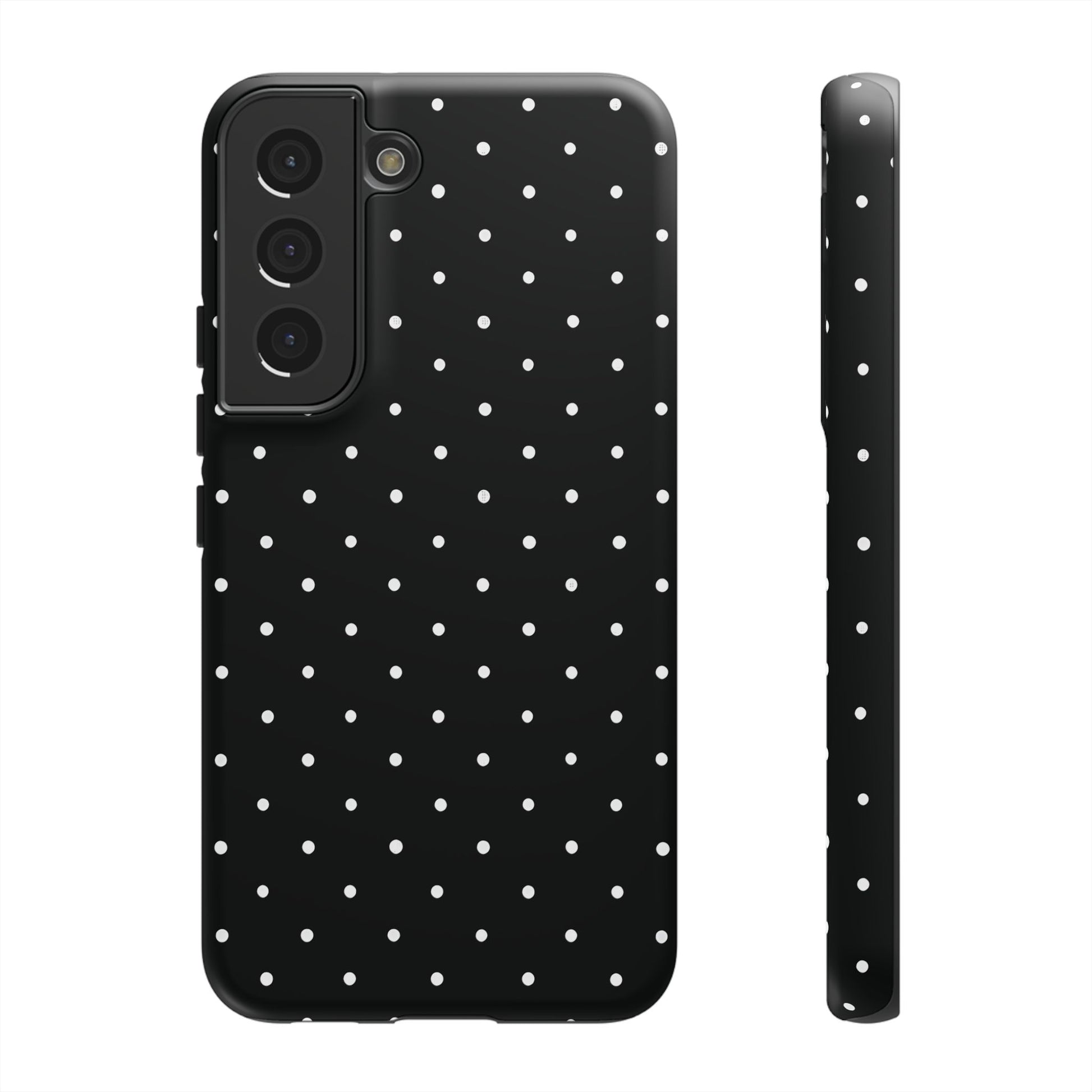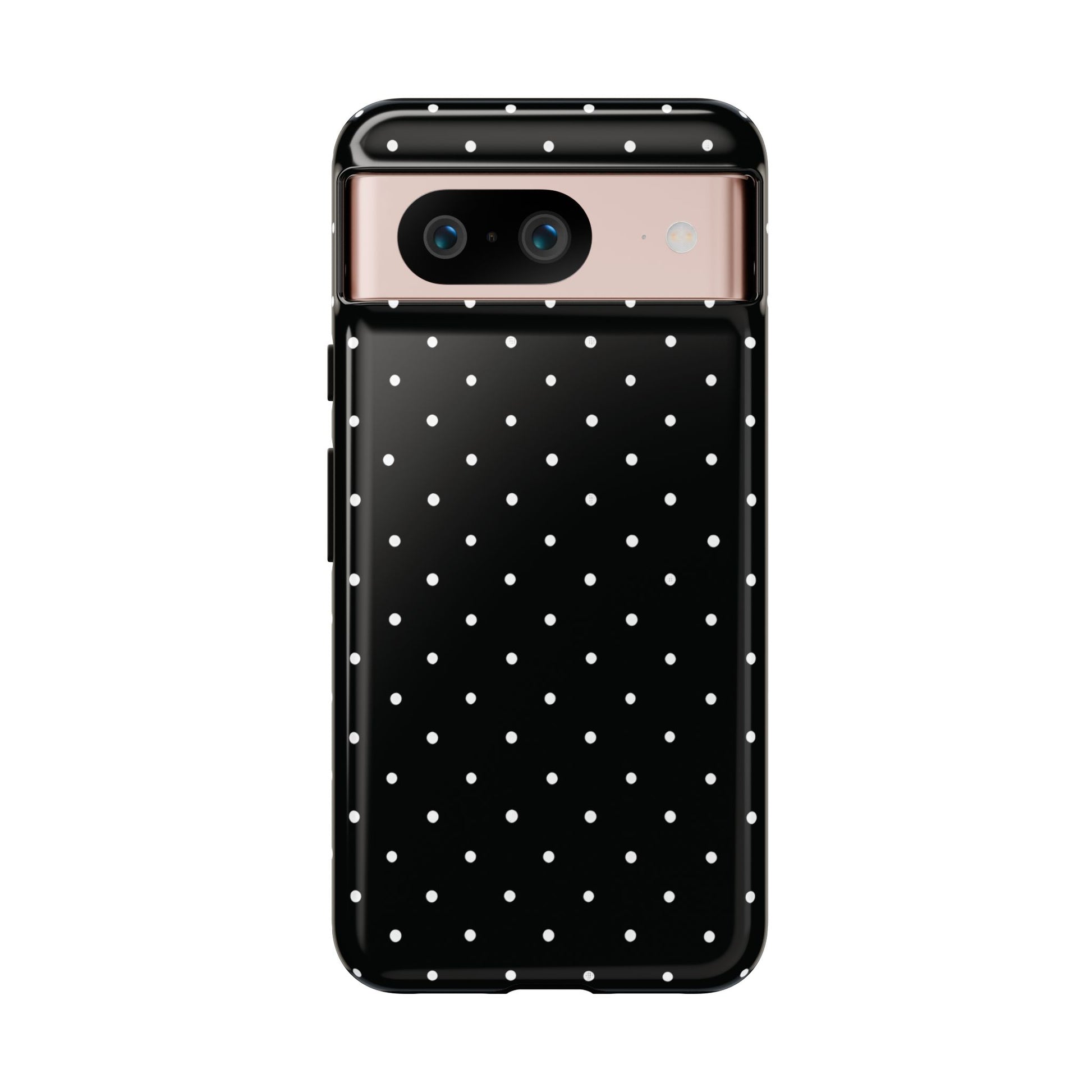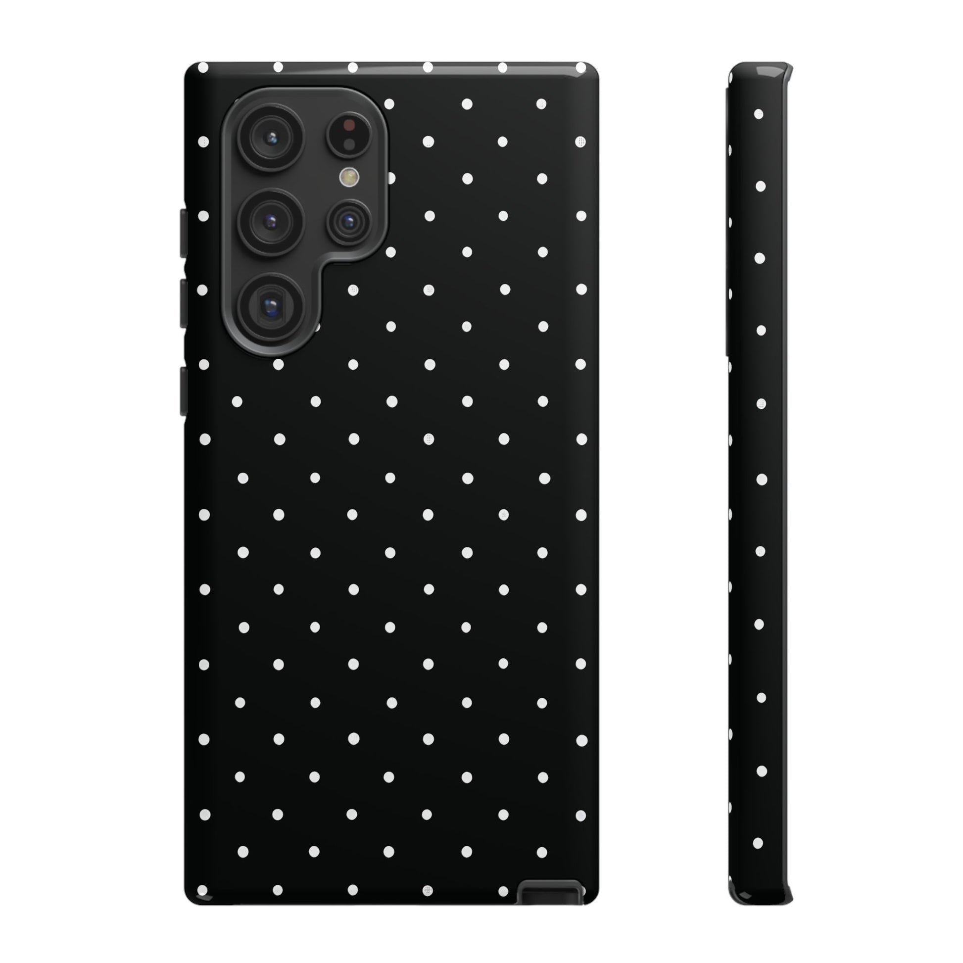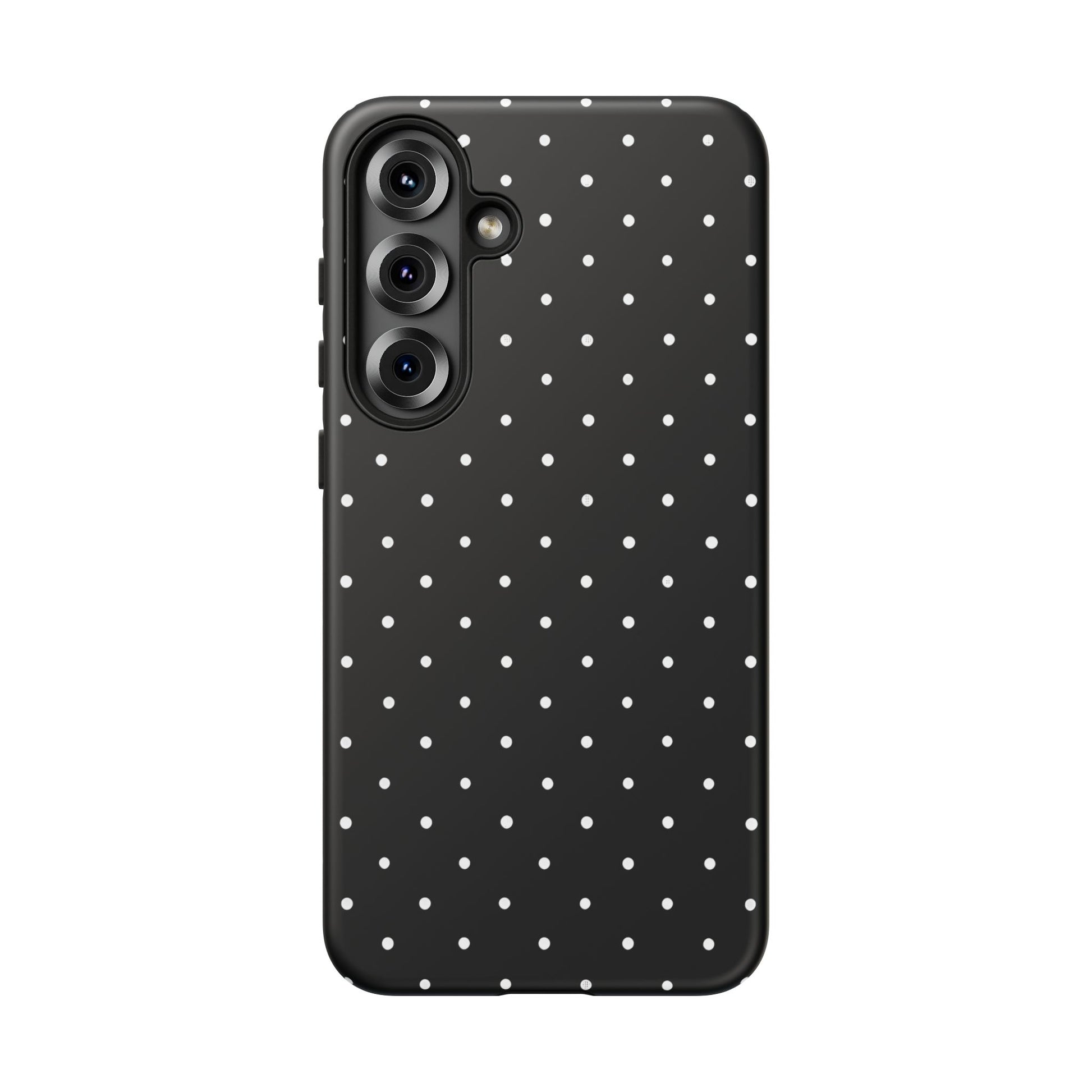 White dots scatter neatly across a deep black canvas, creating a clean and timeless repeating pattern. Subtle matte tones enhance the elegant simplicity of this classic design.