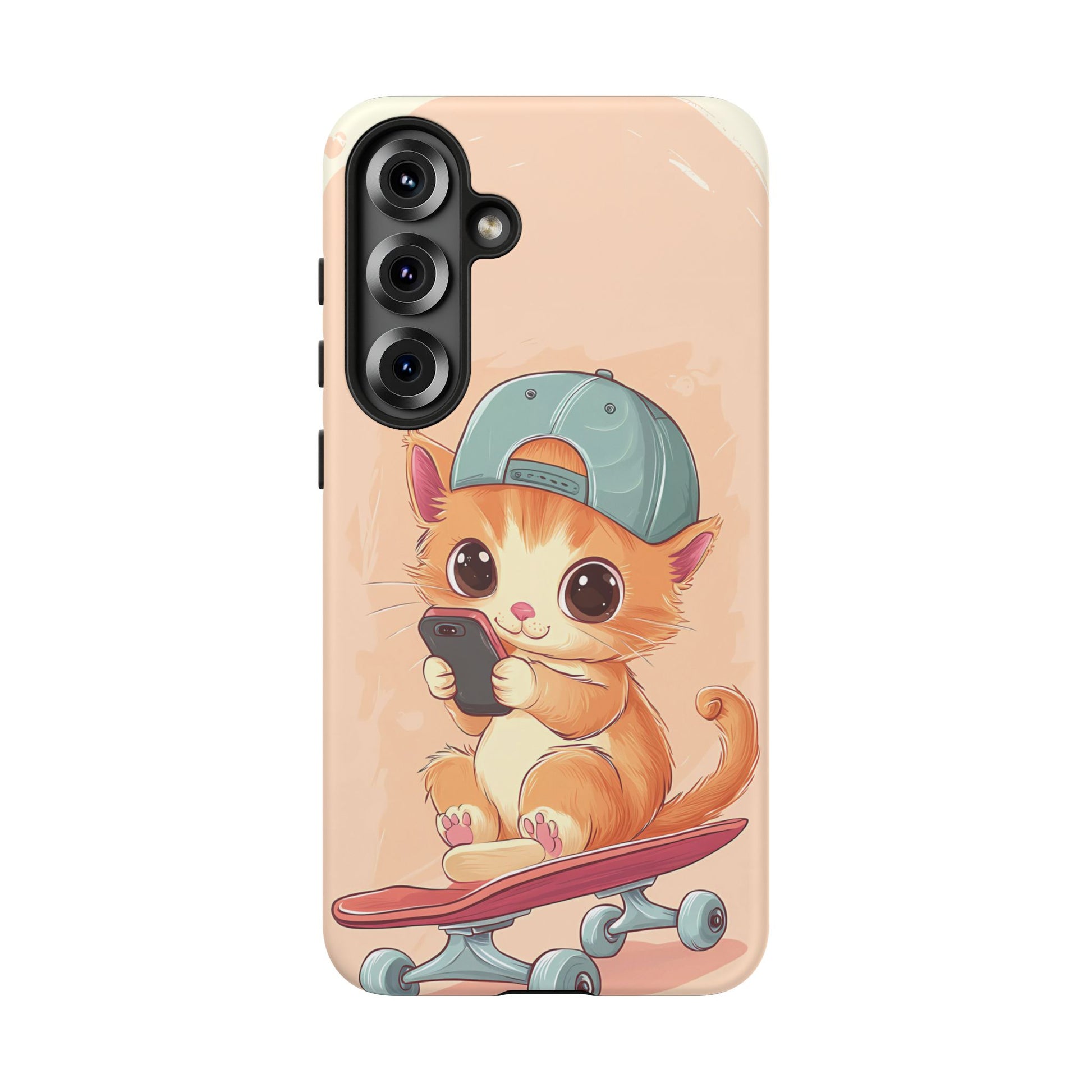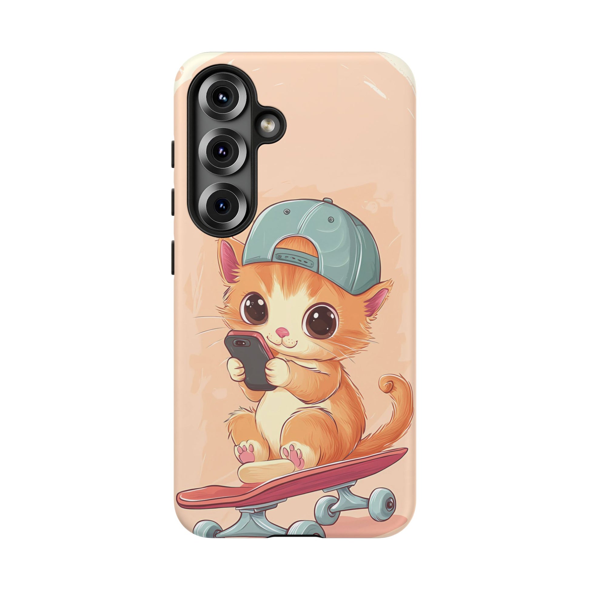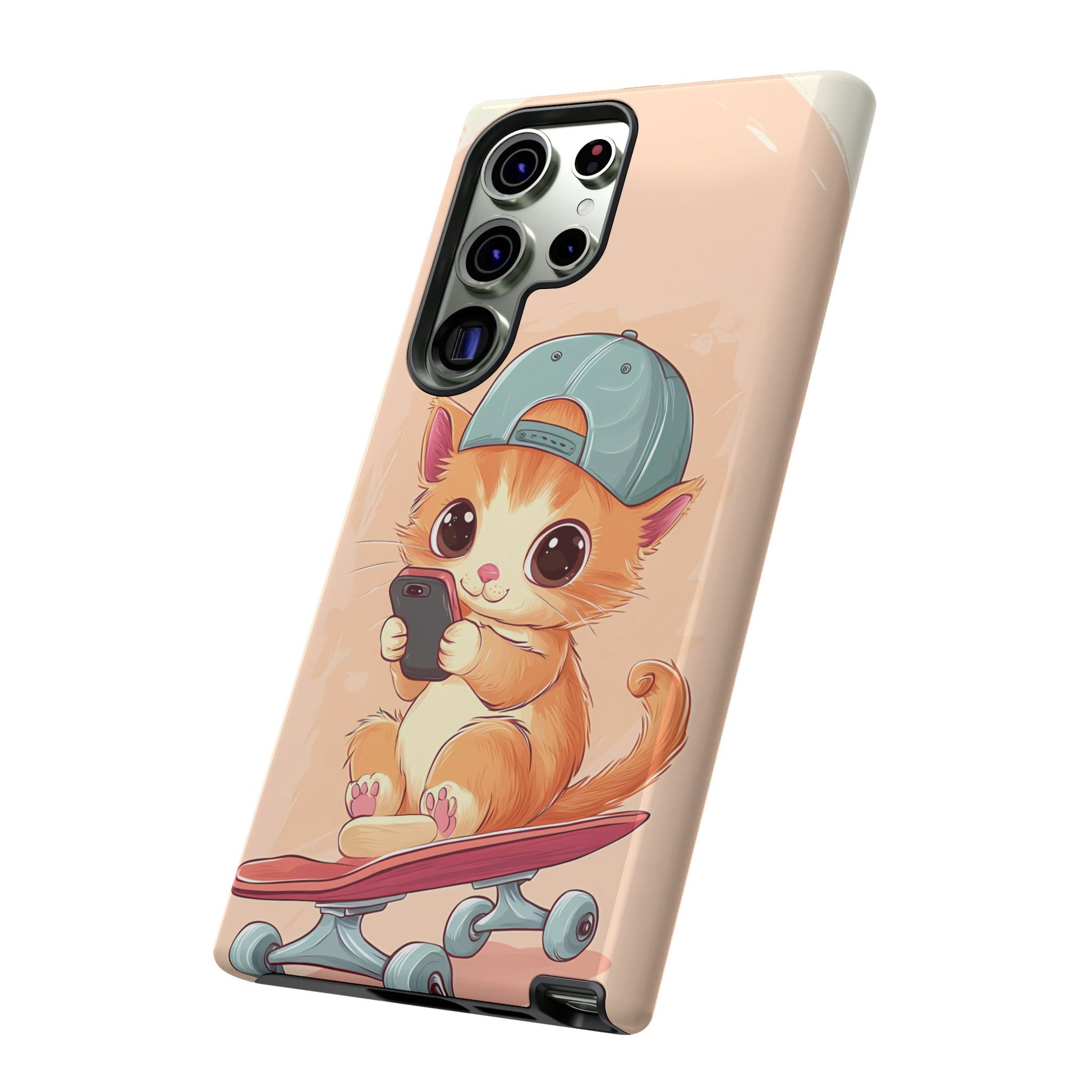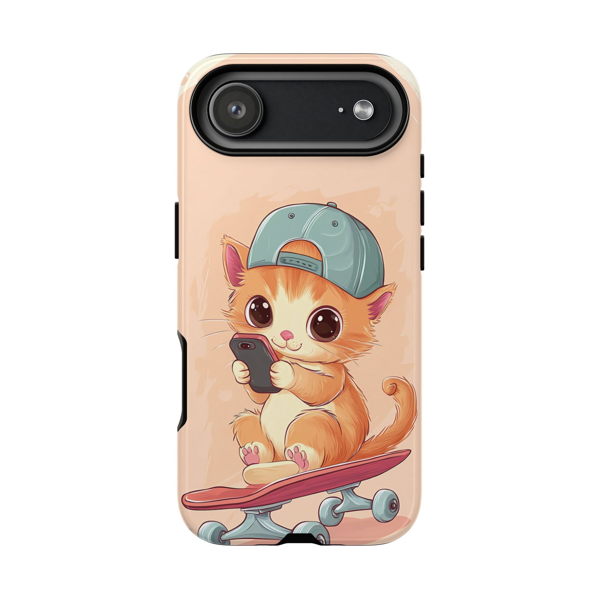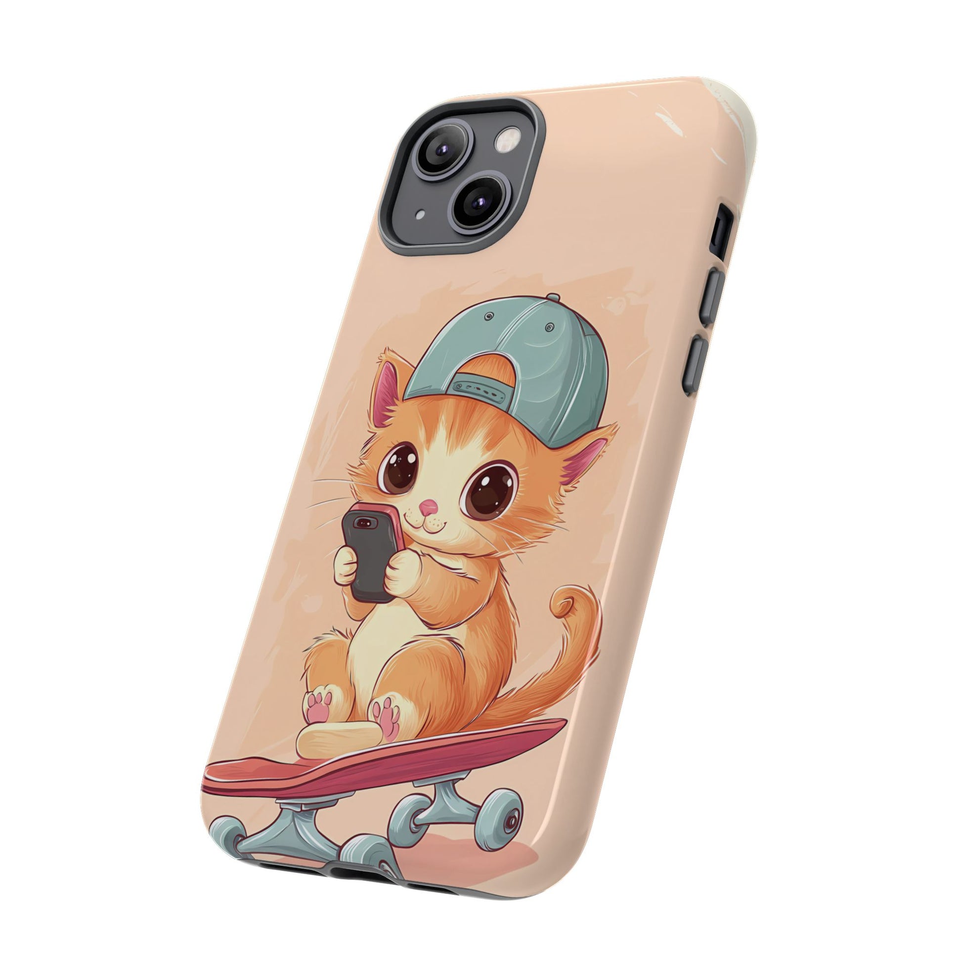 A laid-back feline with a street-style twist! This adorable cartoon cat, rocking a backward cap and skateboard, is caught scrolling on their phone. A must-have for those who love cute and quirky designs with a skater edge.