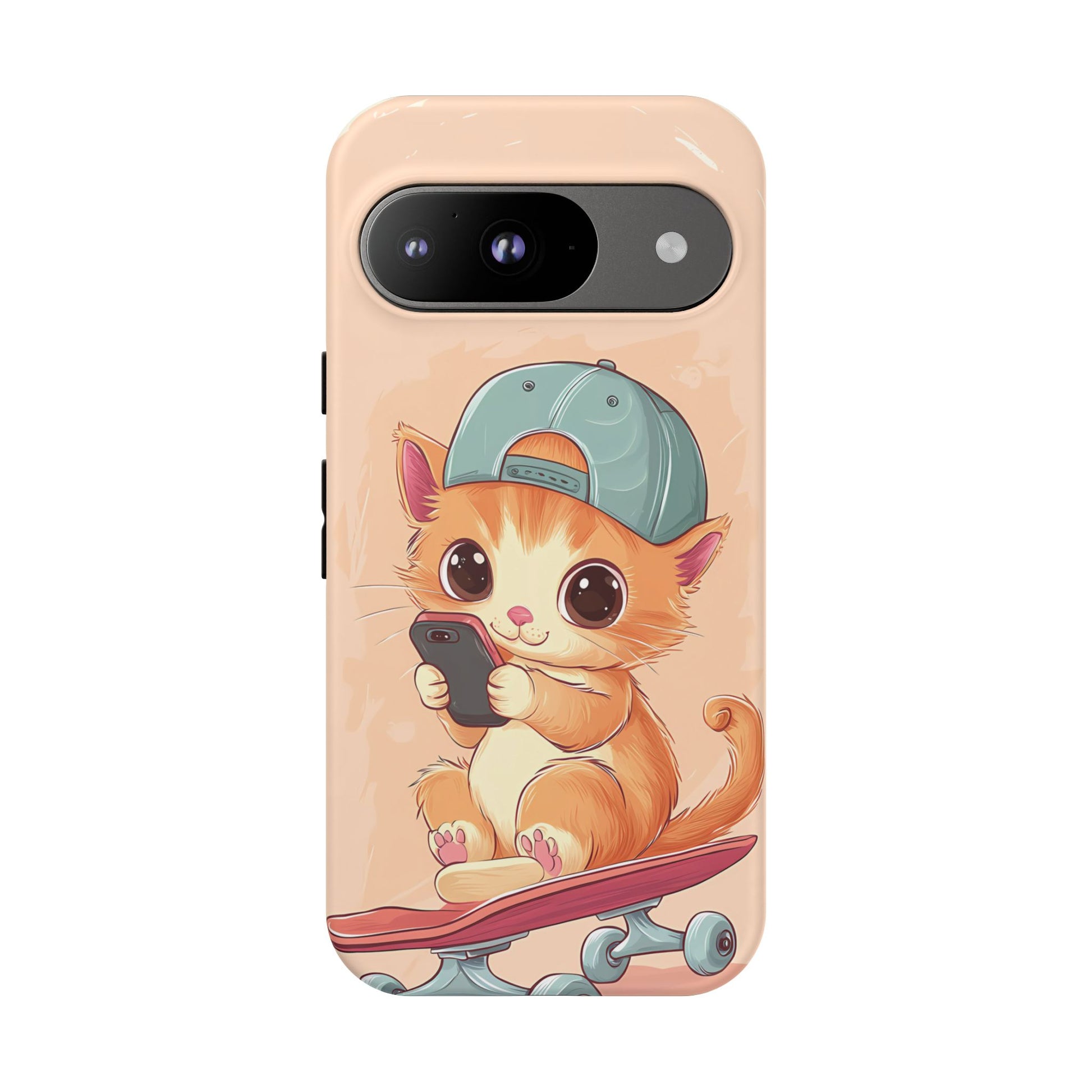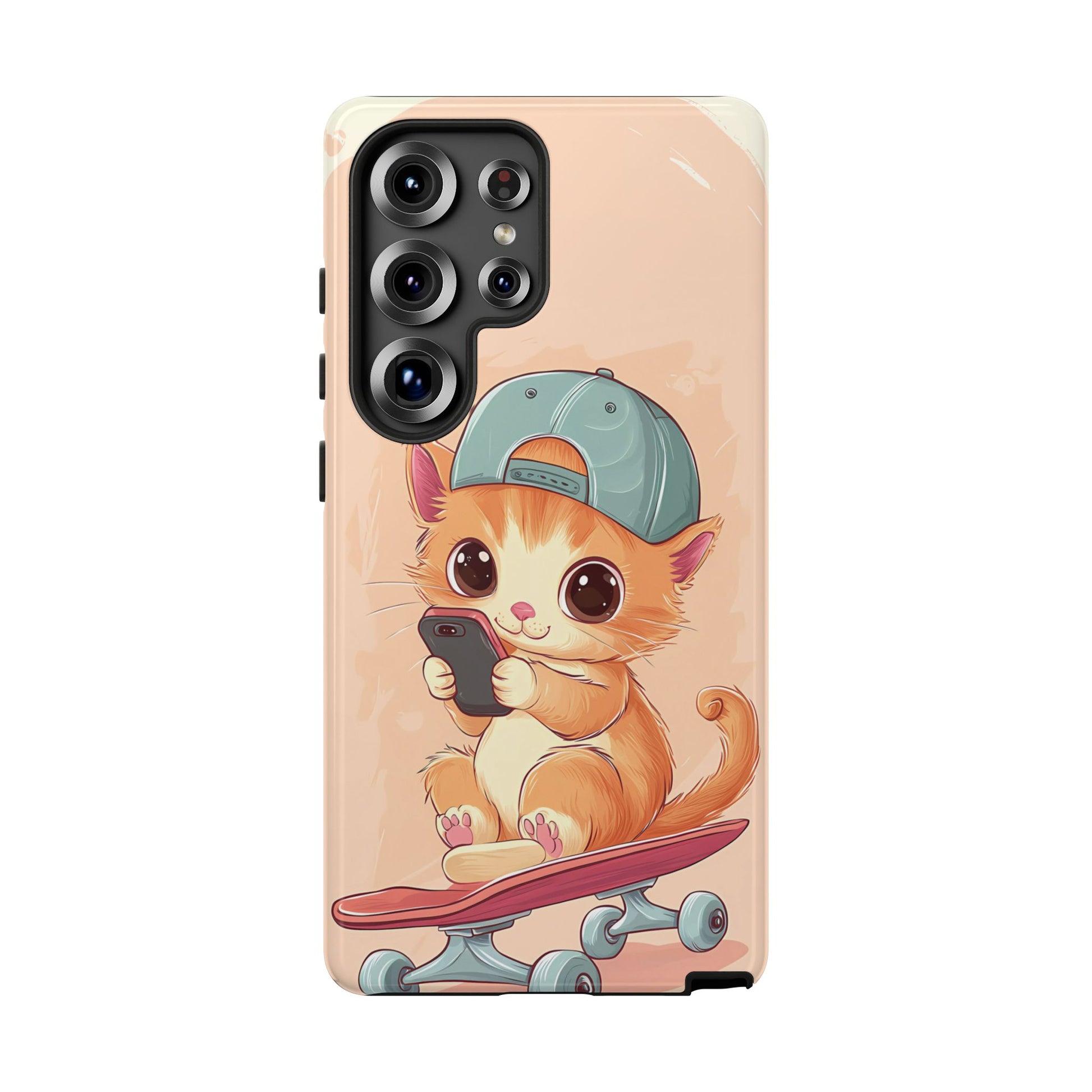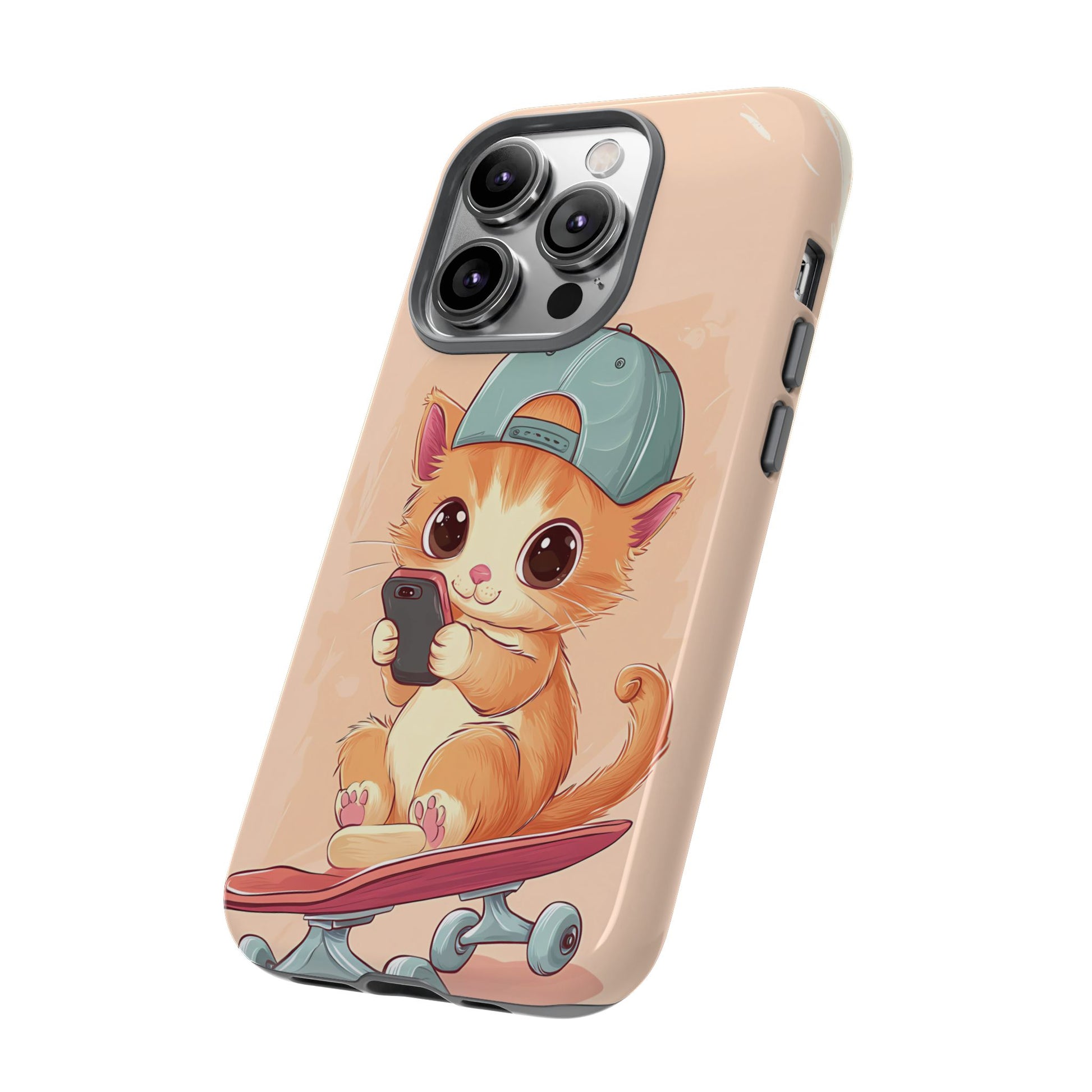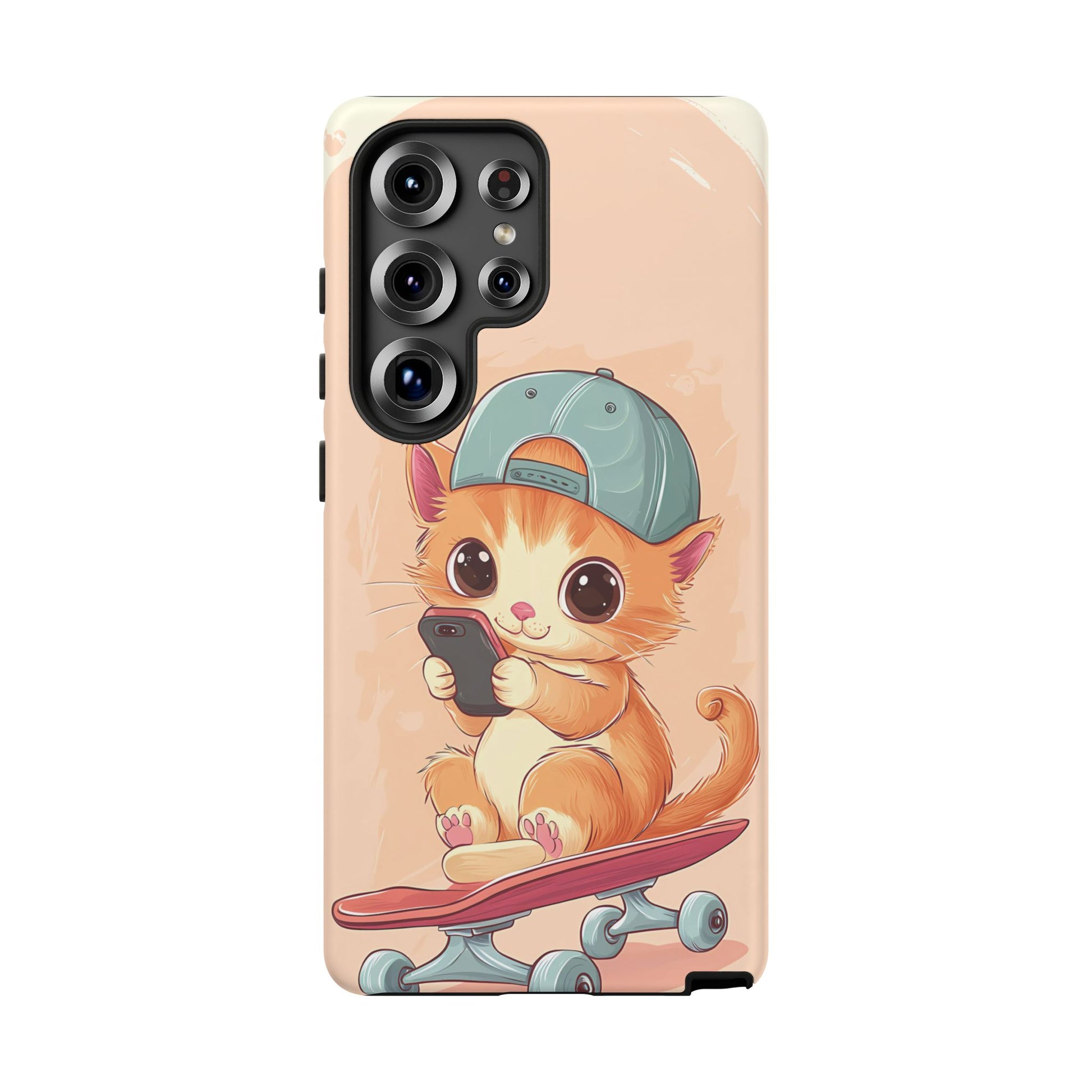A laid-back feline with a street-style twist! This adorable cartoon cat, rocking a backward cap and skateboard, is caught scrolling on their phone. A must-have for those who love cute and quirky designs with a skater edge.
