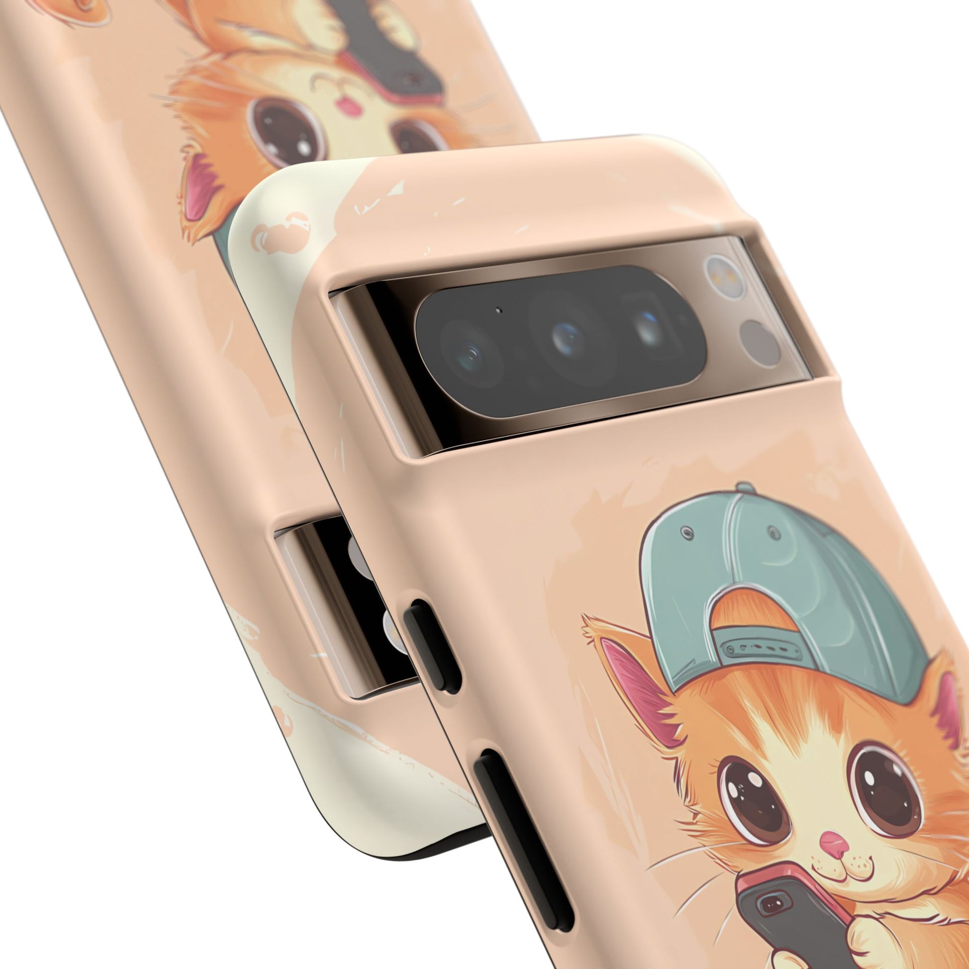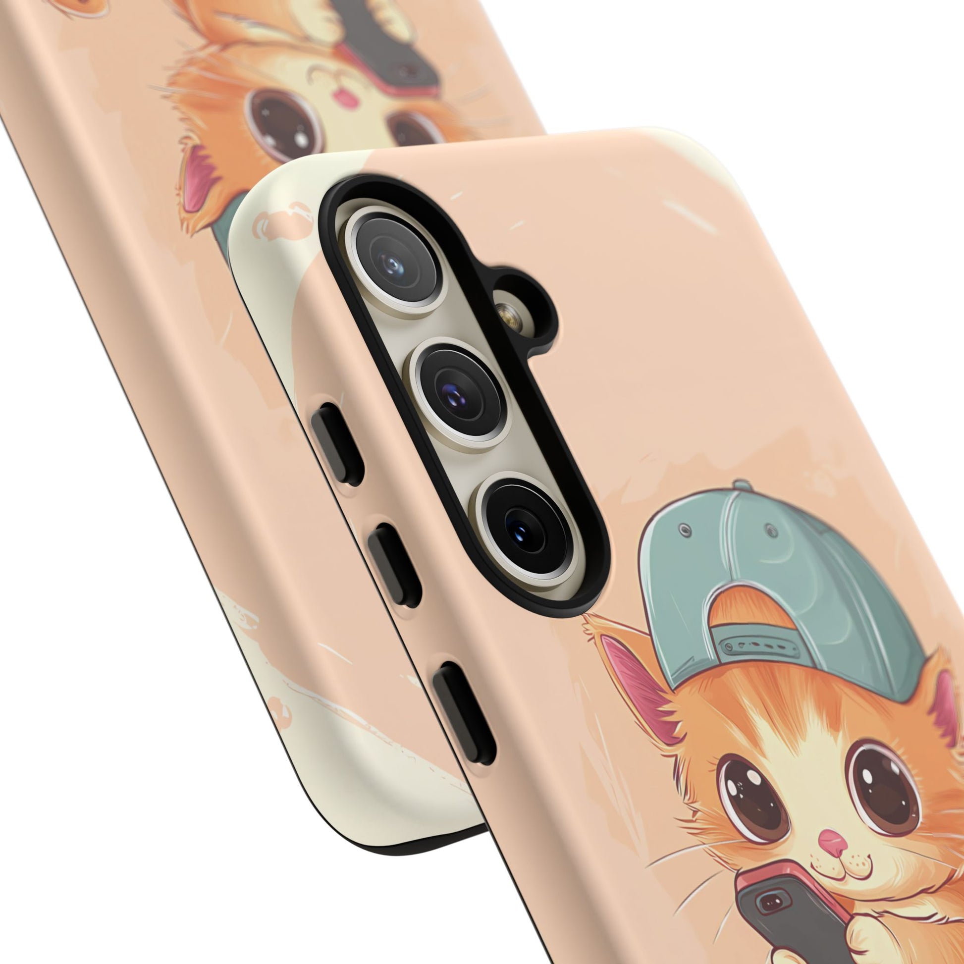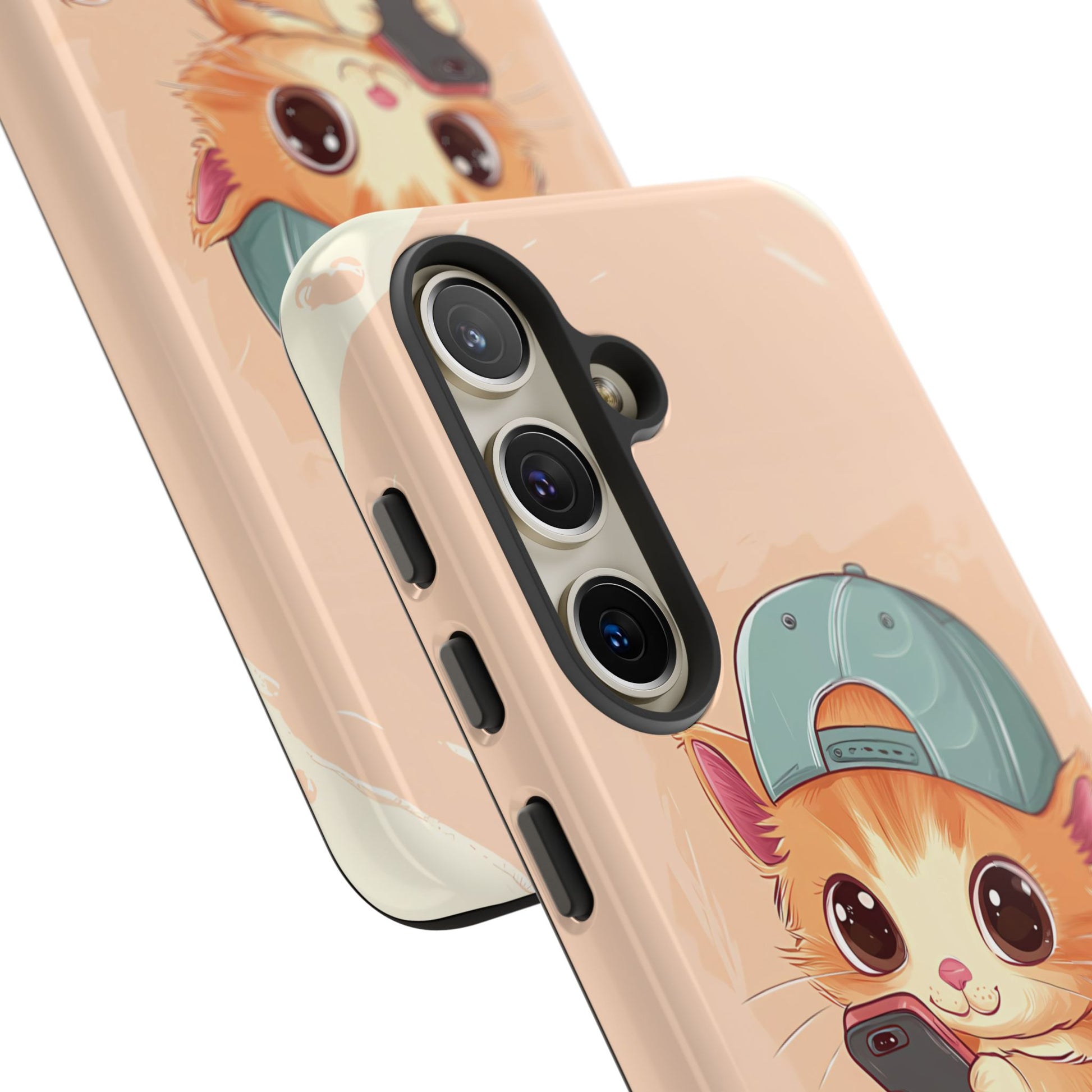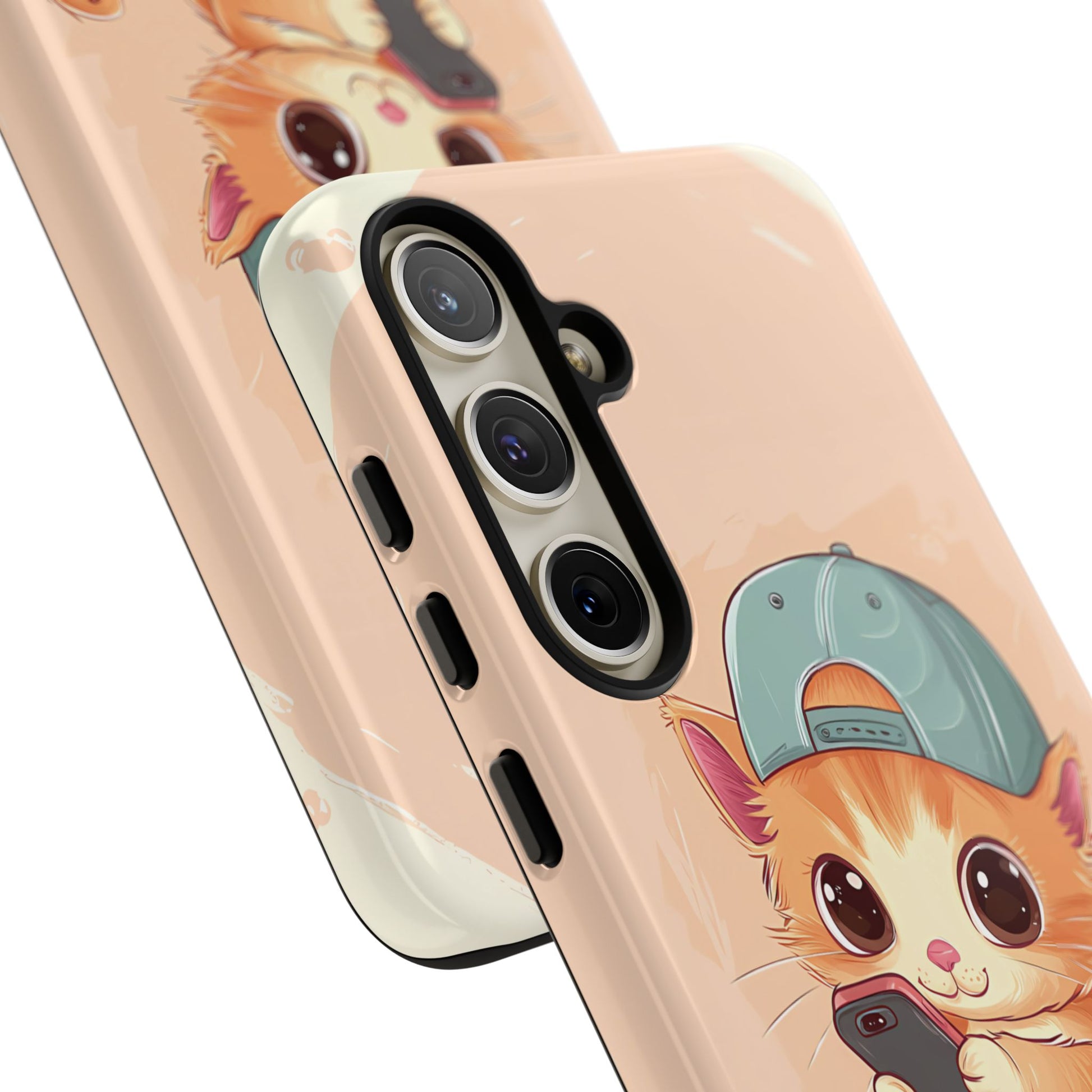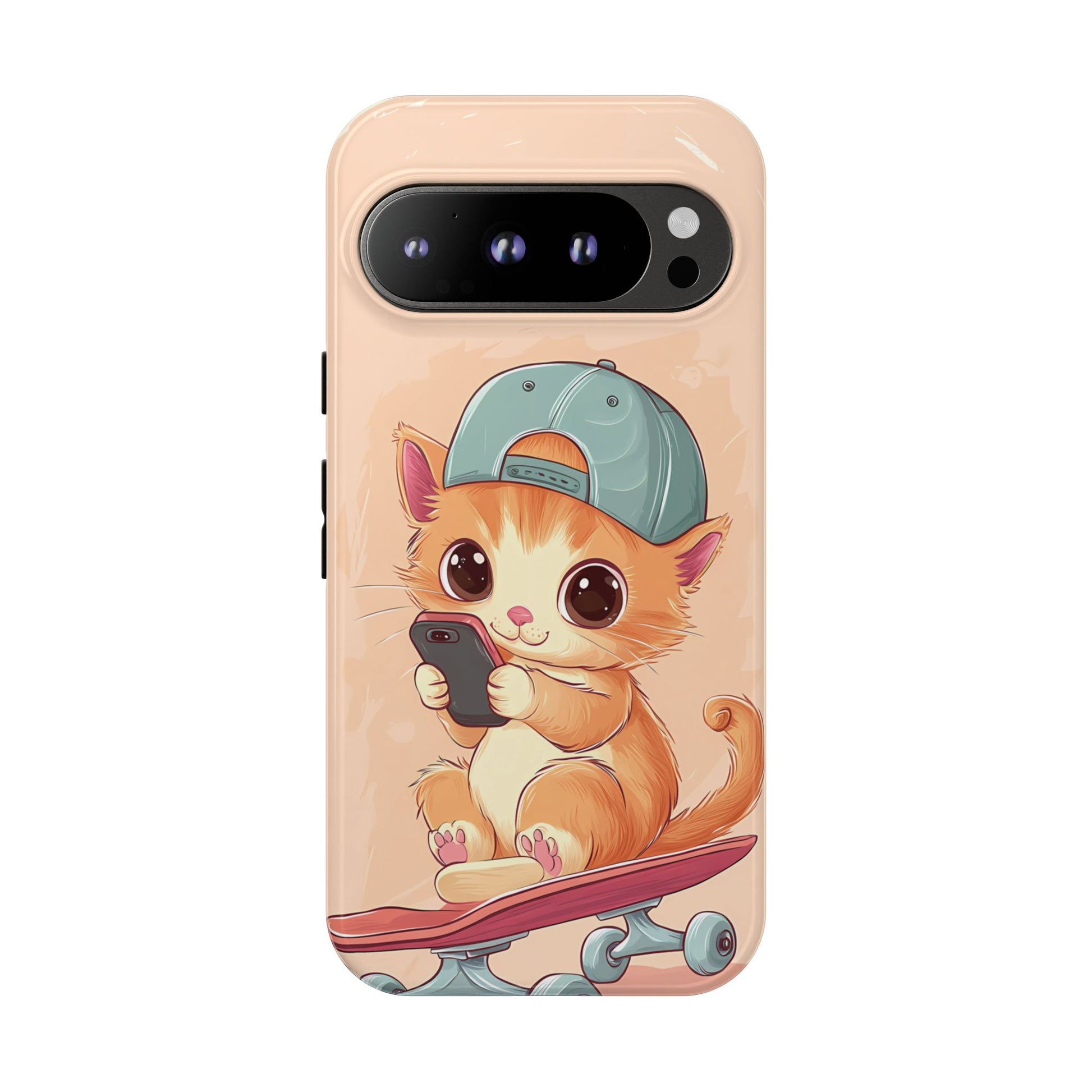 A laid-back feline with a street-style twist! This adorable cartoon cat, rocking a backward cap and skateboard, is caught scrolling on their phone. A must-have for those who love cute and quirky designs with a skater edge.
