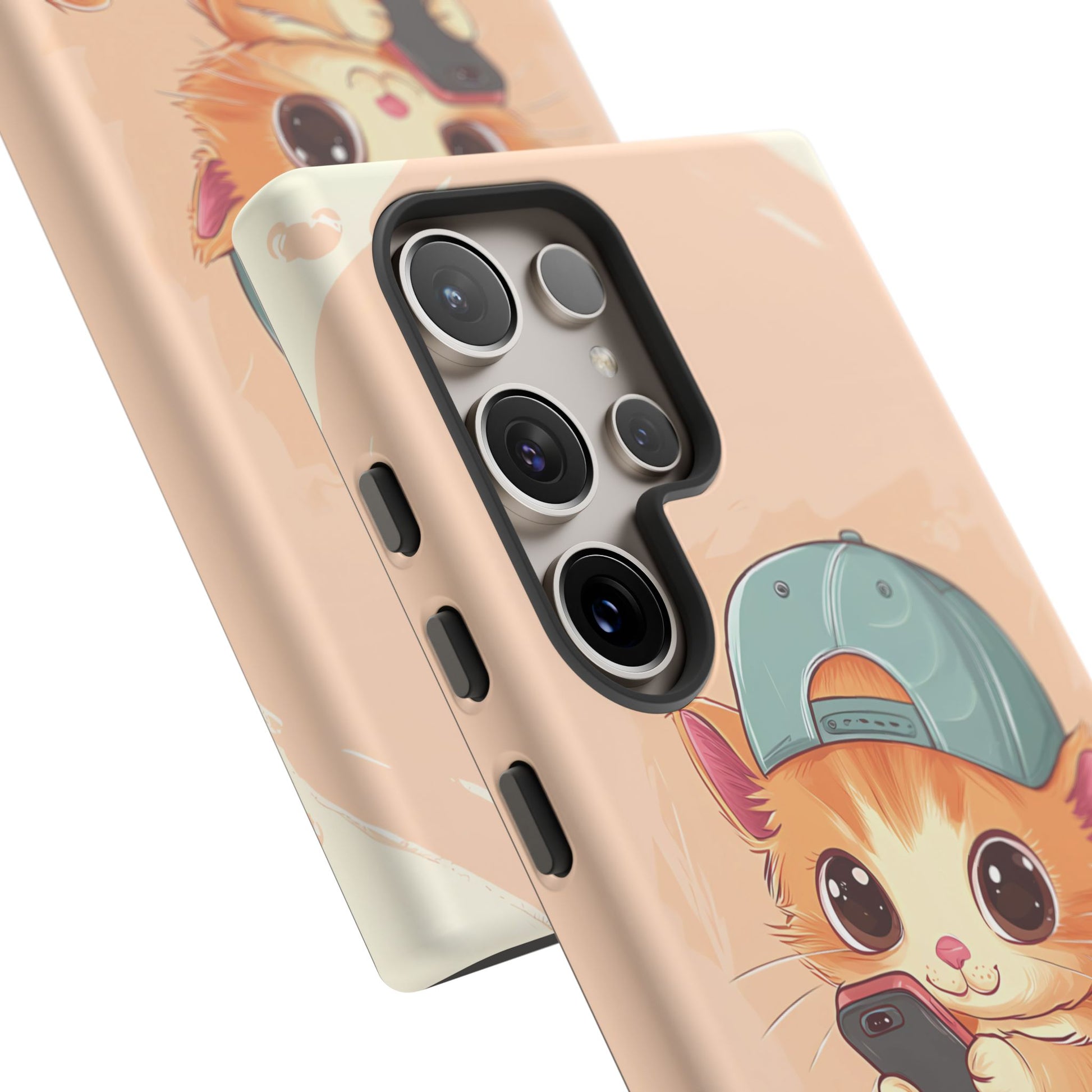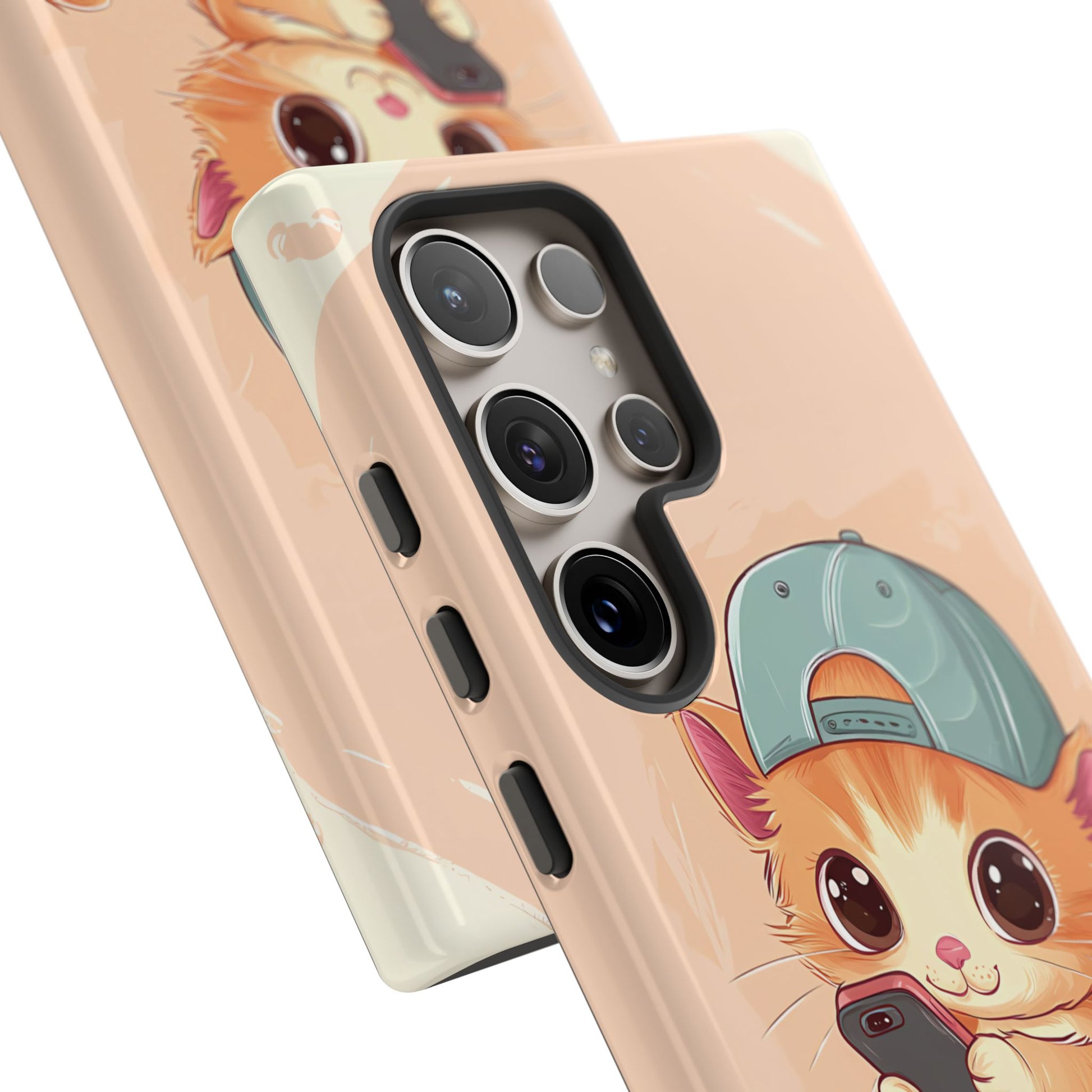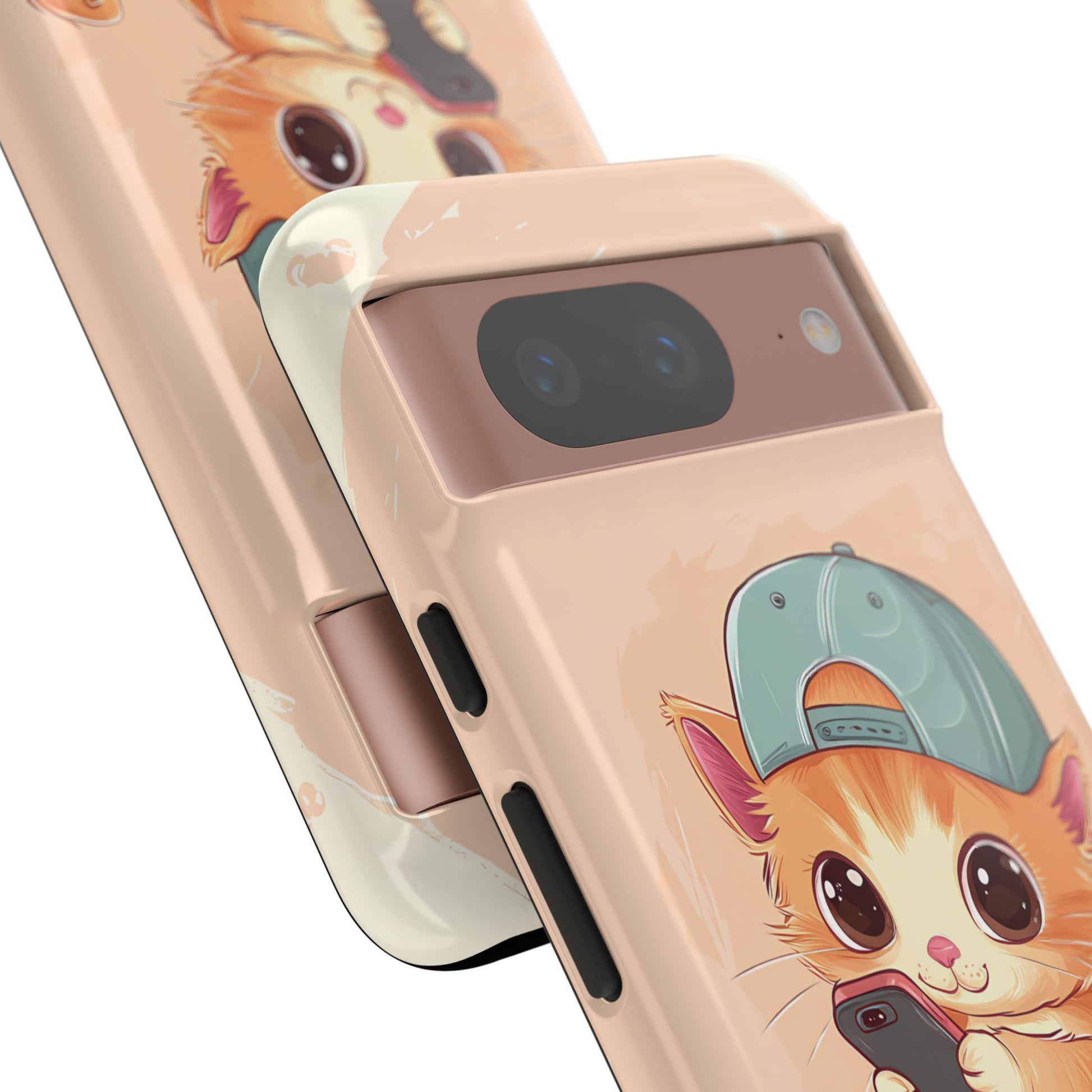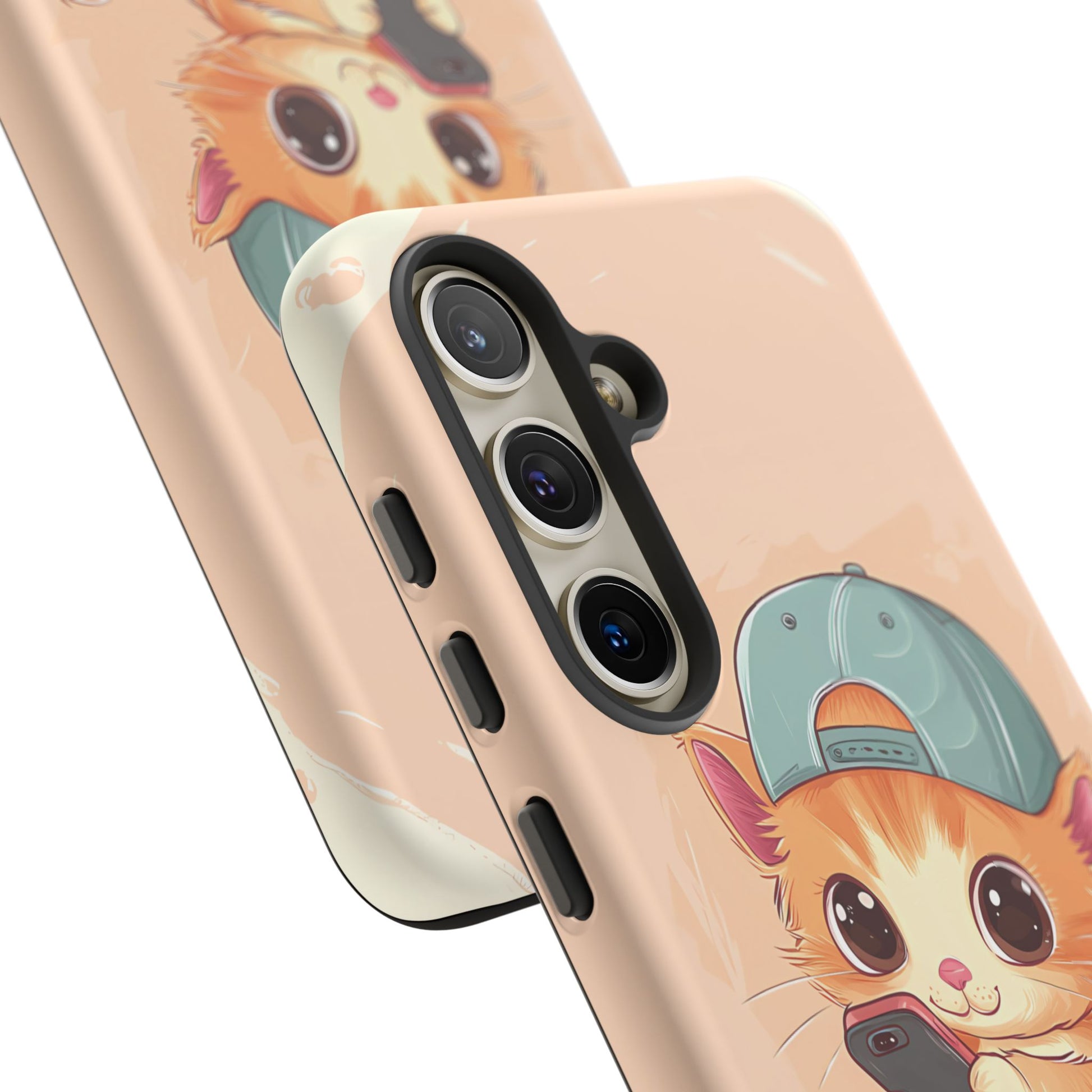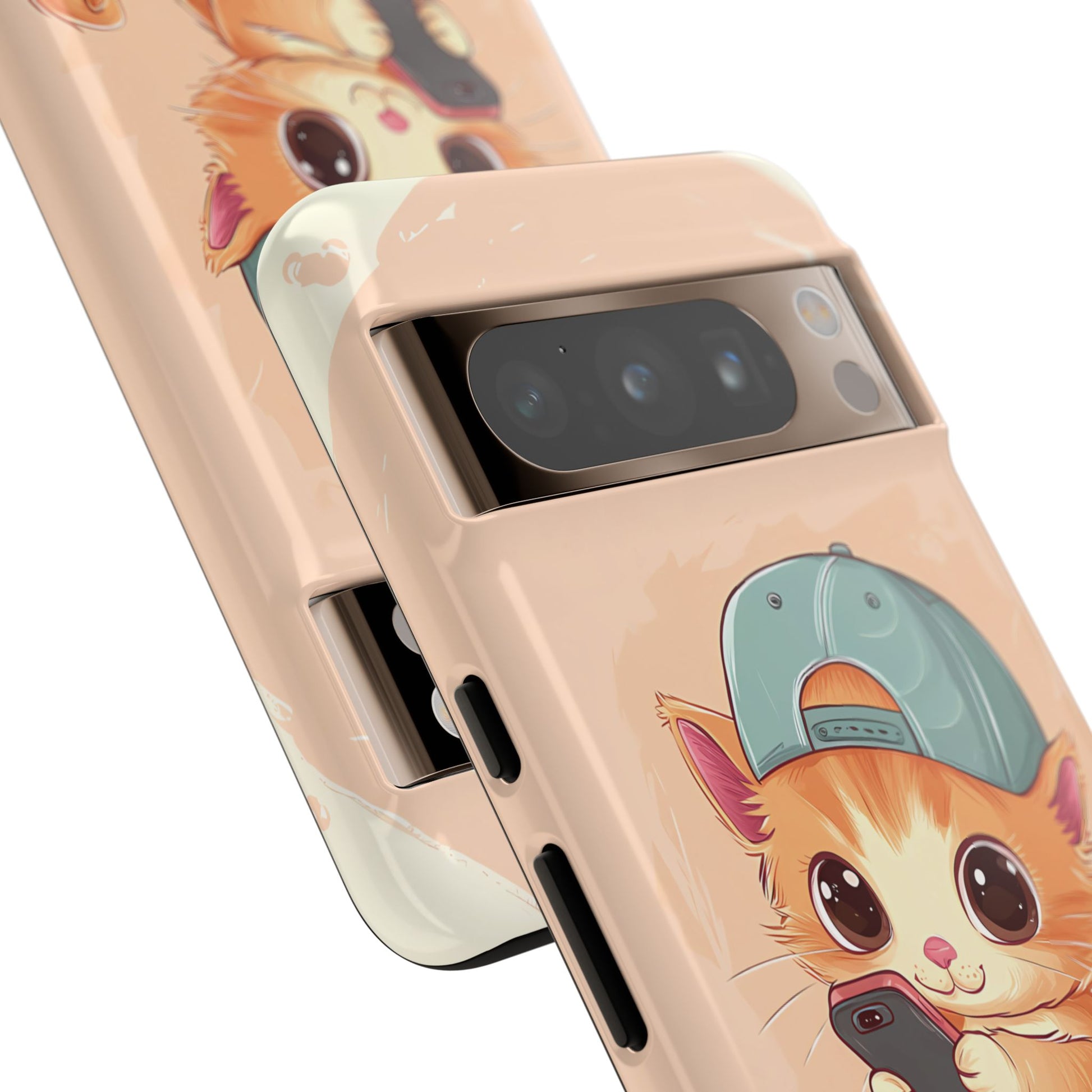 A laid-back feline with a street-style twist! This adorable cartoon cat, rocking a backward cap and skateboard, is caught scrolling on their phone. A must-have for those who love cute and quirky designs with a skater edge.
