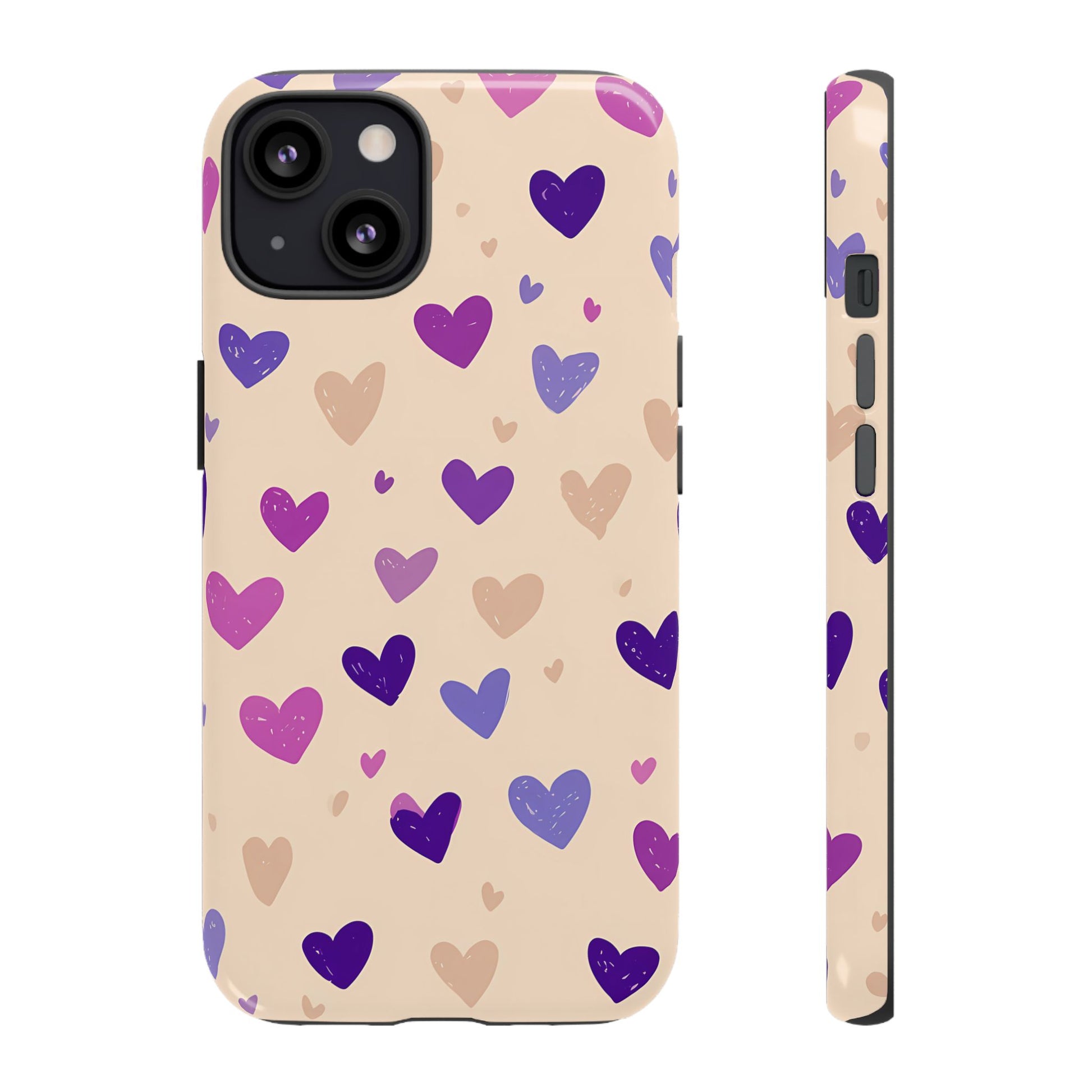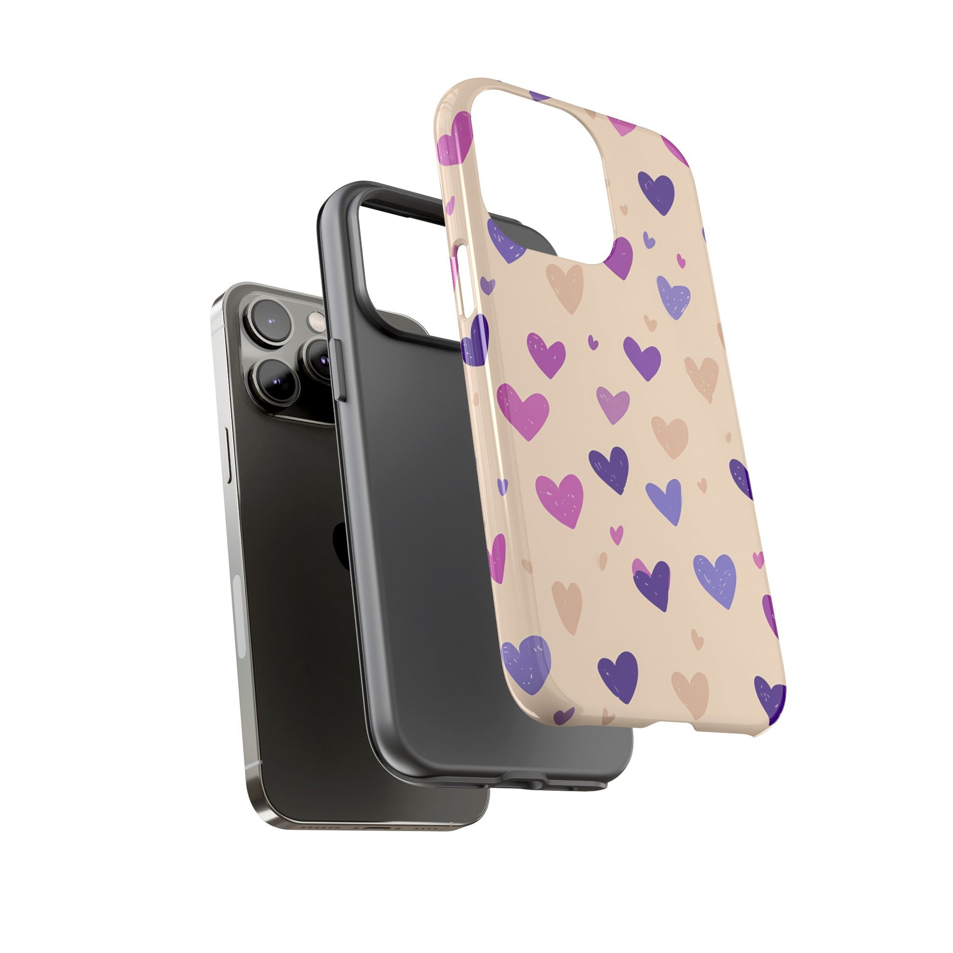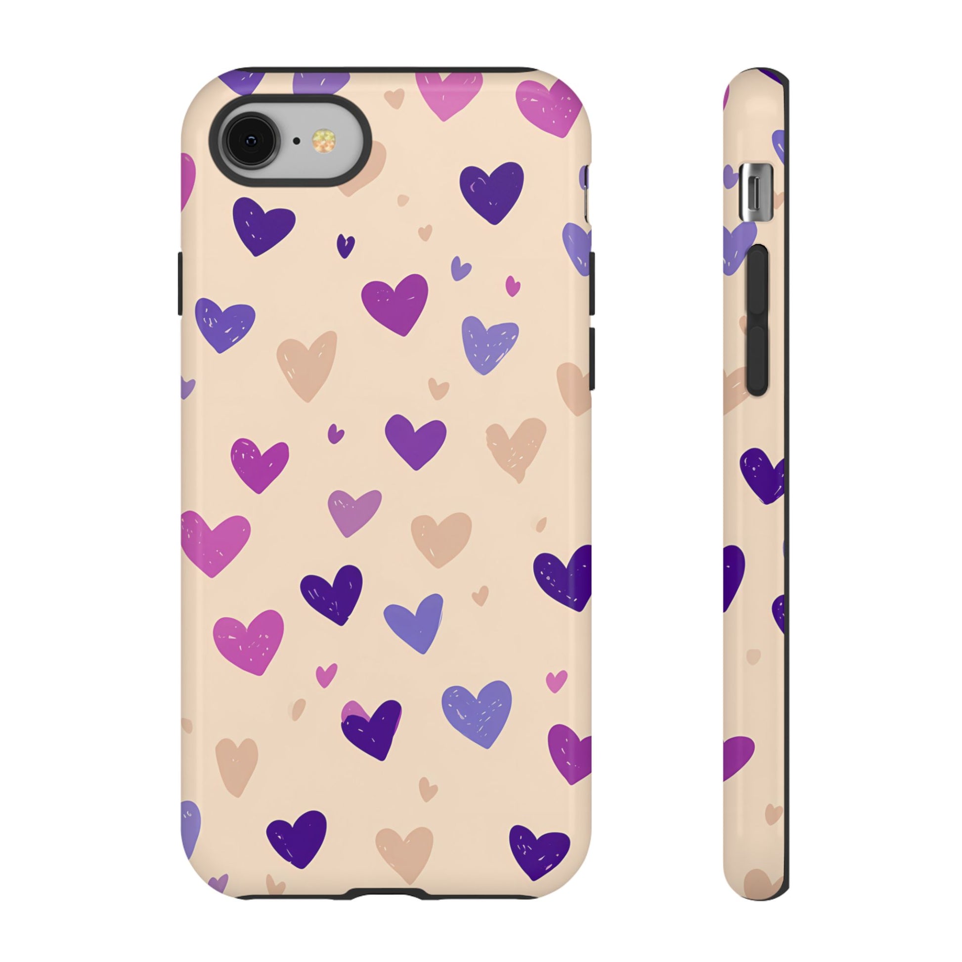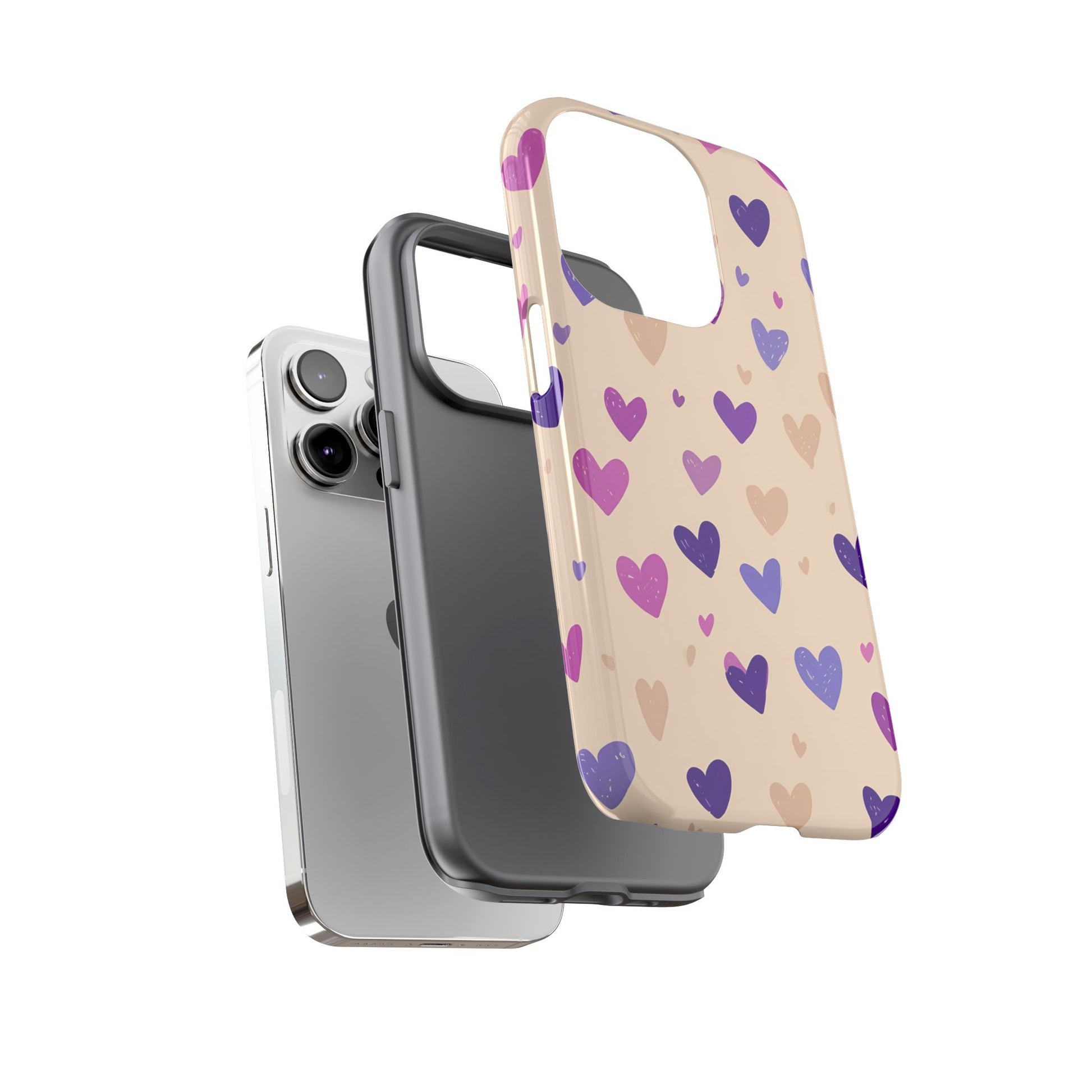 A soft, minimal pattern of purple and pink hearts floating on a gentle beige background, creating a cute and simple design full of charm.