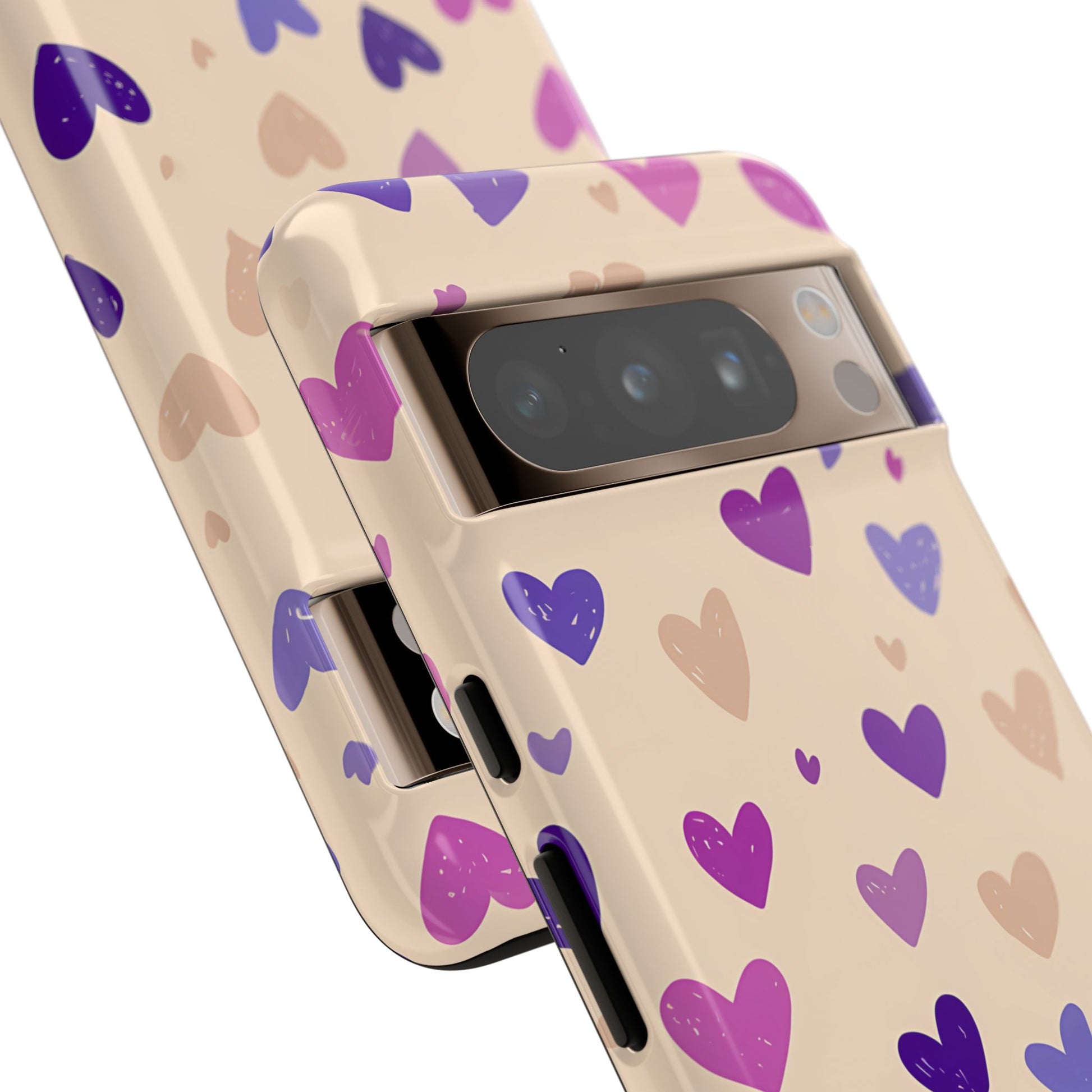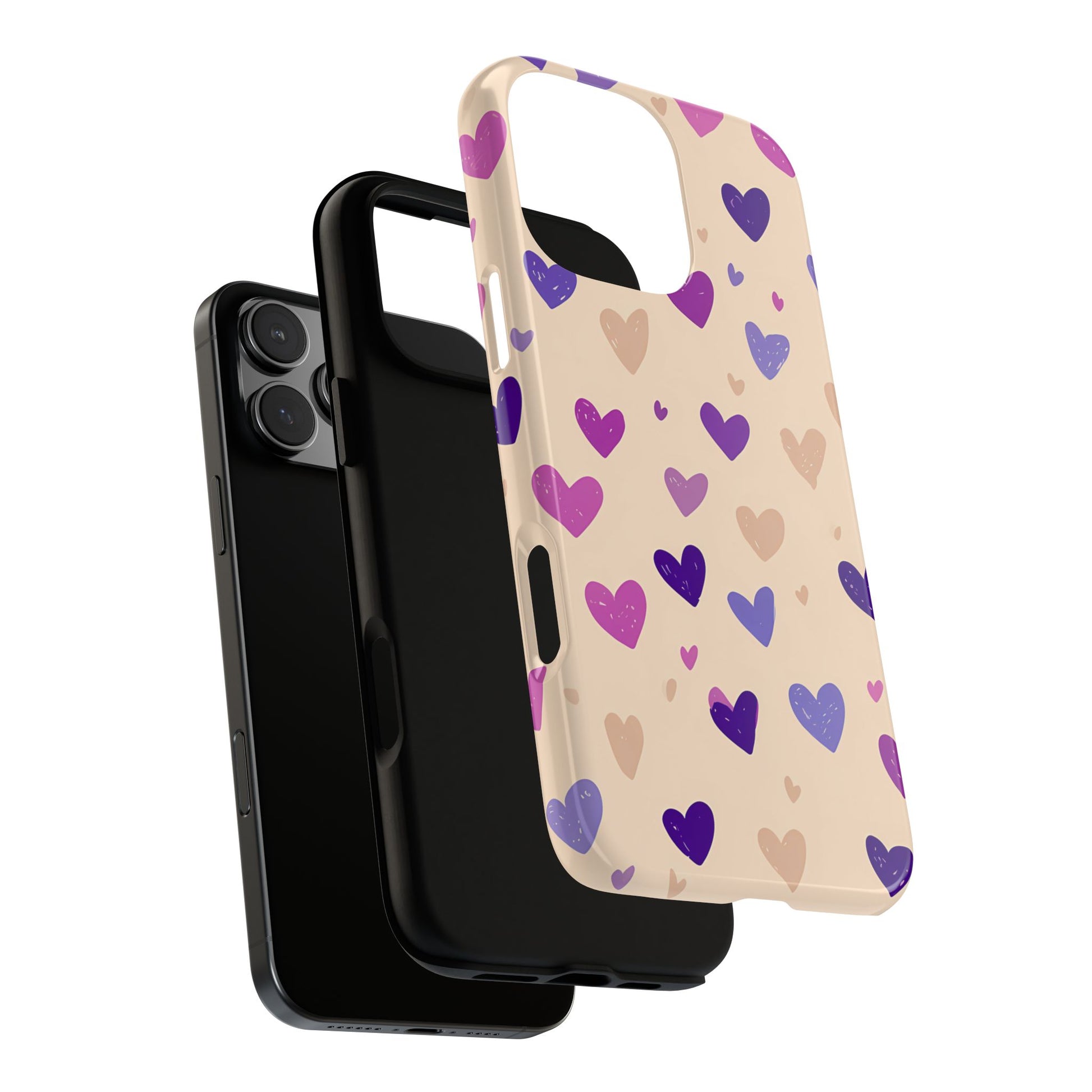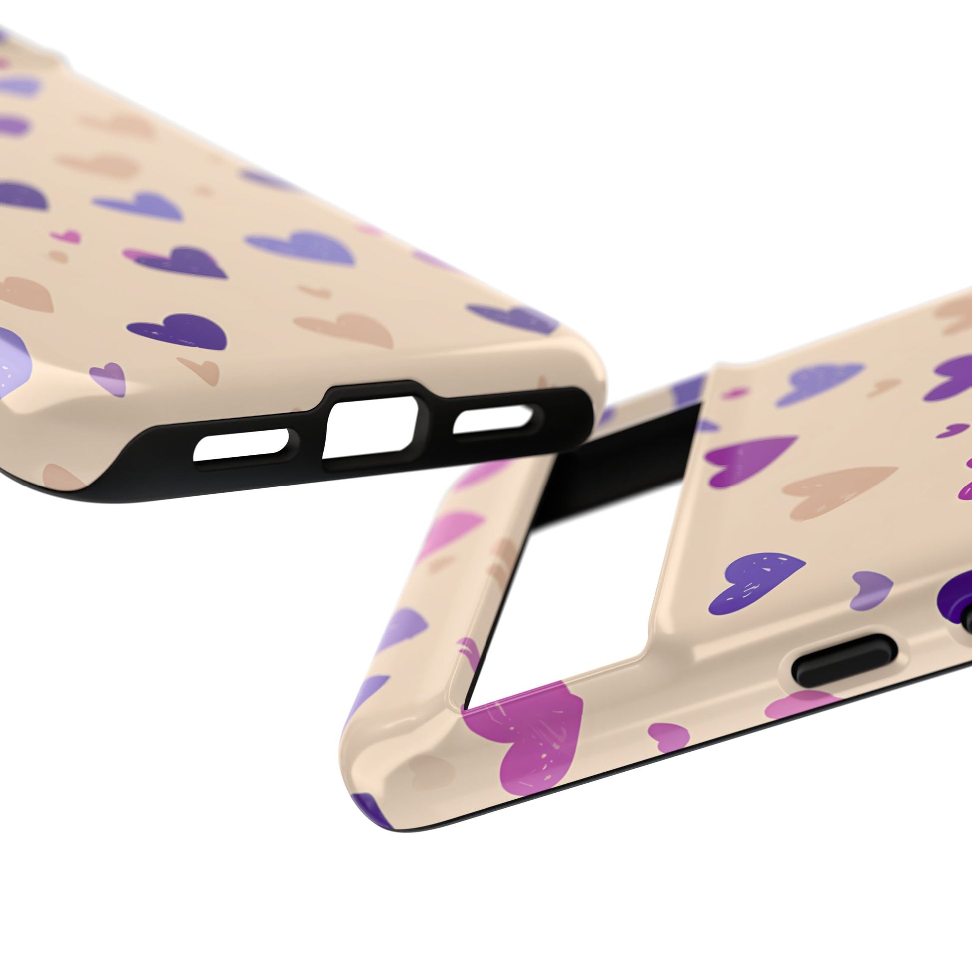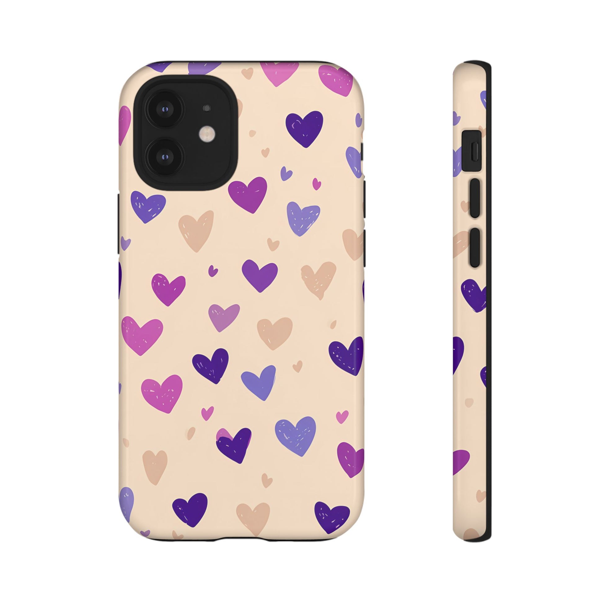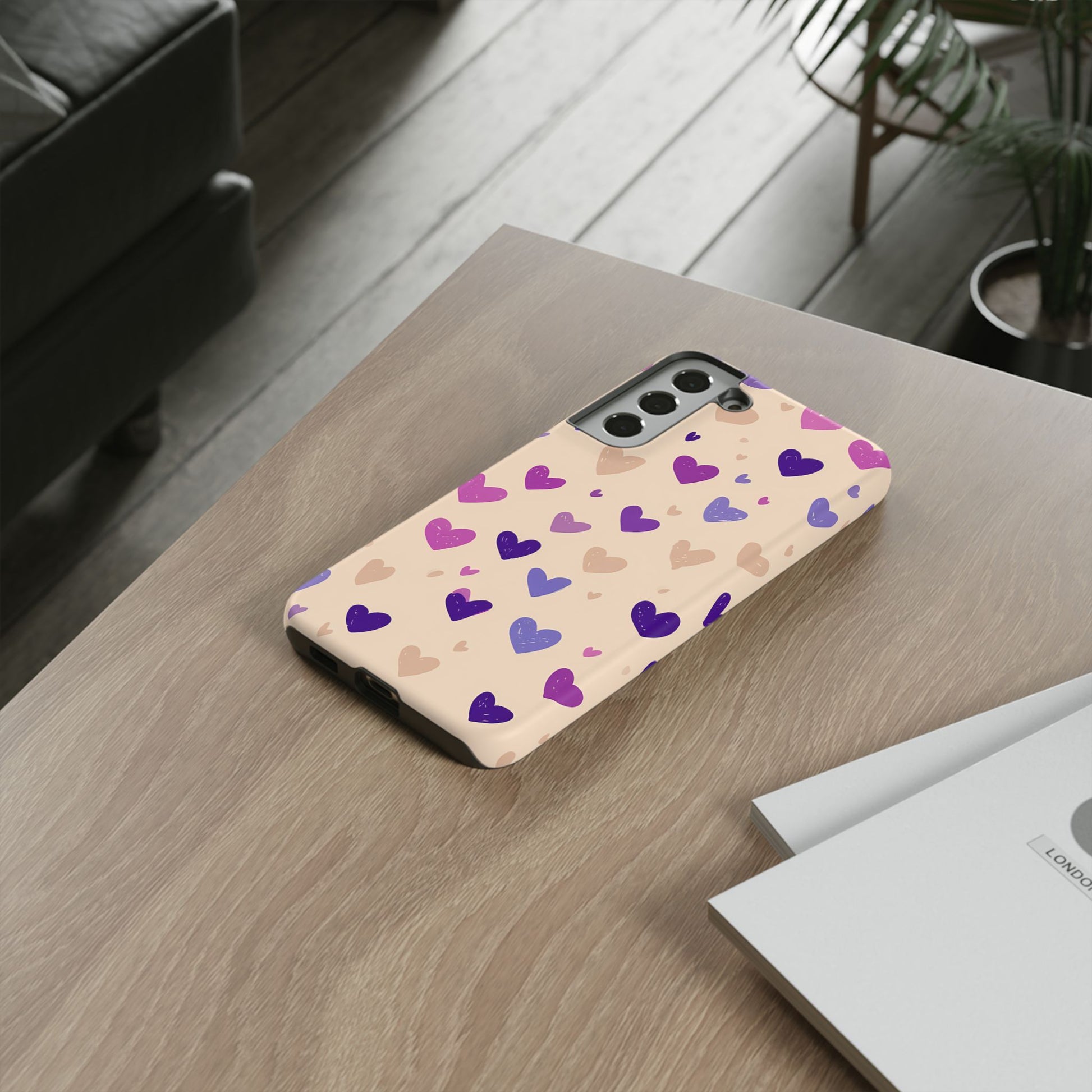 A soft, minimal pattern of purple and pink hearts floating on a gentle beige background, creating a cute and simple design full of charm.