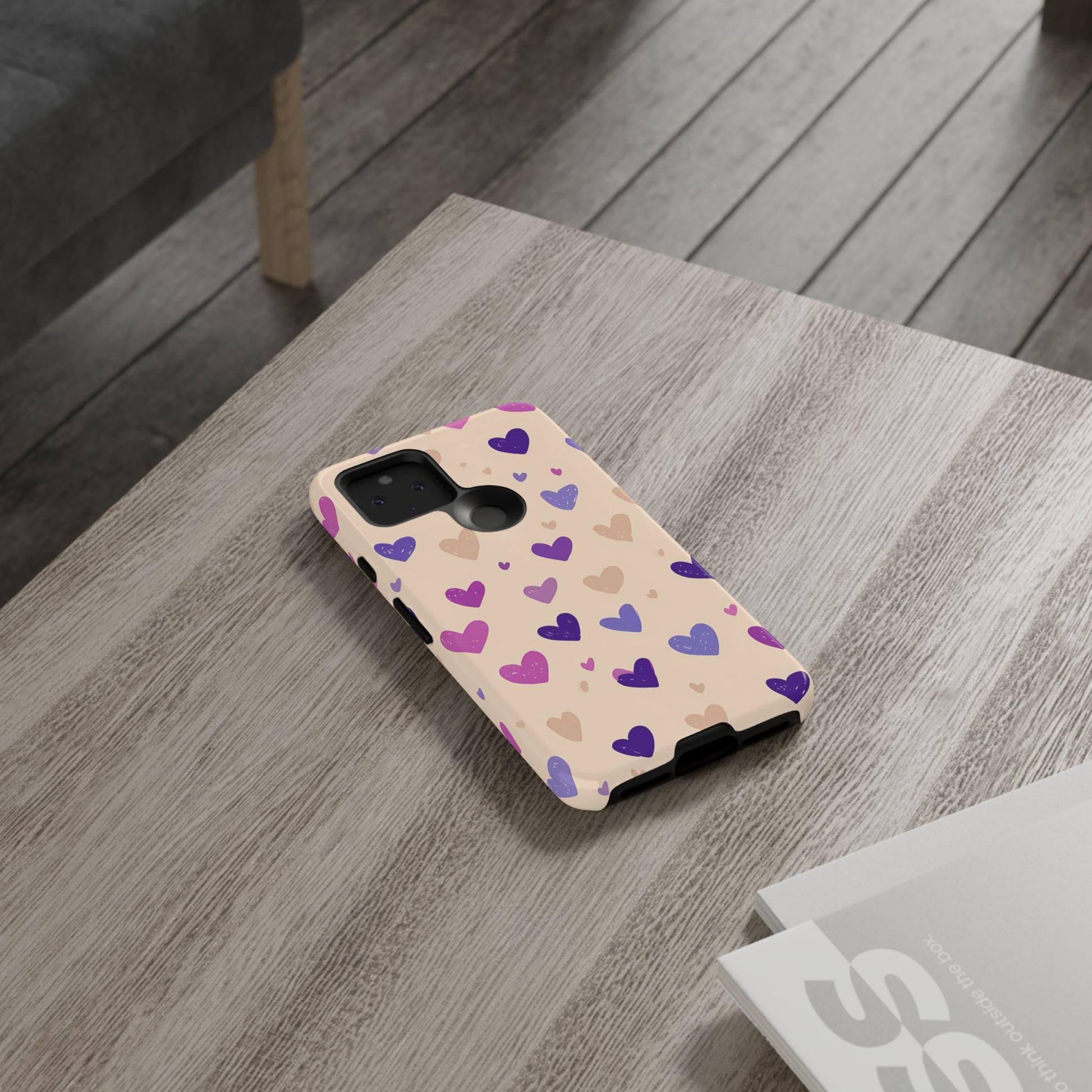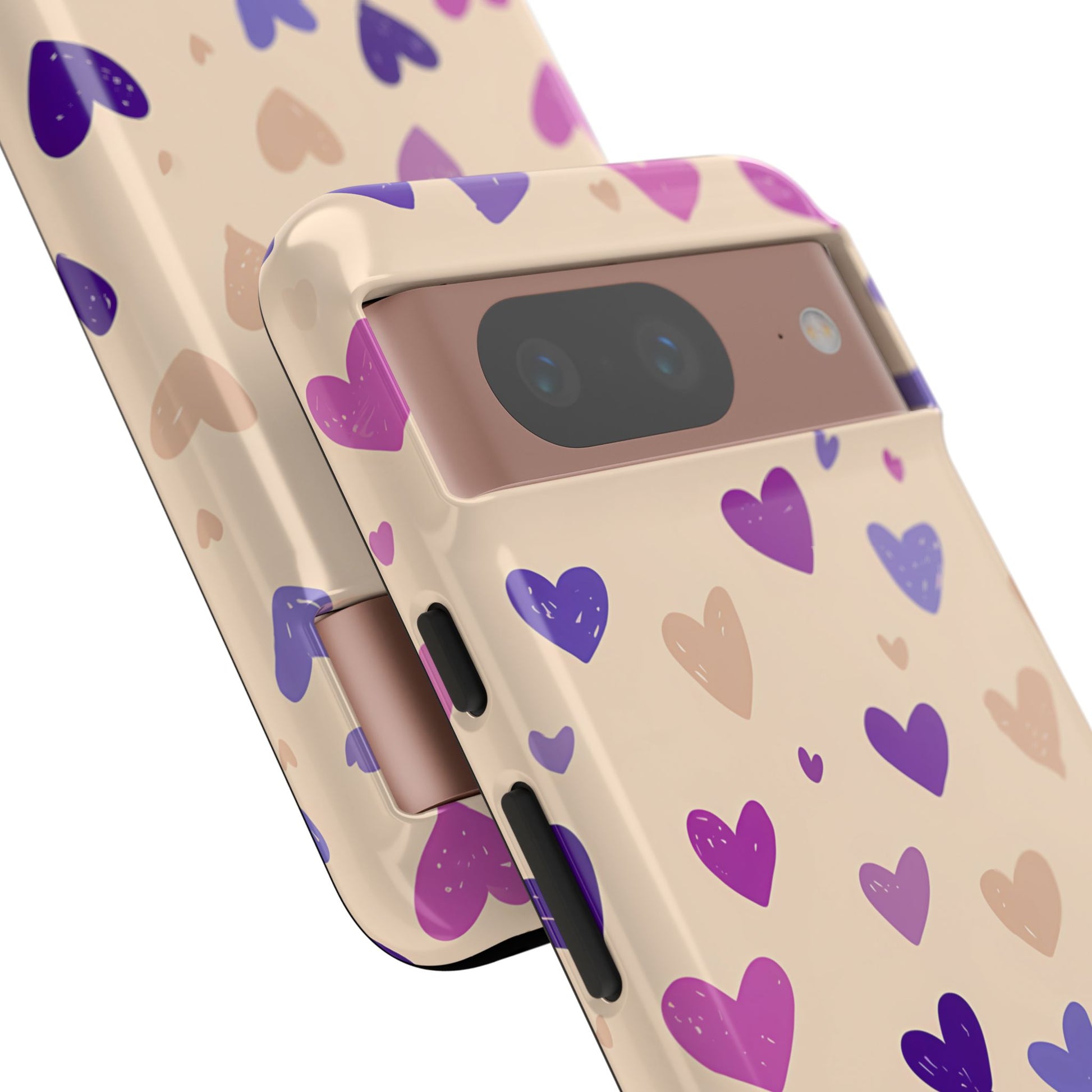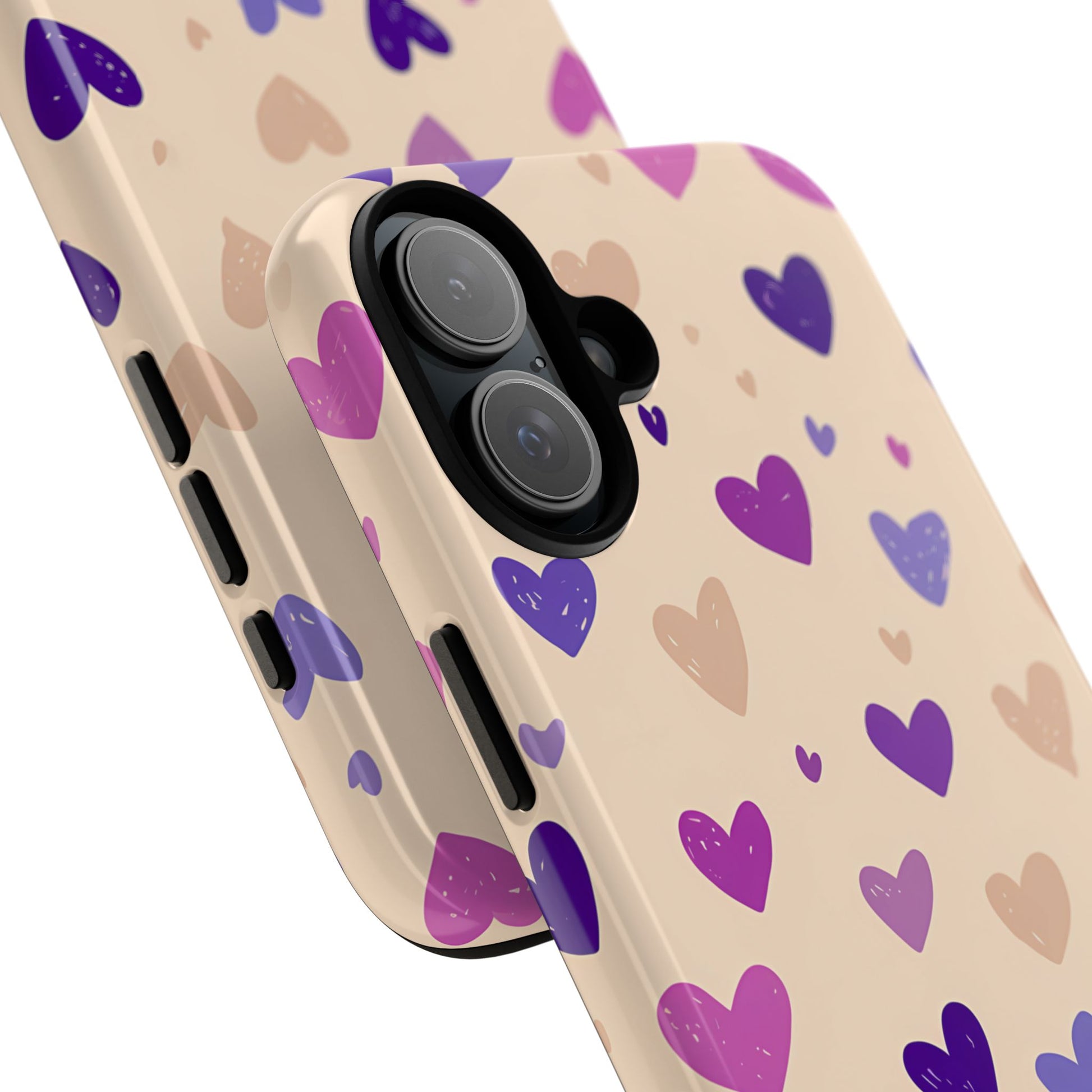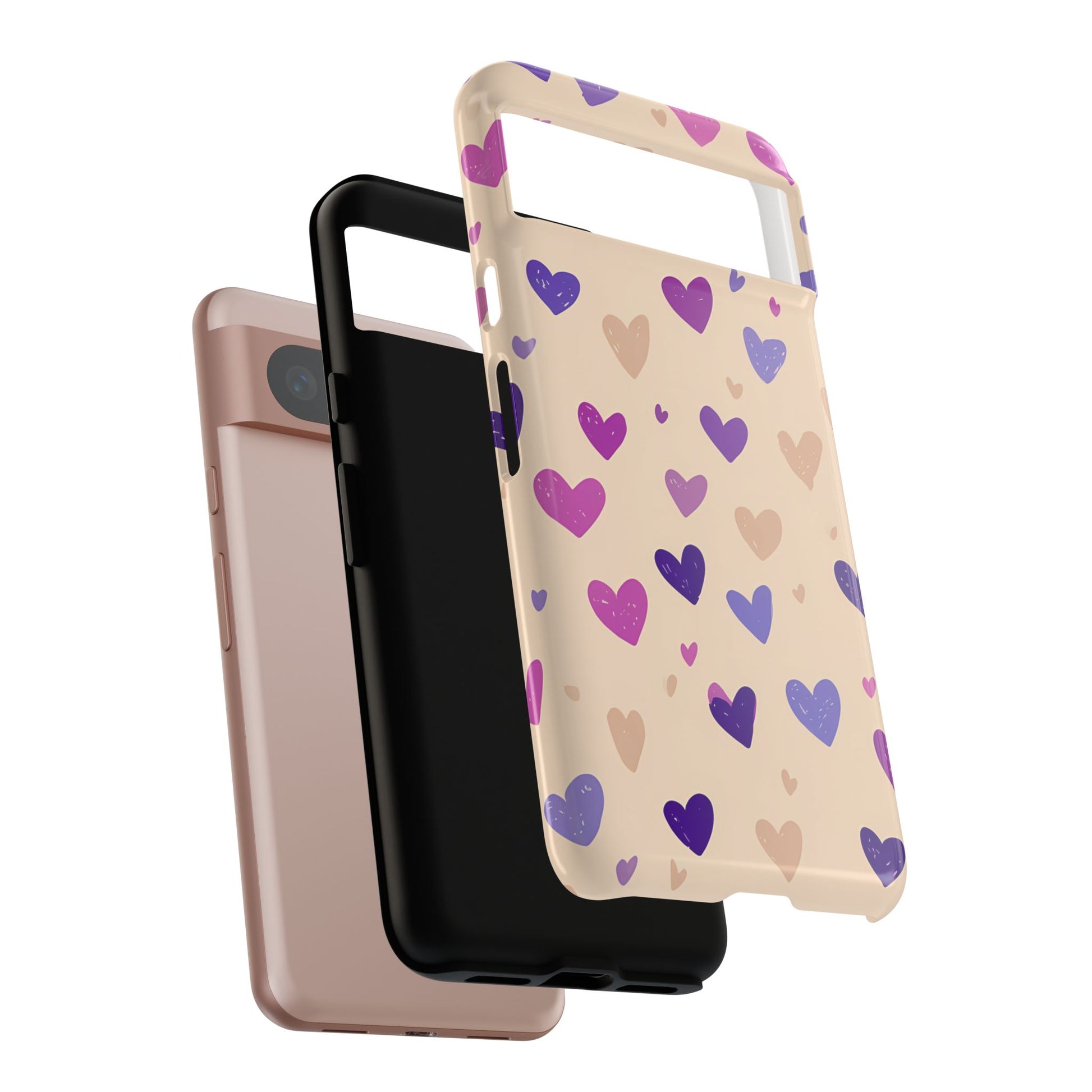 A soft, minimal pattern of purple and pink hearts floating on a gentle beige background, creating a cute and simple design full of charm.