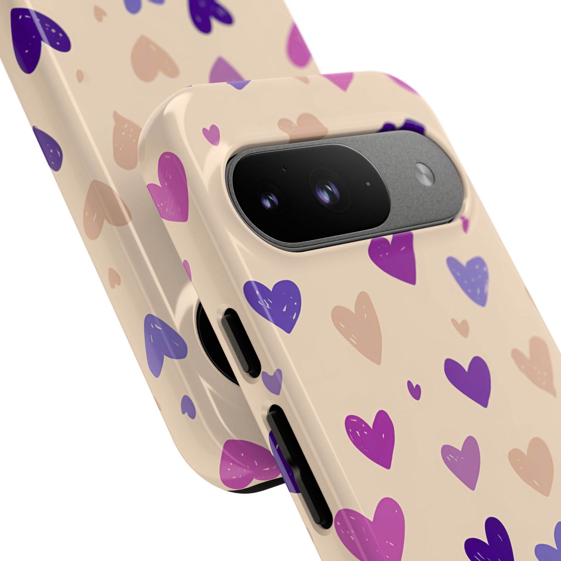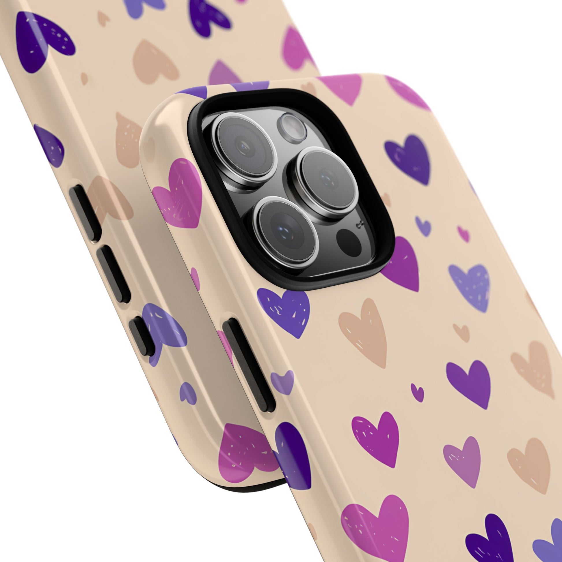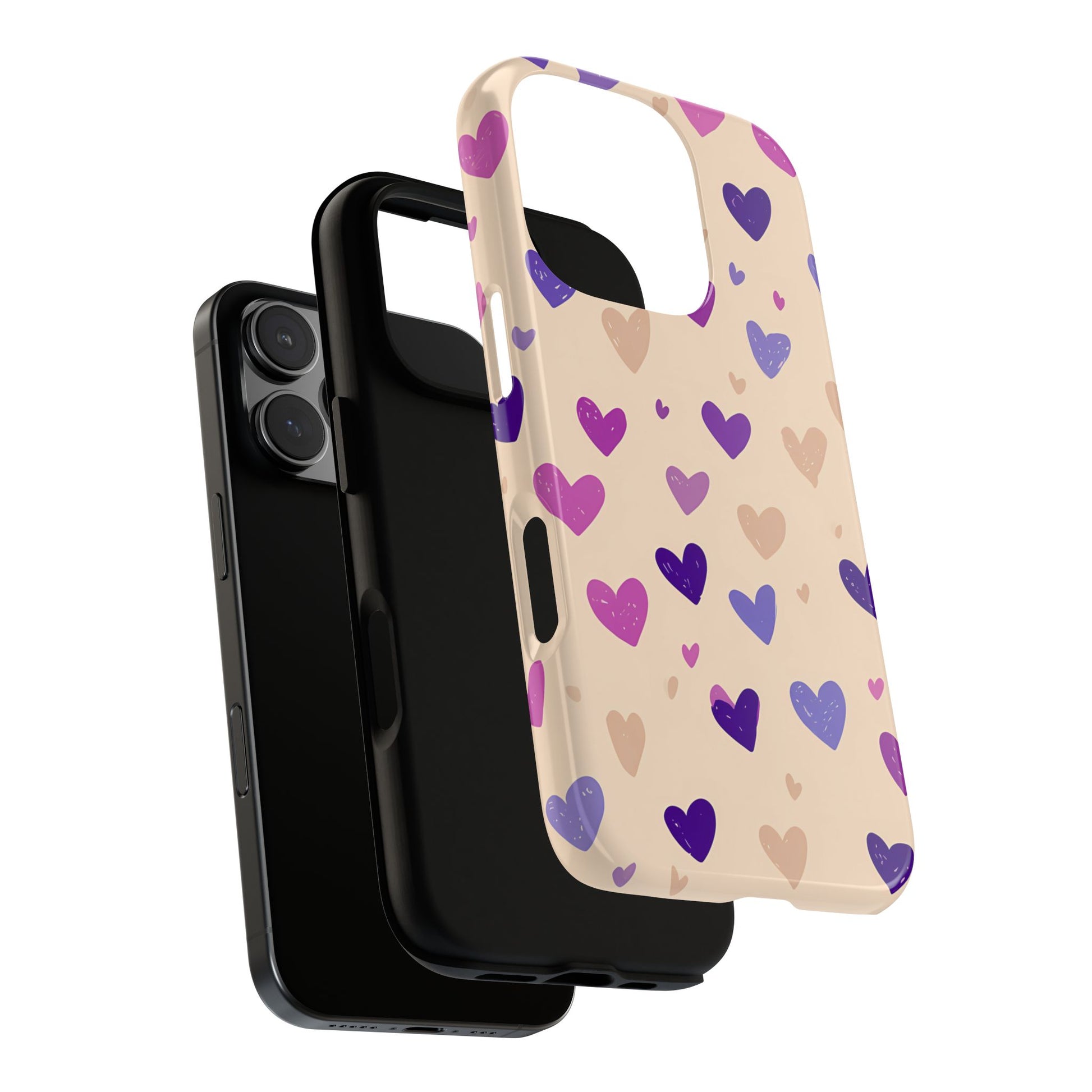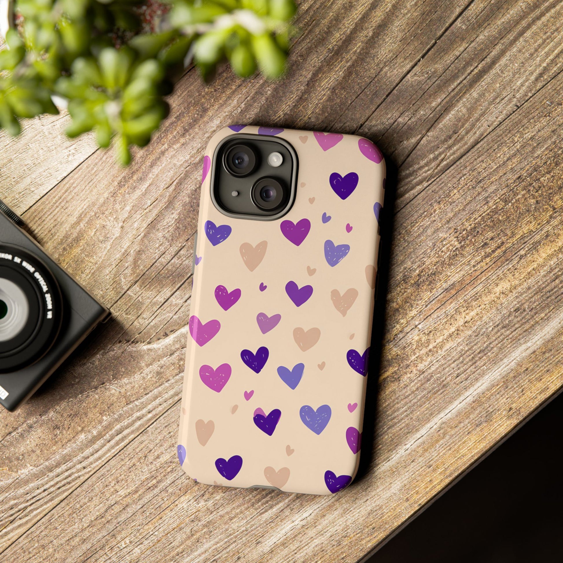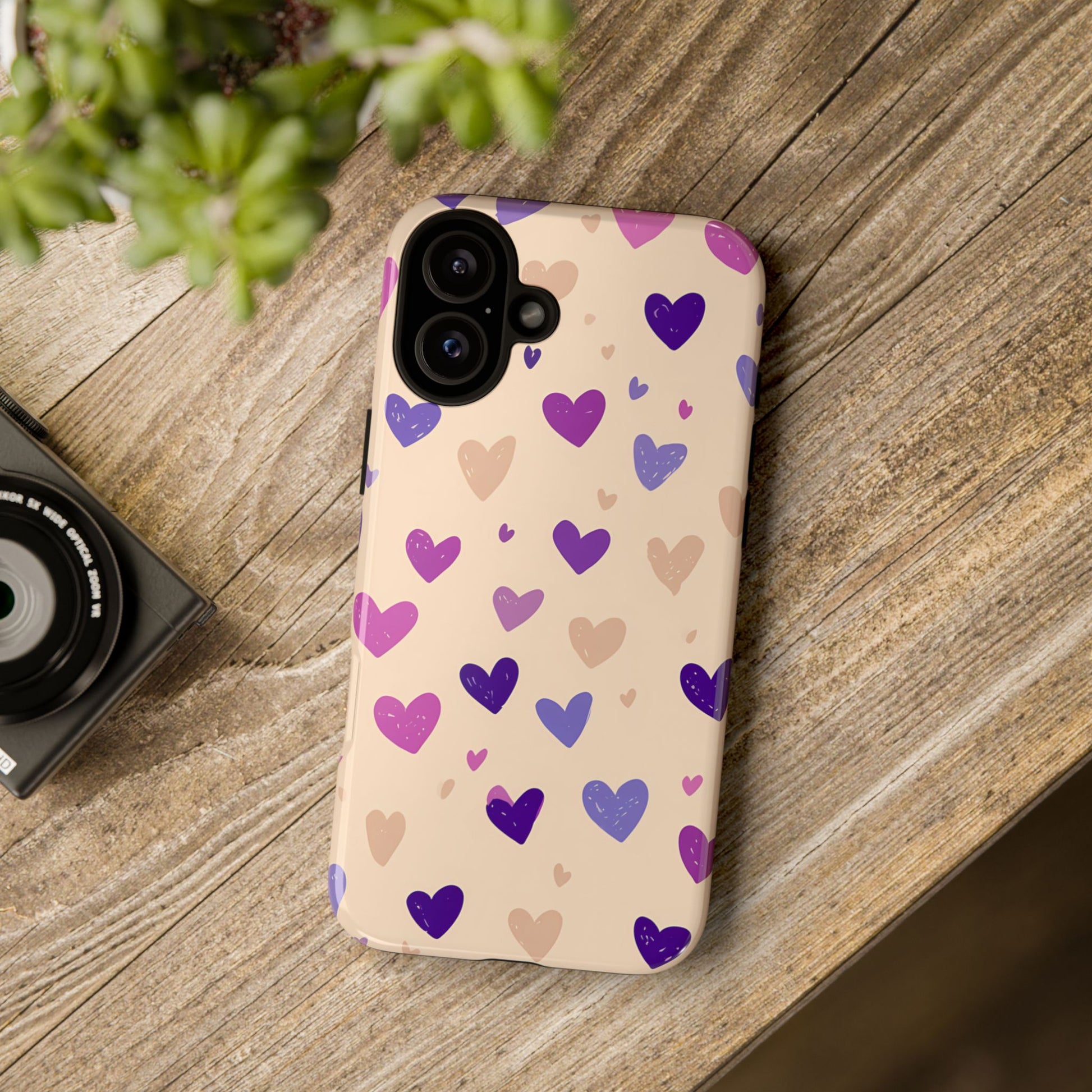 A soft, minimal pattern of purple and pink hearts floating on a gentle beige background, creating a cute and simple design full of charm.