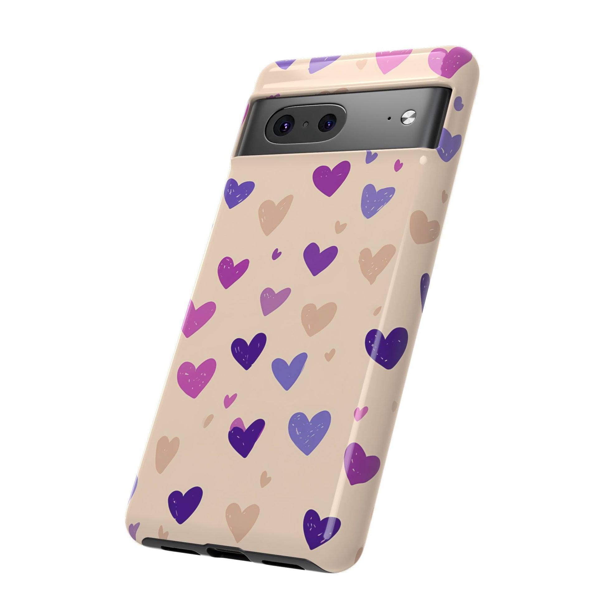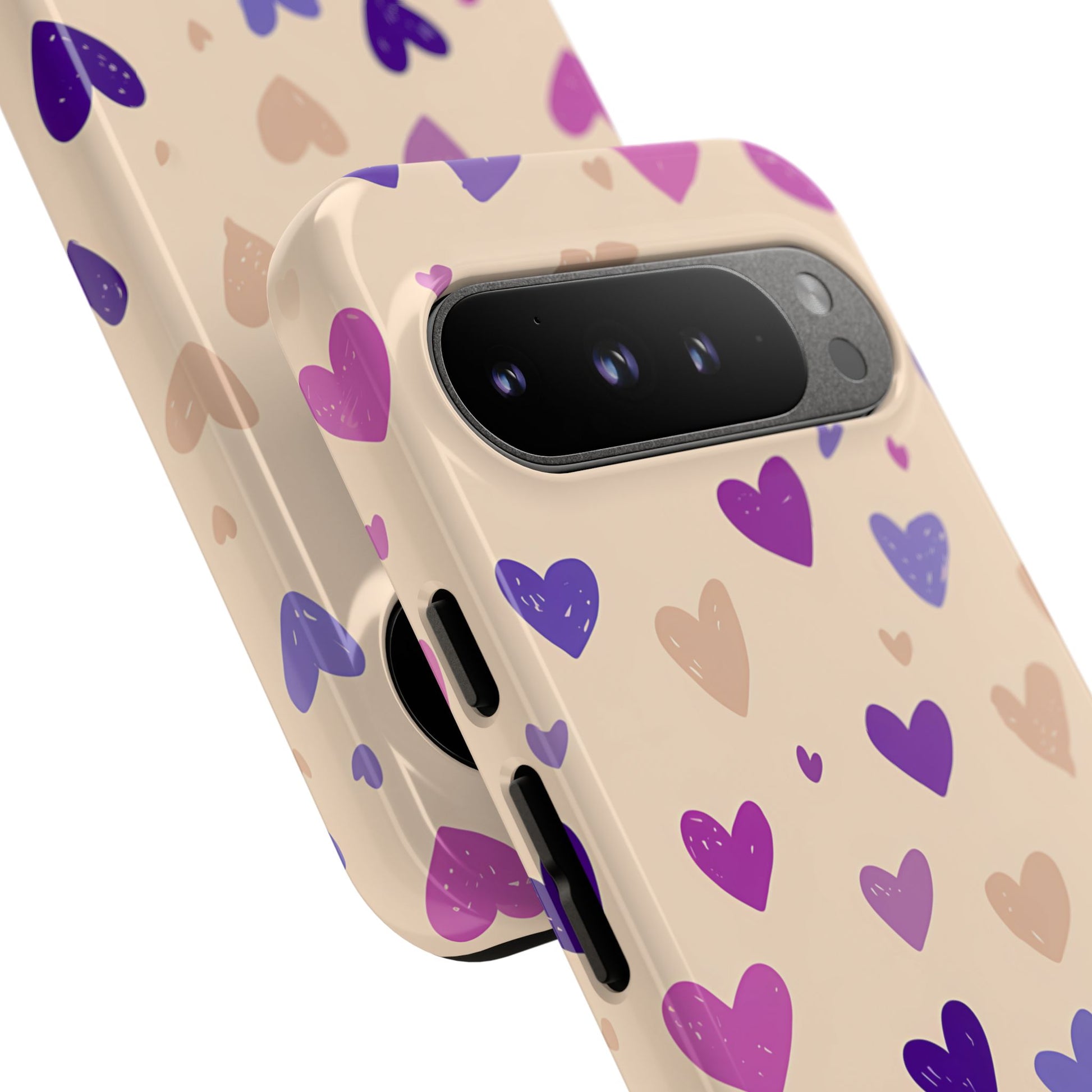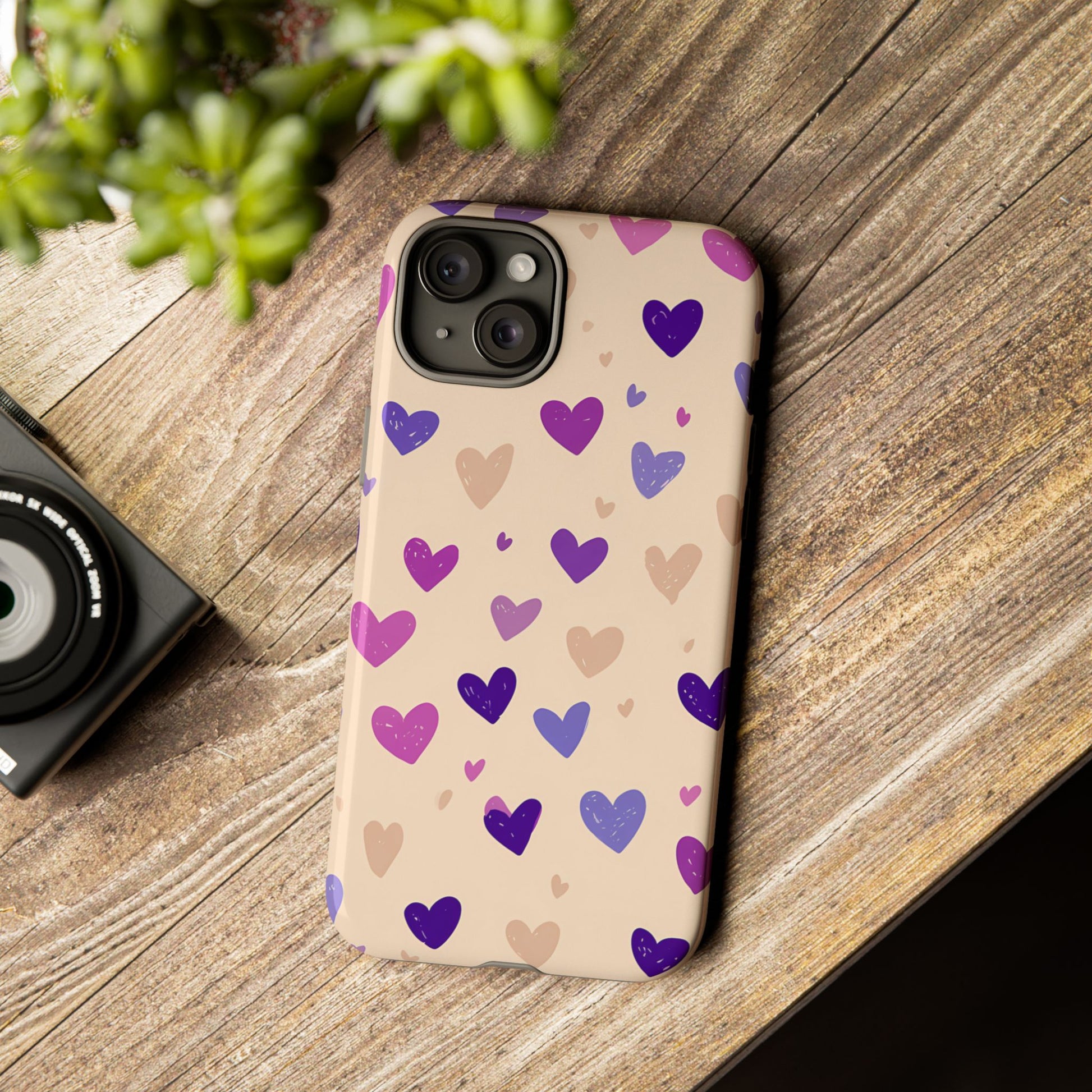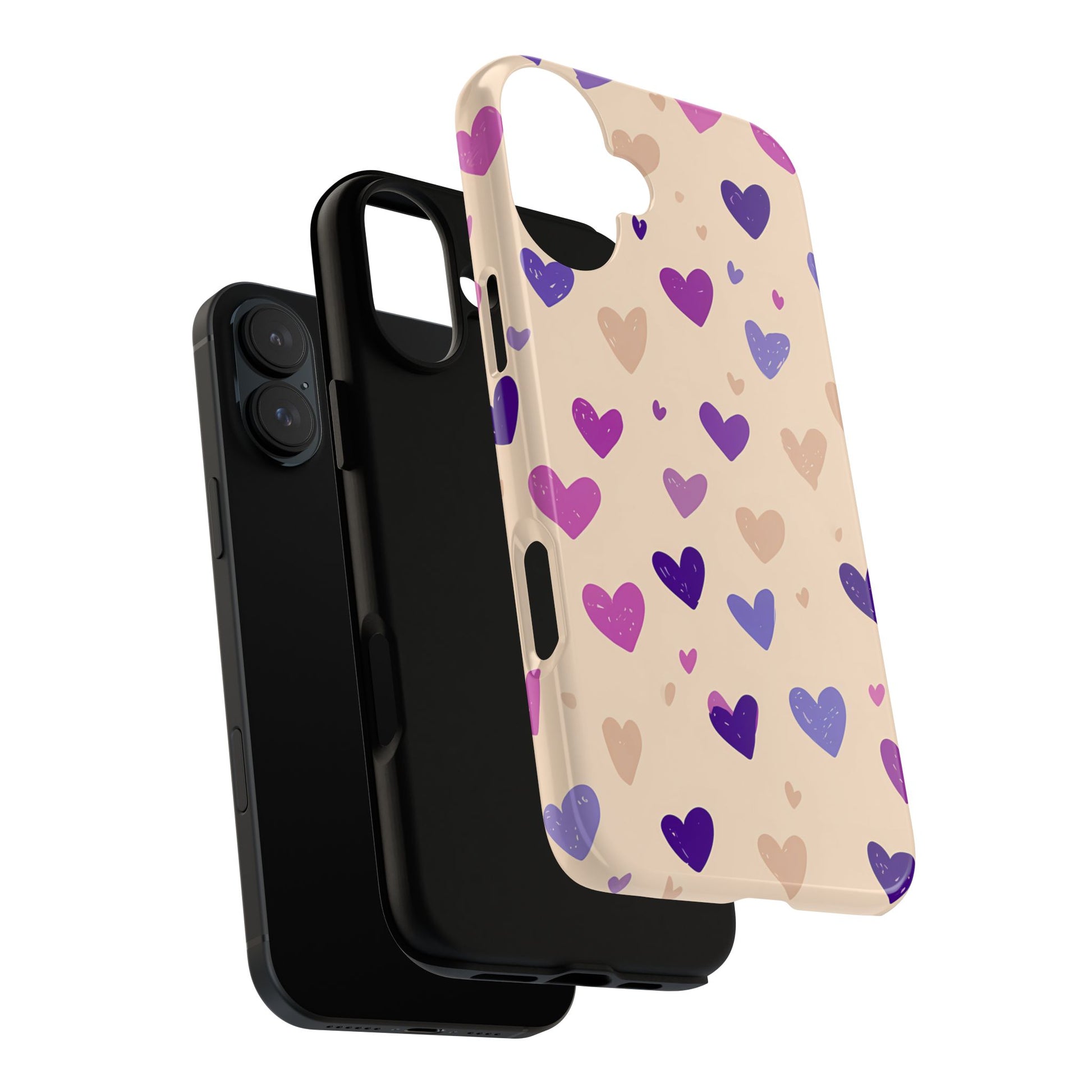 A soft, minimal pattern of purple and pink hearts floating on a gentle beige background, creating a cute and simple design full of charm.